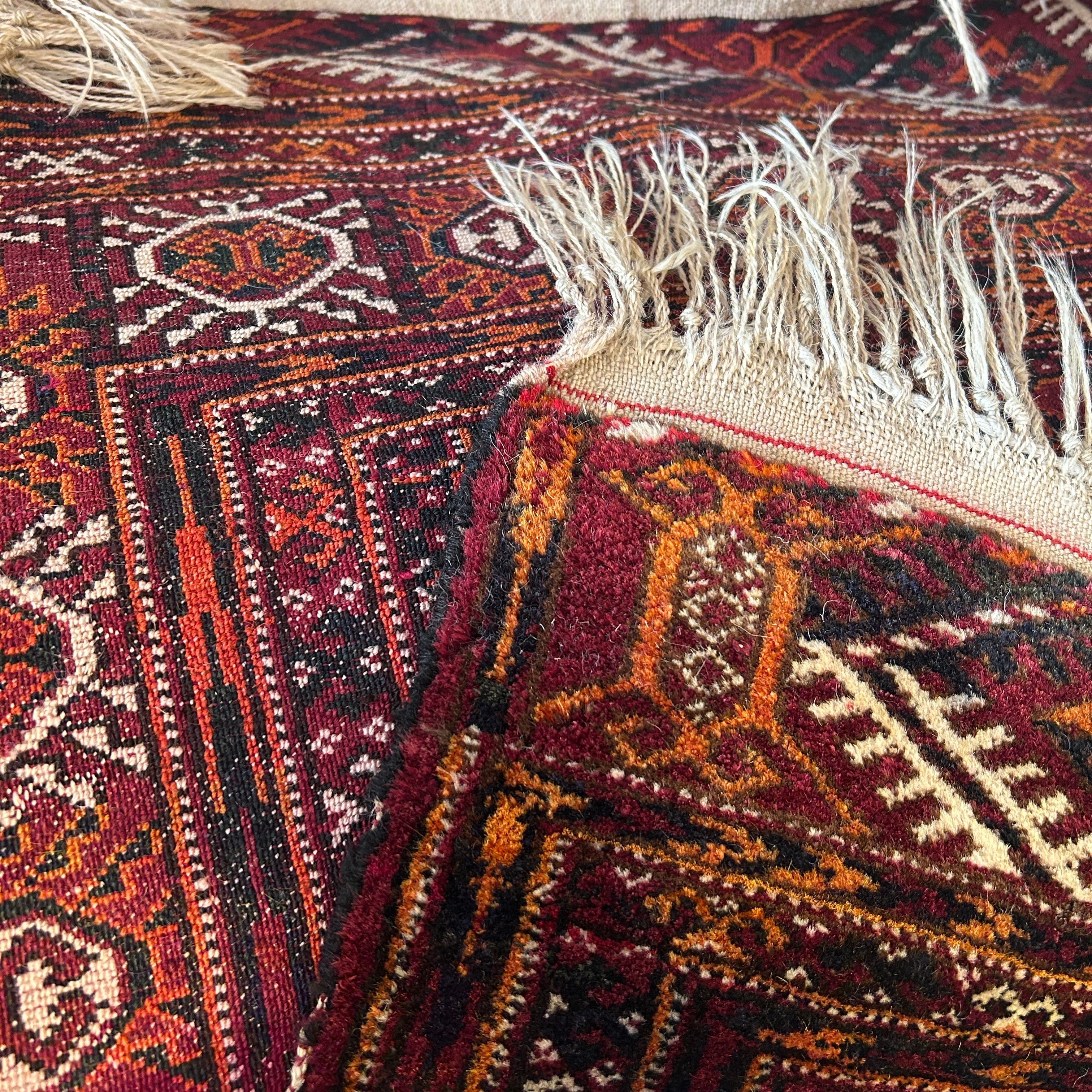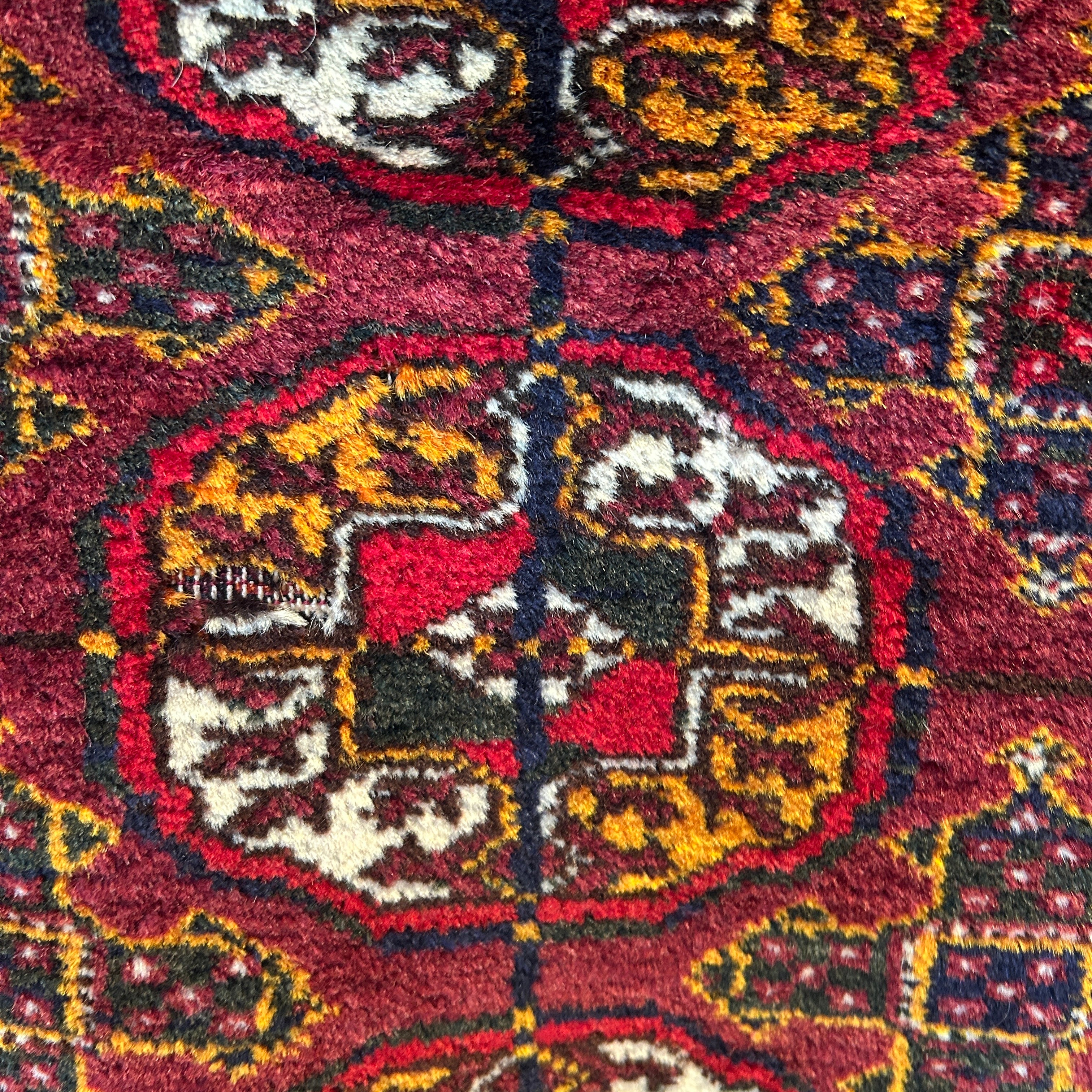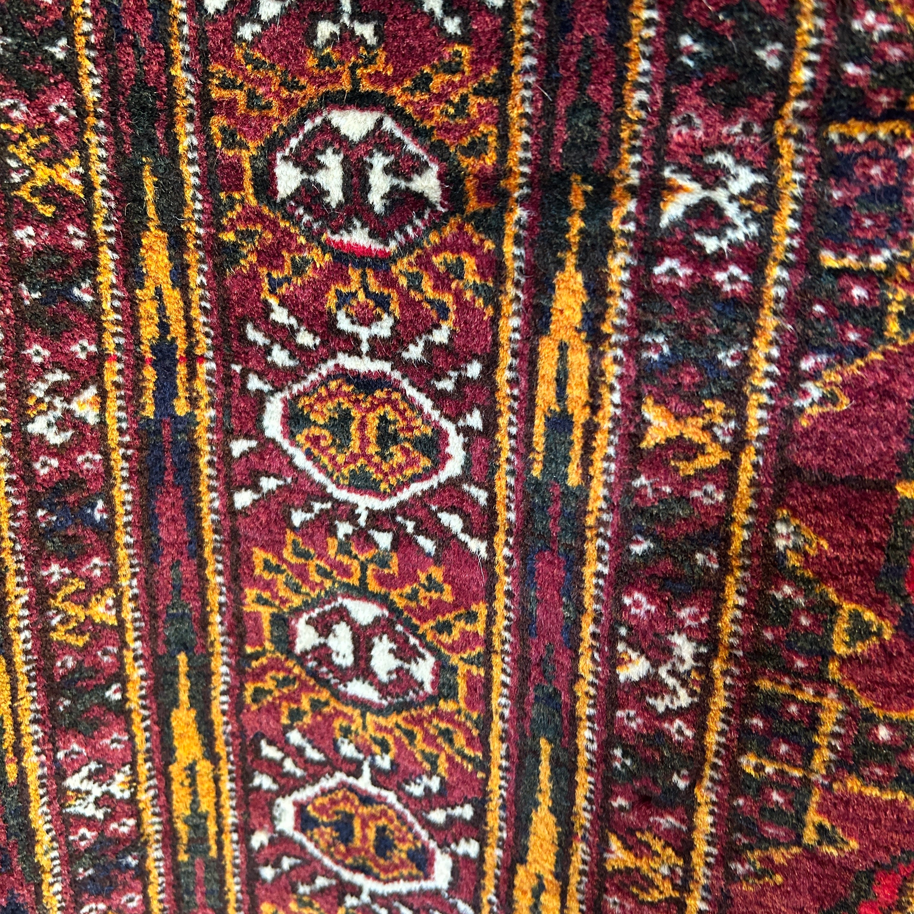 Bella alfombra de origen pakistaní Bokhara, tejida a mano en lana teñida en rojo, amarillo y detalles verdes. Esta pieza tiene tres zonas con diferentes patrones geométricos: la primera tiene figuras circulares, con detalles an blanco, amarillo y verde, sobre un fondo rojo, y a segunda corresponde a los bordes de cintillos en patrones. Los extremos de la alfombra tienen otro patrón terminado en la urdimbre a la vista, mostrando la materia prima sobre la cual se teje esta increíble alfombra.