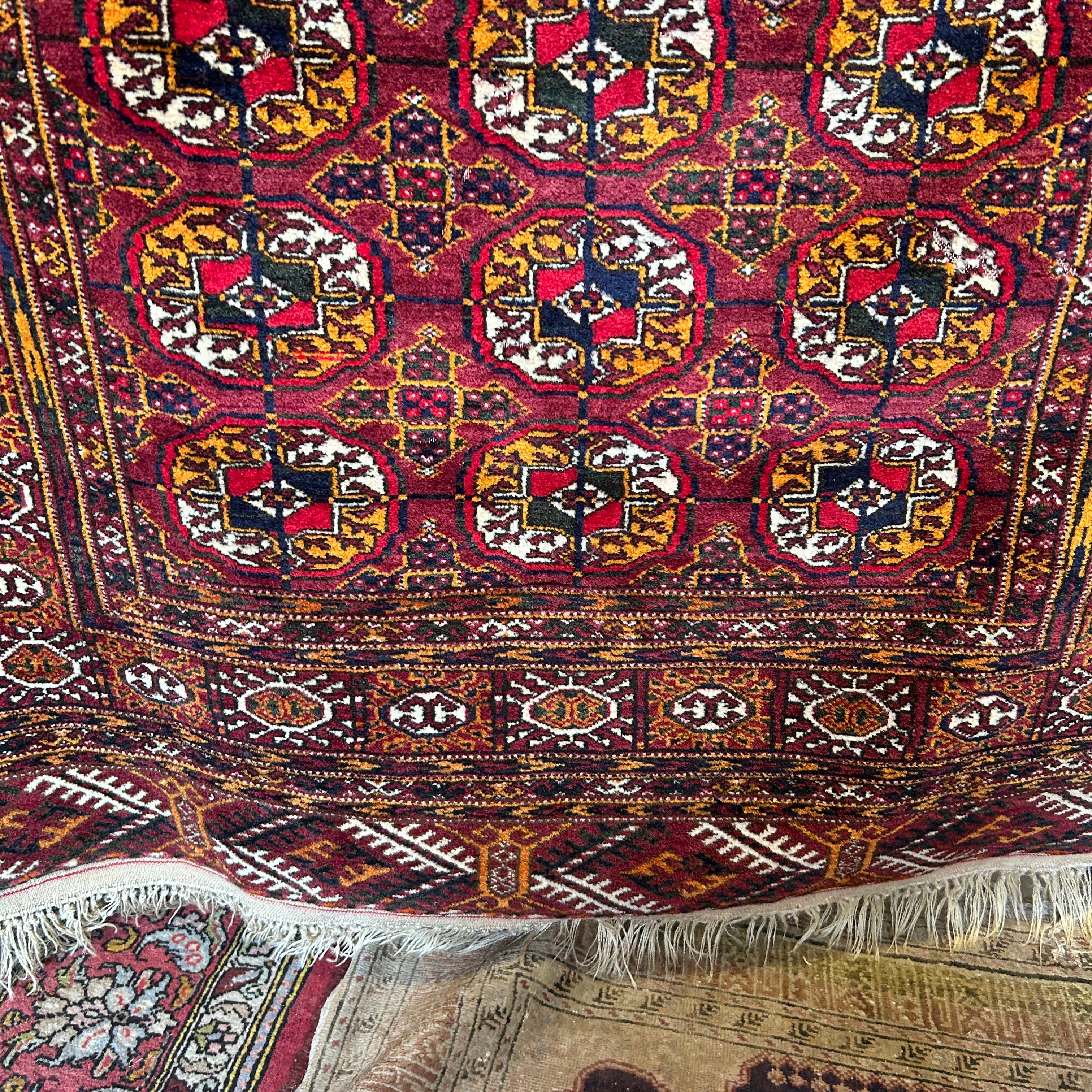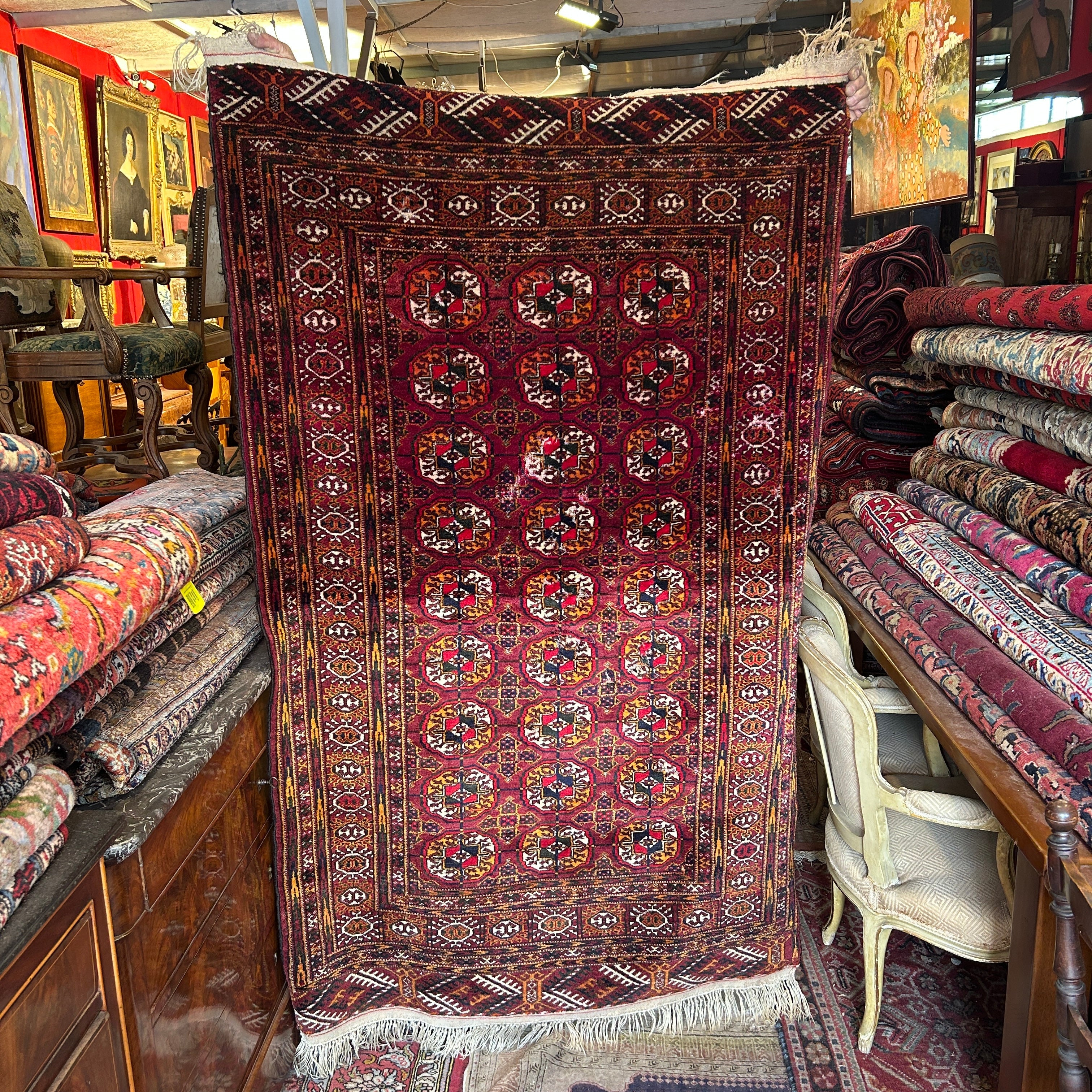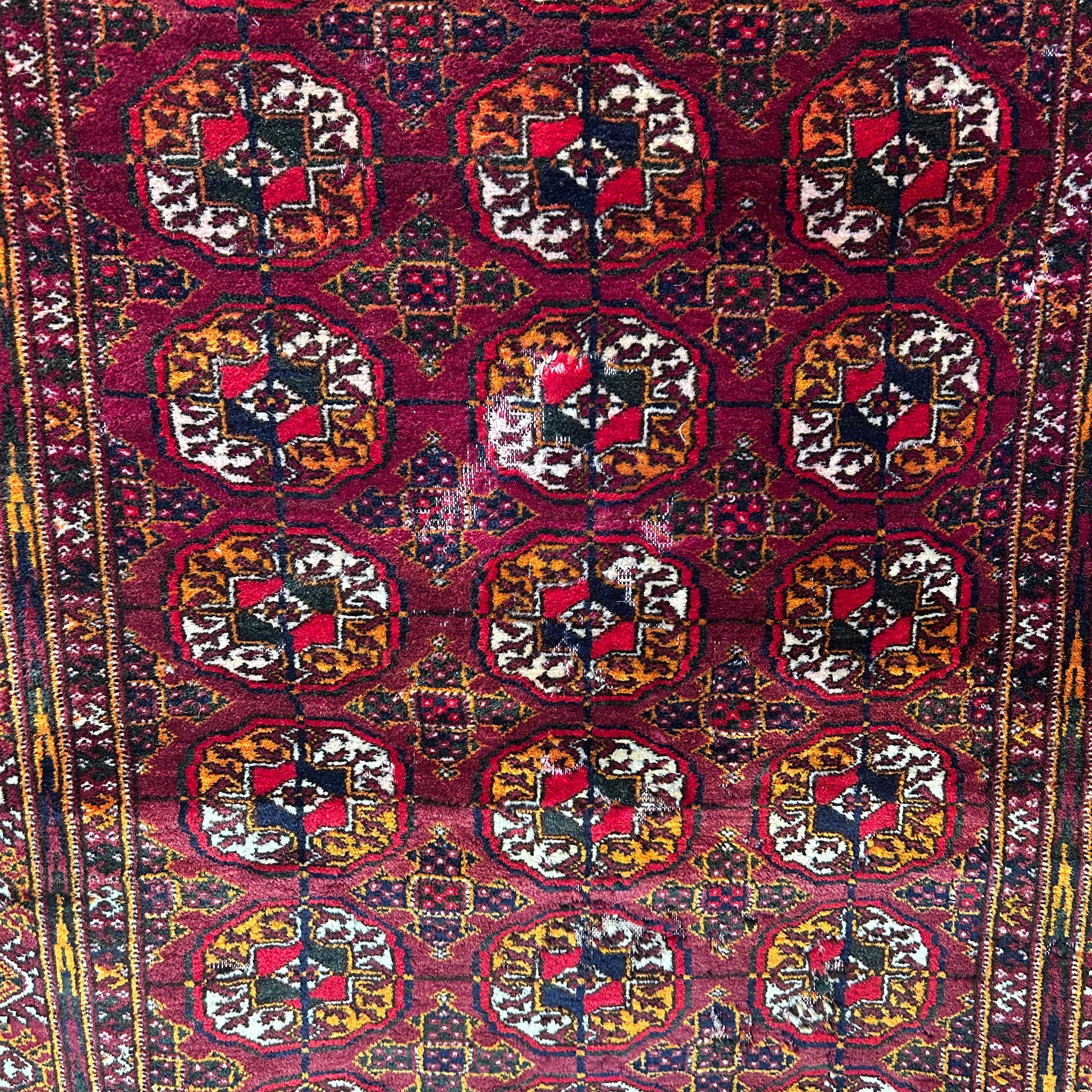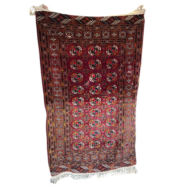 Bella alfombra de origen pakistaní Bokhara, tejida a mano en lana teñida en rojo, amarillo y detalles verdes. Esta pieza tiene tres zonas con diferentes patrones geométricos: la primera tiene figuras circulares, con detalles an blanco, amarillo y verde, sobre un fondo rojo, y a segunda corresponde a los bordes de cintillos en patrones. Los extremos de la alfombra tienen otro patrón terminado en la urdimbre a la vista, mostrando la materia prima sobre la cual se teje esta increíble alfombra.