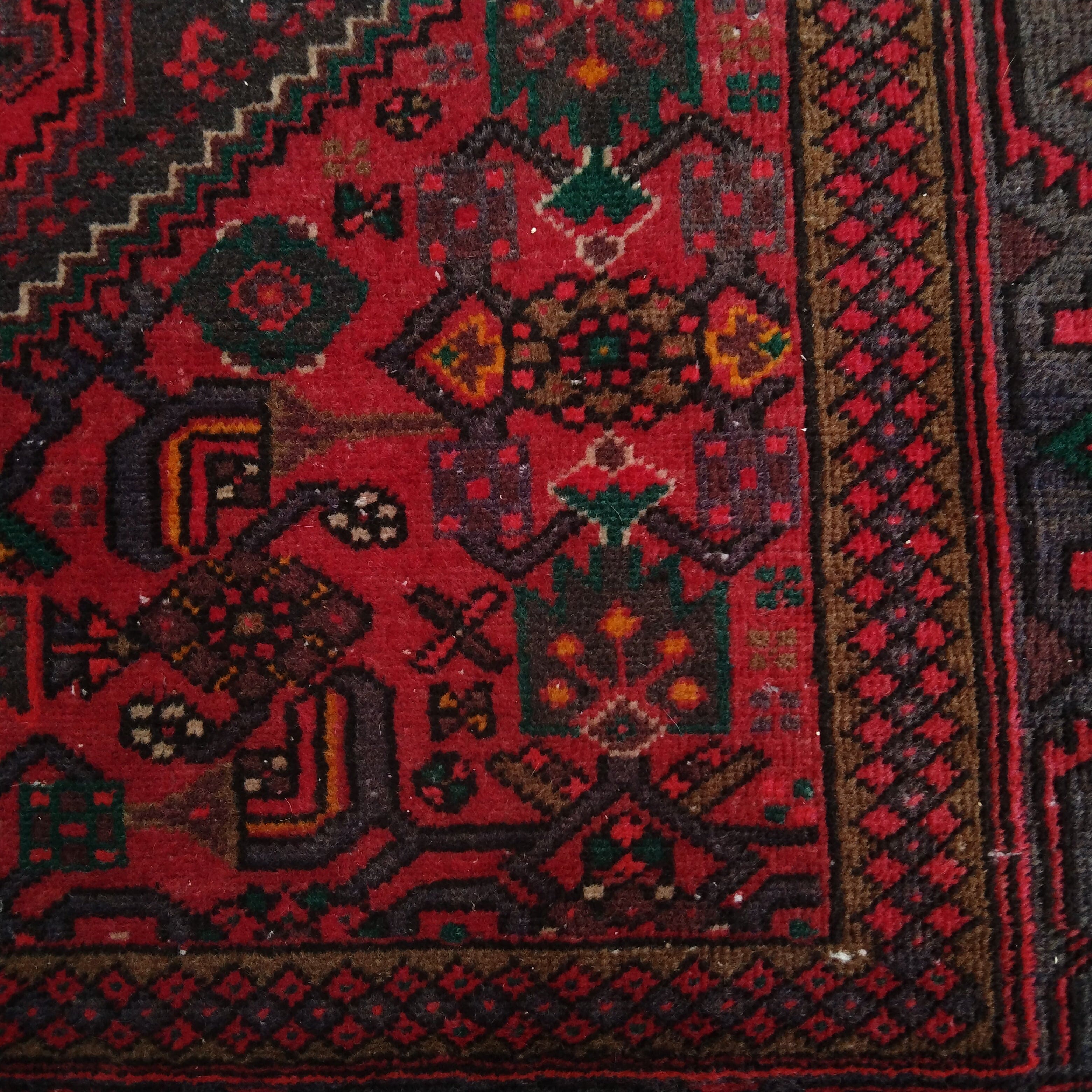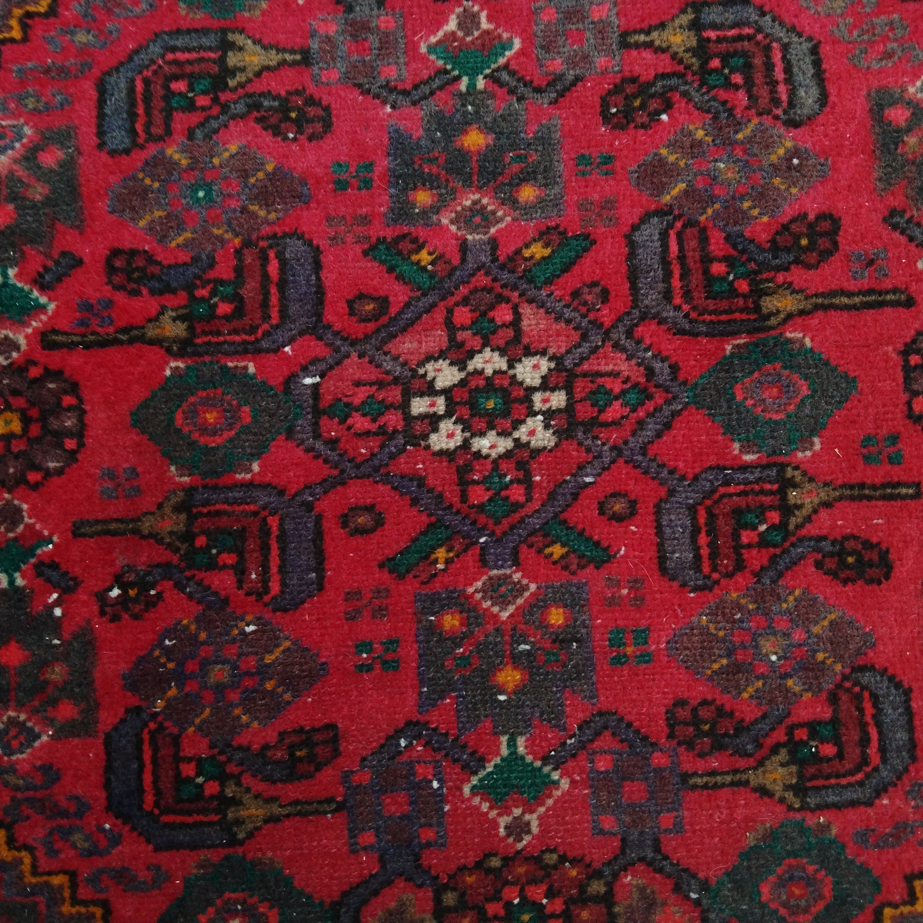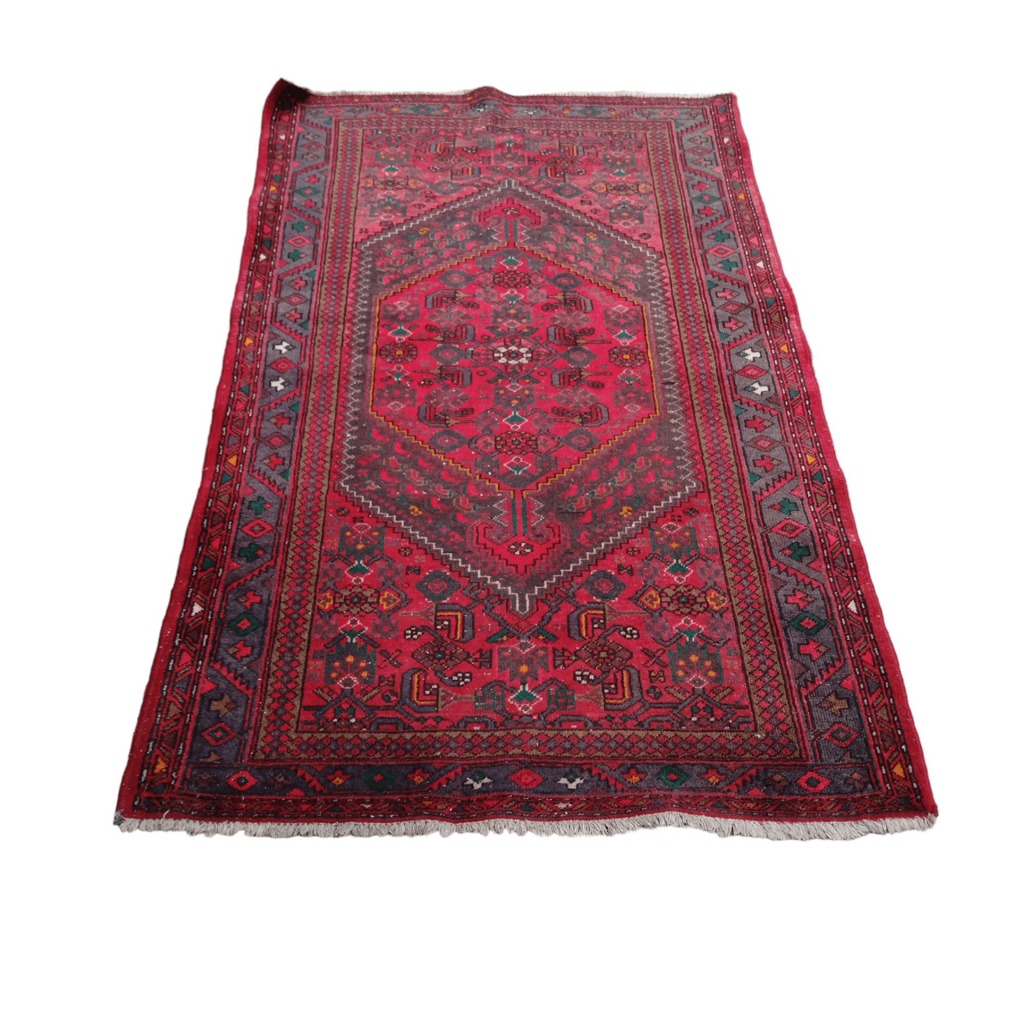 A beautiful Persian rug, hand-knotted with intricate geometric designs in shades of red, resembling a vine with its flowers.