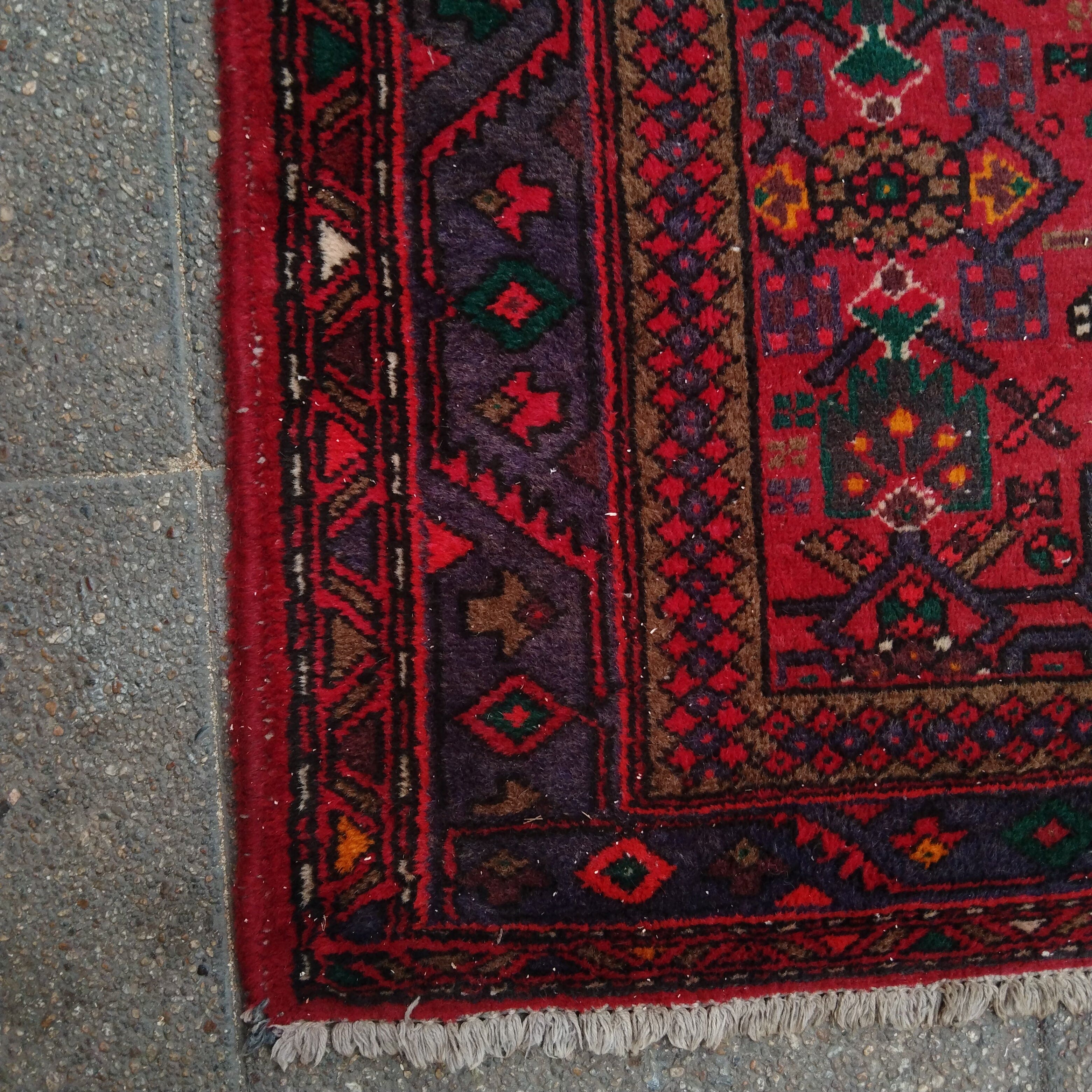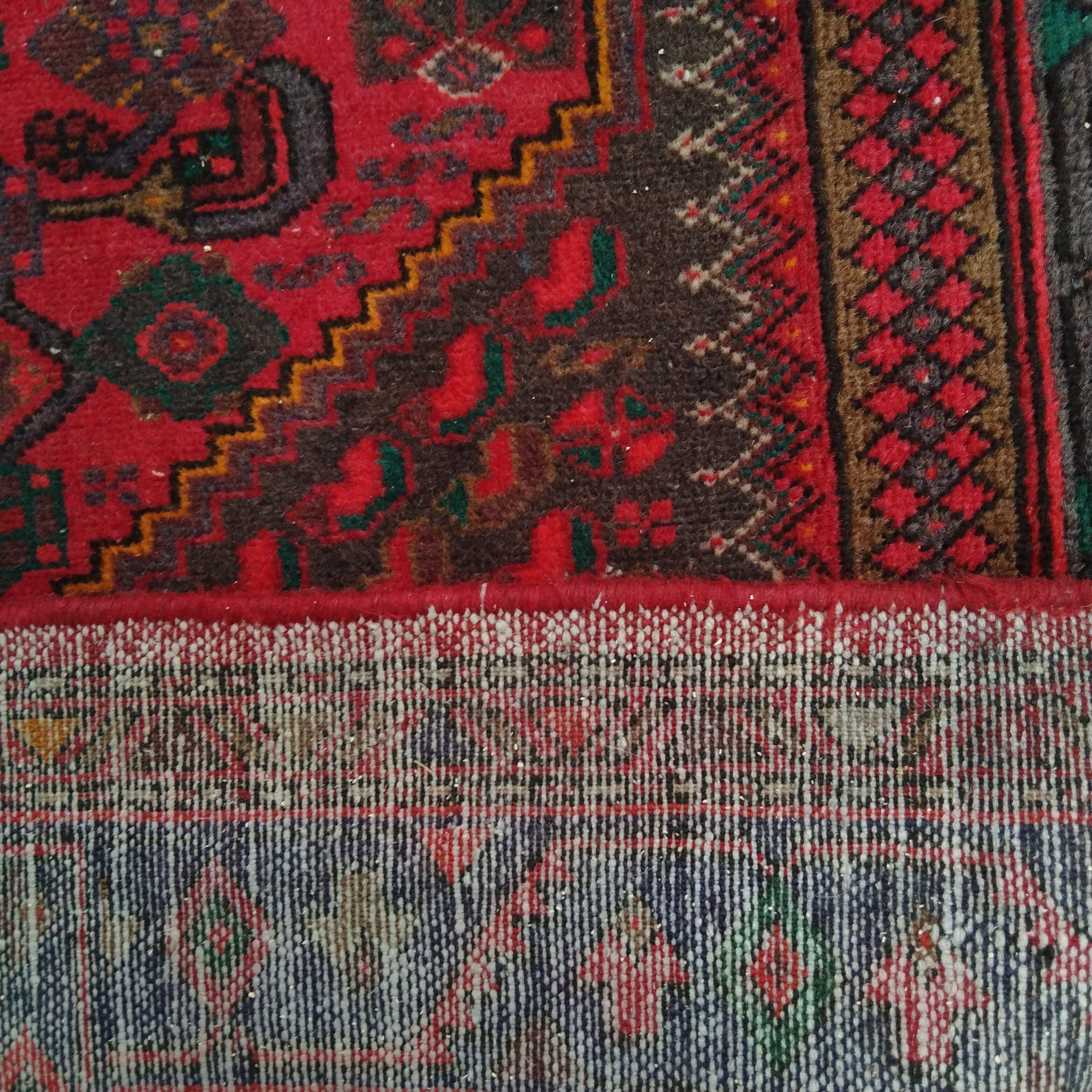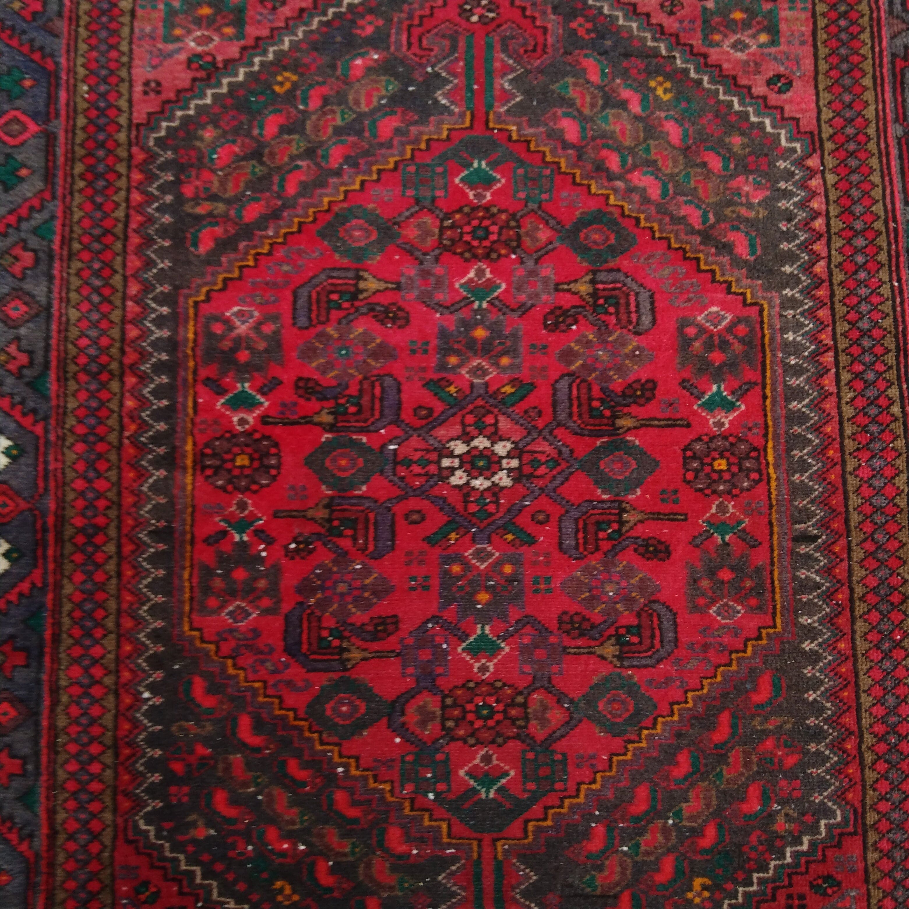 A beautiful Persian rug, hand-knotted with intricate geometric designs in shades of red, resembling a vine with its flowers.