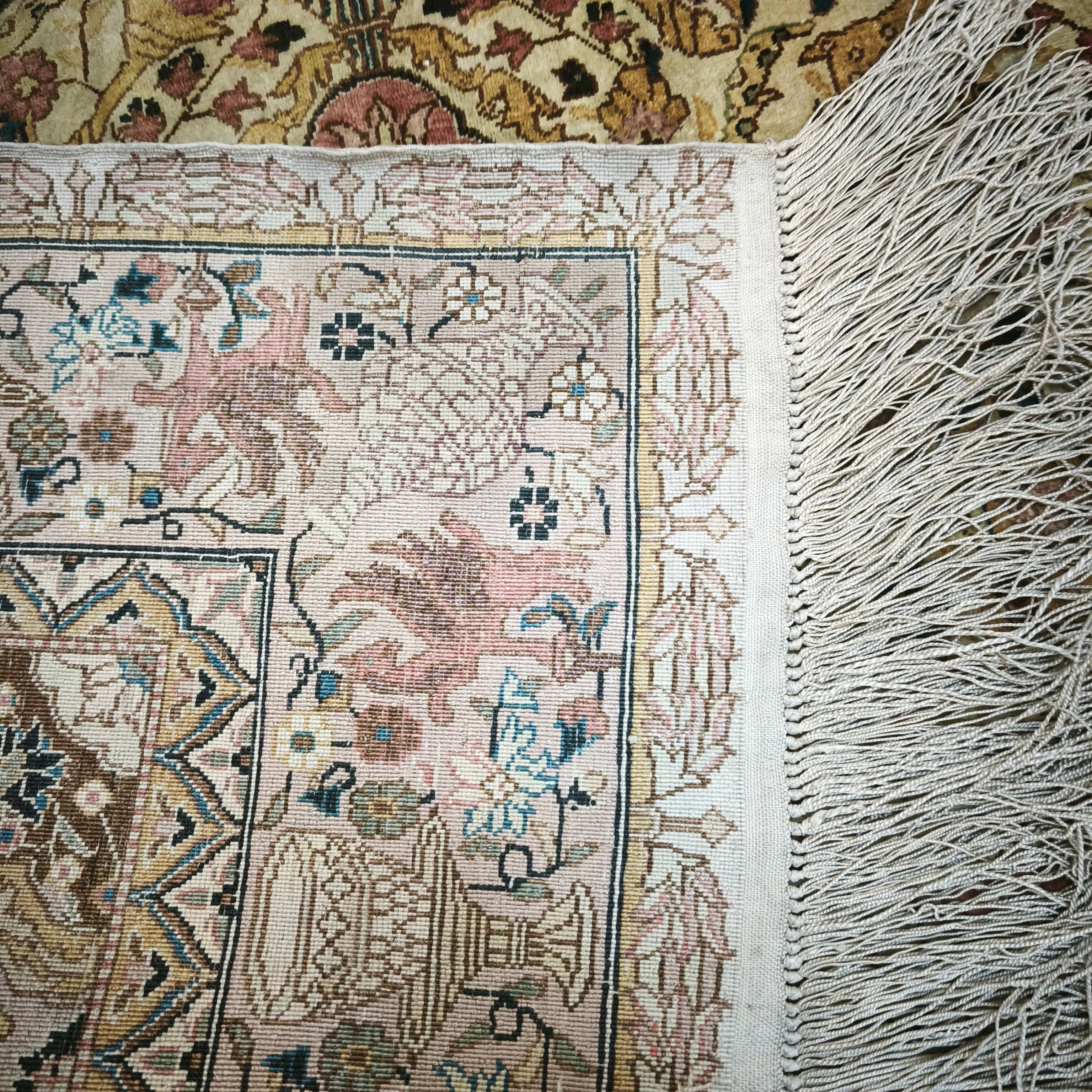 Beautiful rug of Pakistani origin, woven in silk and wool, with gorgeous geometric designs in shades of yellow and pink, surrounding a central circular figure. The piece features a fringed finish at each end and information about the piece on the back.