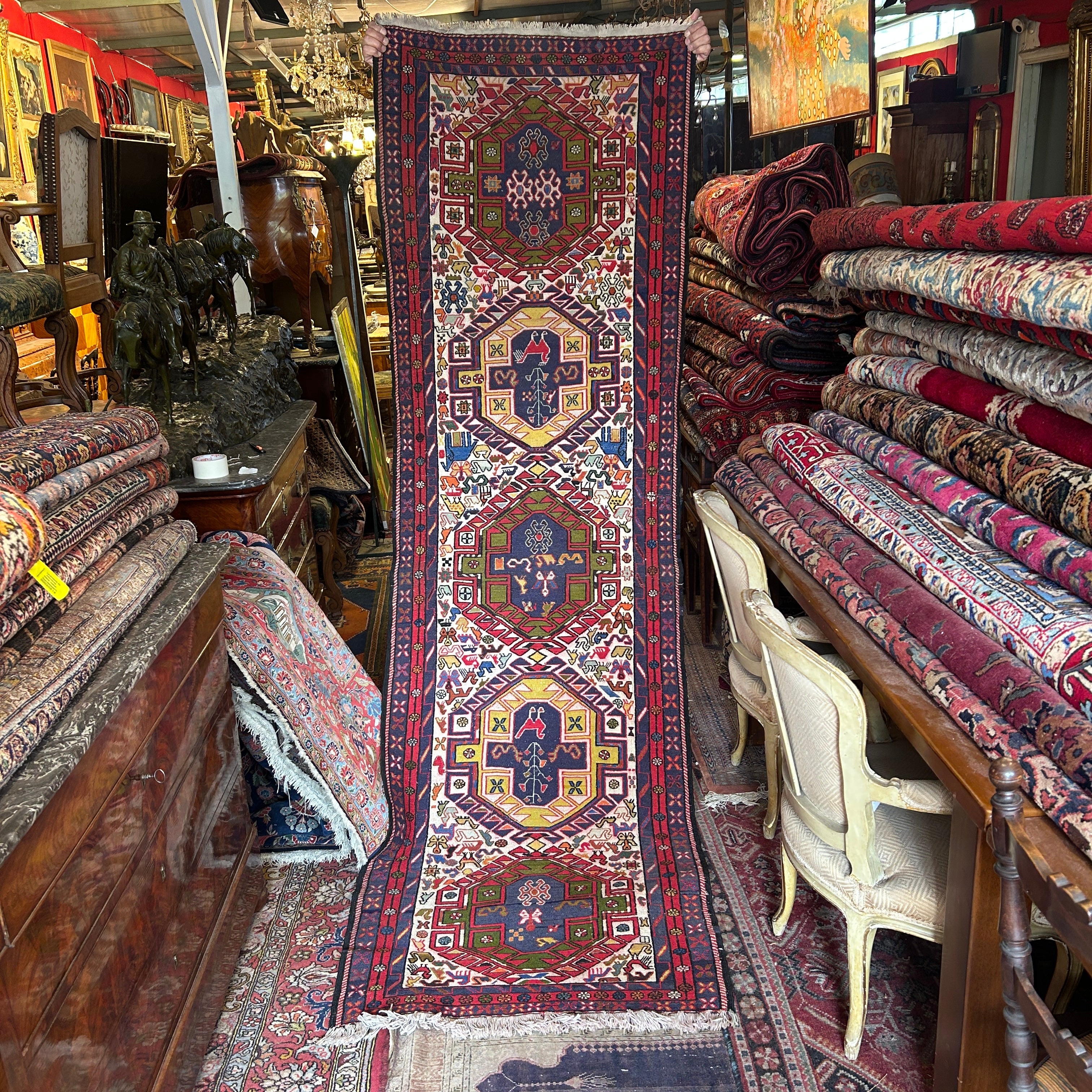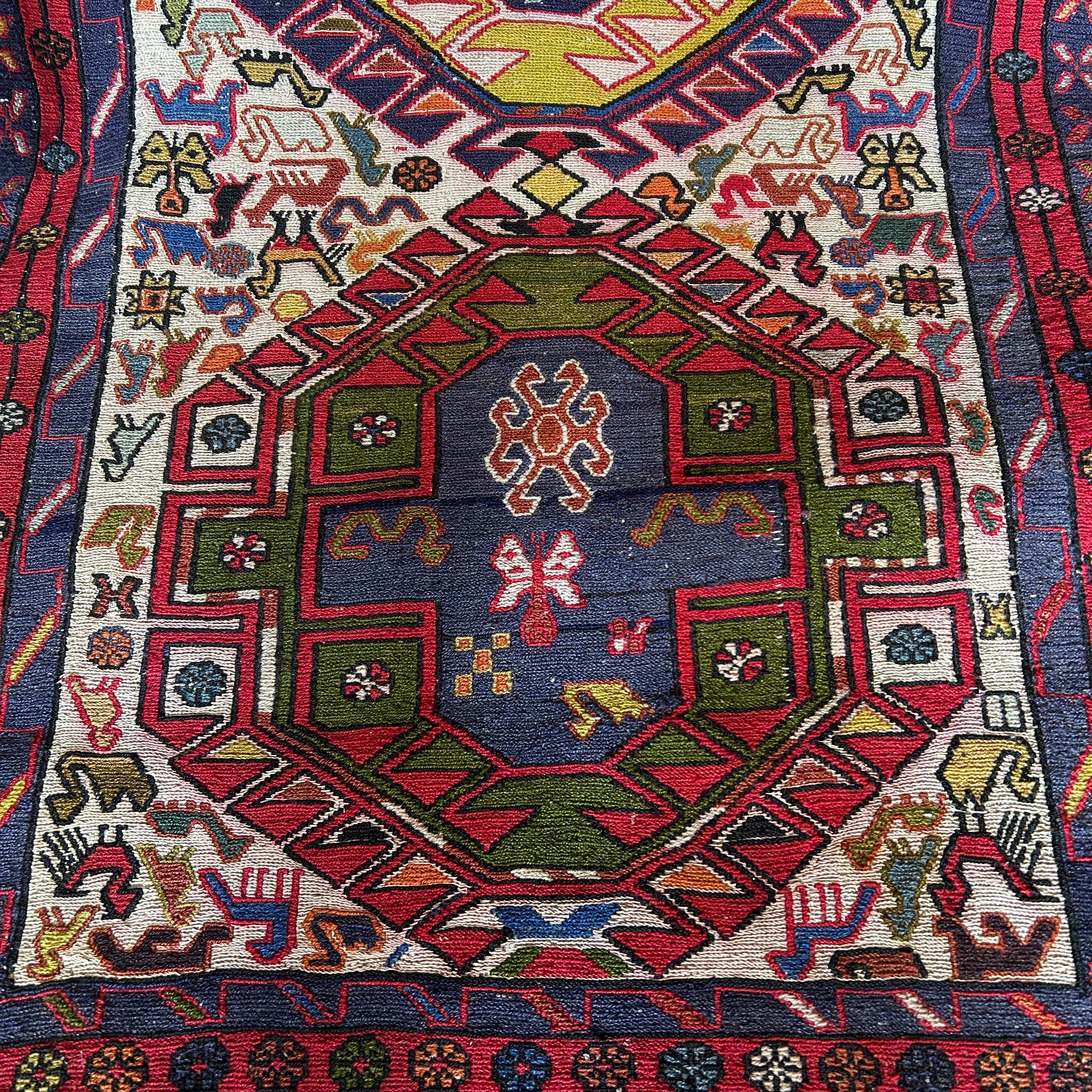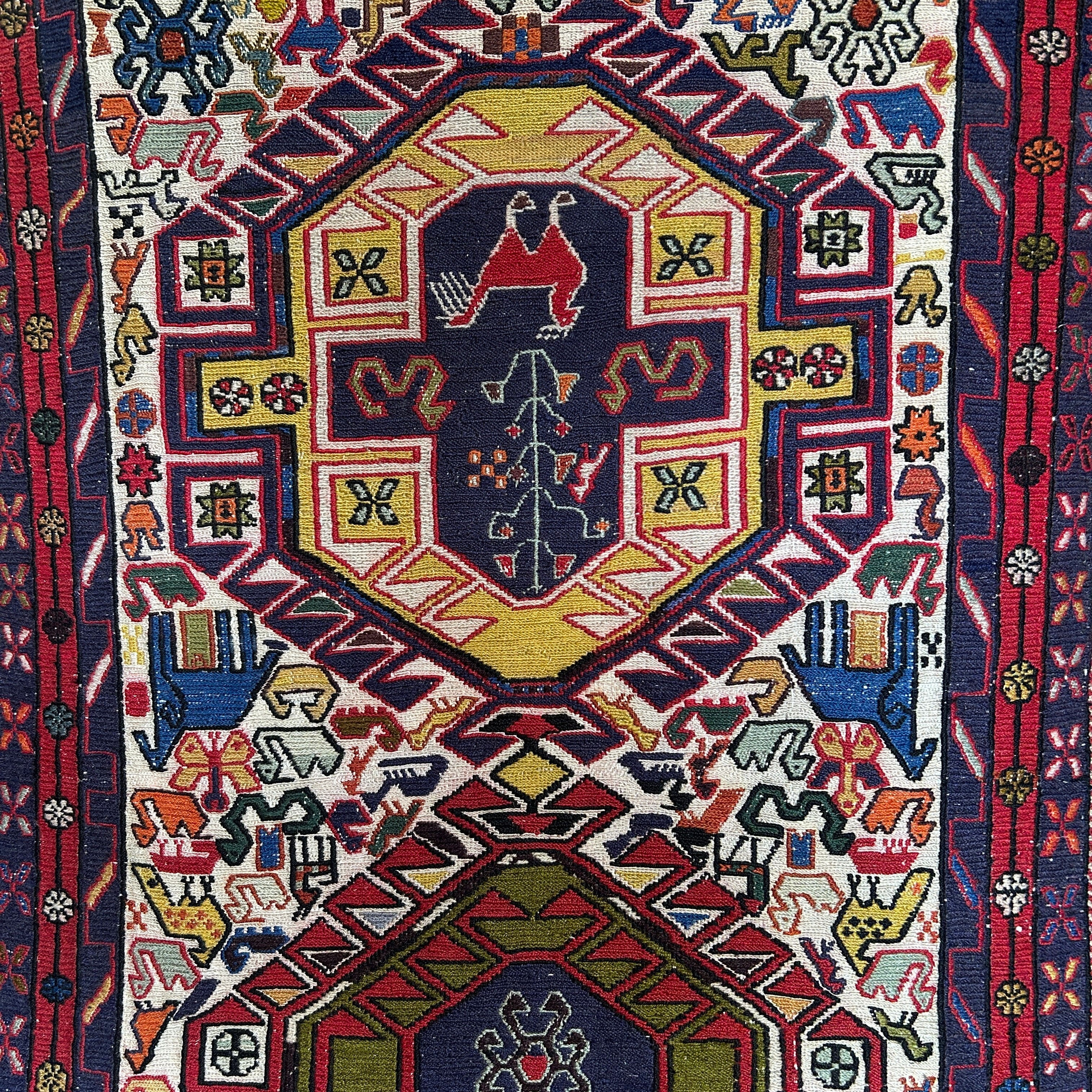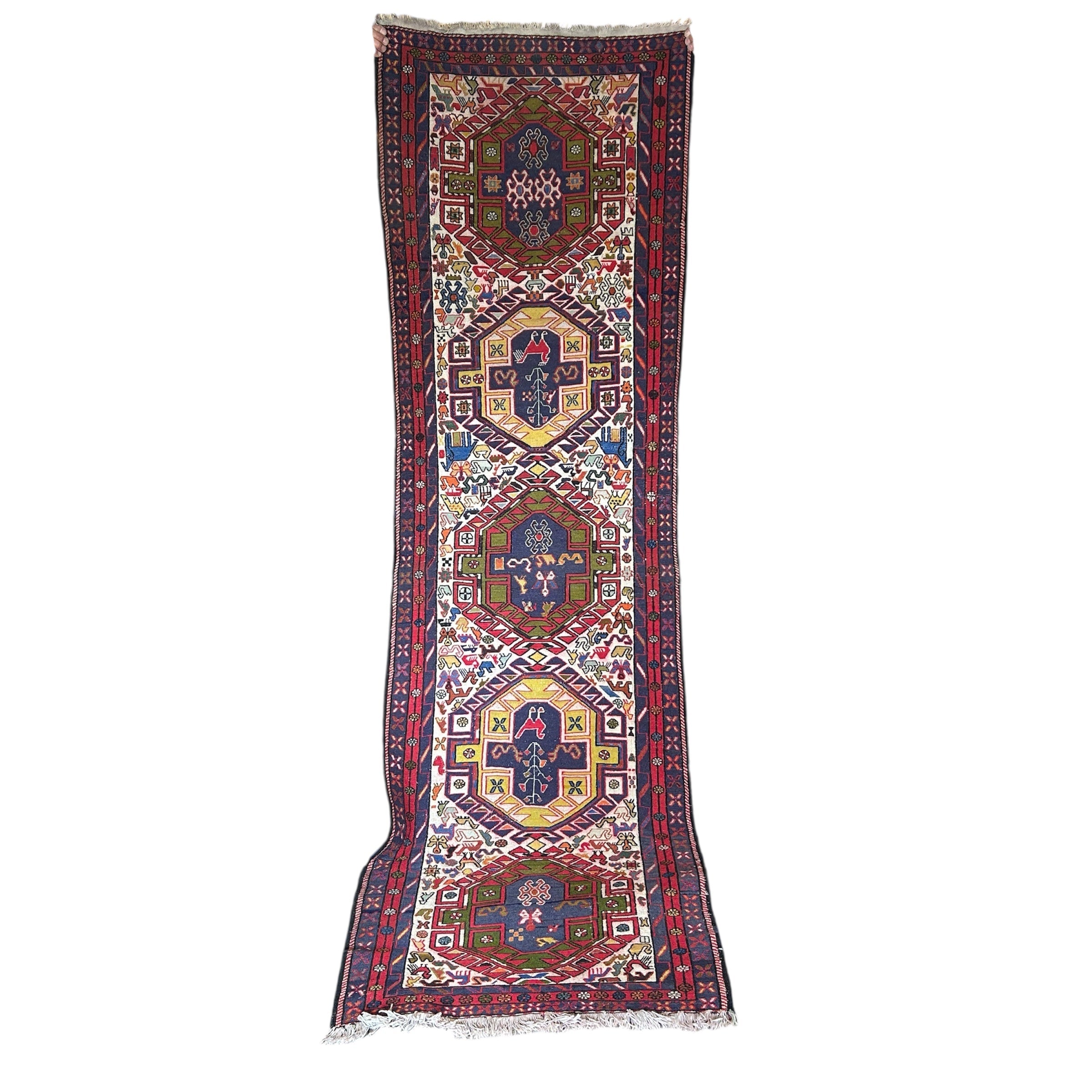 Espectacular alfombra pasillo de origen Cáucaso ruso, tejida a mano en lana, teñida de variados colores. El complejo tramado geométrico de la pieza está dividido en tres zonas: las figuras centrales en amarillo y azul, el área que las rodea, en los que prima un fondo blanco lleno de figuritas de animales y flores de colores, y un borde externo en un patrón geométrico en azul y rojo. En cada extremo se dejan las fibras de la urdimbre al aire. Se trata de una manufactura artesanal excepcional, para ser apreciada con tiempo y en detalle por quien la observa.