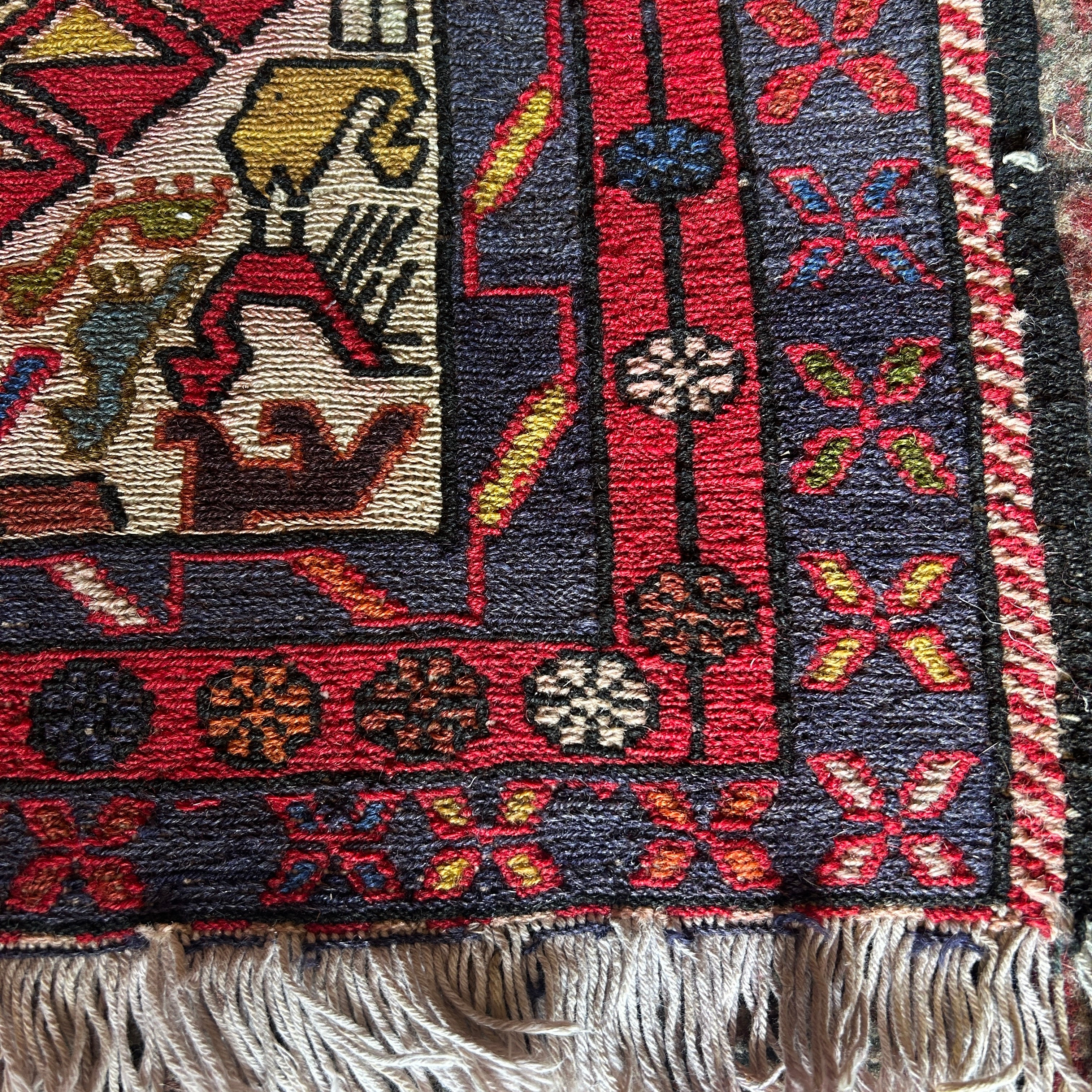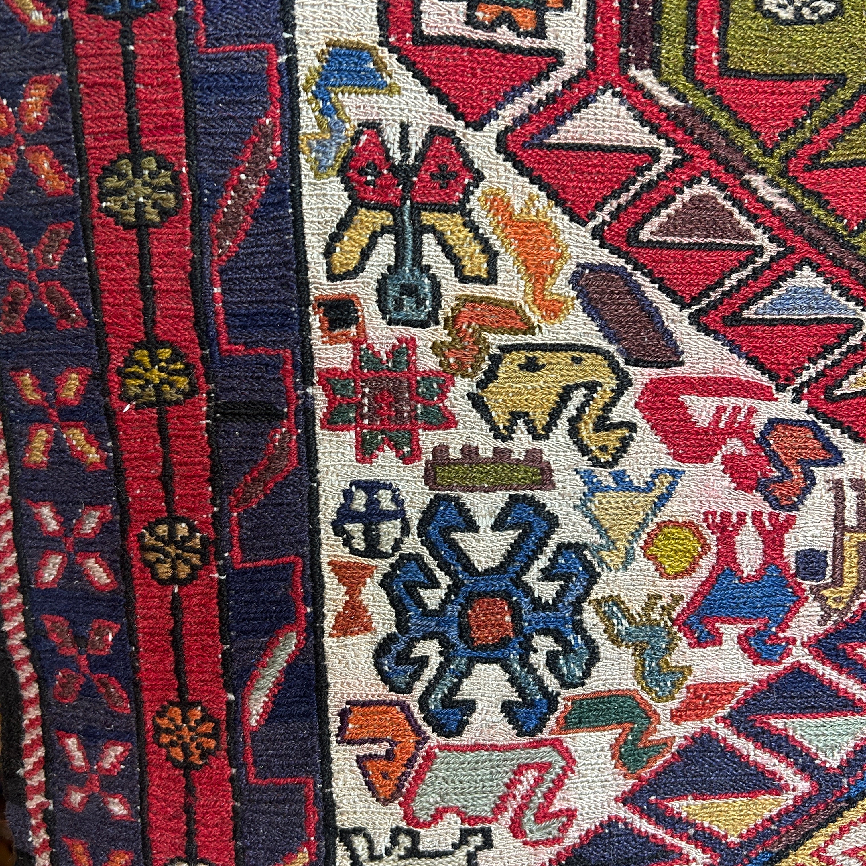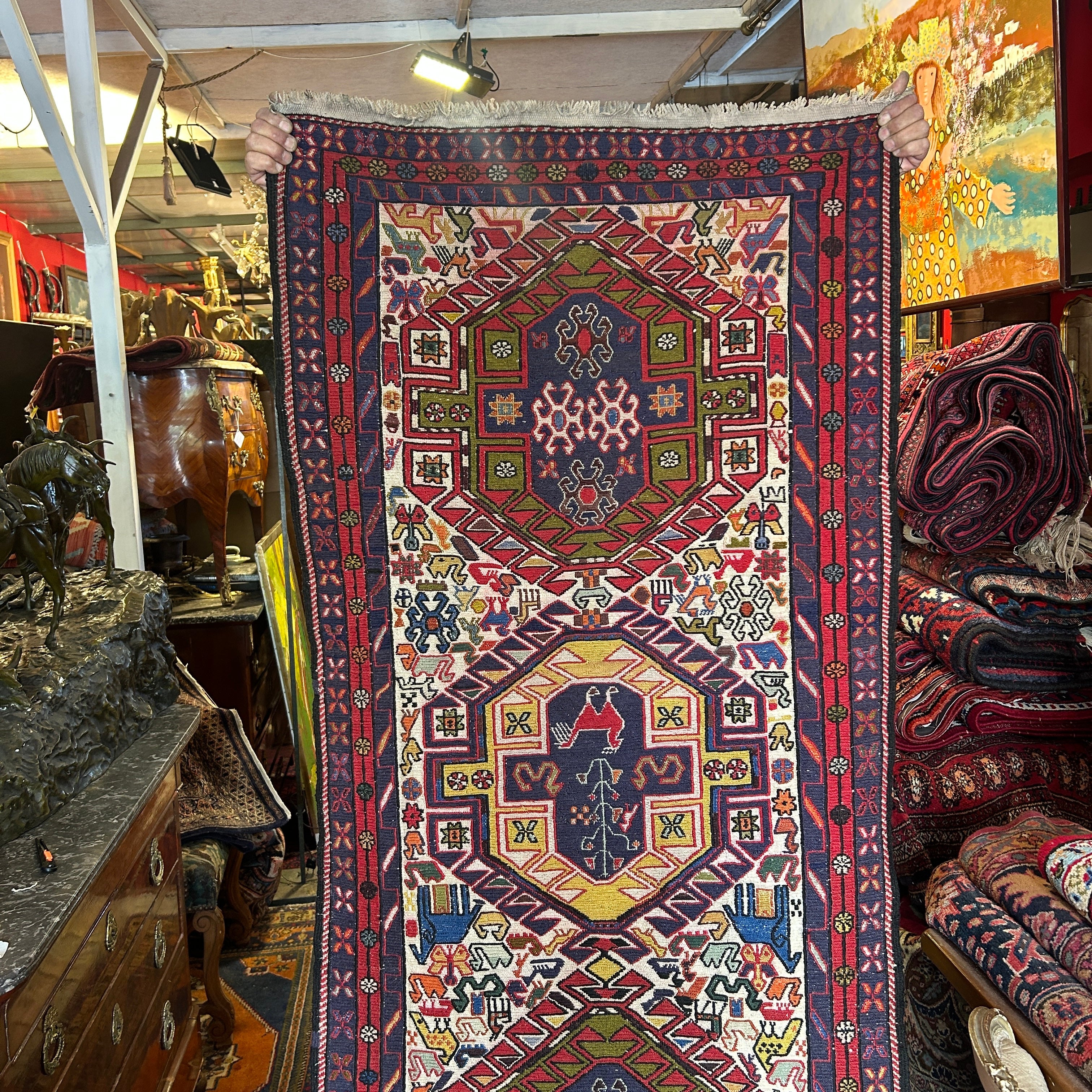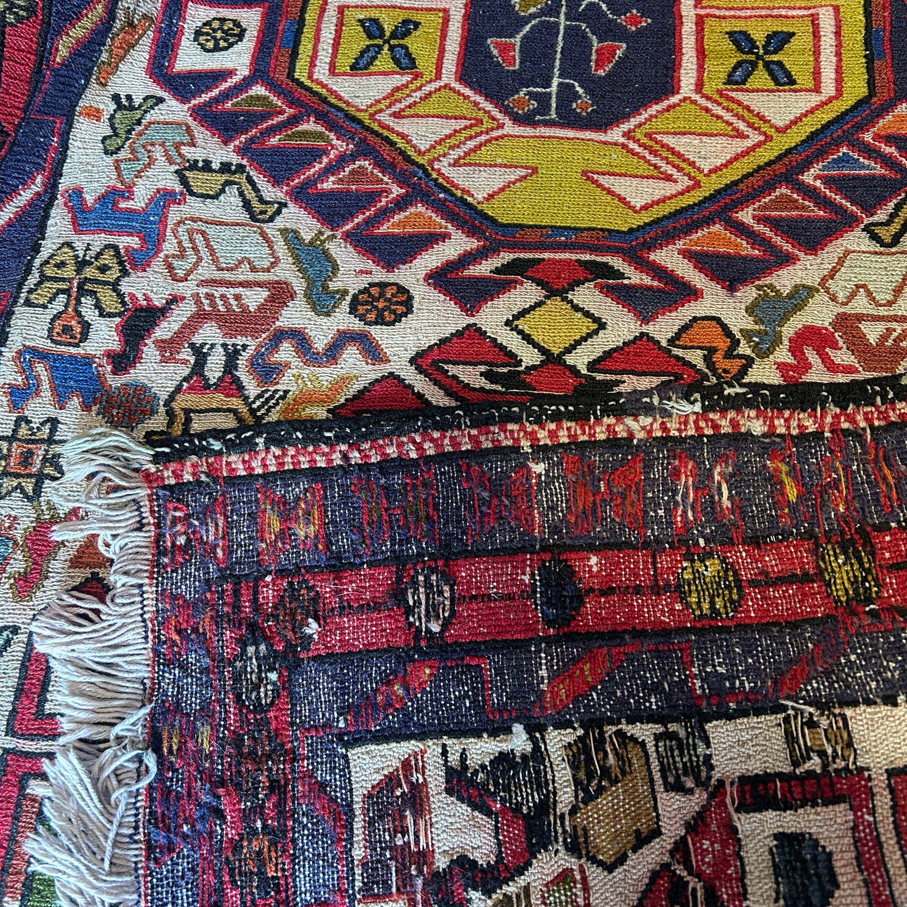 Espectacular alfombra pasillo de origen Cáucaso ruso, tejida a mano en lana, teñida de variados colores. El complejo tramado geométrico de la pieza está dividido en tres zonas: las figuras centrales en amarillo y azul, el área que las rodea, en los que prima un fondo blanco lleno de figuritas de animales y flores de colores, y un borde externo en un patrón geométrico en azul y rojo. En cada extremo se dejan las fibras de la urdimbre al aire. Se trata de una manufactura artesanal excepcional, para ser apreciada con tiempo y en detalle por quien la observa.
