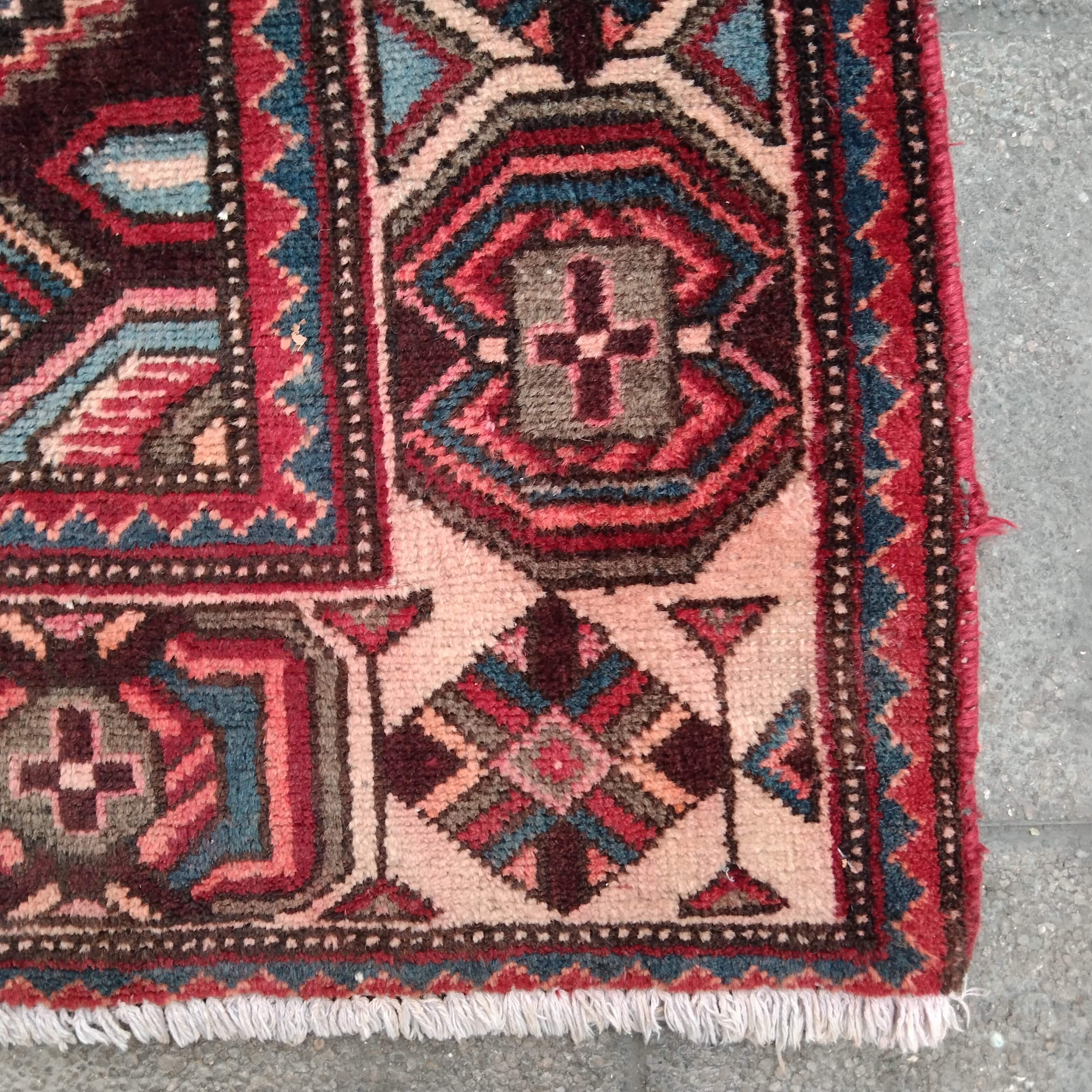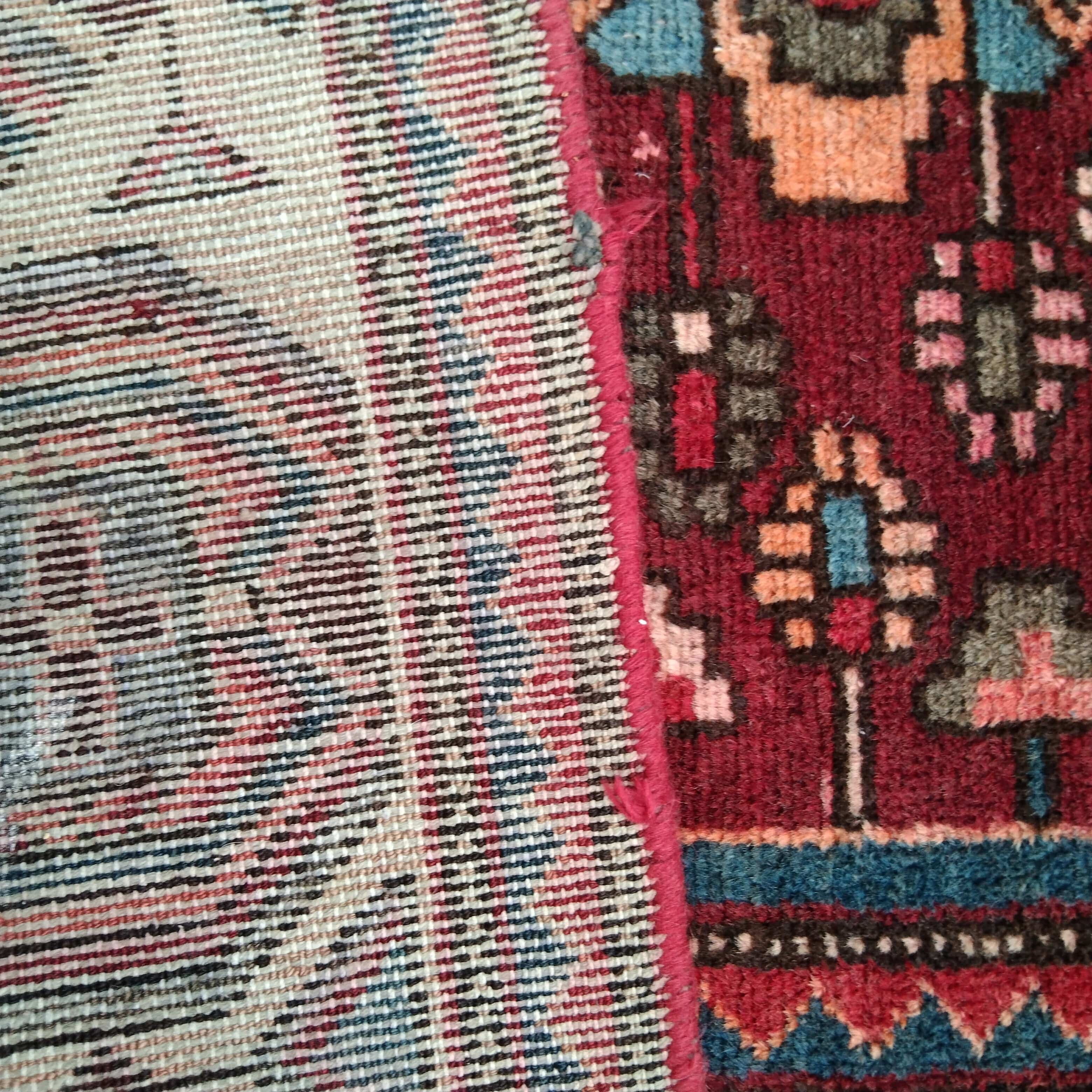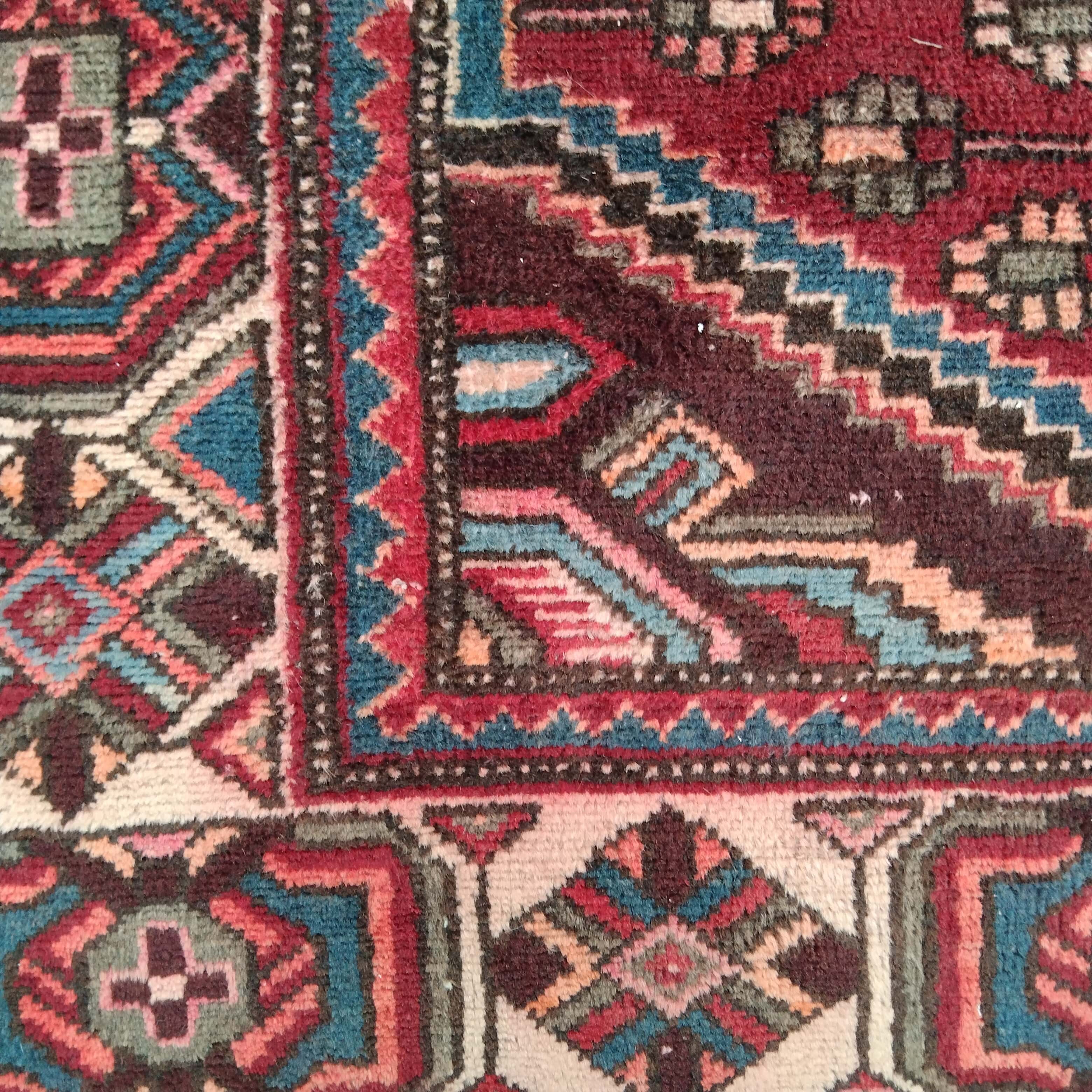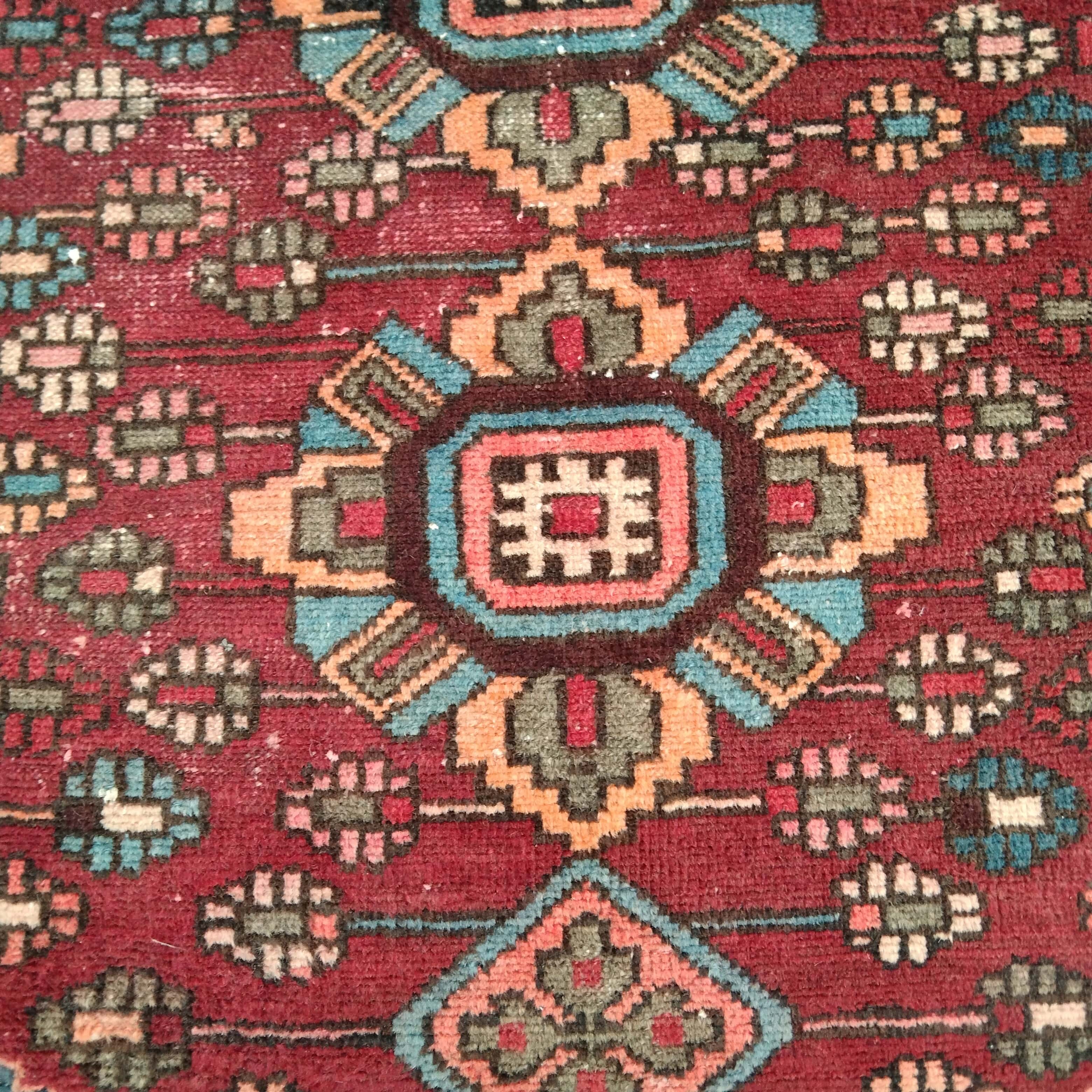 A beautiful hand-knotted Persian rug with beautiful geometric designs in shades of blue, orange, red, and yellow. Its central figure represents flowers that reflect all the shades of the rug.