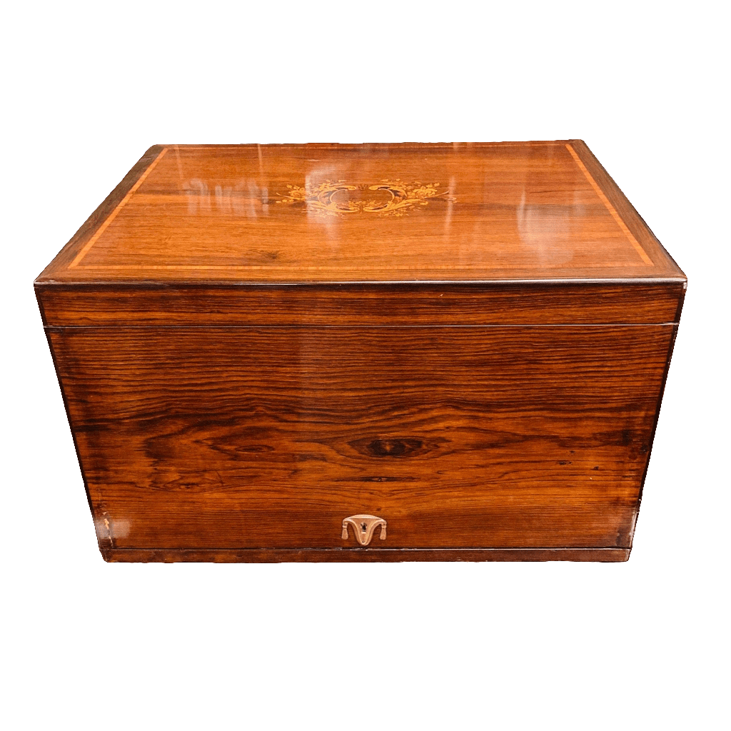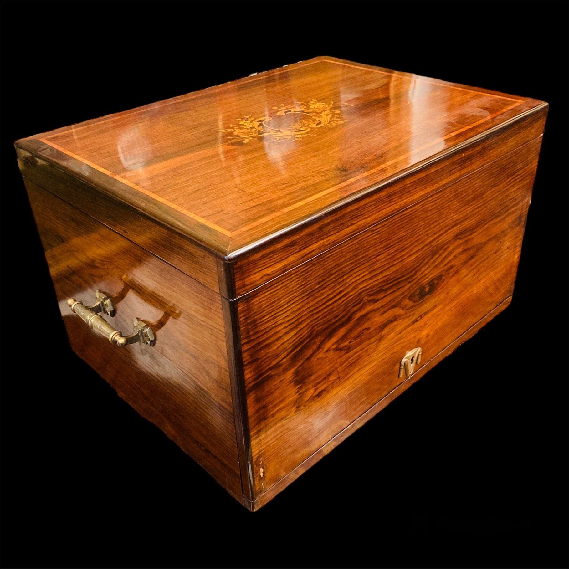 Louis XV-style mahogany shirt case. Used for transporting personal belongings, especially clothing. With an internal compartment. It features beautiful marquetry on the lid and bronze handles on the sides.