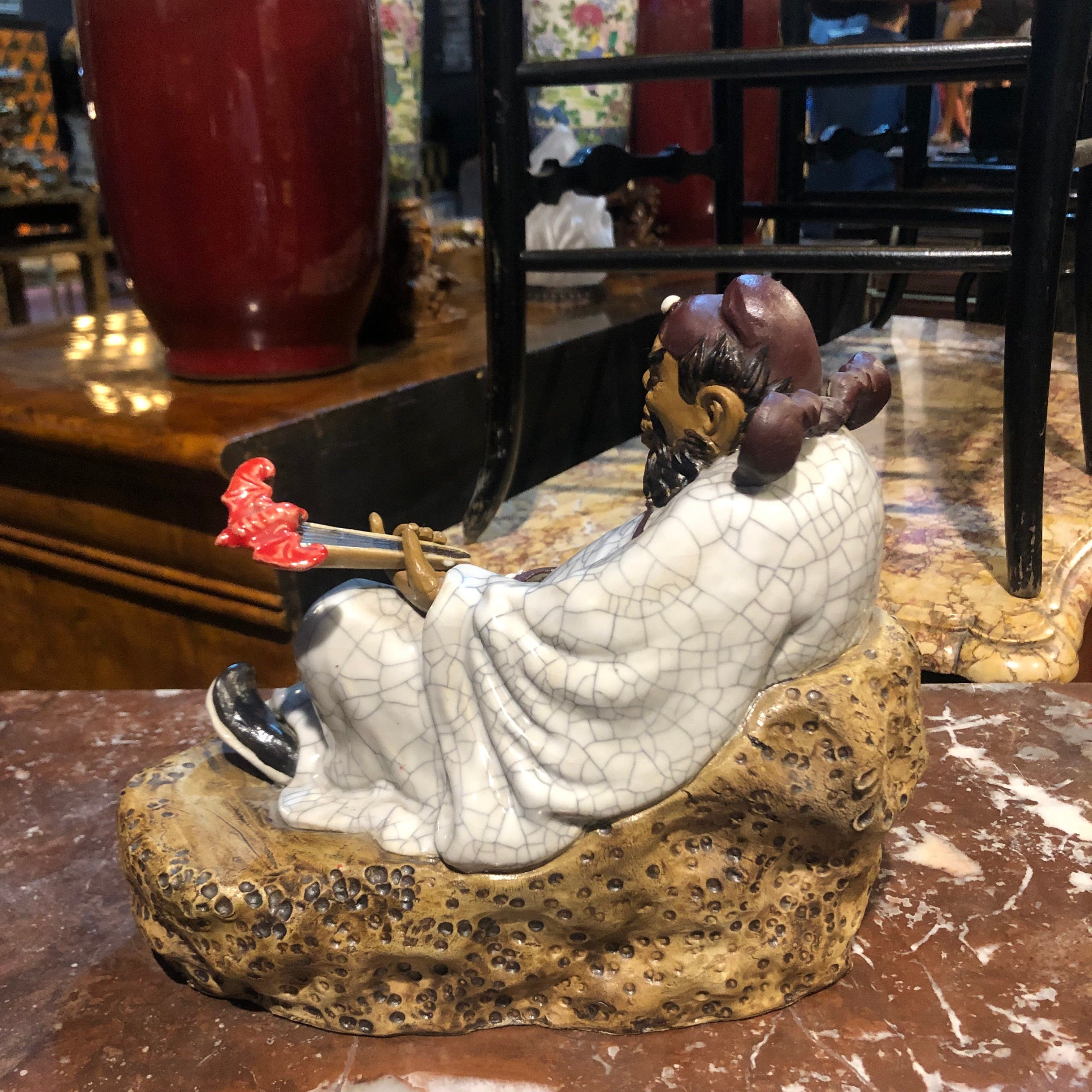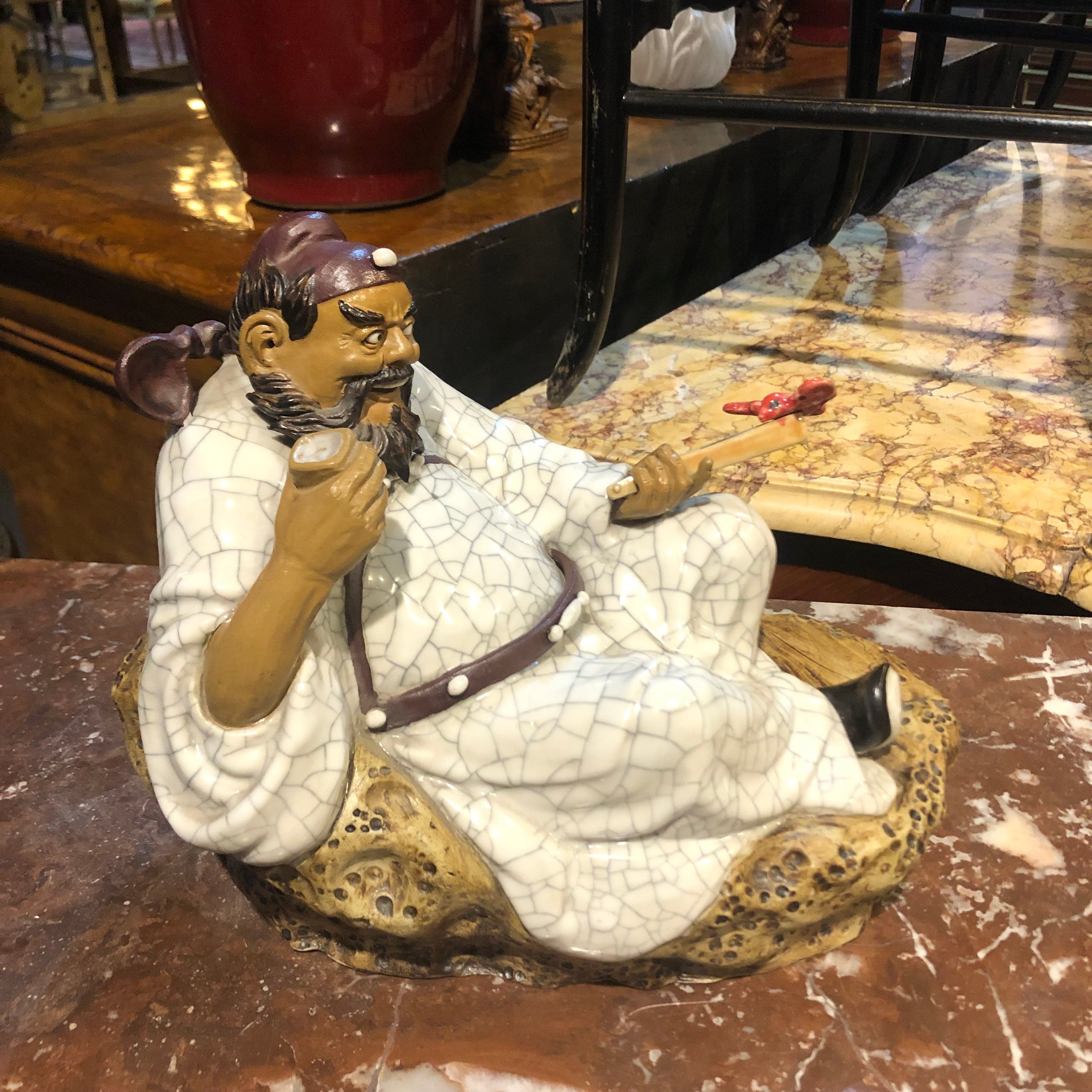 Chinese Dignitary Figure with Crackled Ceramic Fan