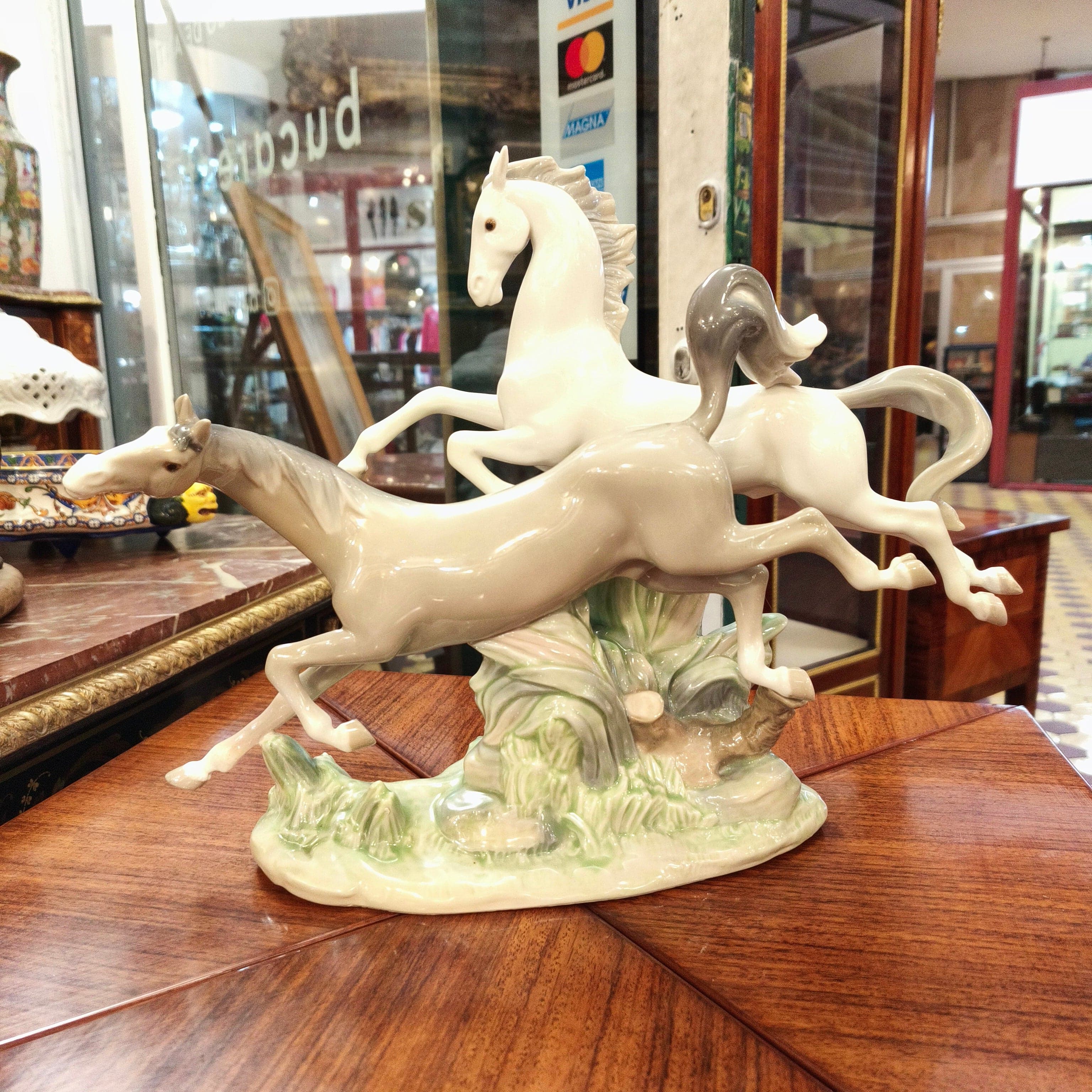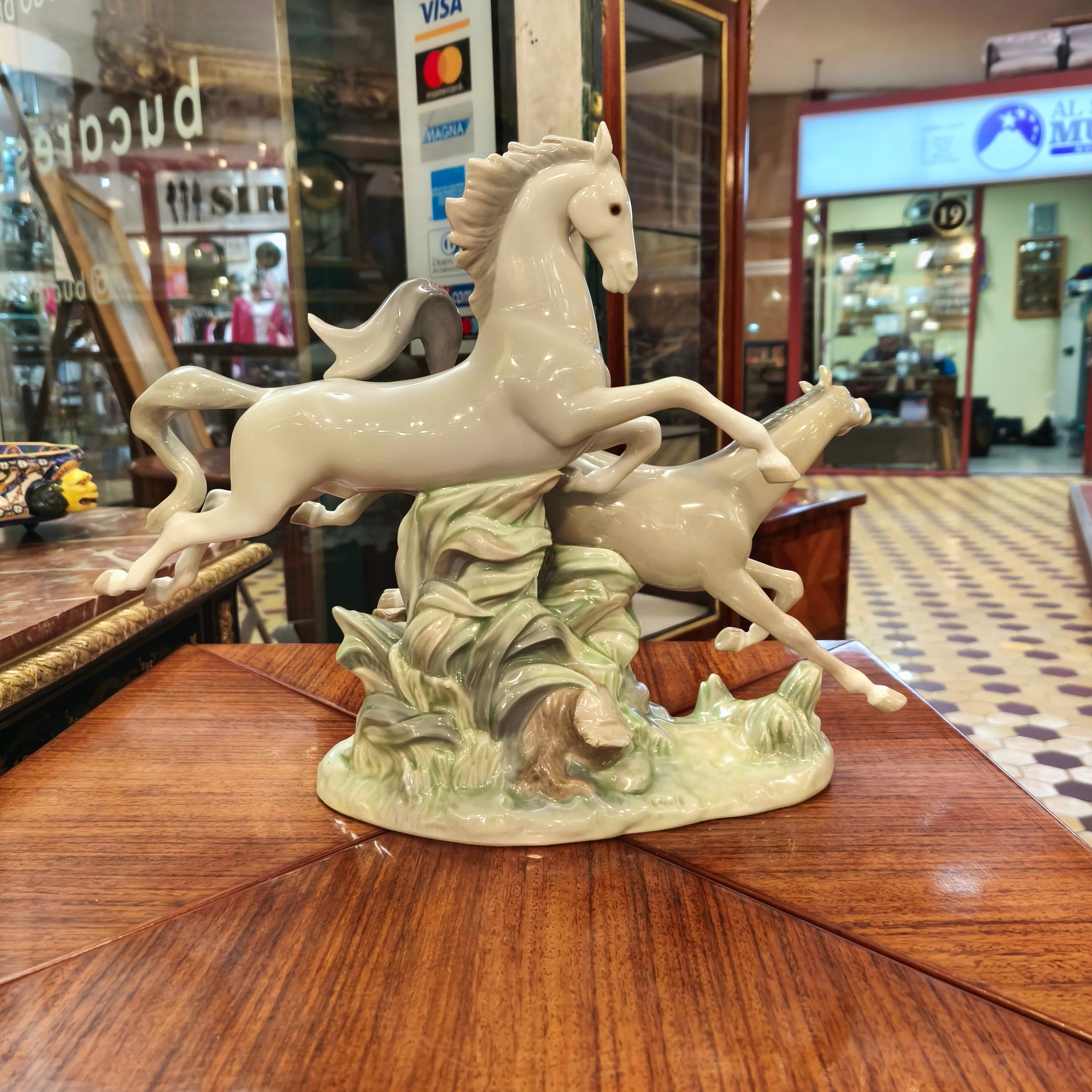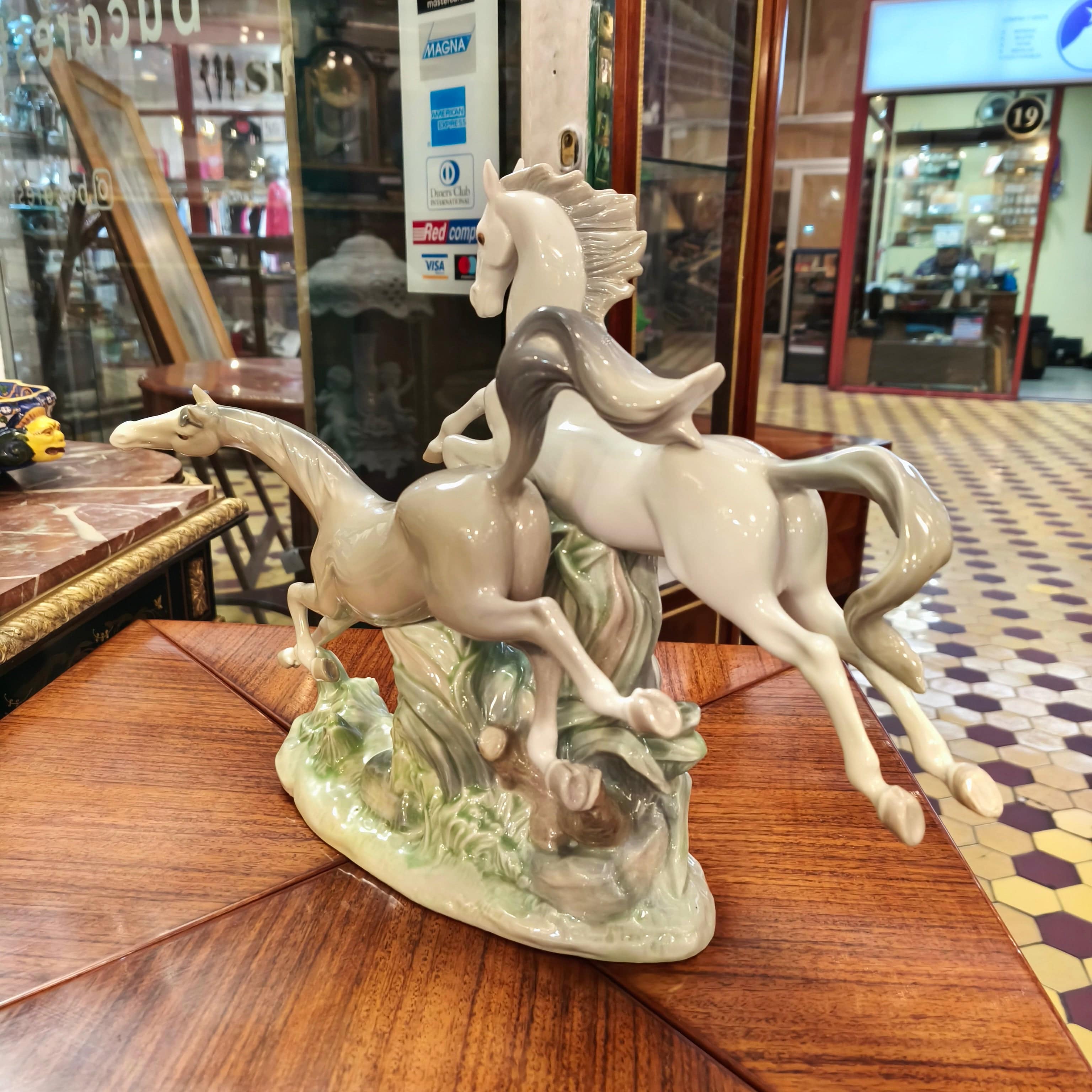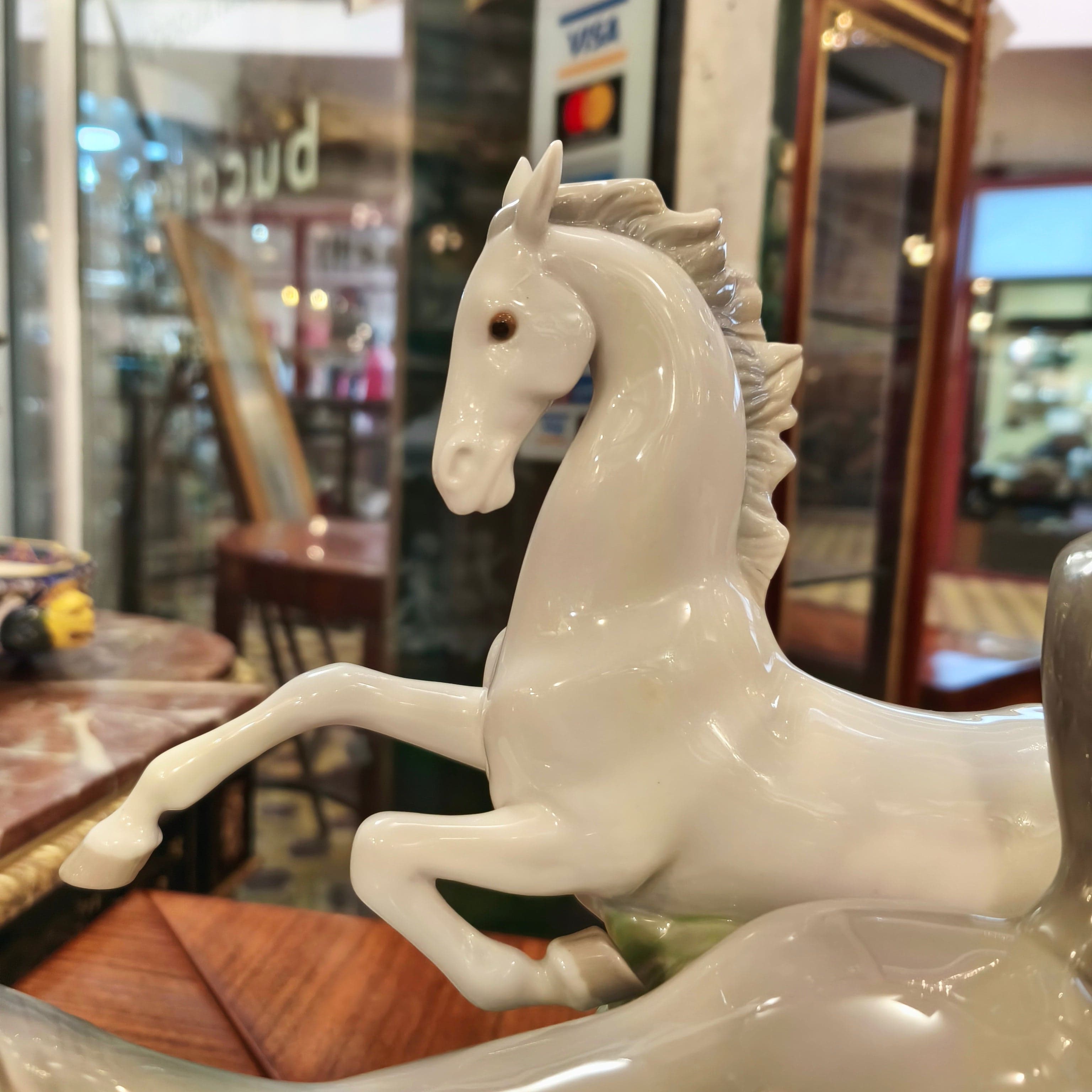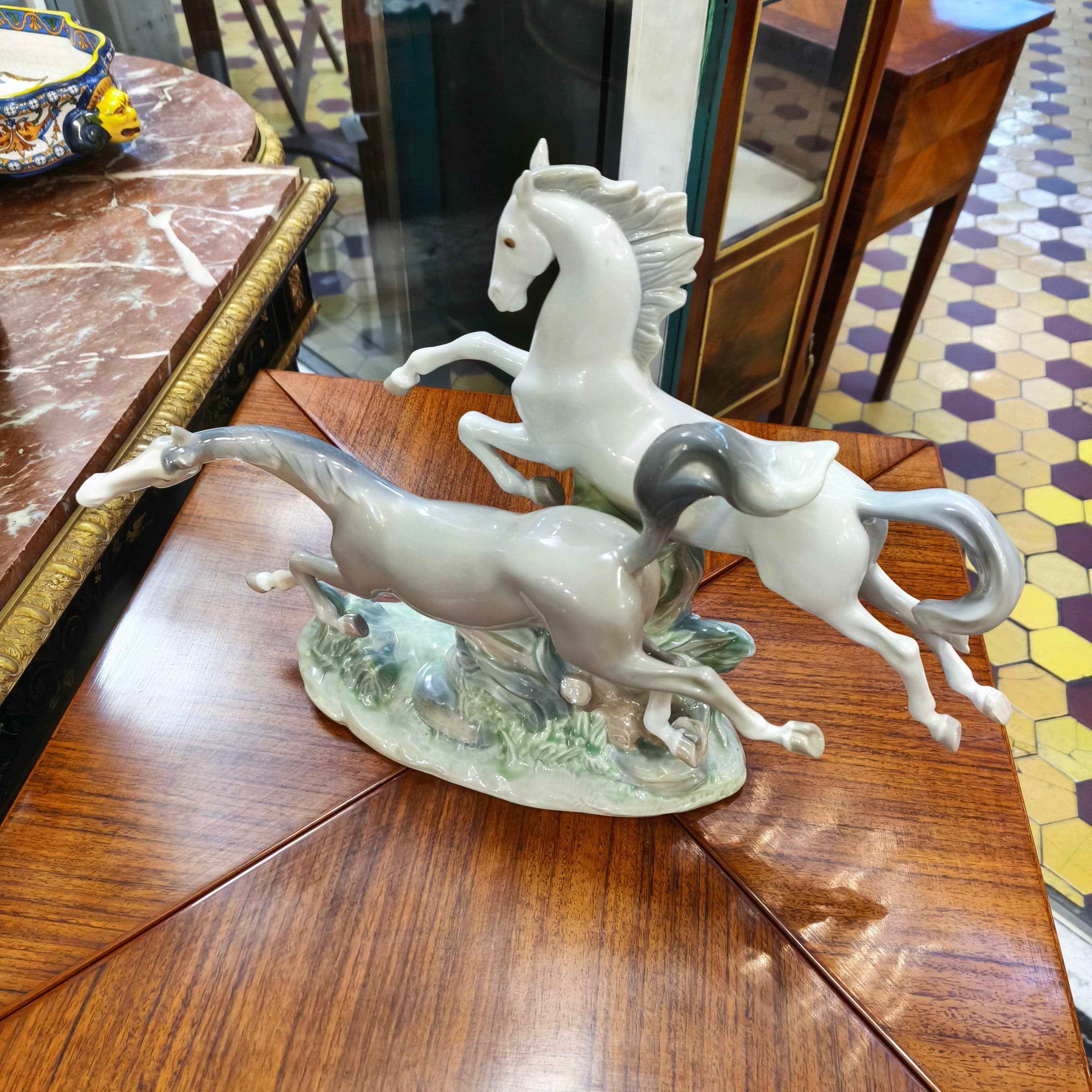 Beautiful porcelain figure from the Spanish brand Lladró, in which we can see two galloping horses, one gray, the other white.