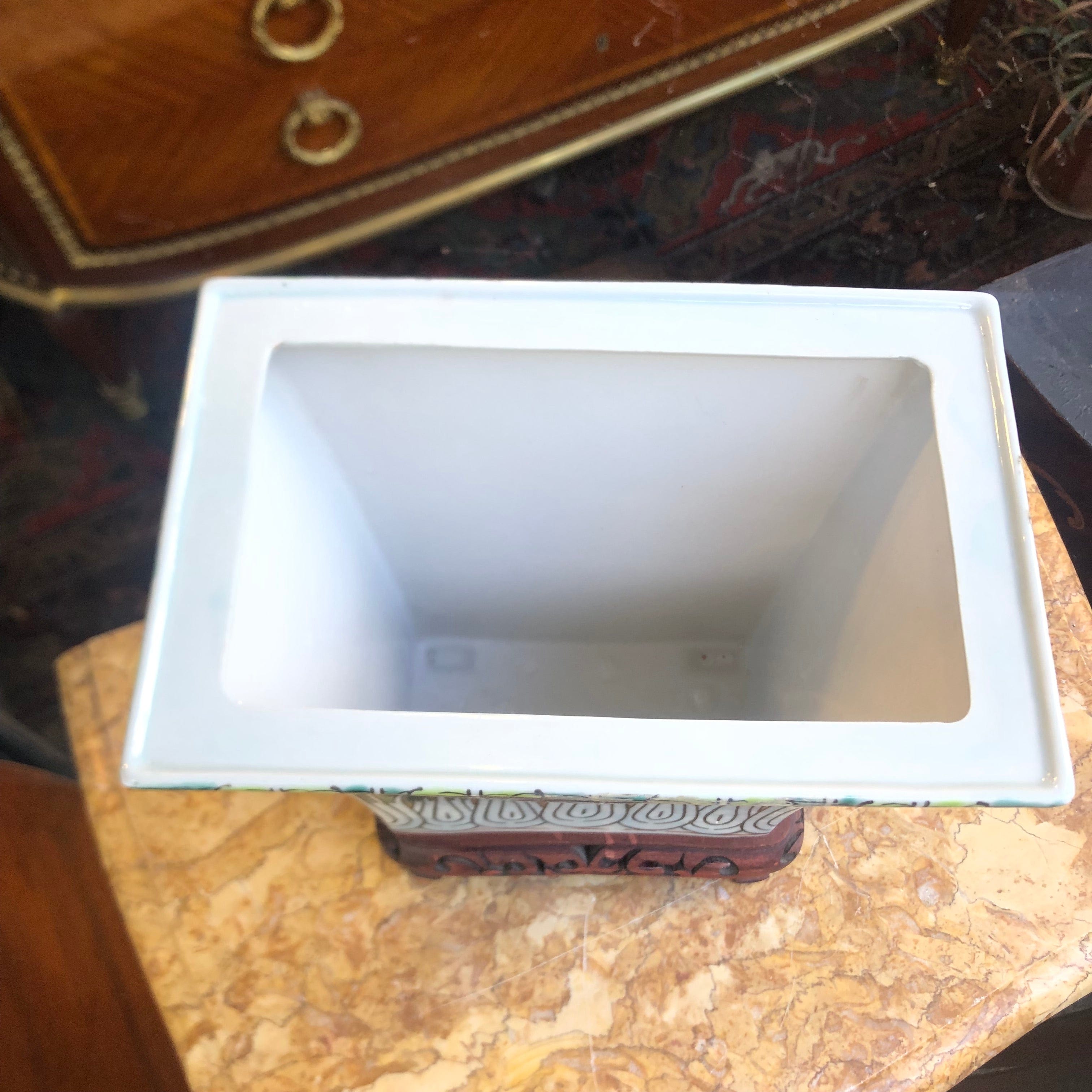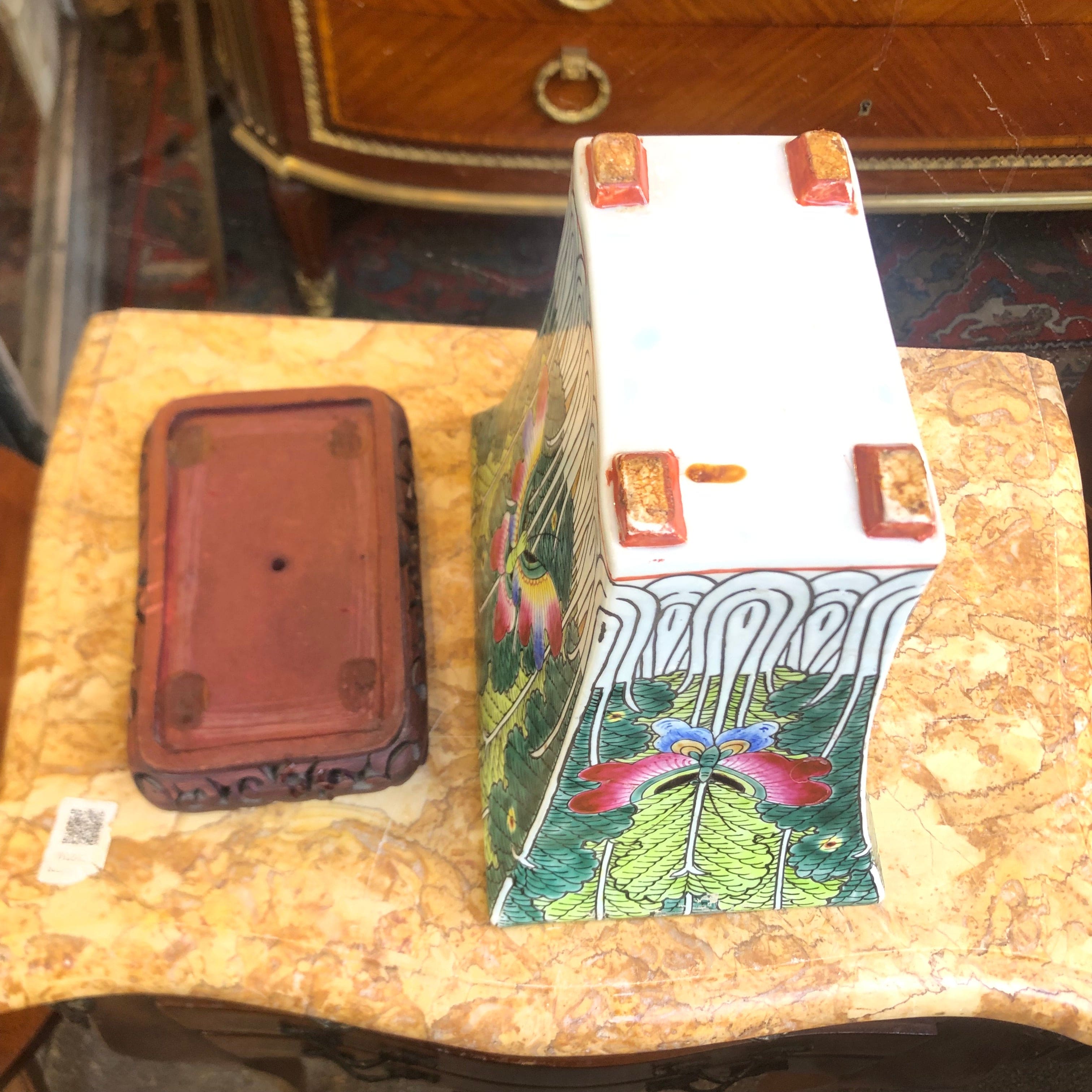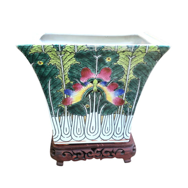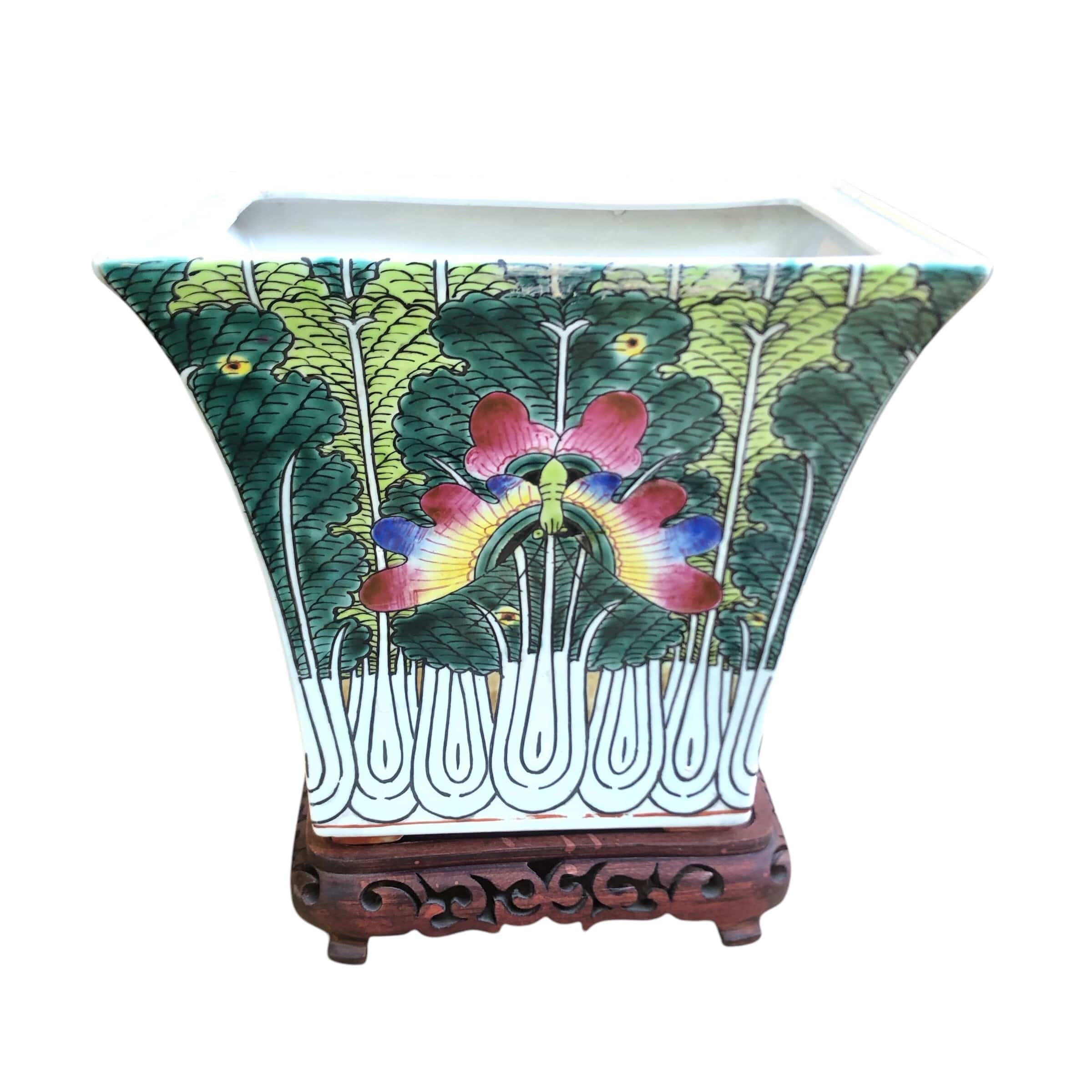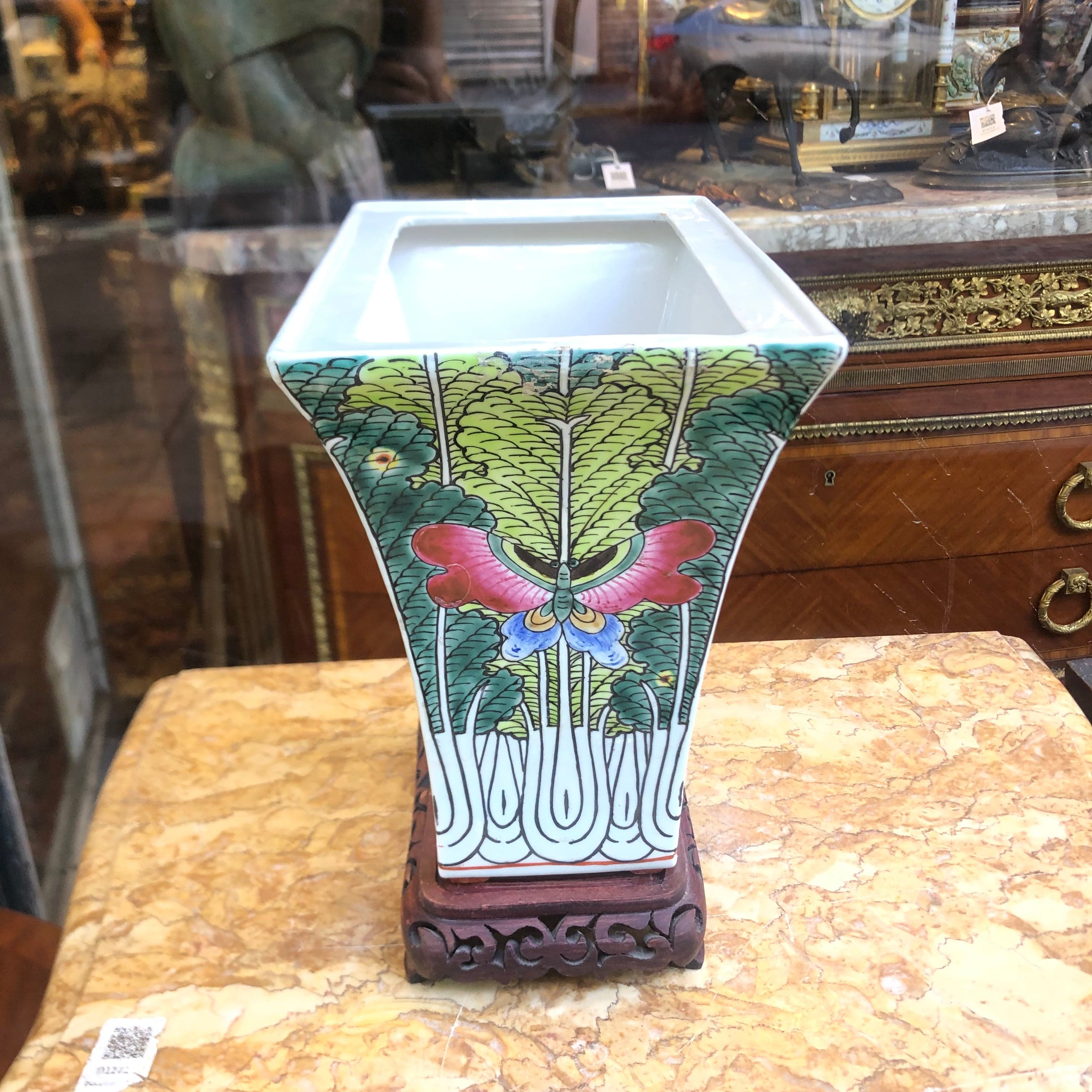 Beautiful Chinese pot painted in bright greens, blues, and pinks, along with a beautiful butterfly. It is also mounted on a wooden stand.