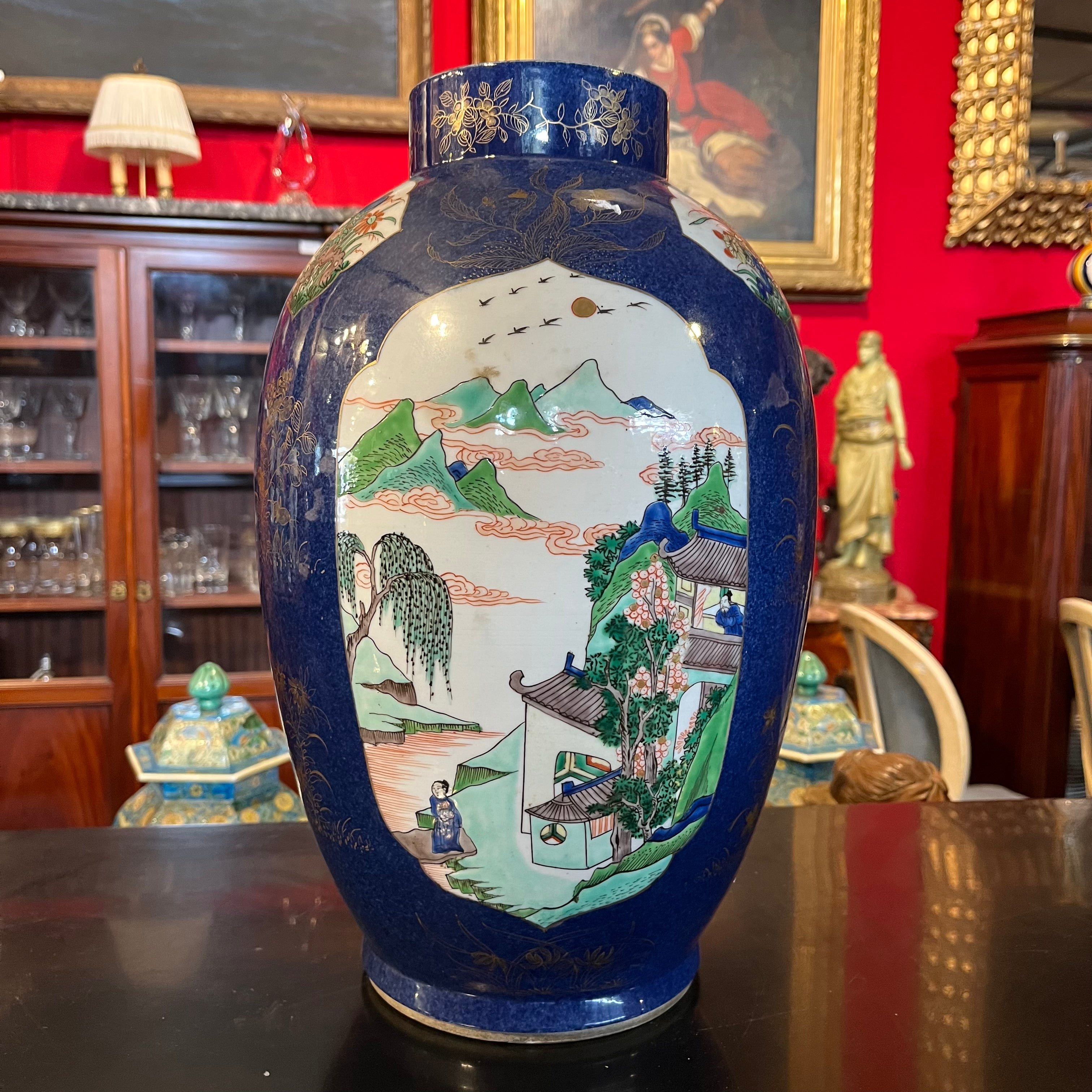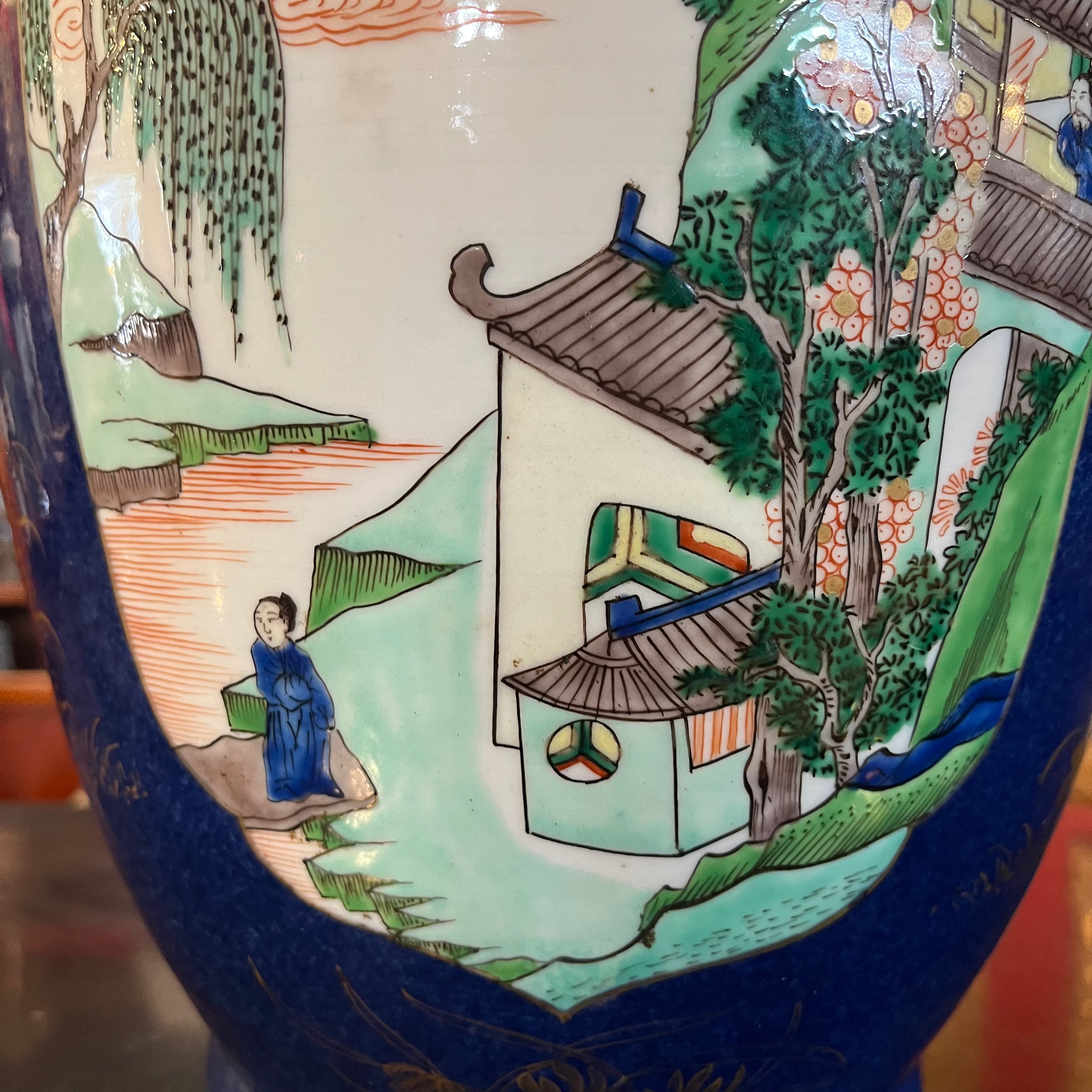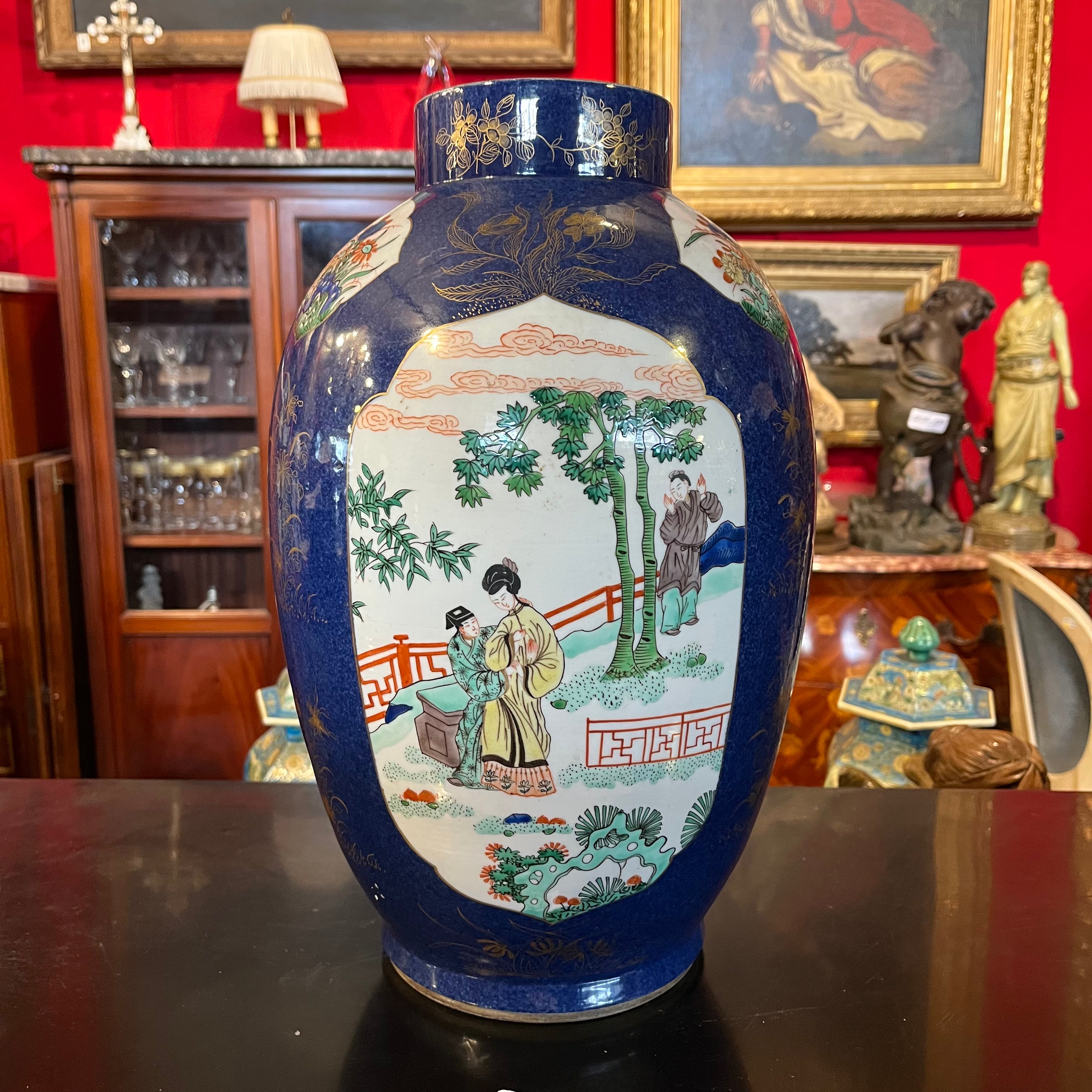 Porcelain vase with enameled decoration of animated landscapes. Blue and gold.