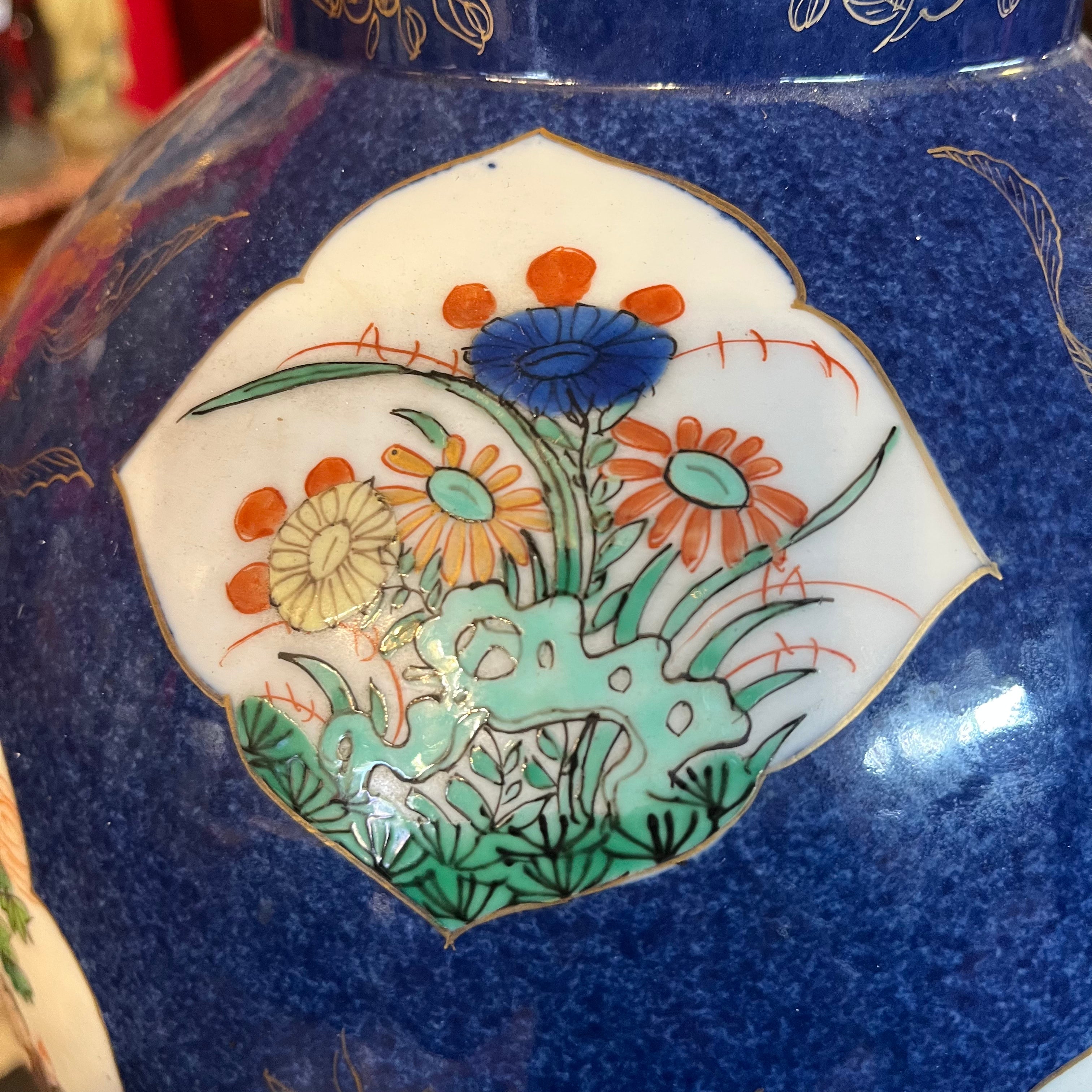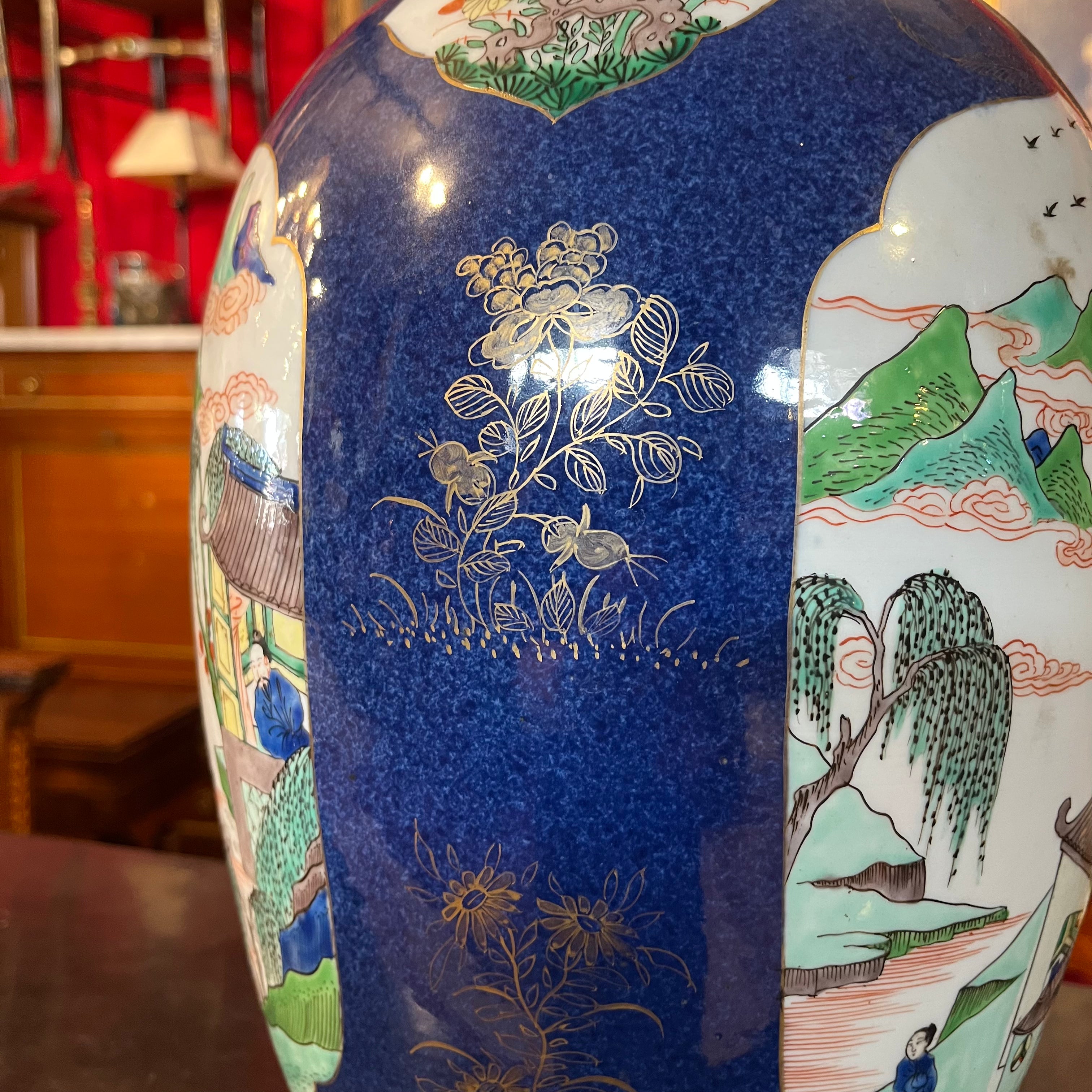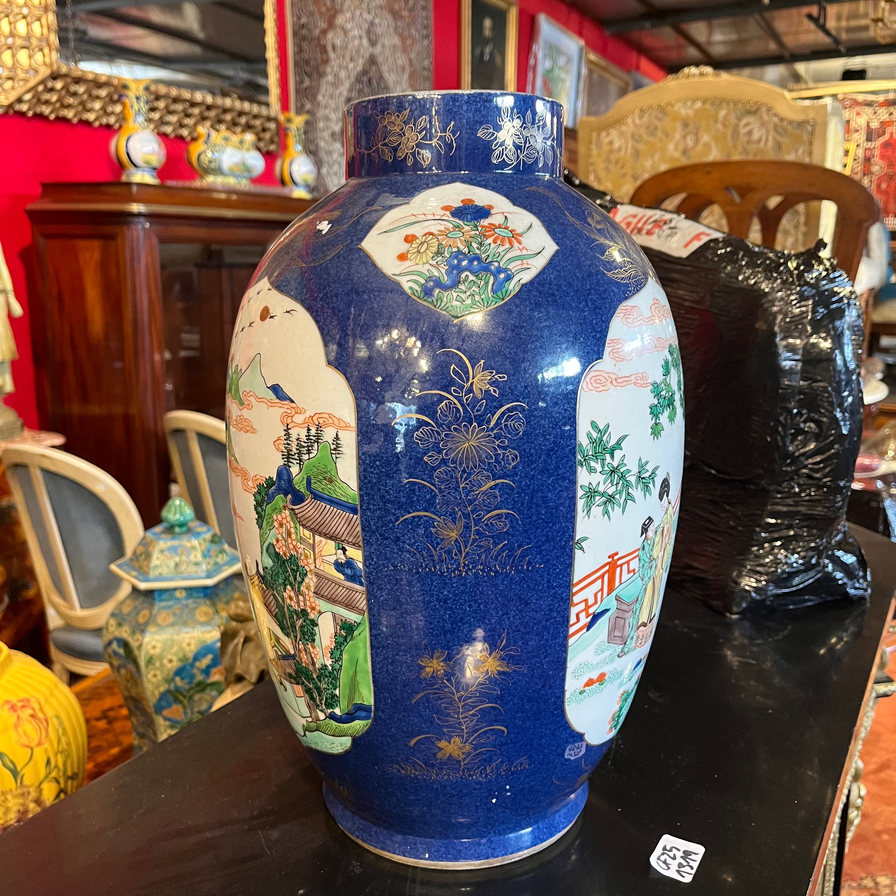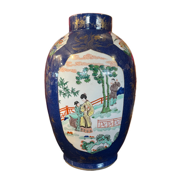 Porcelain vase with enameled decoration of animated landscapes. Blue and gold.