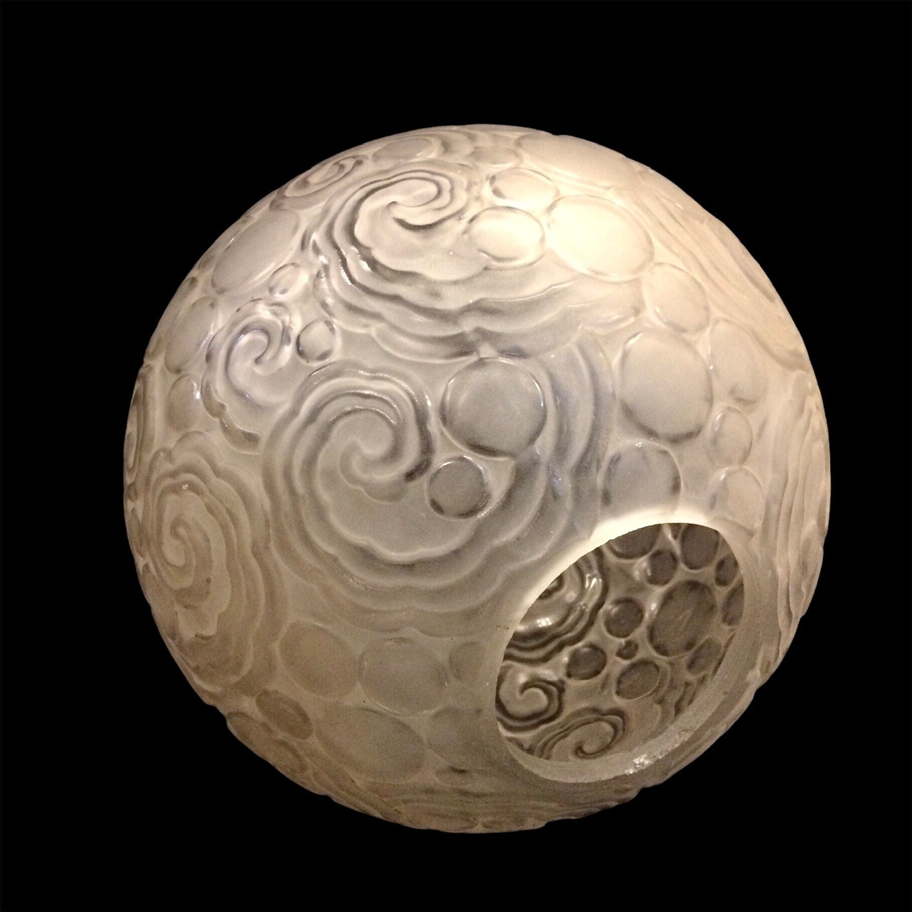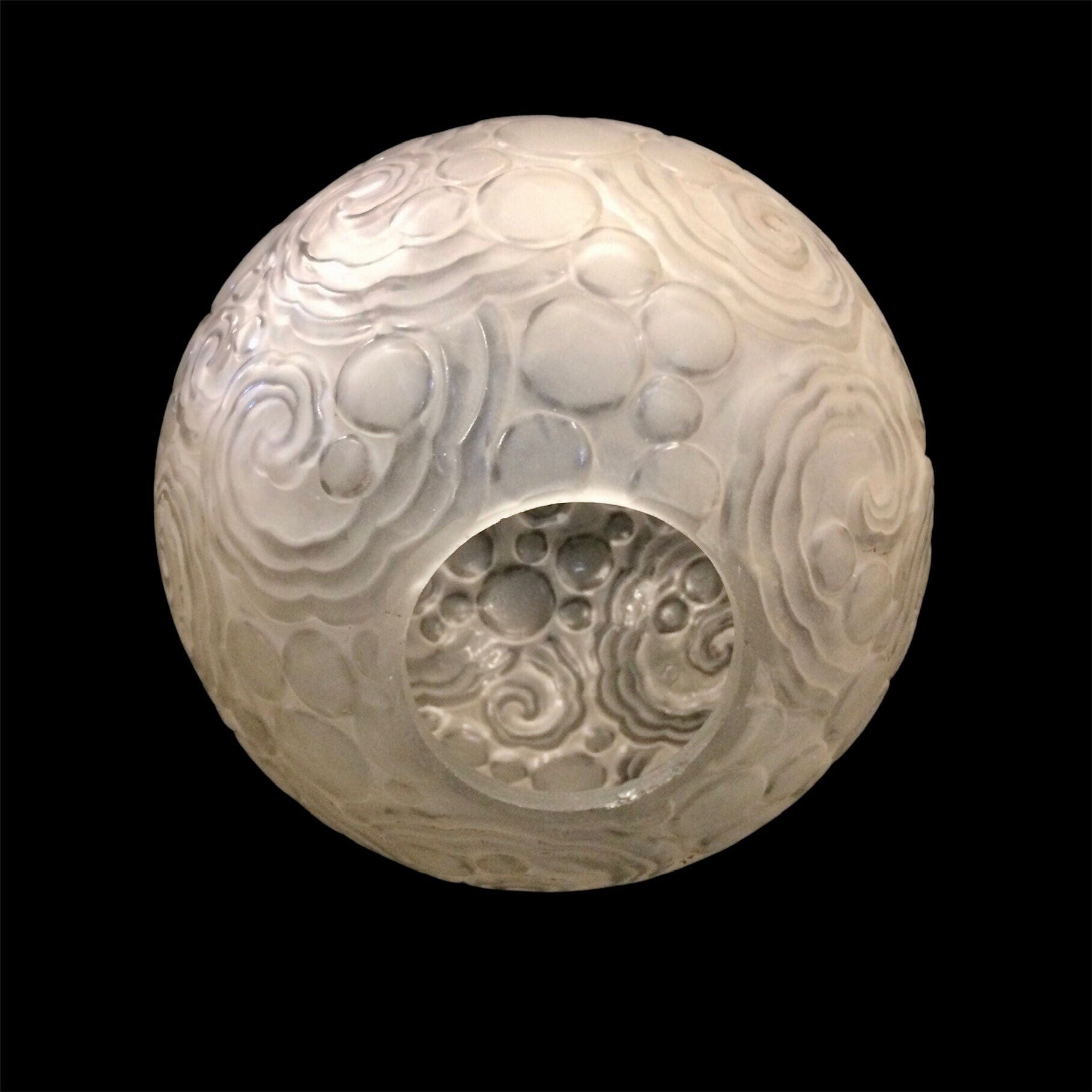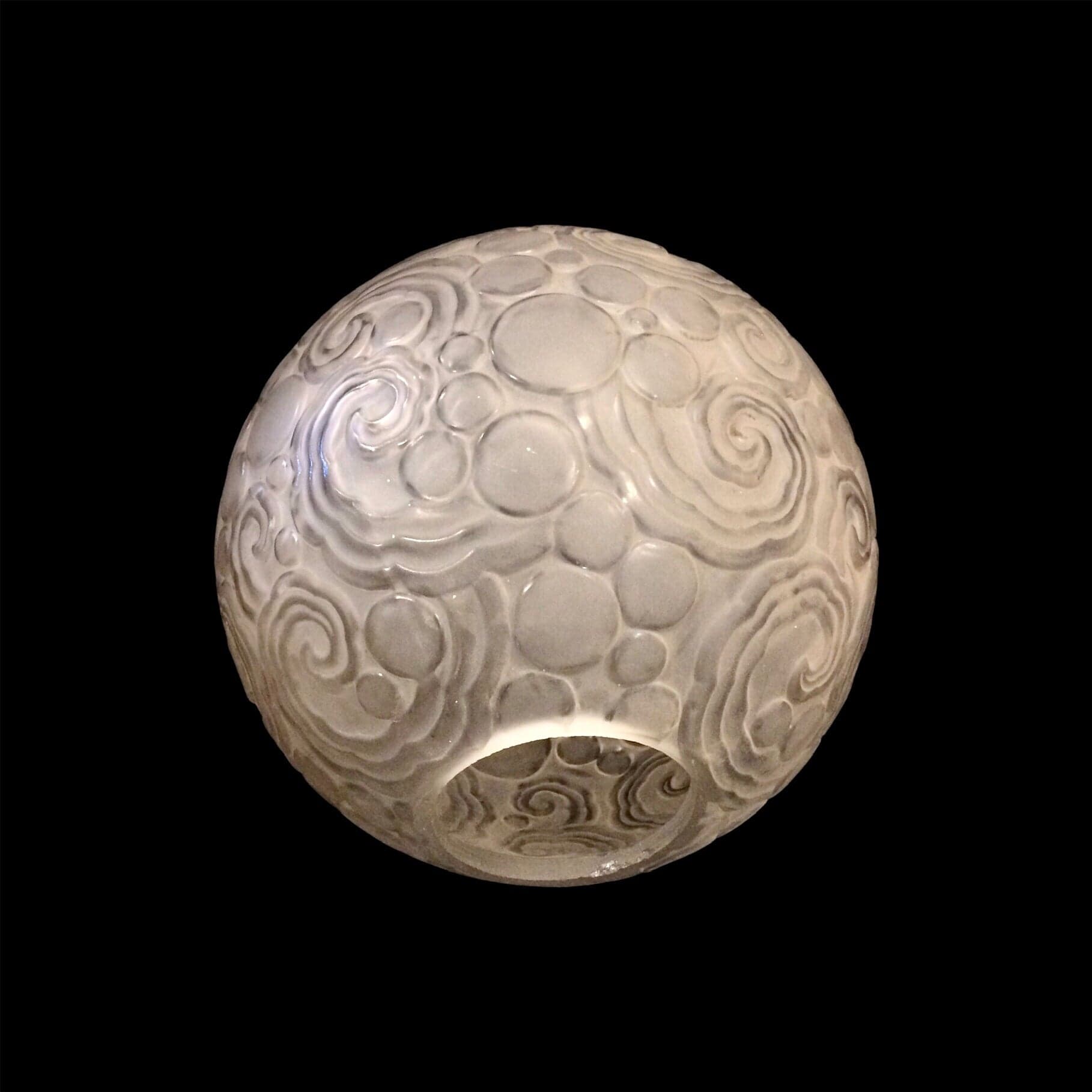 Satin glass shade with globe-shaped bas-reliefs, in Art Deco style, for ceiling lamps with arms or table lamps, allowing you to give a decorative and elegant touch to your space. Signed in Paris with the “Sabino” stamp.