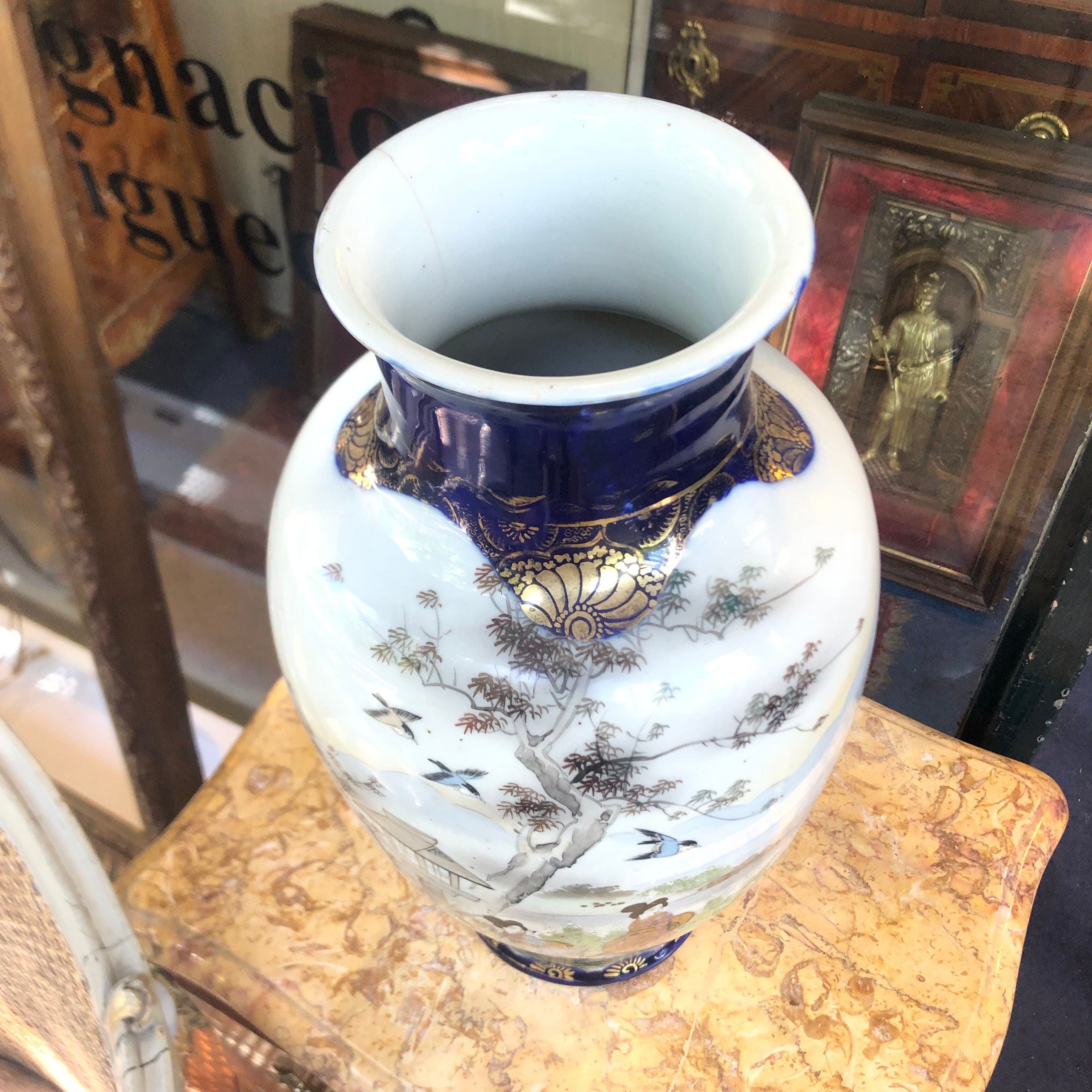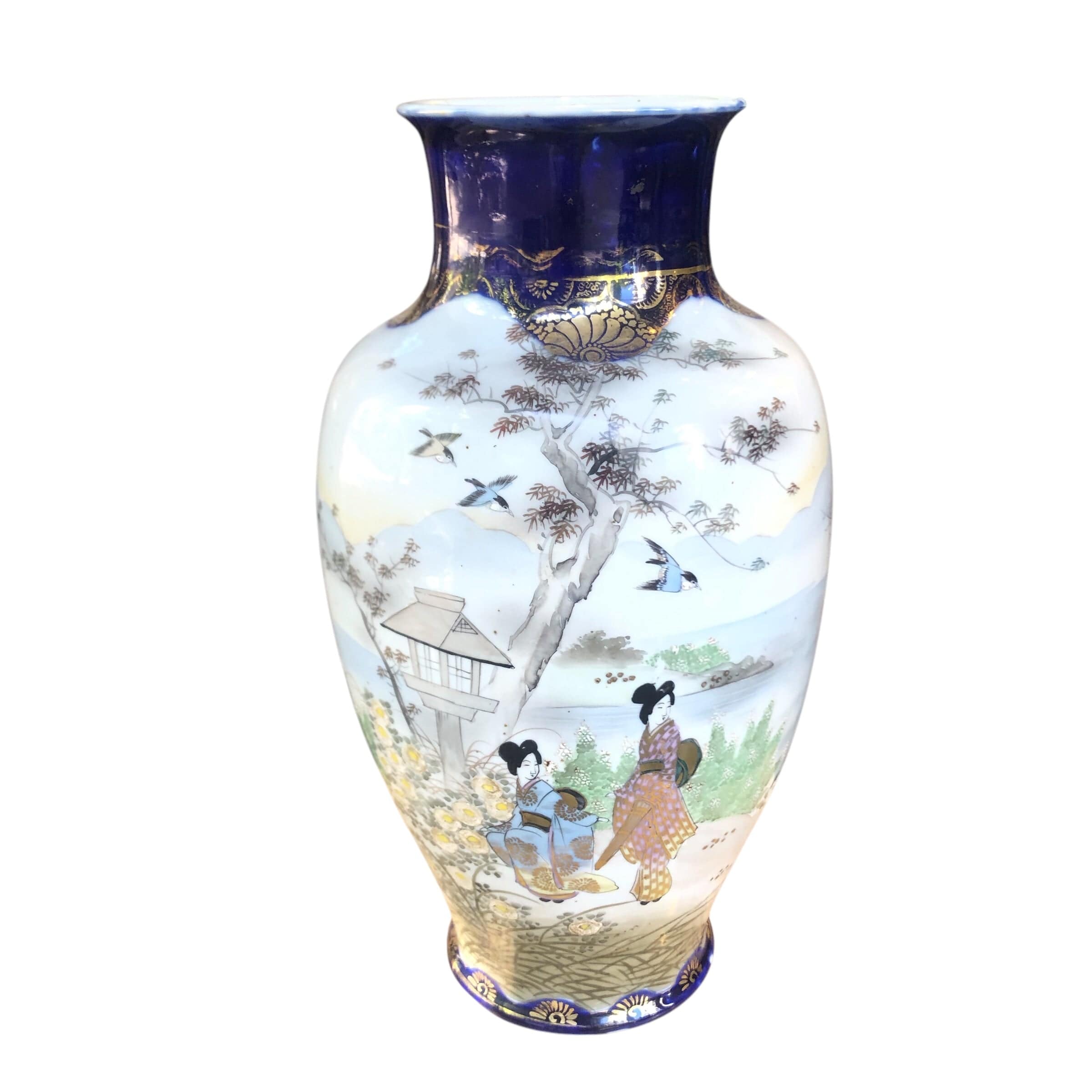 Chinese blue and gold vase with women and swallows