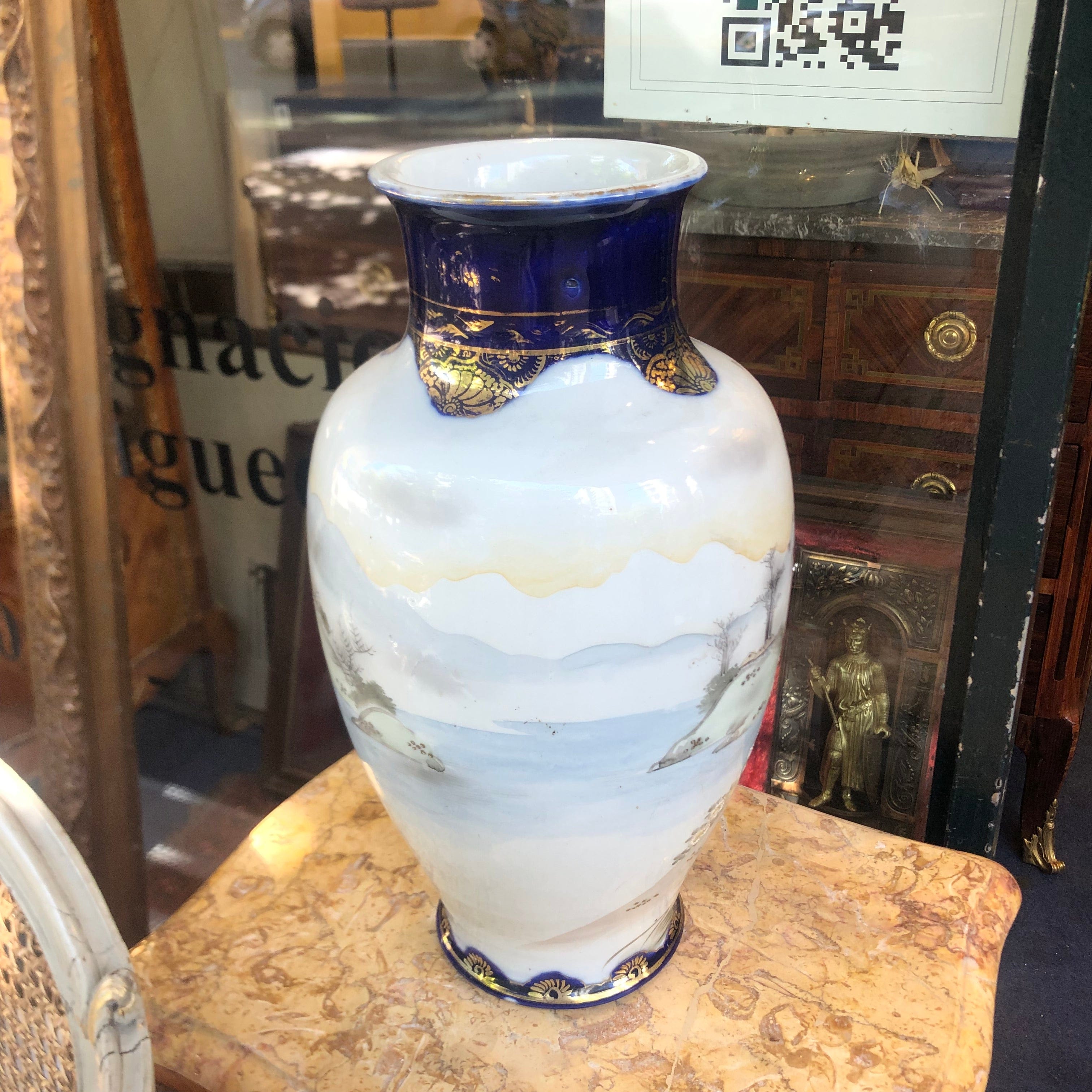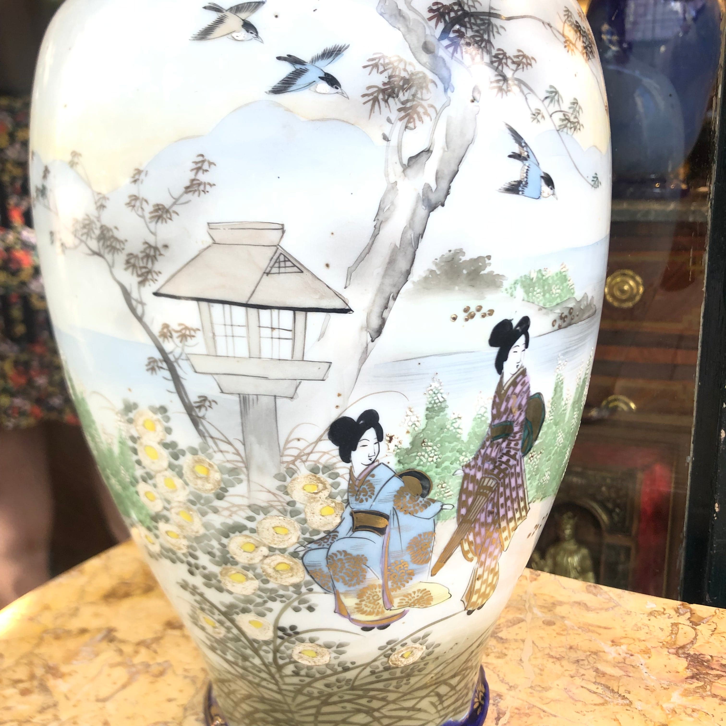 Large Chinese porcelain vase in white, gray, blue, and gold tones. It depicts a scene of two women outdoors with a lake in the background and swallows in the sky.