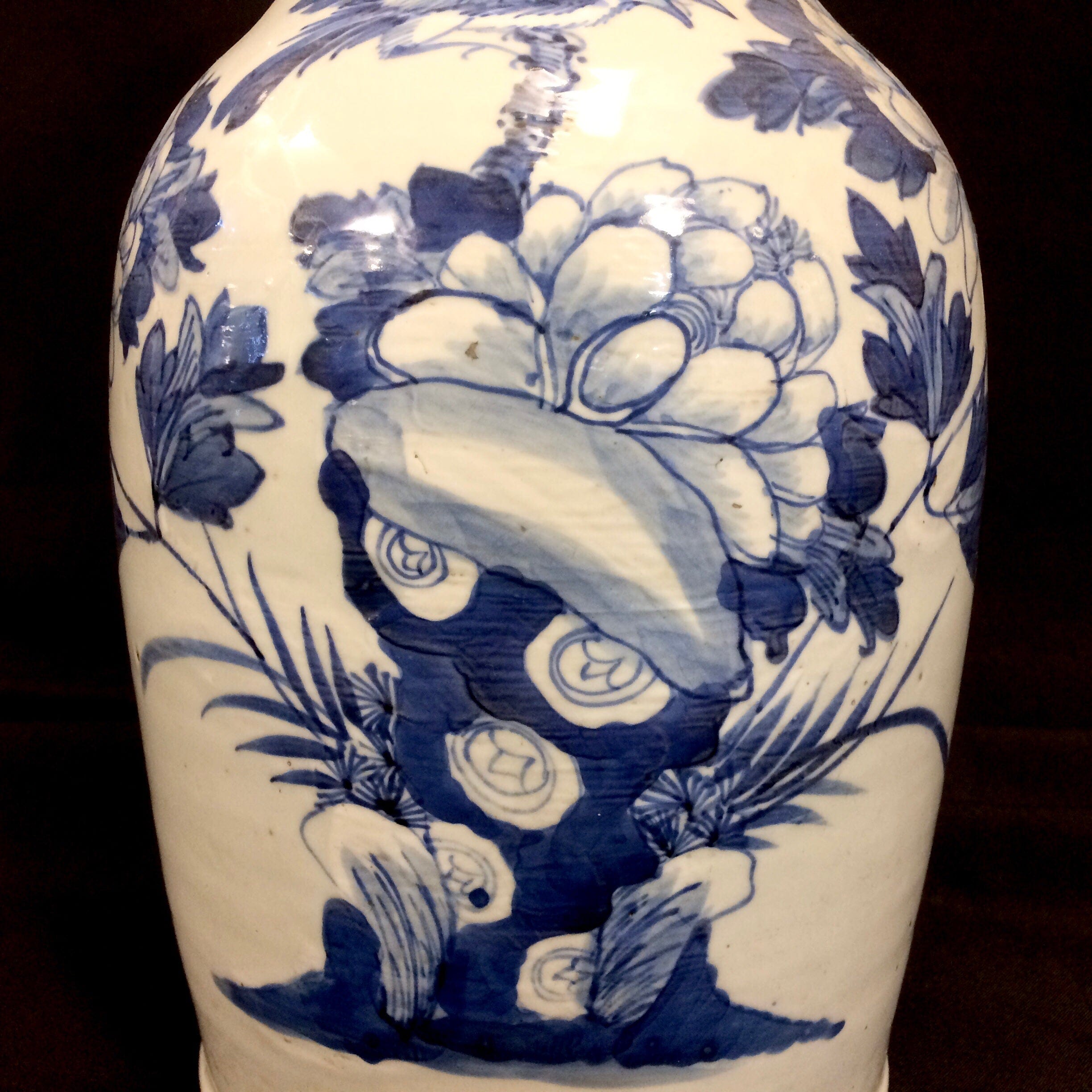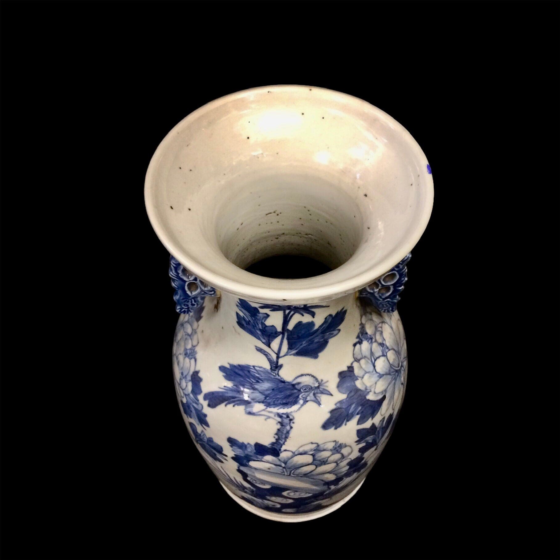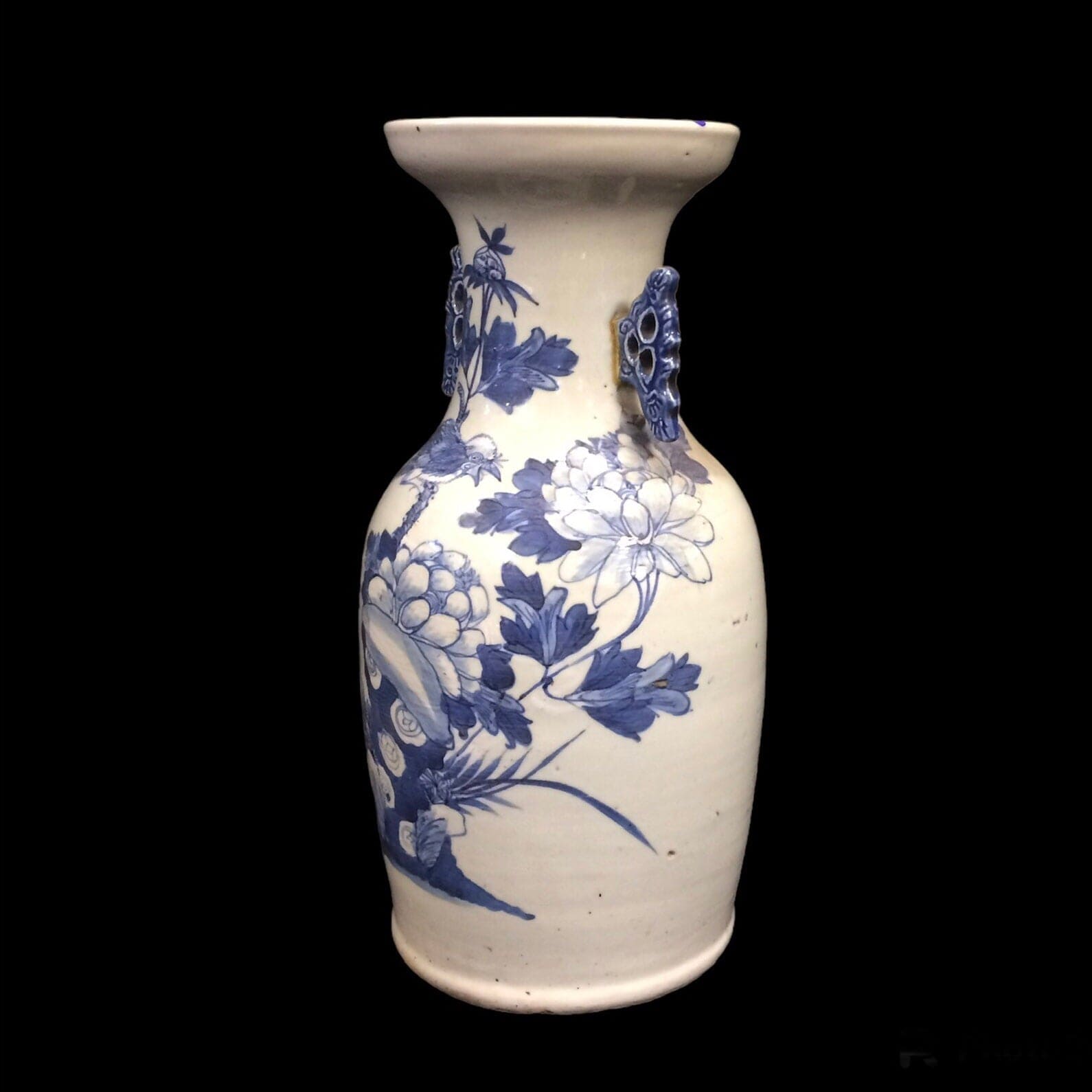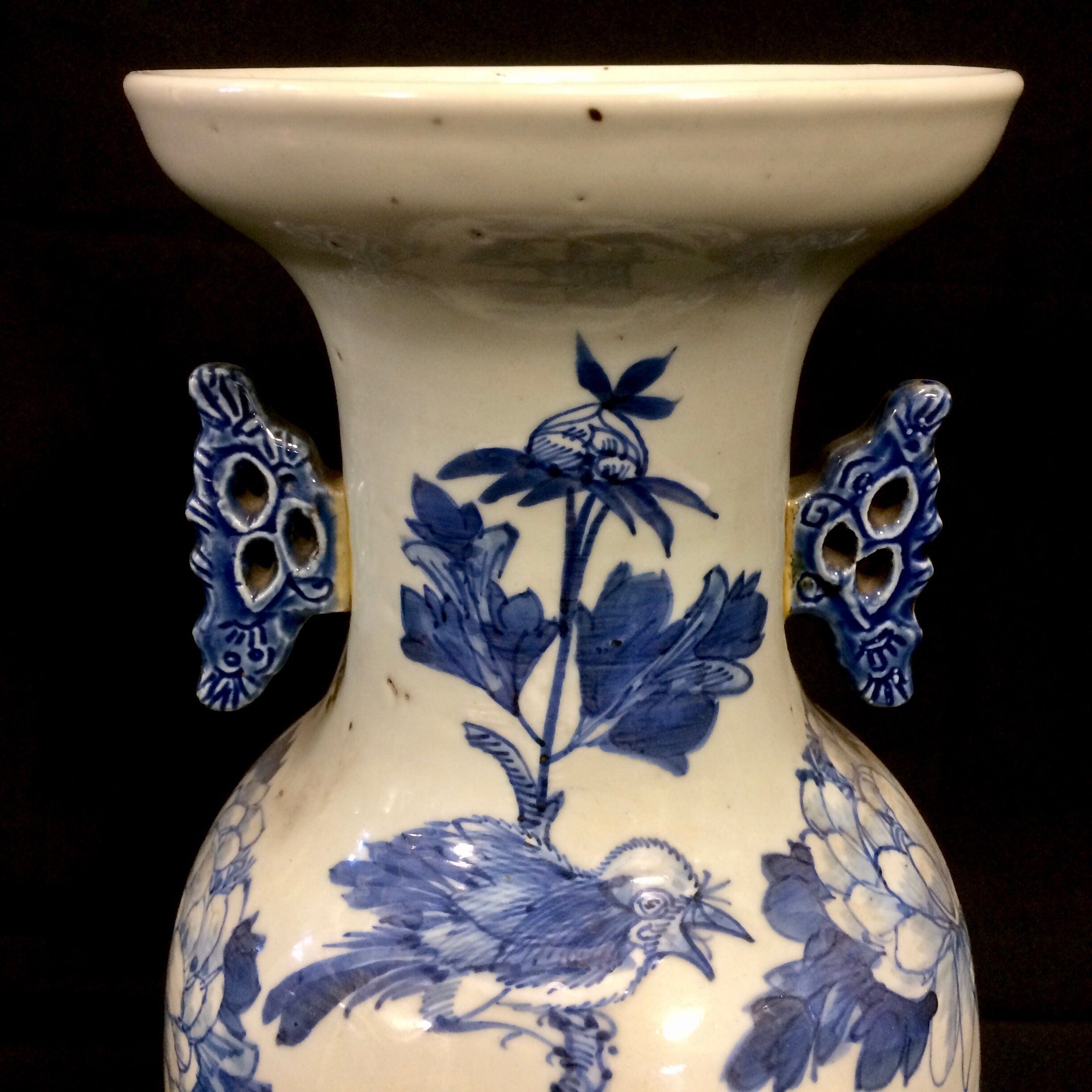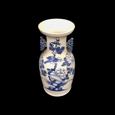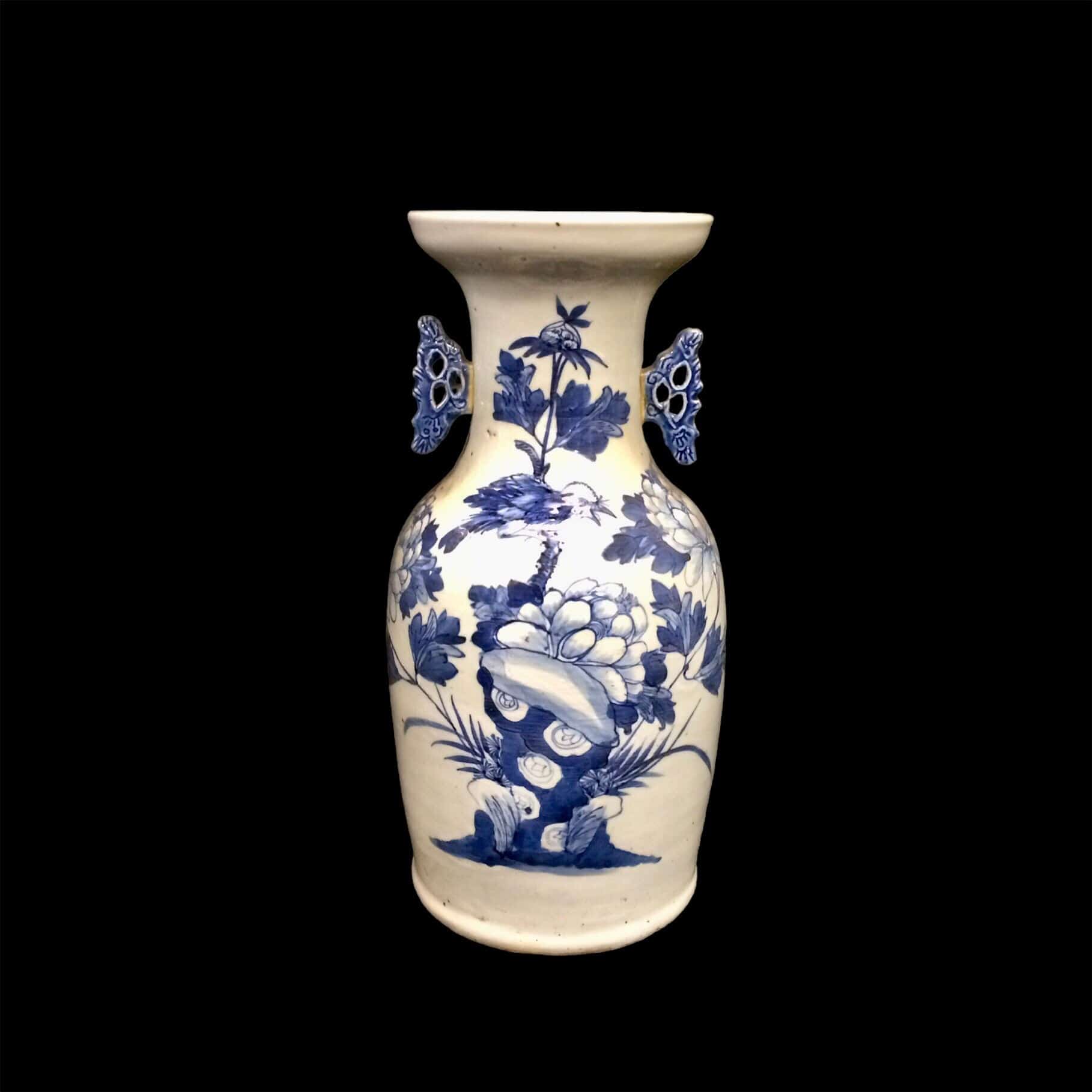 Large Chinese blue and white porcelain vase with delicate floral handles. It features a bird and flower design on the exterior.