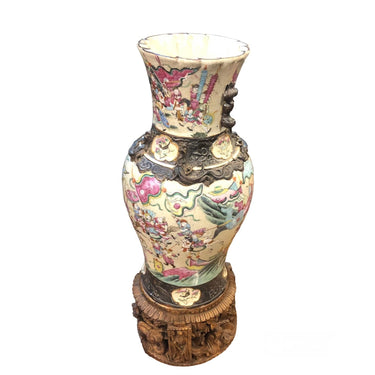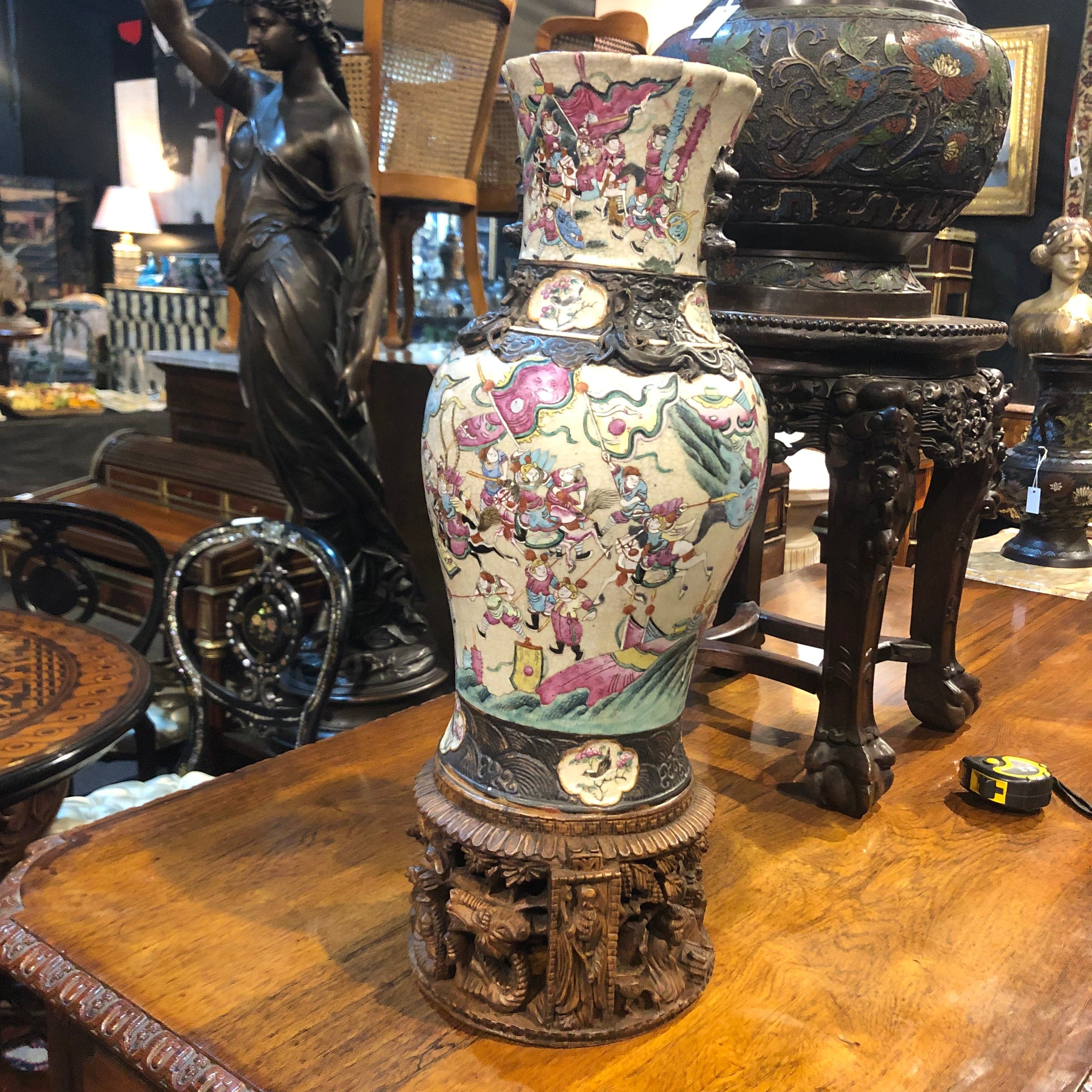 Beautiful Chinese porcelain vase with a carved wooden base. A beautiful flower and horse design on white porcelain.