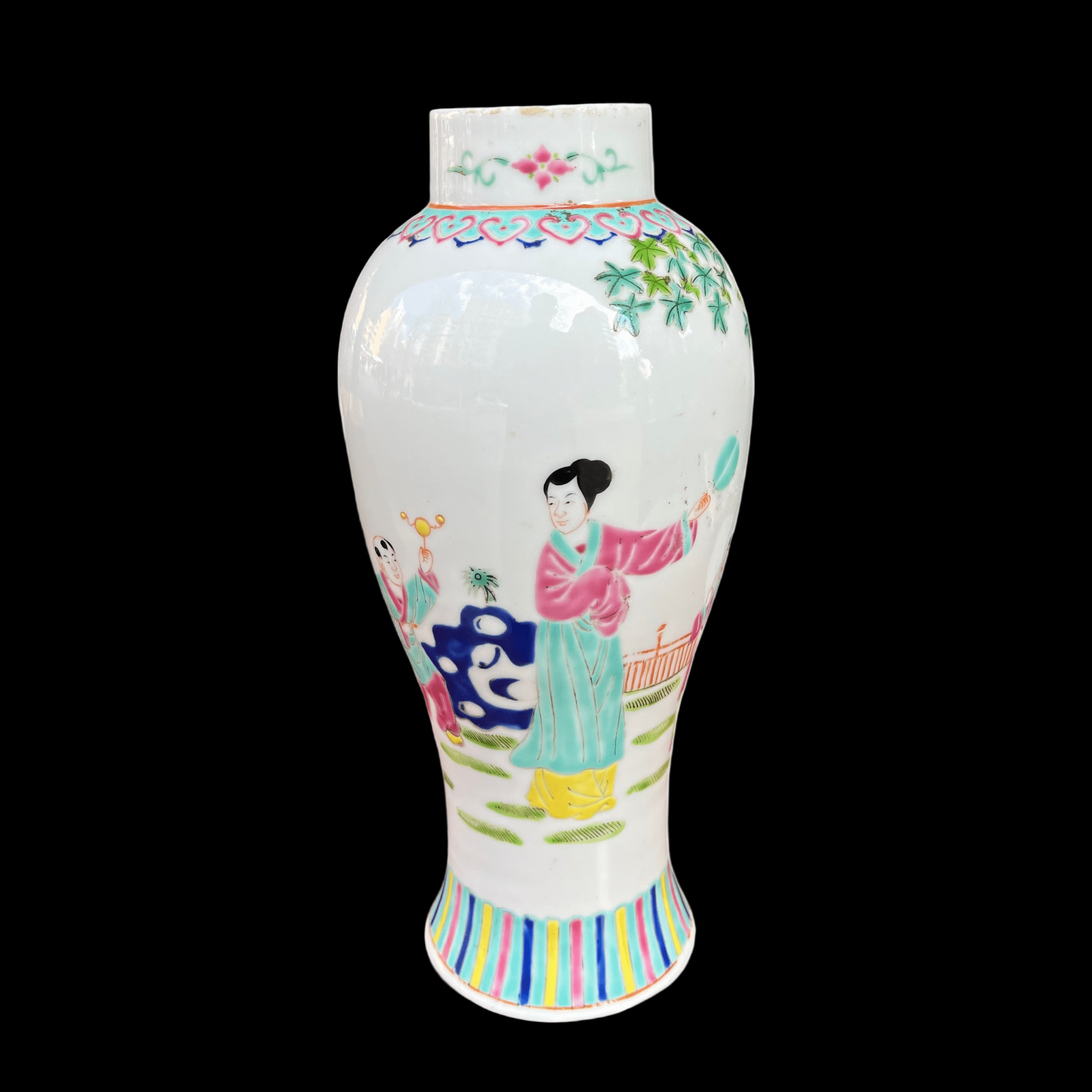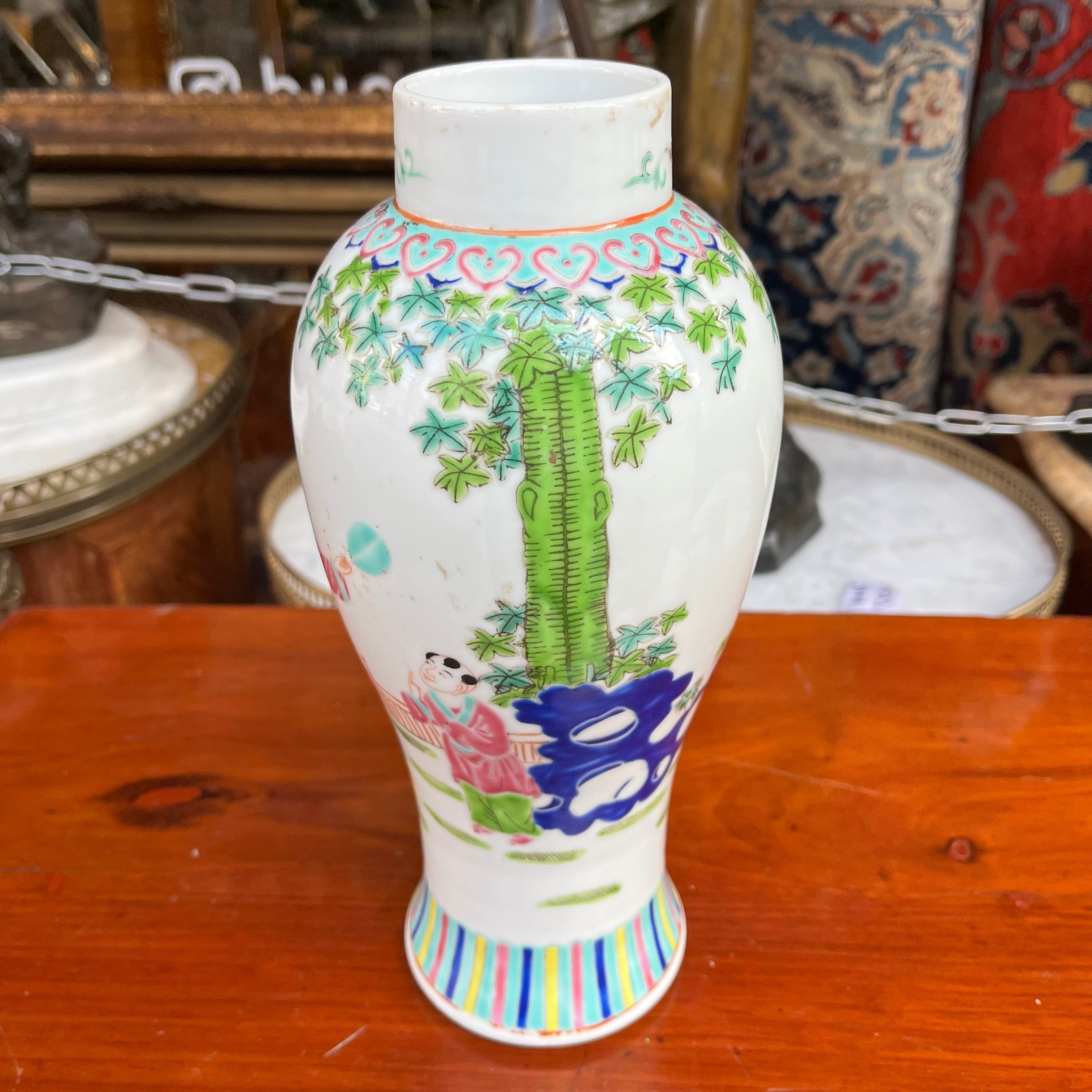 Beautiful vase, of Chinese origin, made of polychrome glazed porcelain with decoration of figures in a garden landscape, with a large tree and a water fountain.