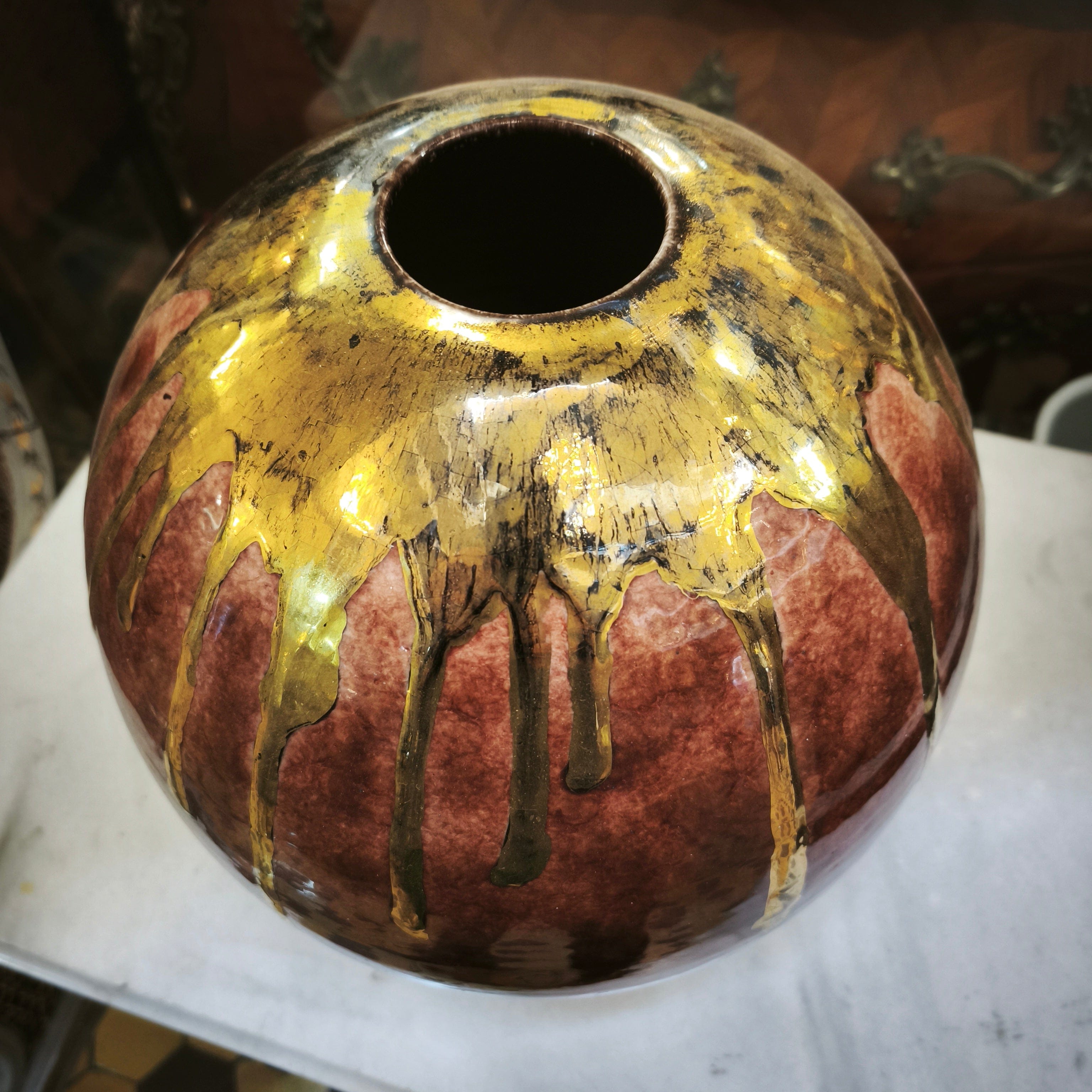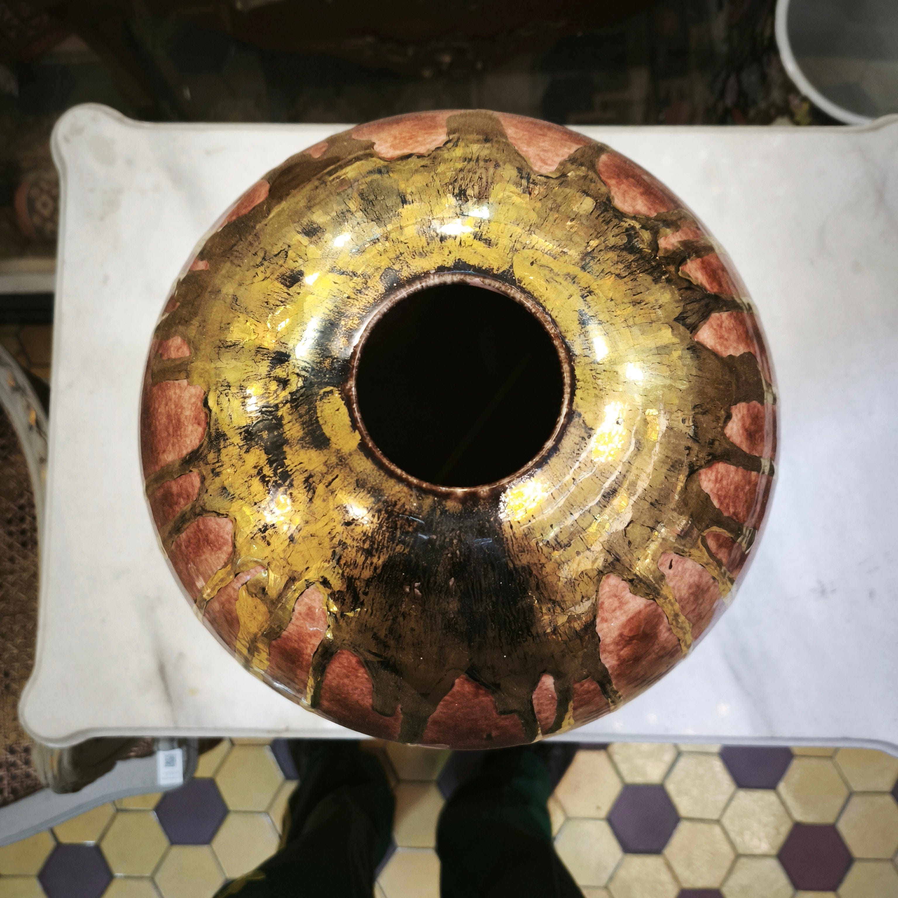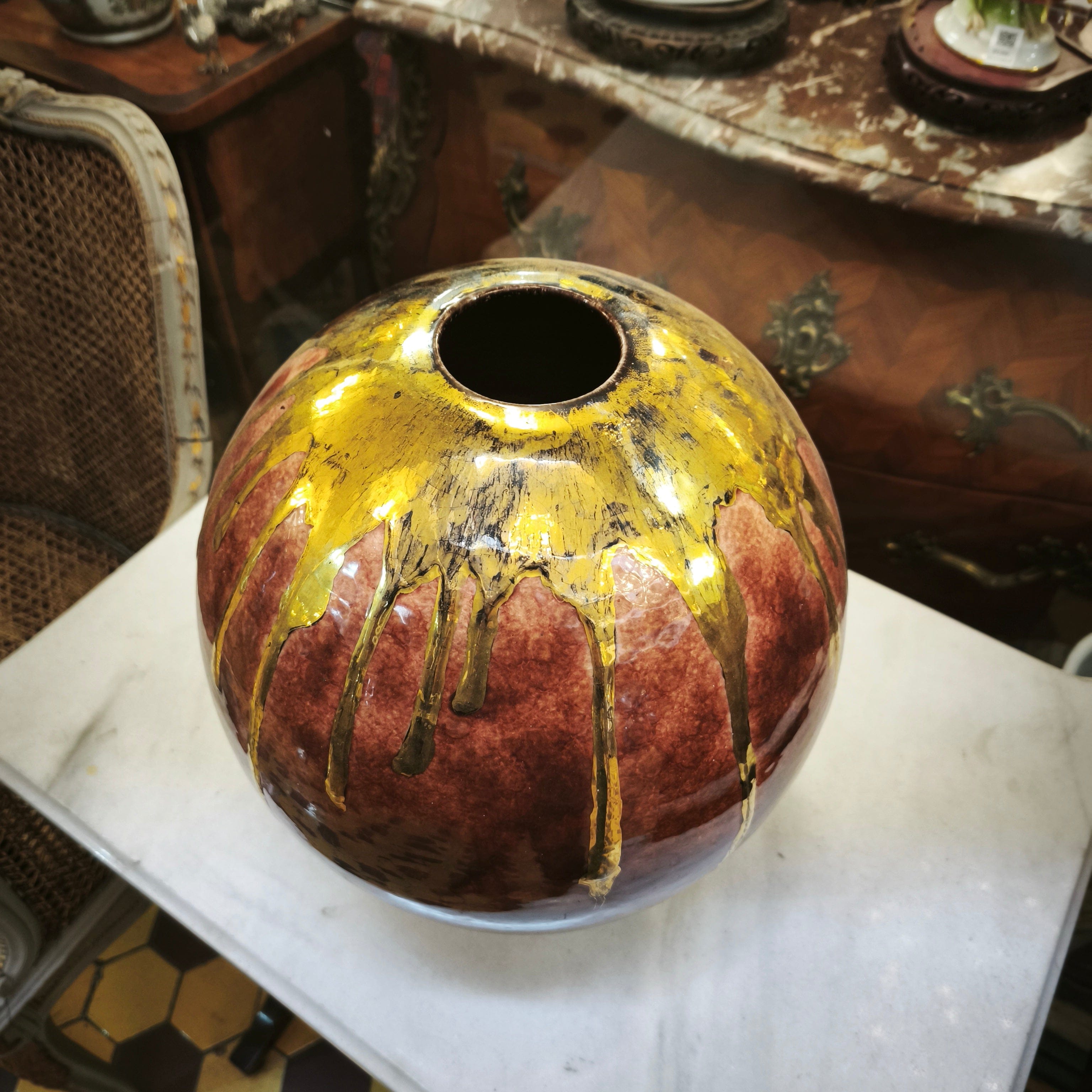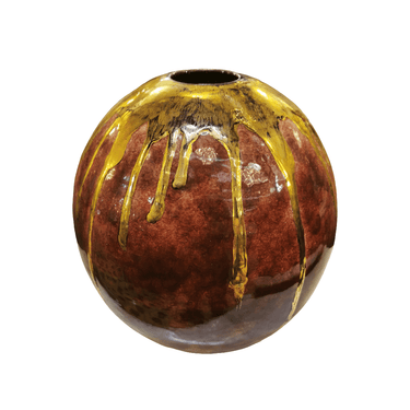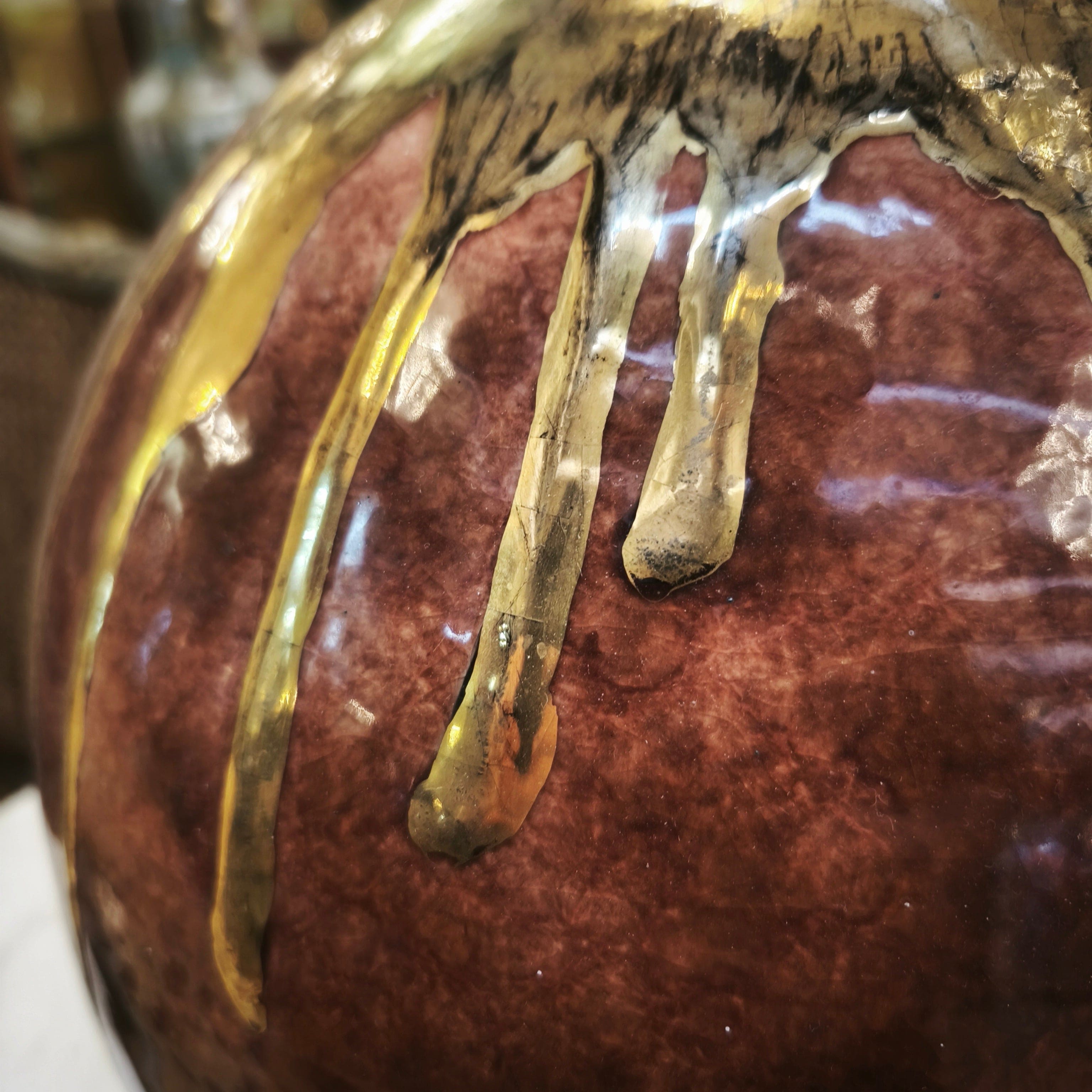 Spectacular French ceramic Art Deco vase, with a beautiful marbled glaze in a reddish-brown tone, and a shiny gold glaze on its rim, which drips down the piece.
