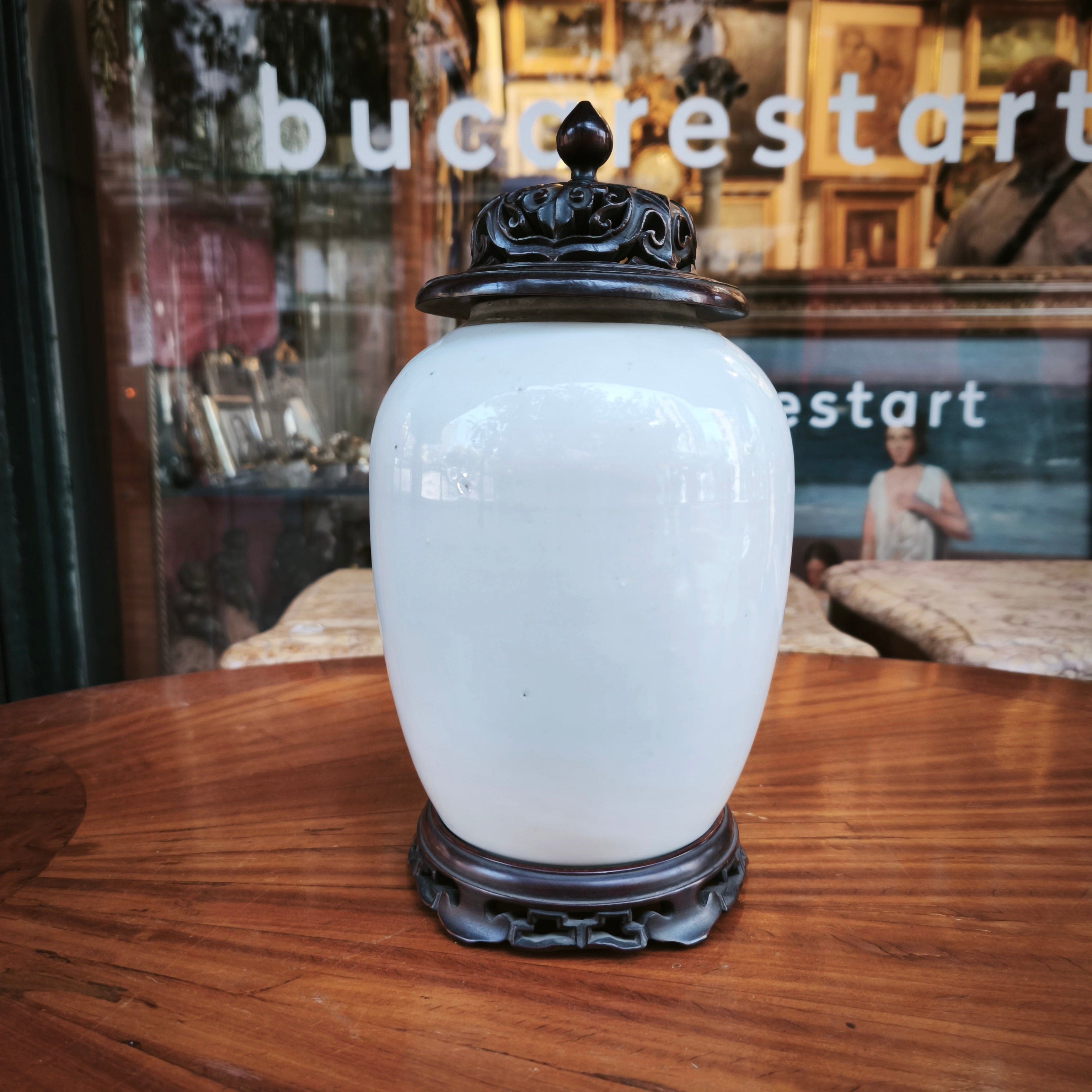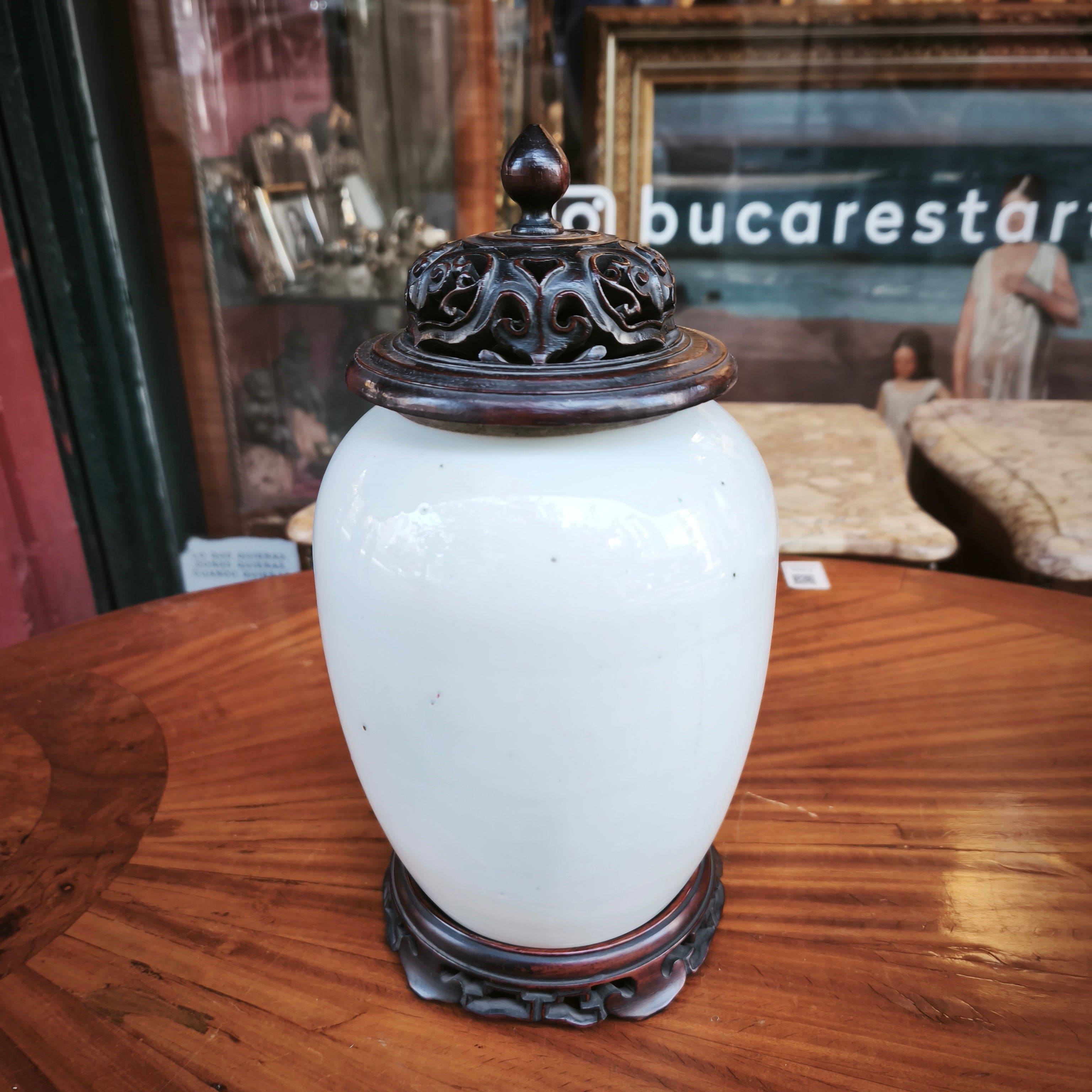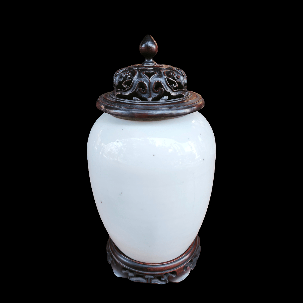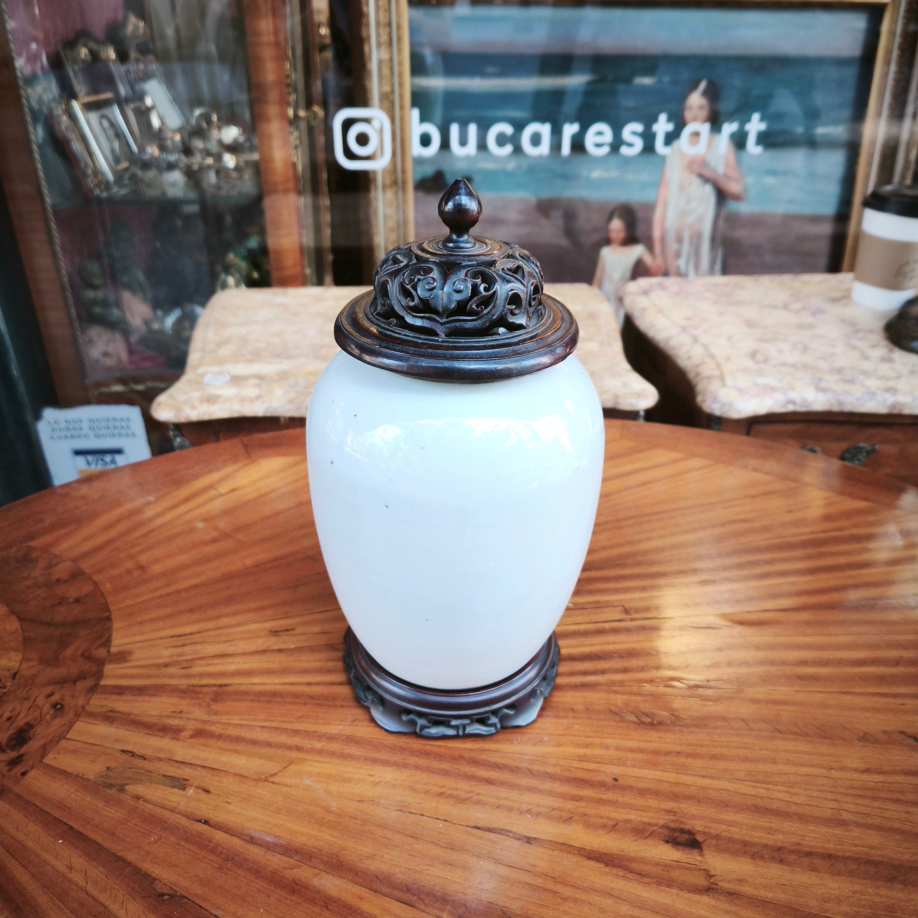Beautiful white Japanese porcelain vase, with removable carved wooden base and wooden lid.