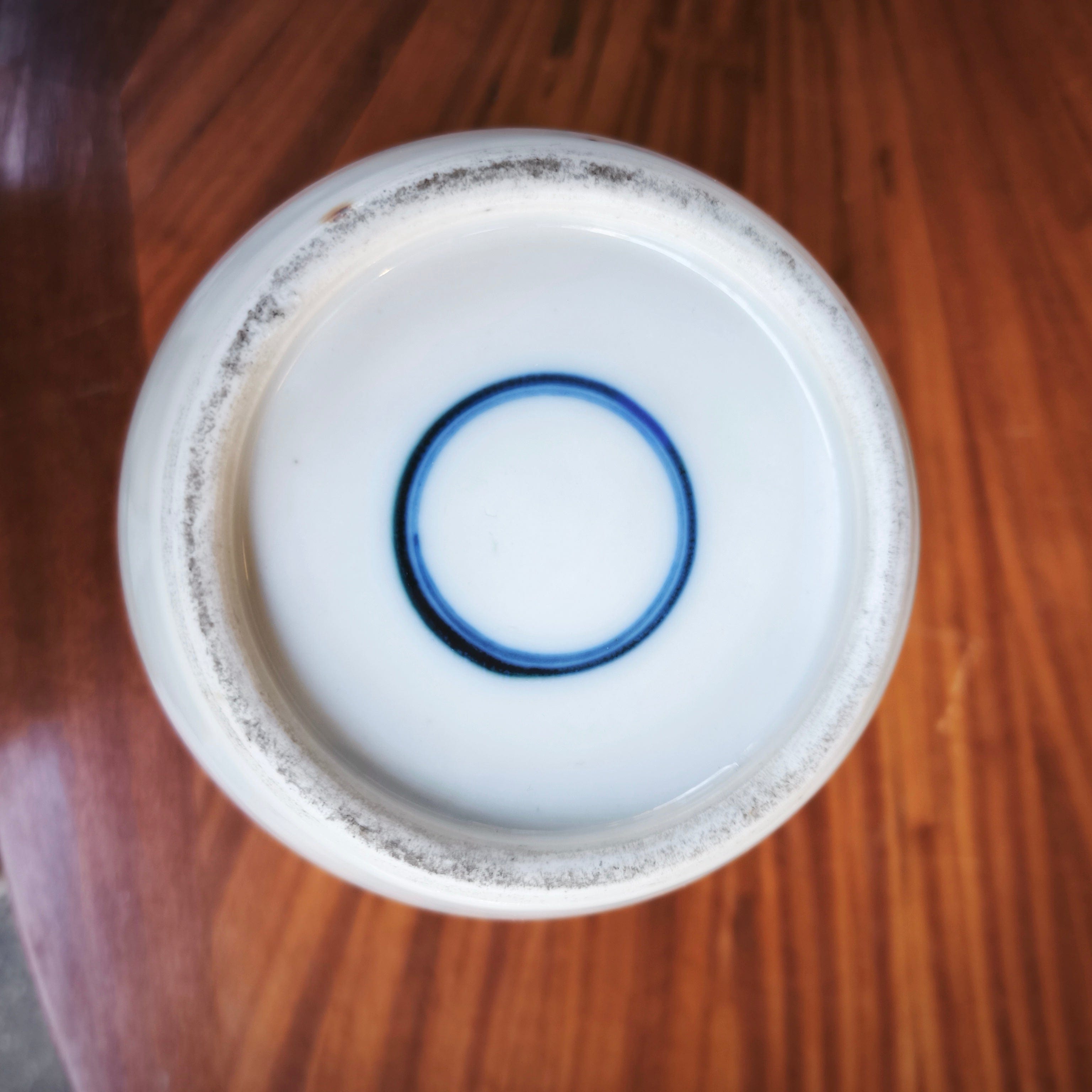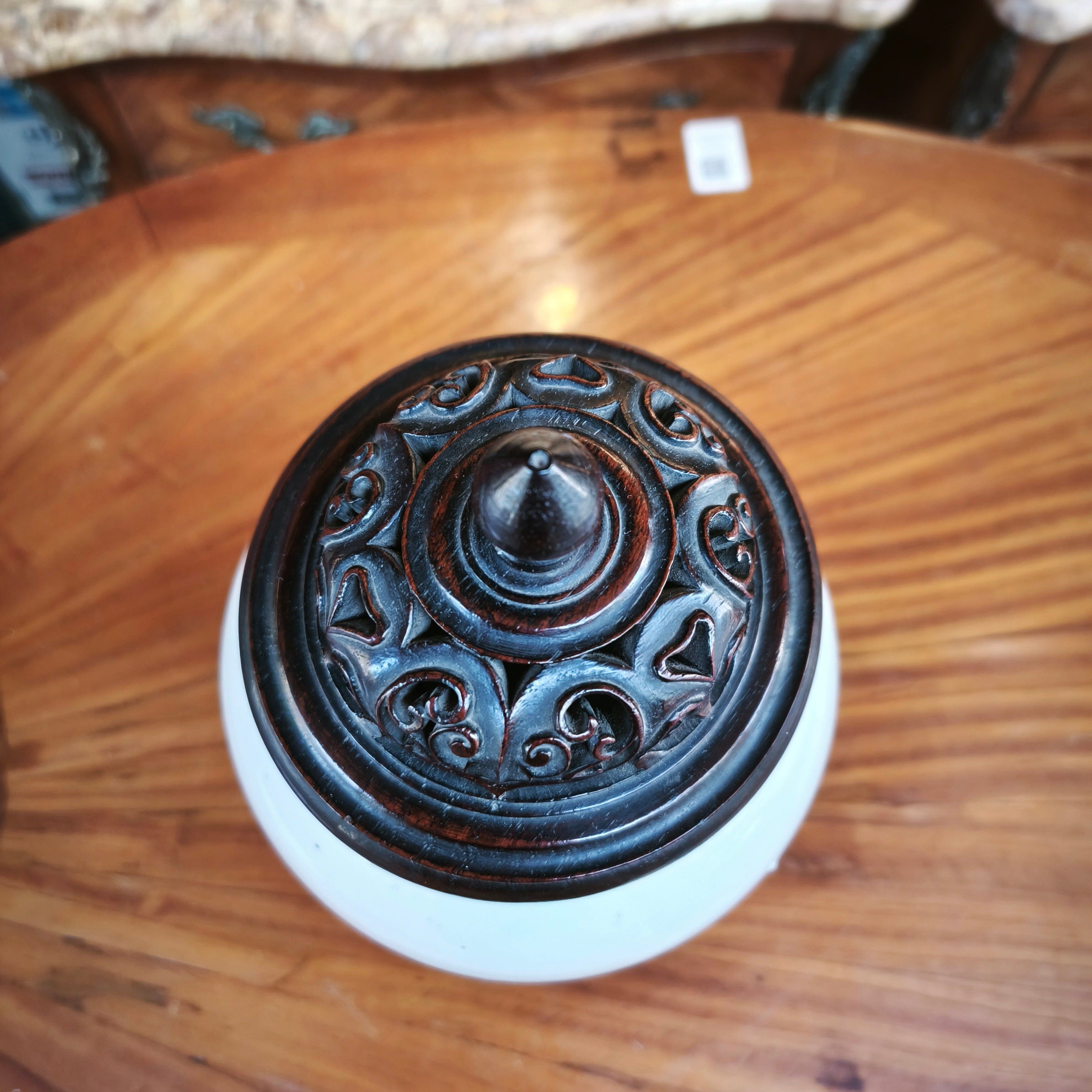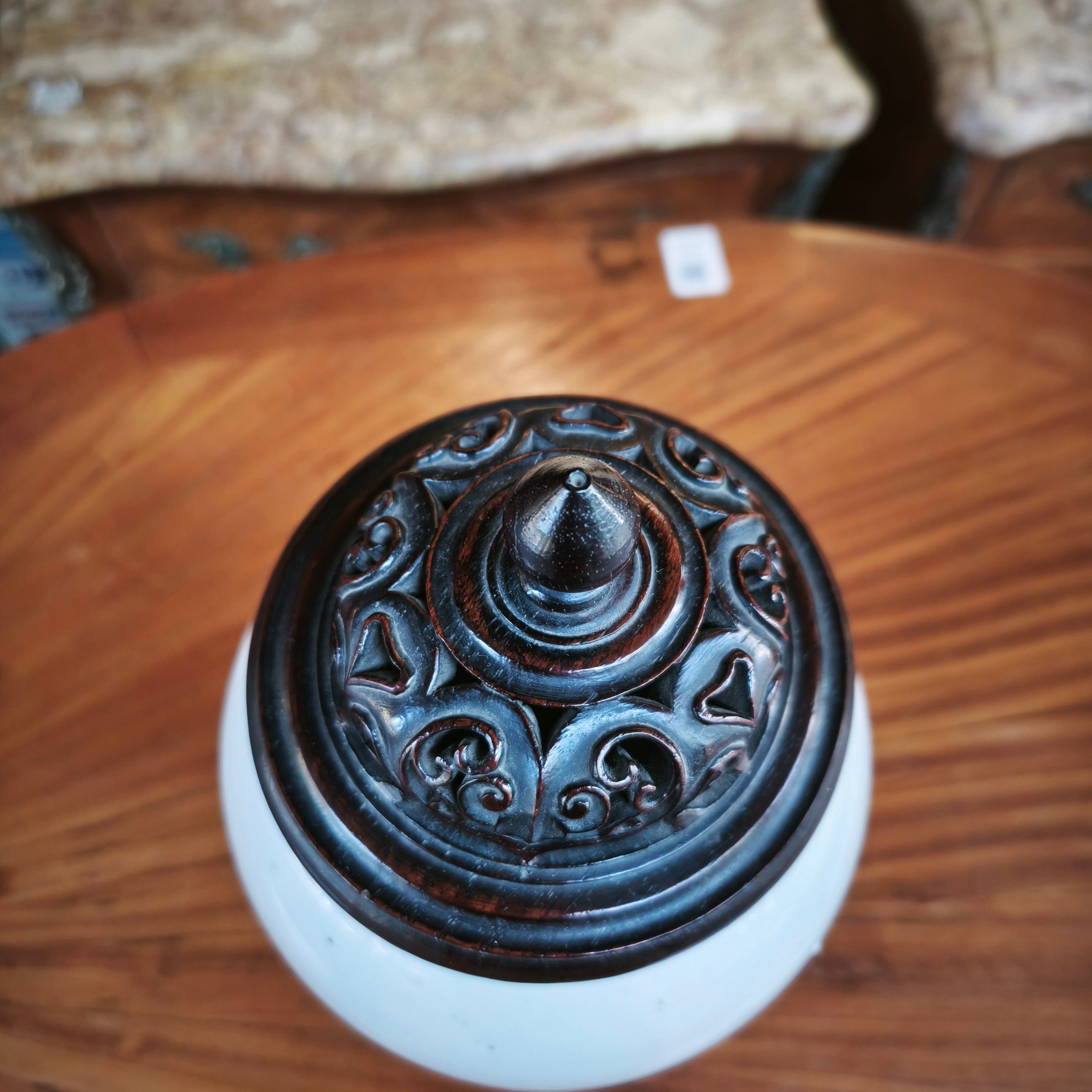 Beautiful white Japanese porcelain vase, with removable carved wooden base and wooden lid.