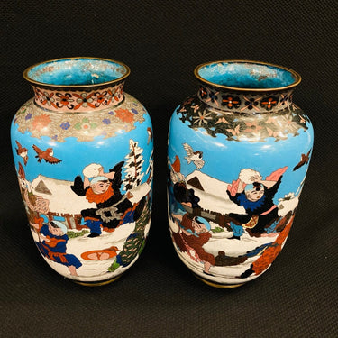 Beautiful Japanese bronze and cloisonné enamel vases with bright colors. It contains interesting painting where the design is slightly different from each other.