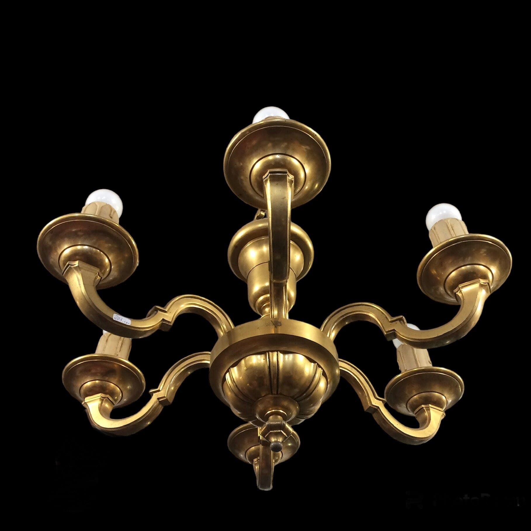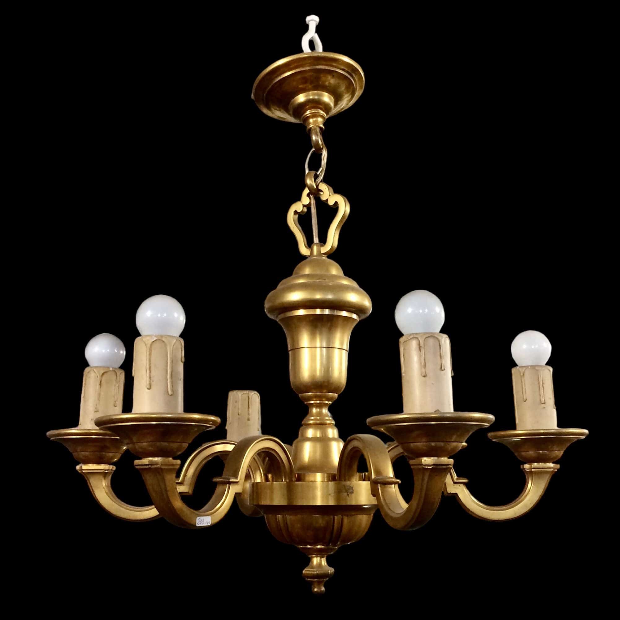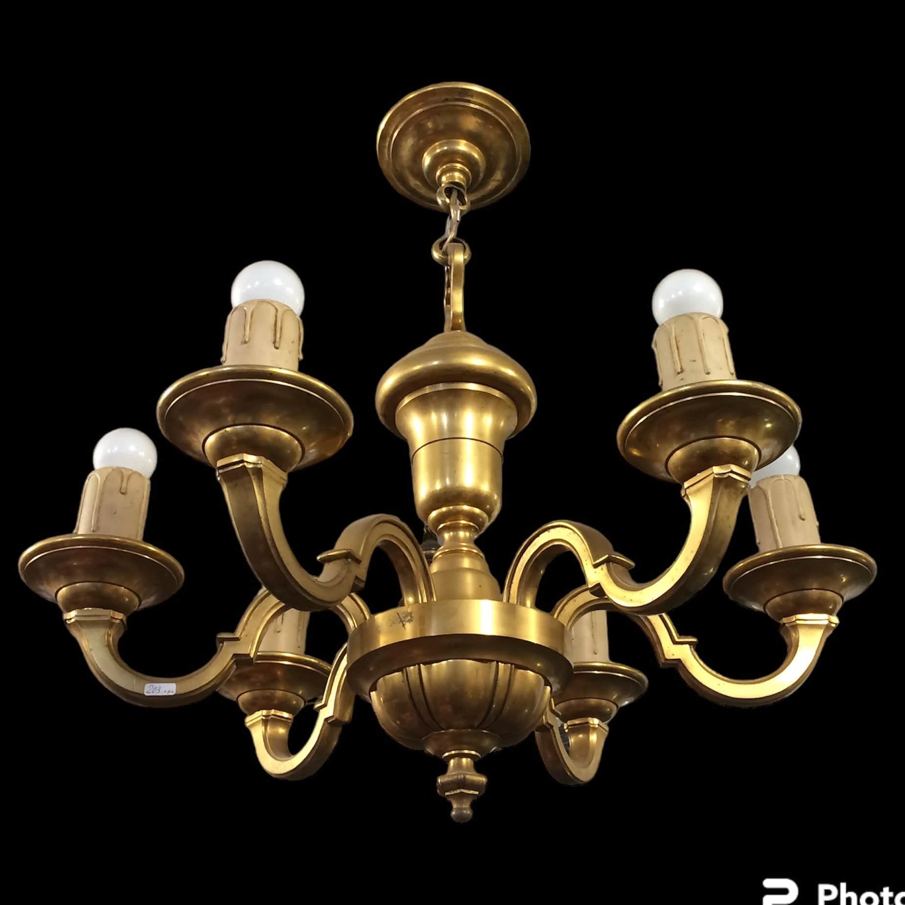 Tudor style ormolu bronze ceiling lamp. It has a six-arm design, candle simulator covers and sockets working in perfect condition.