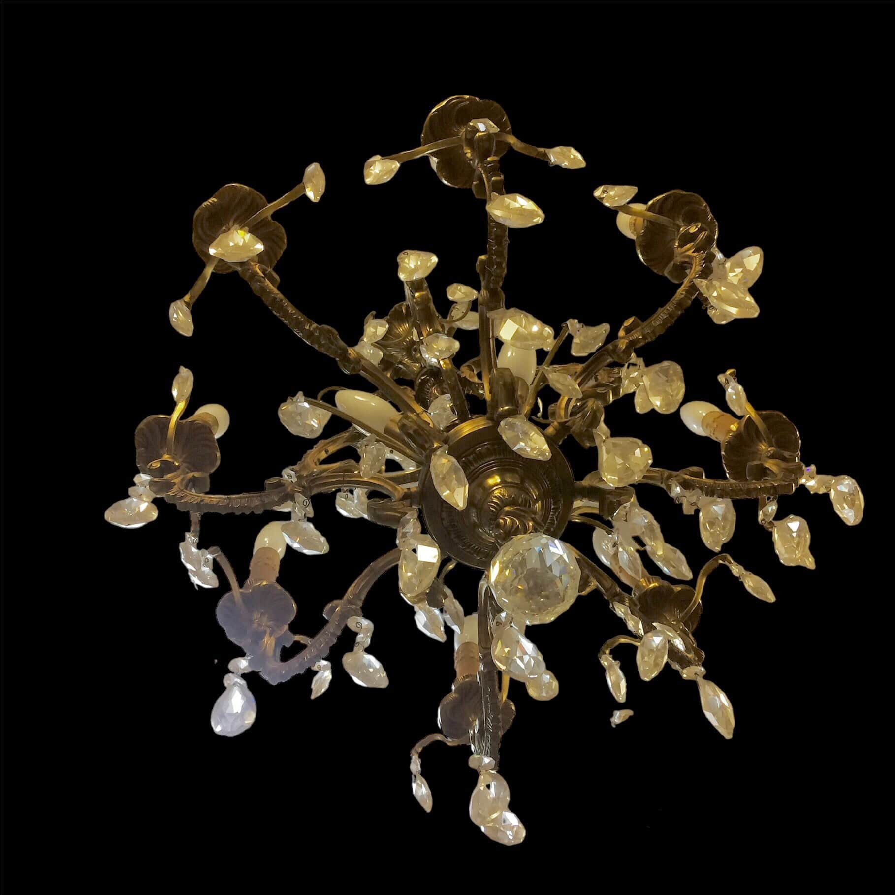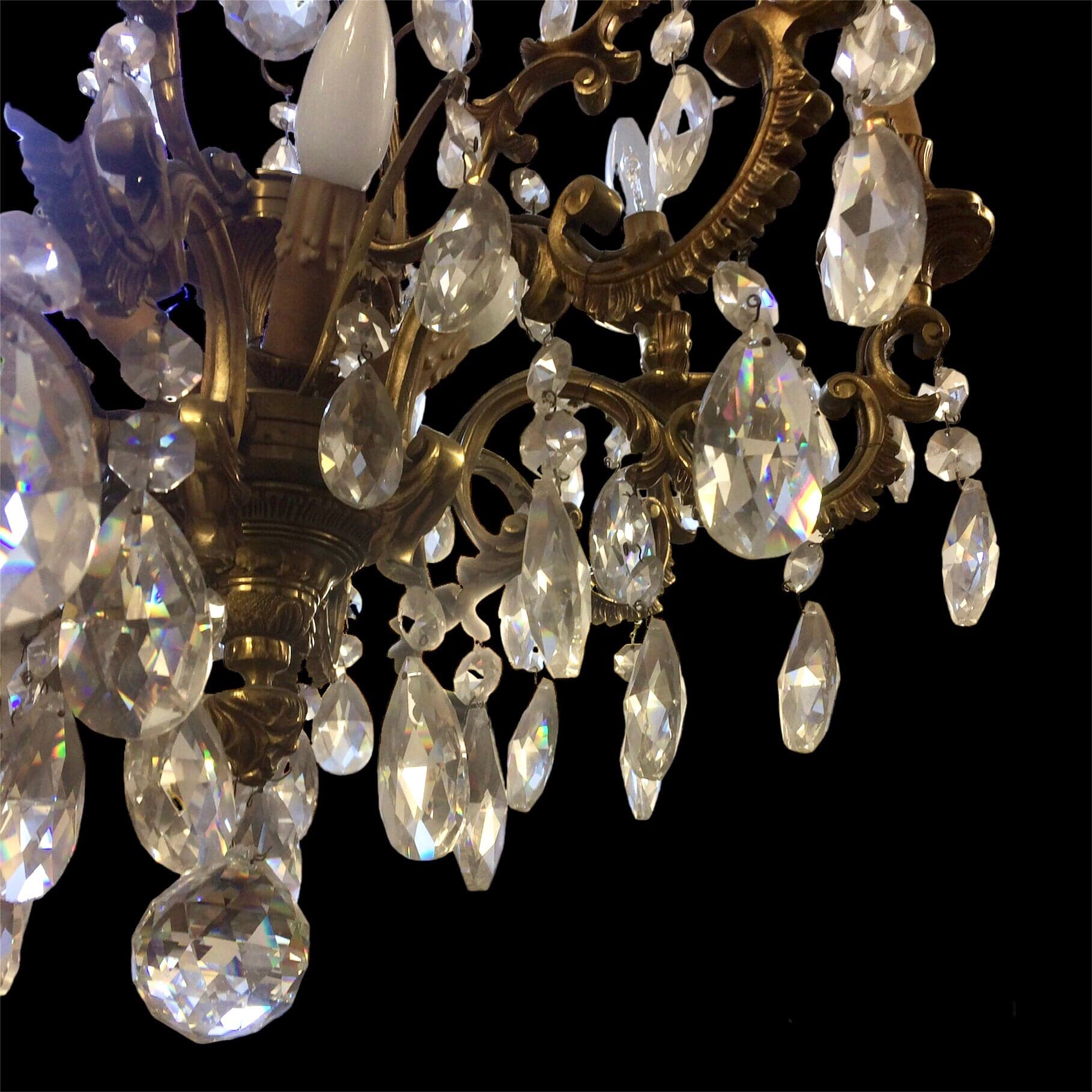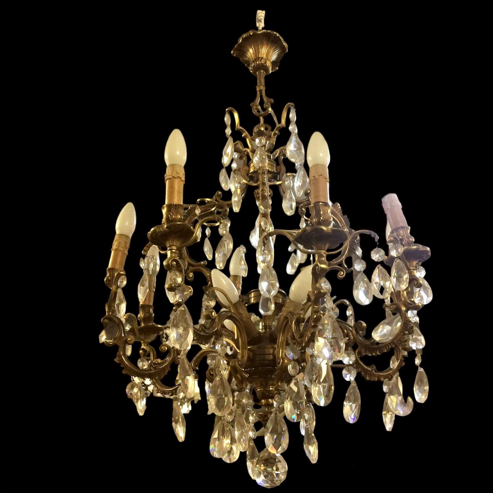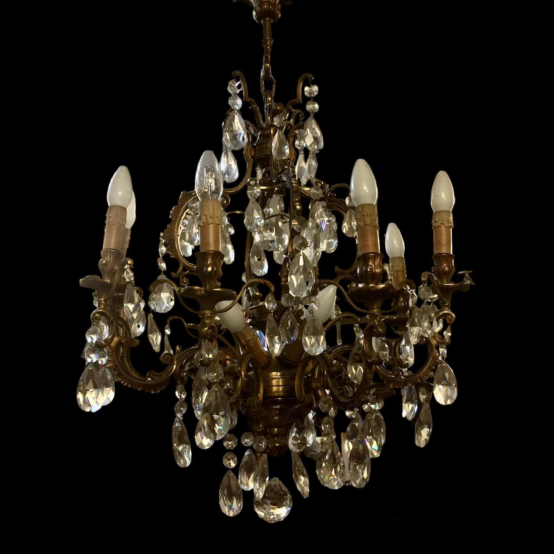 Spectacular bronze ceiling lamp and Swarovski crystal tears. With an elegant eight-arm design and a total of 12 lights, it can illuminate and have presence in large spaces. It has candle simulator covers and plugs working in perfect condition.