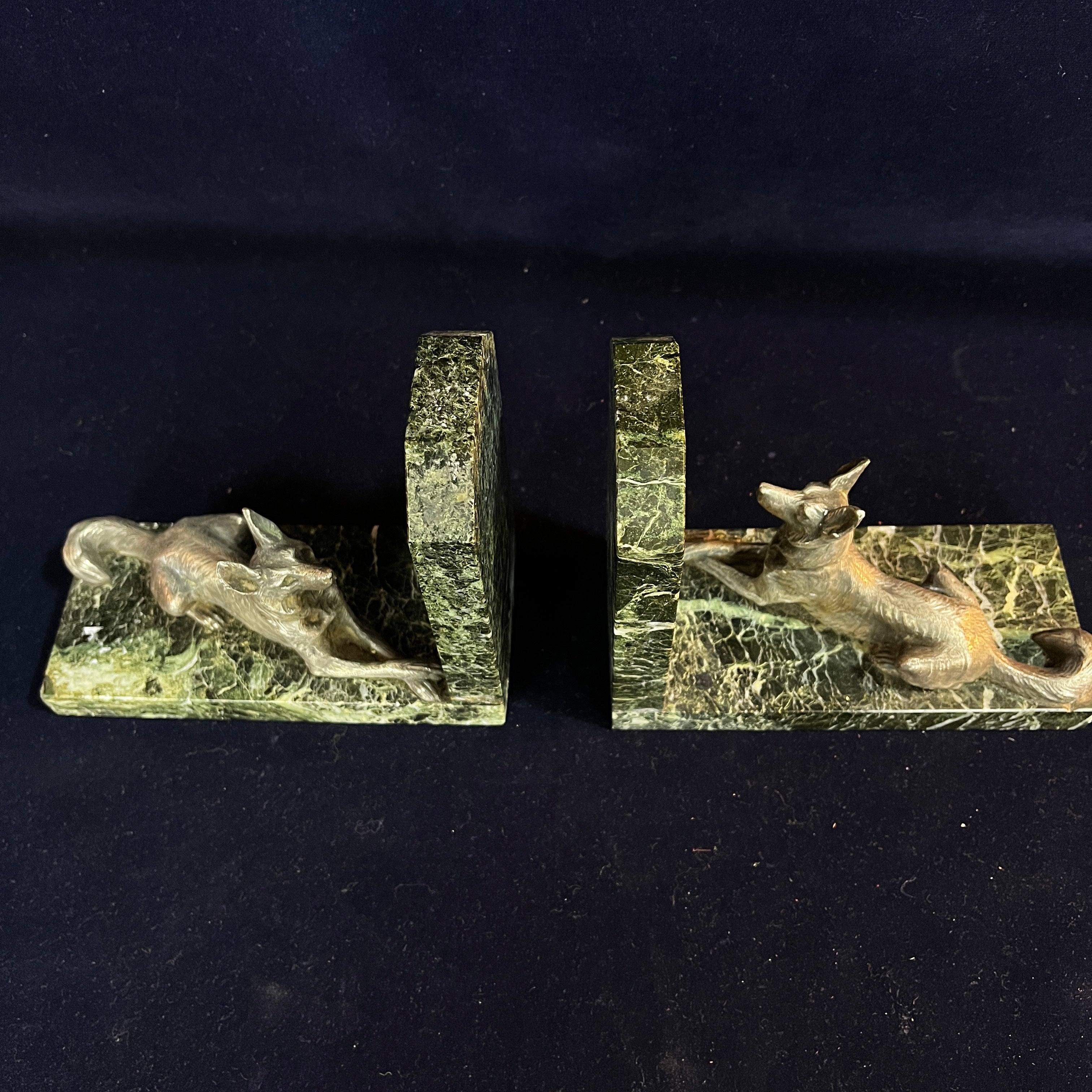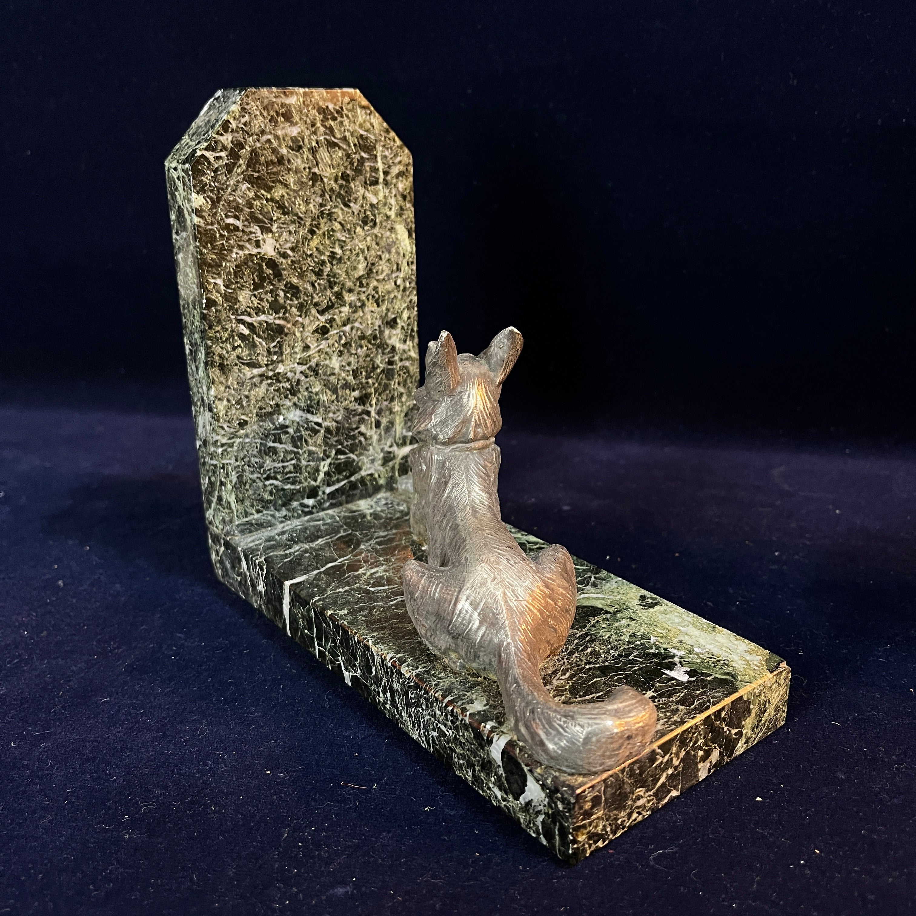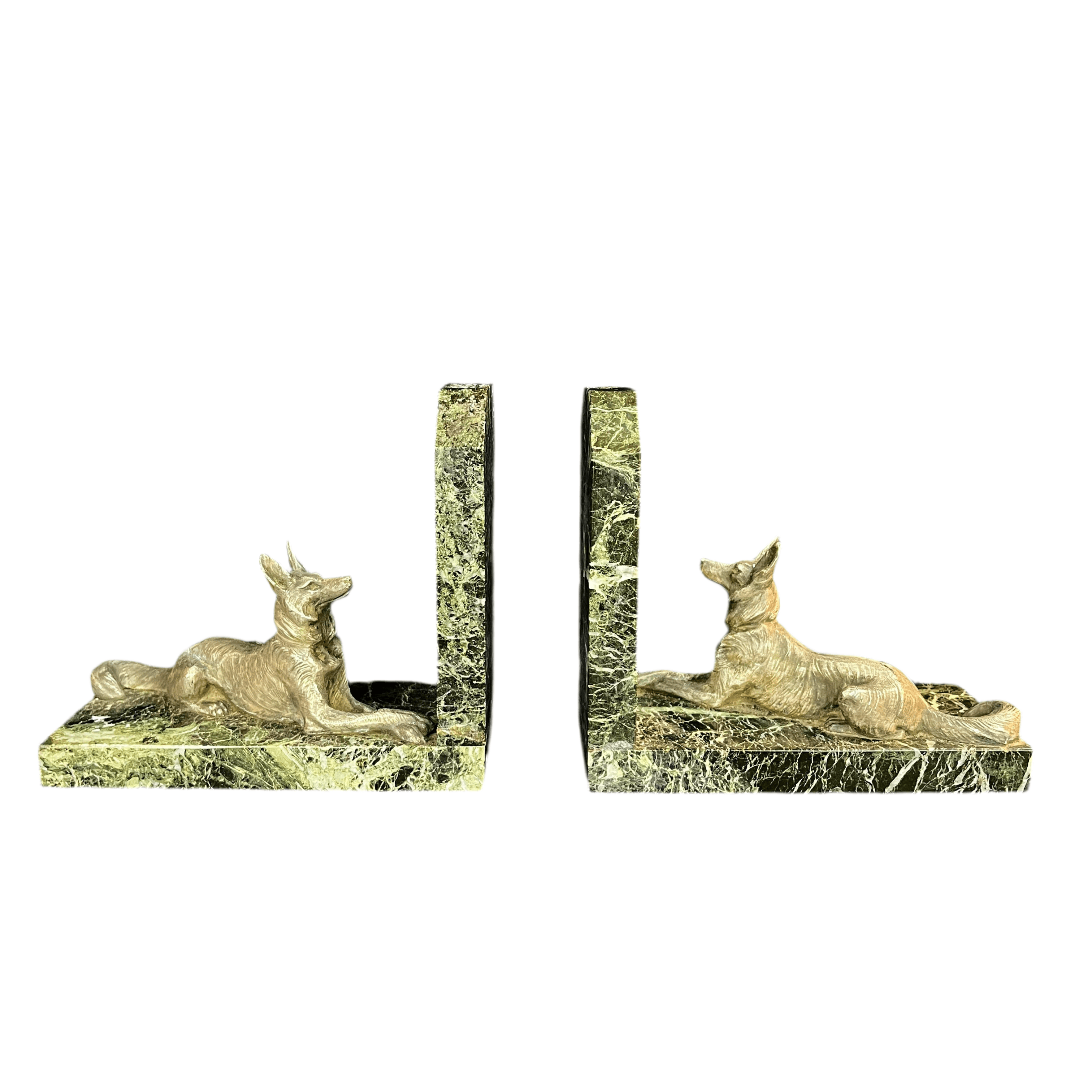 An elegant pair of French-made bookends, made of green marble with two reclining wolves, crafted in silver-plated metal. The silver of the wolves complements not only the green hue of the marble but also its lighter grayish-green veins. This is a versatile piece that, in addition to its functionality, has a decorative and sculptural character.
