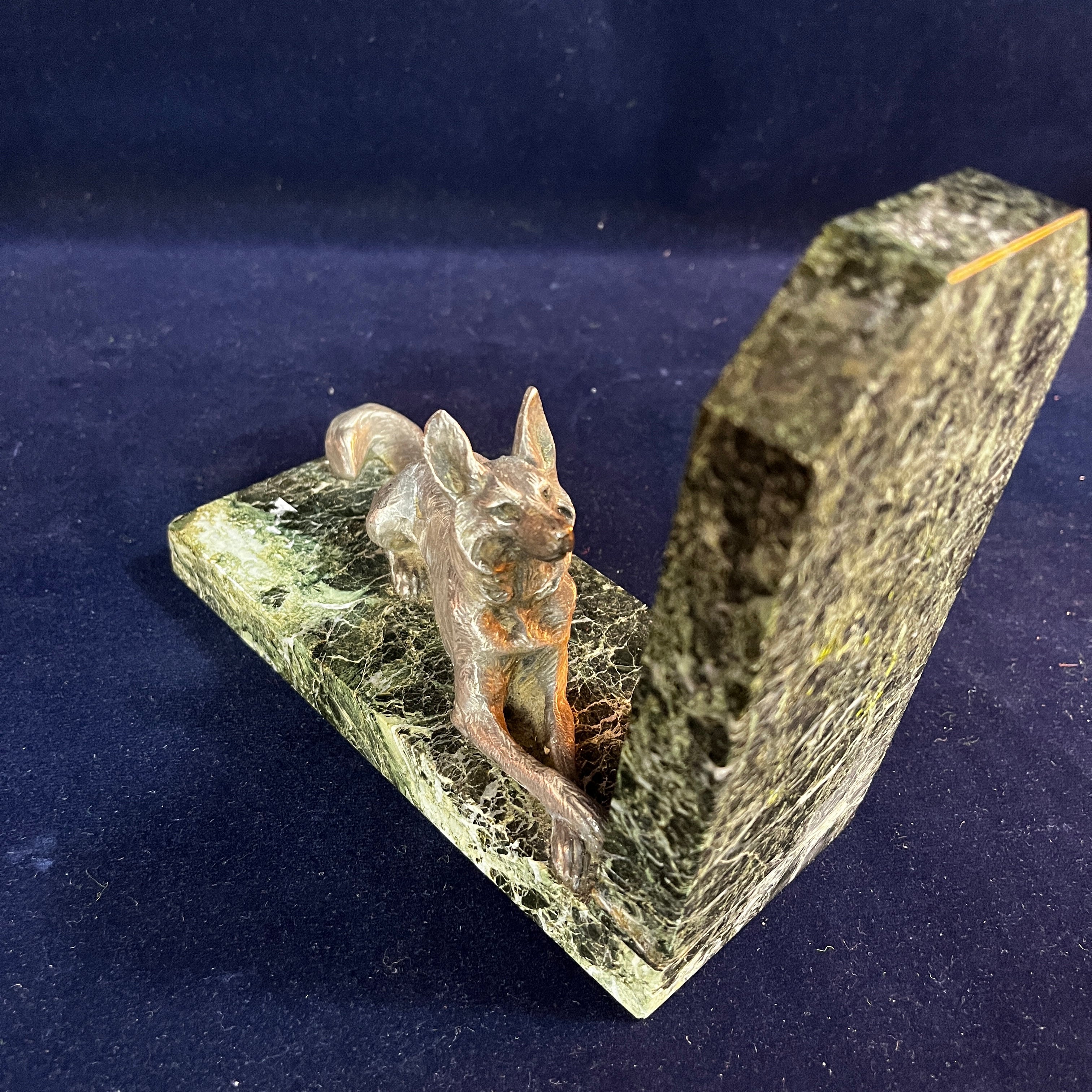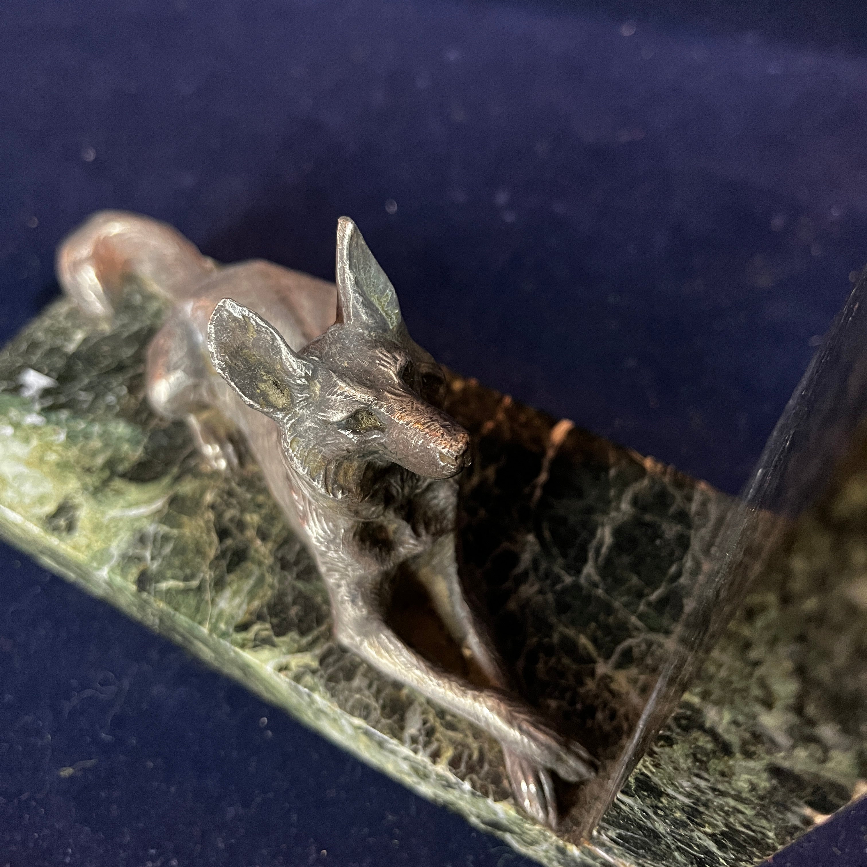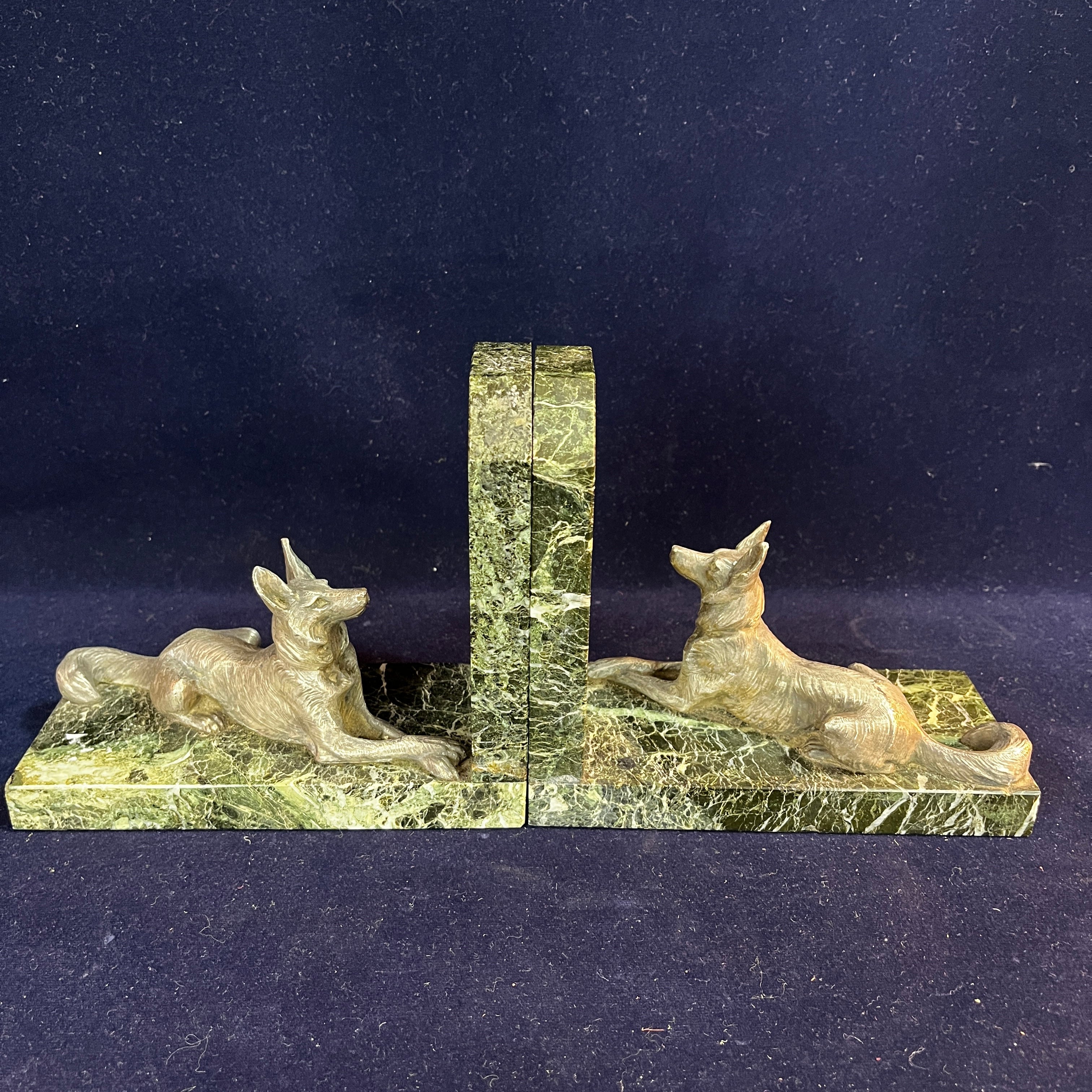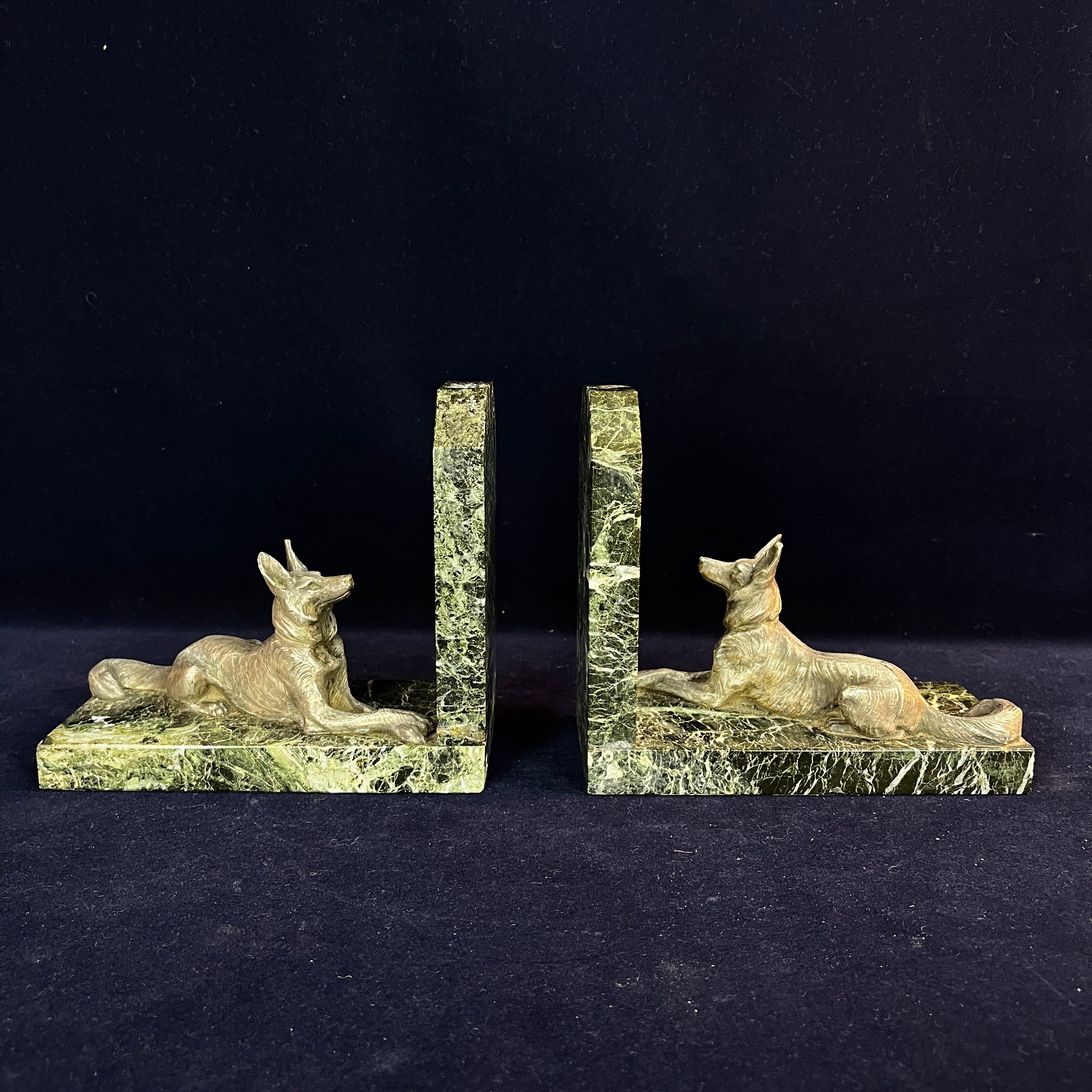 An elegant pair of French-made bookends, made of green marble with two reclining wolves, crafted in silver-plated metal. The silver of the wolves complements not only the green hue of the marble but also its lighter grayish-green veins. This is a versatile piece that, in addition to its functionality, has a decorative and sculptural character.