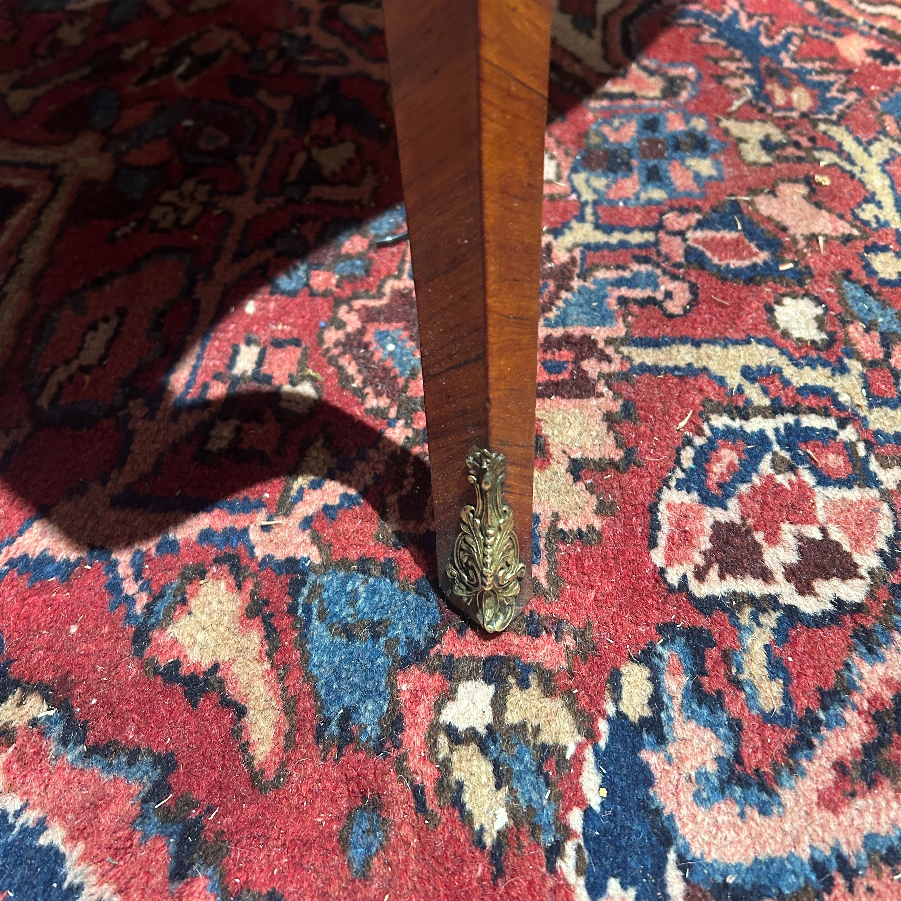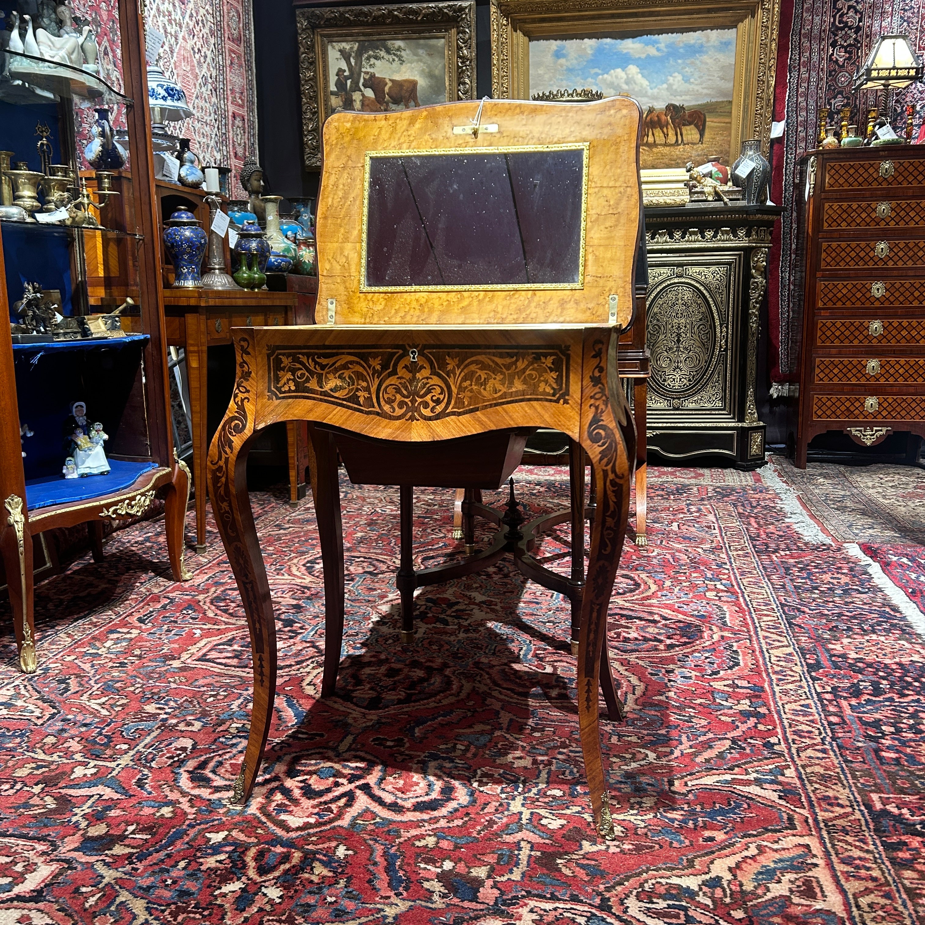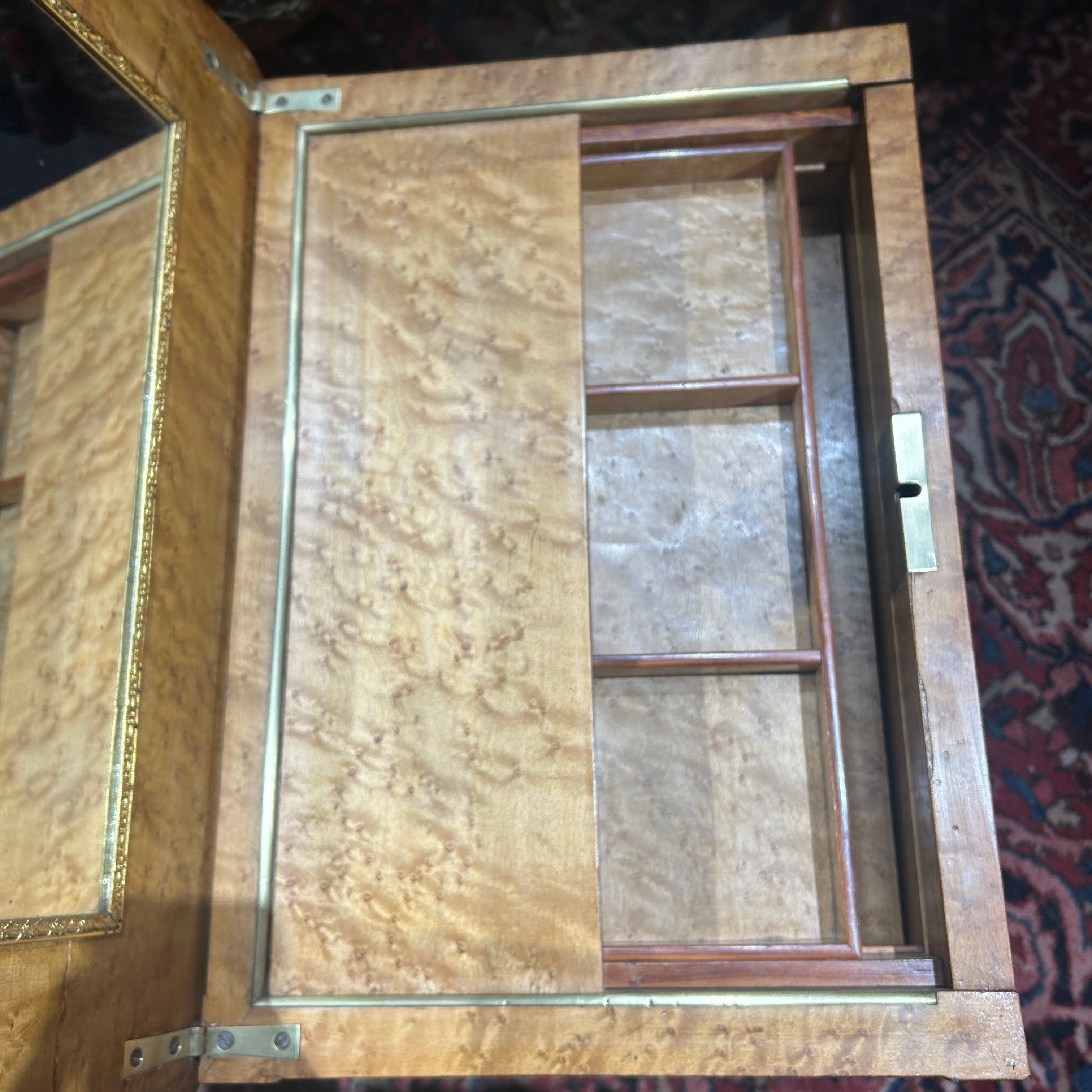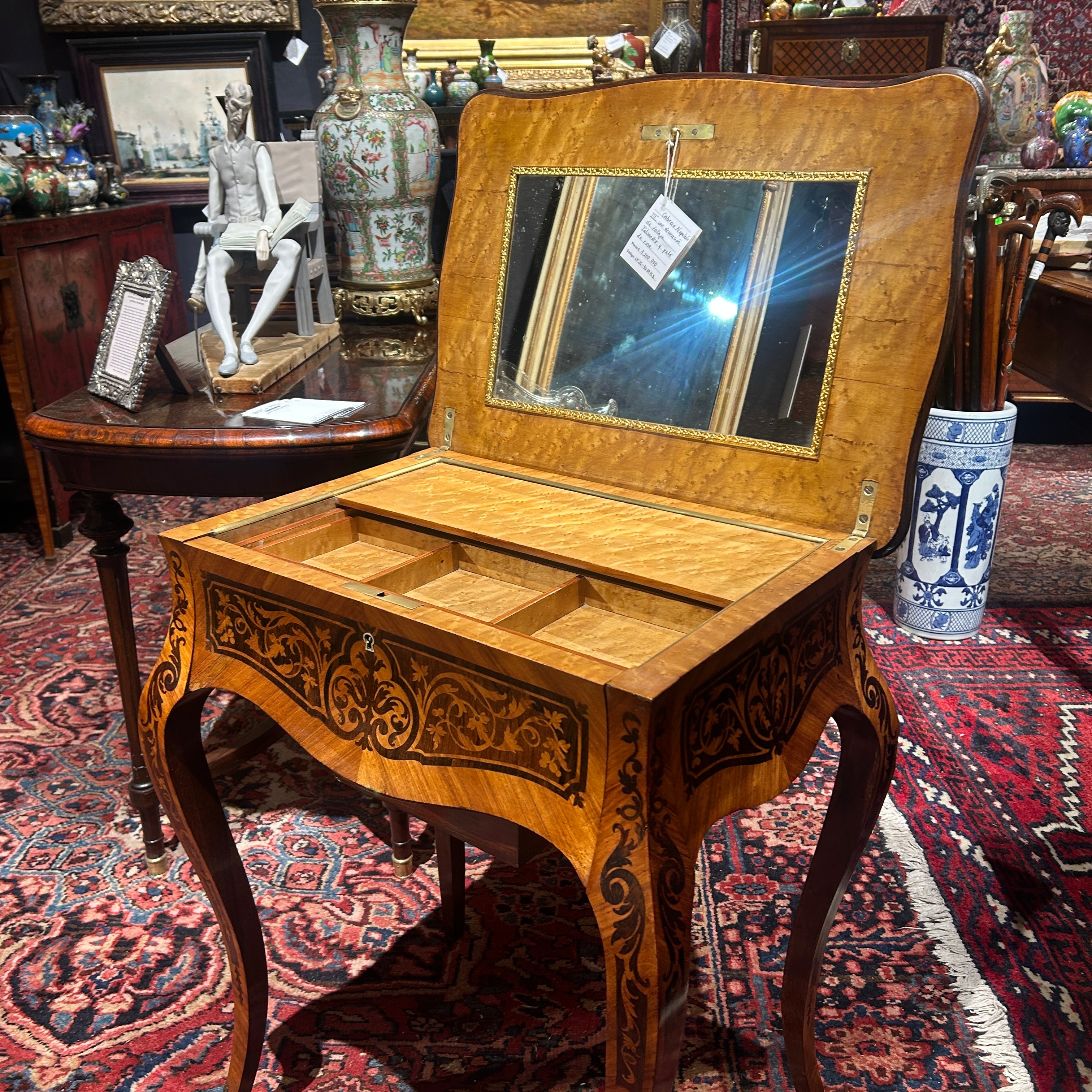 Rosewood and bois de rose veneer, mirrored top, burl veneer interior, drawer front and a sewing-style drawer below. Engraved brass decoration with 'EC'.