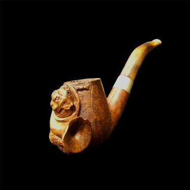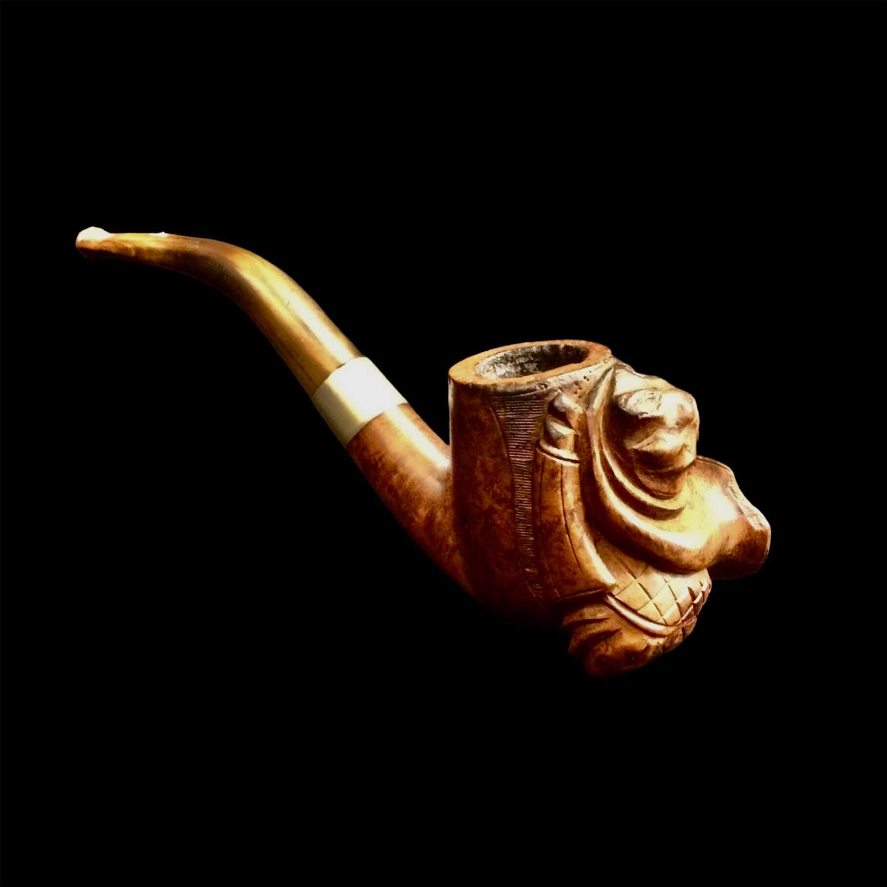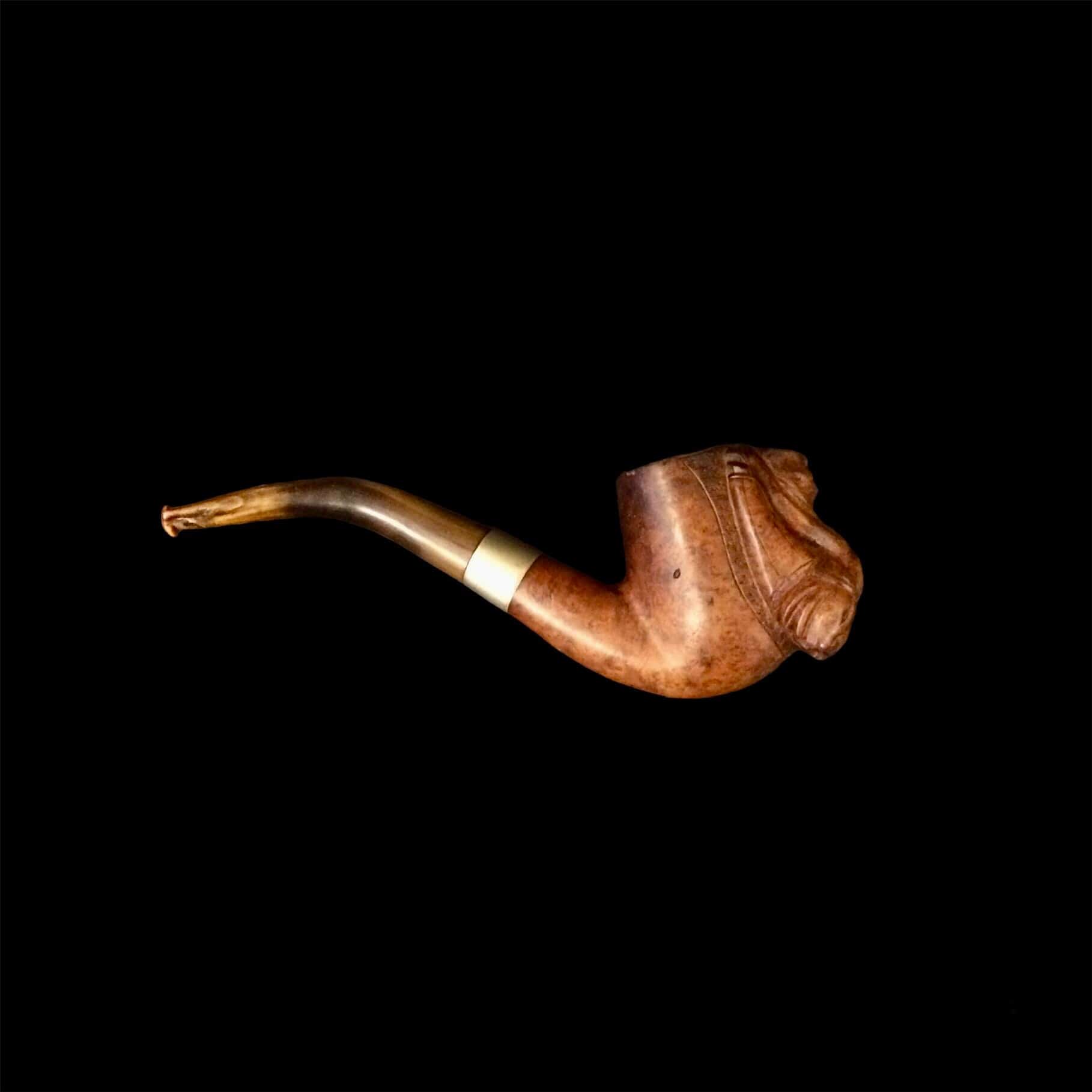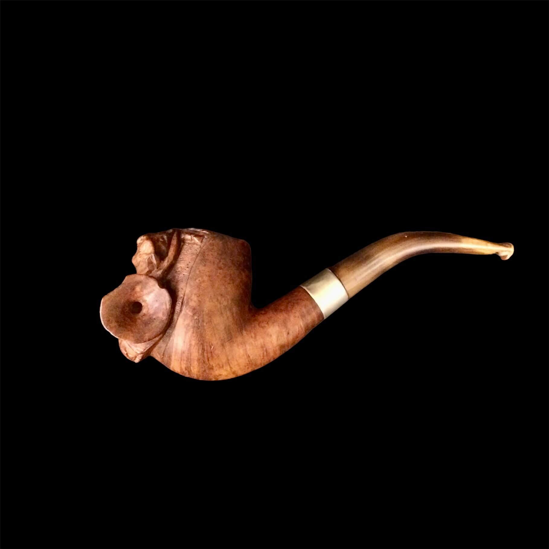 Wooden pipe with wind instrument and carved animals. The mouthpiece is made of antlers and the joint between the body and the mouthpiece is made of bronze.