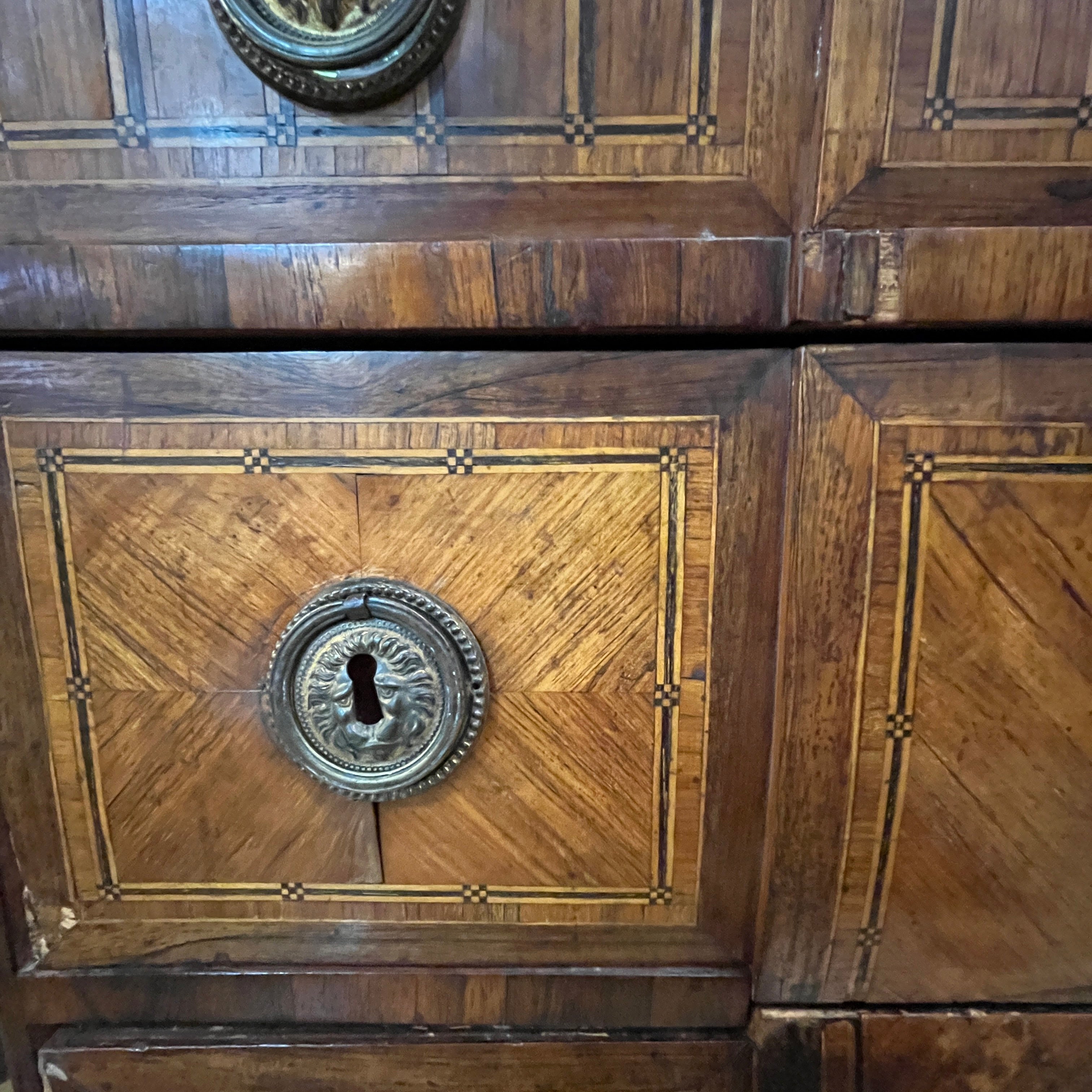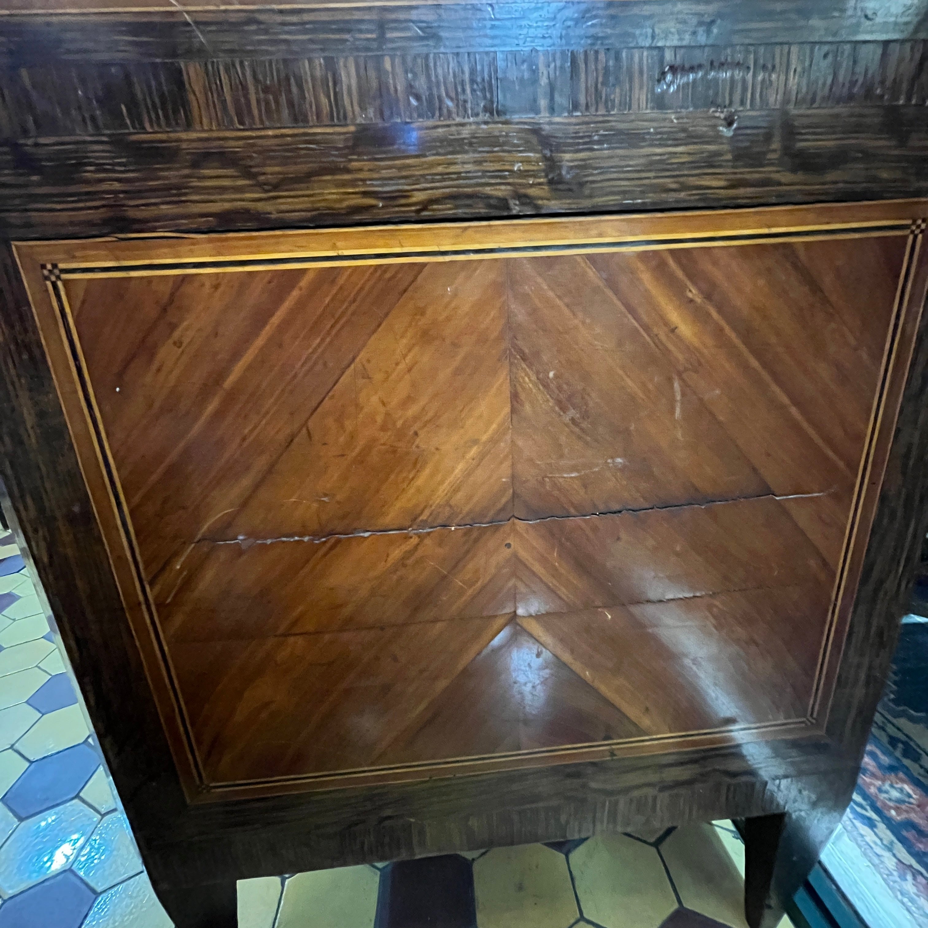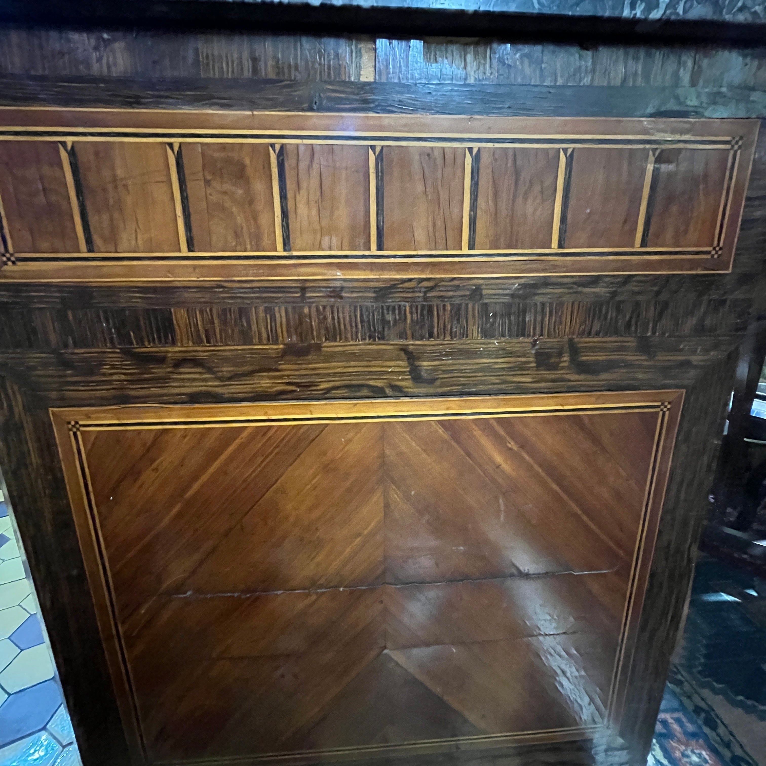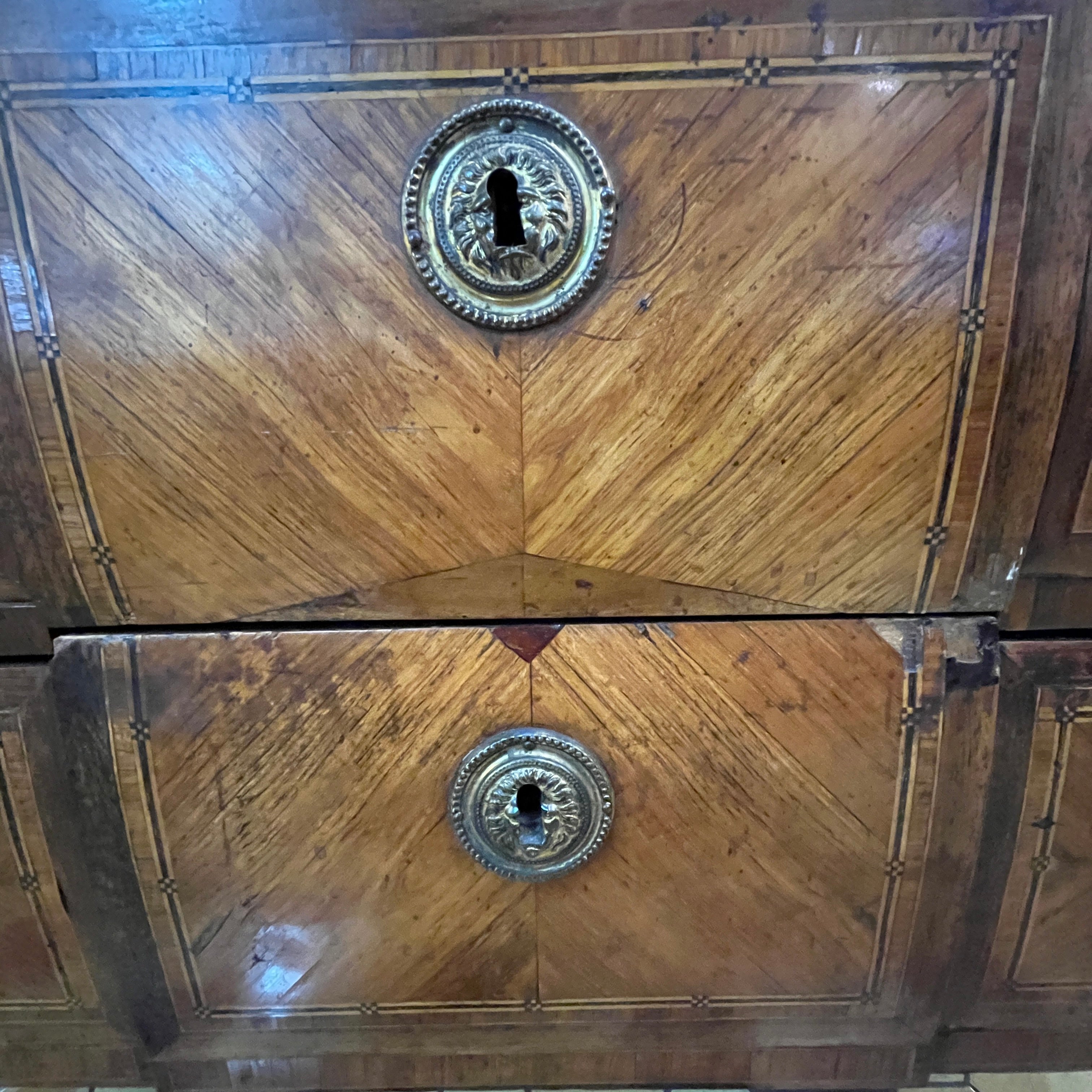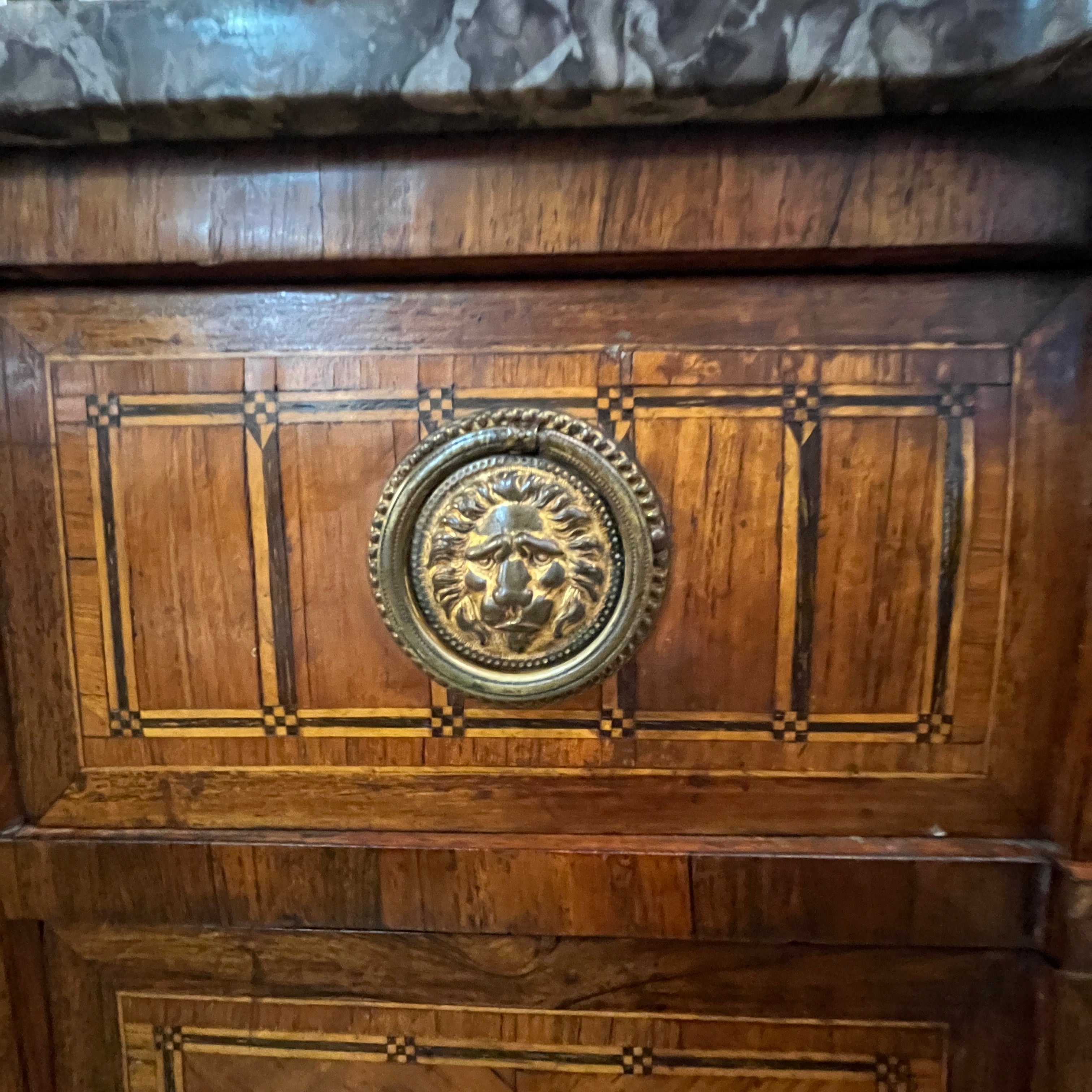 Maravillosa cómoda del s. XVIII estilo transición con mármol original Saint Anne, aplicaciones y tiradores en bronce. Cuenta con tres cajones extendidos y profundos. El ebanista se preocupó de crear un marquetería variada para cada sección de los cajones; pudiendo encontrar diseños geométricos que crean un sutil Trompe loeil o ilusión óptica a partir del juego de colores con las diferentes ensambles de madera y también diseños con las vetas. Esta cómoda debe ser vista como una pieza única.