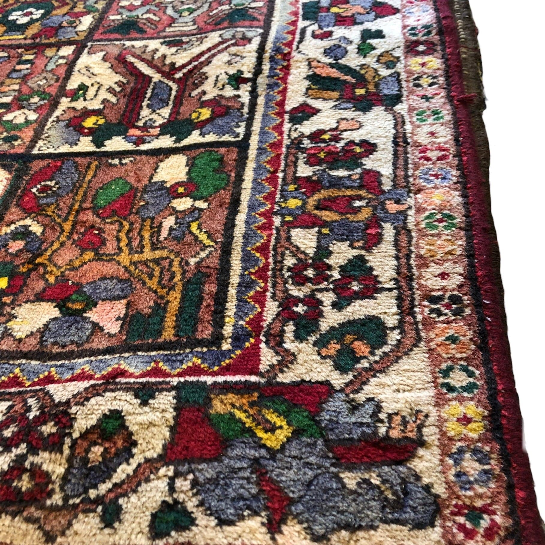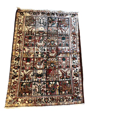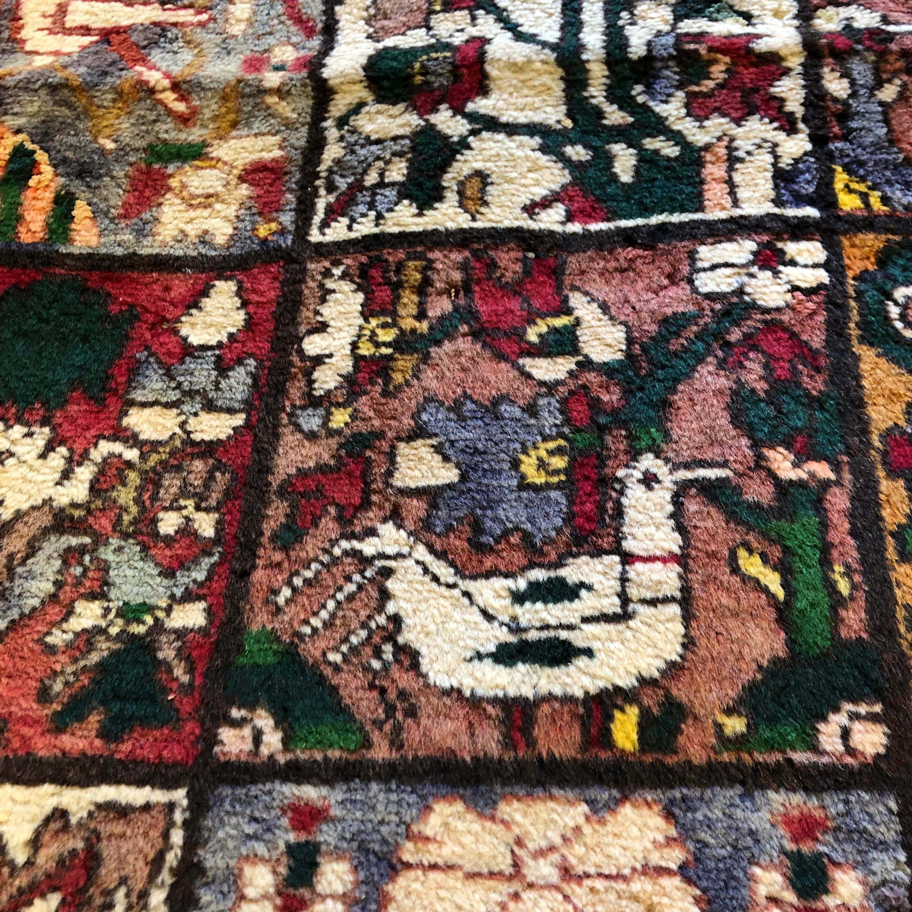 Detailed design of scenes with geometric motifs, animals, and flowers. It's one-dimensional, as it's viewed from one perspective.