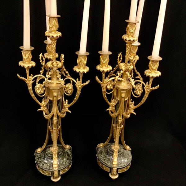 Set of two Louis XV style candelabras. With green marble base and ormolu bronze structure.