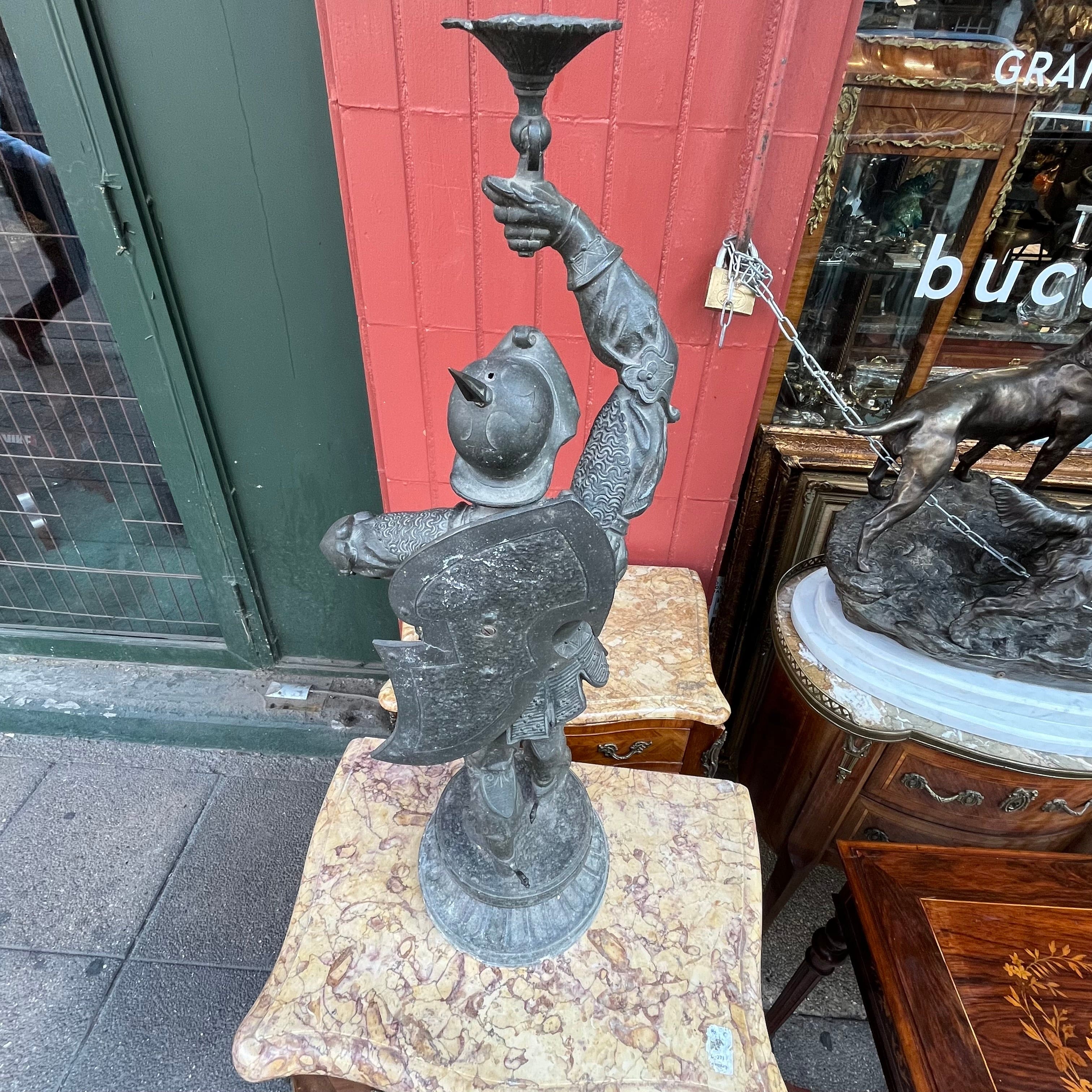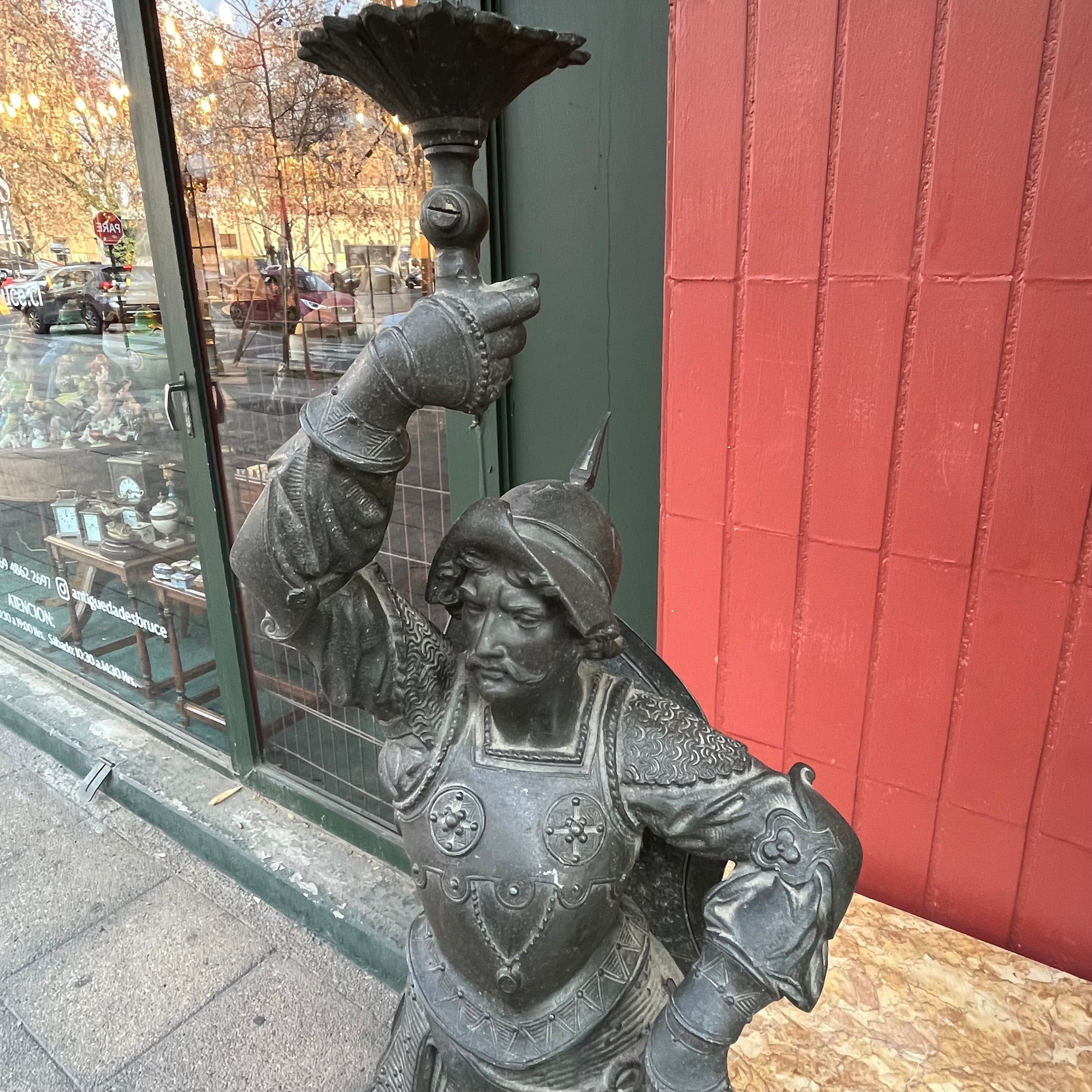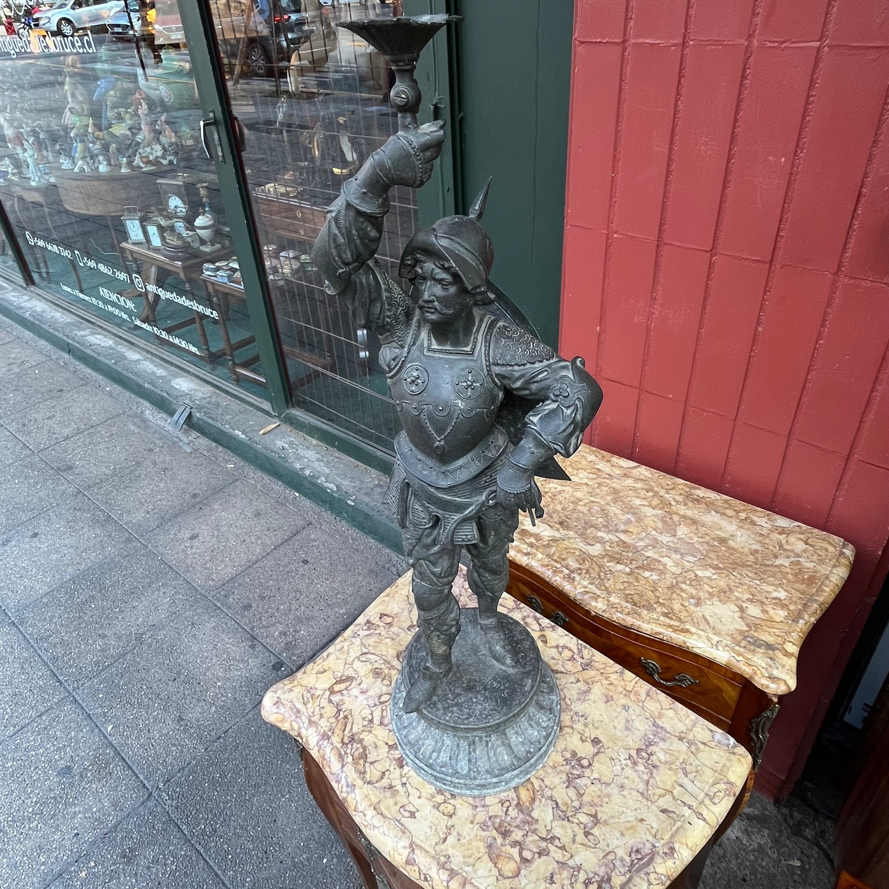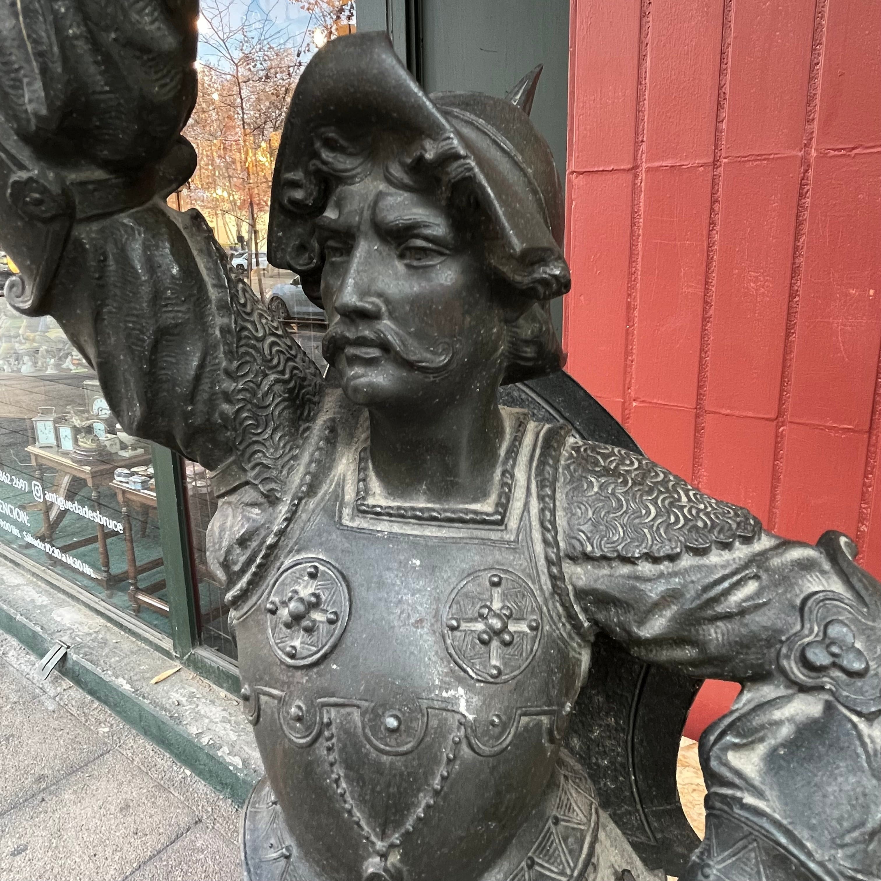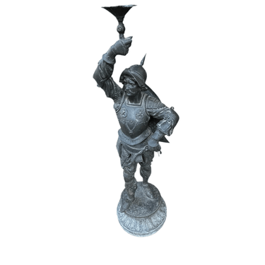 Impressive pewter figure of French origin, mounted on a base of the same material. The sculpture represents a soldier from the 17th-century Spanish Tercios, with his distinctive breastplate, shield, sword, and helmet. It is full of relief details that give the piece incredible texture. The sculpture was once a lamp, as the torch has a socket for a light bulb, and a piece of copper wire remains at its base.