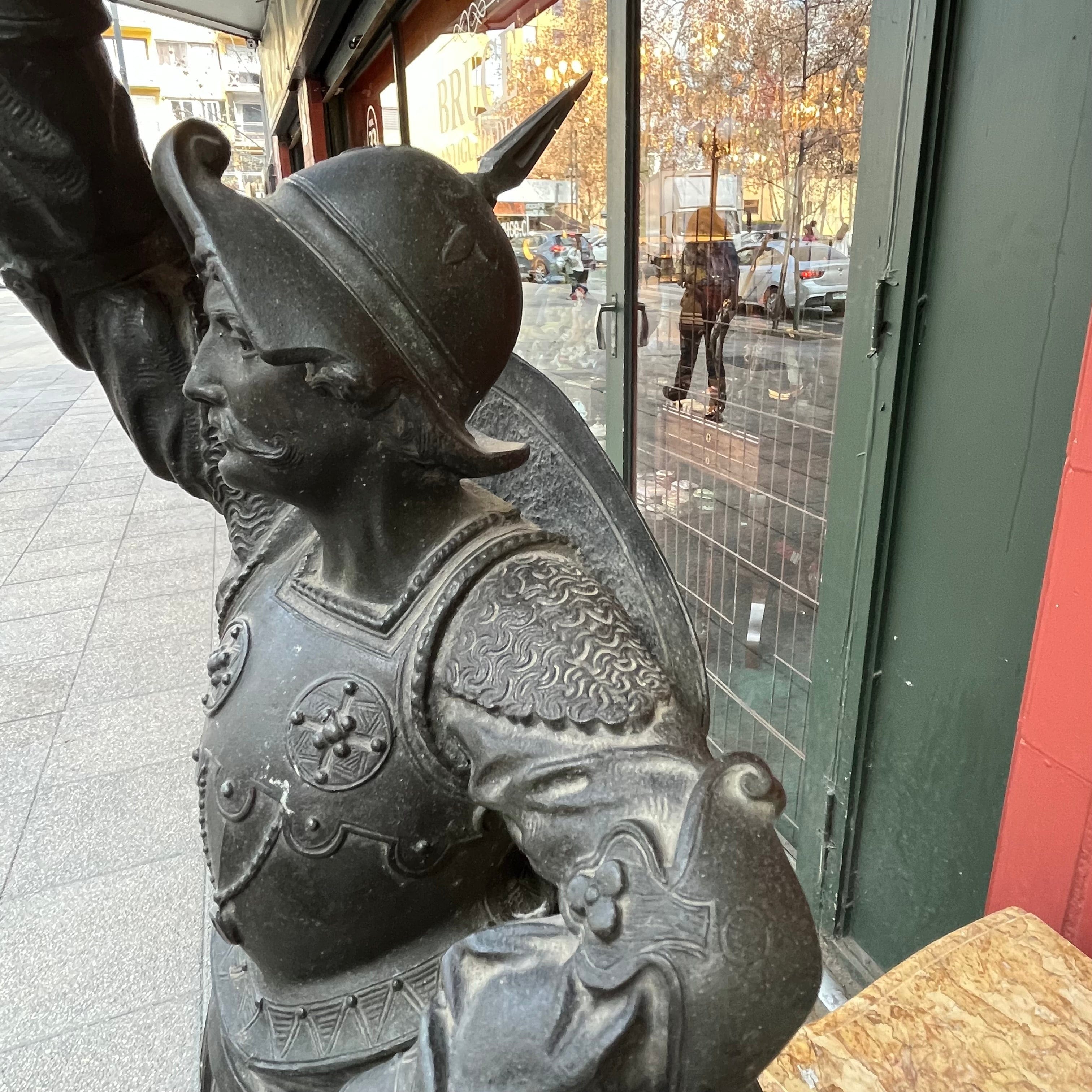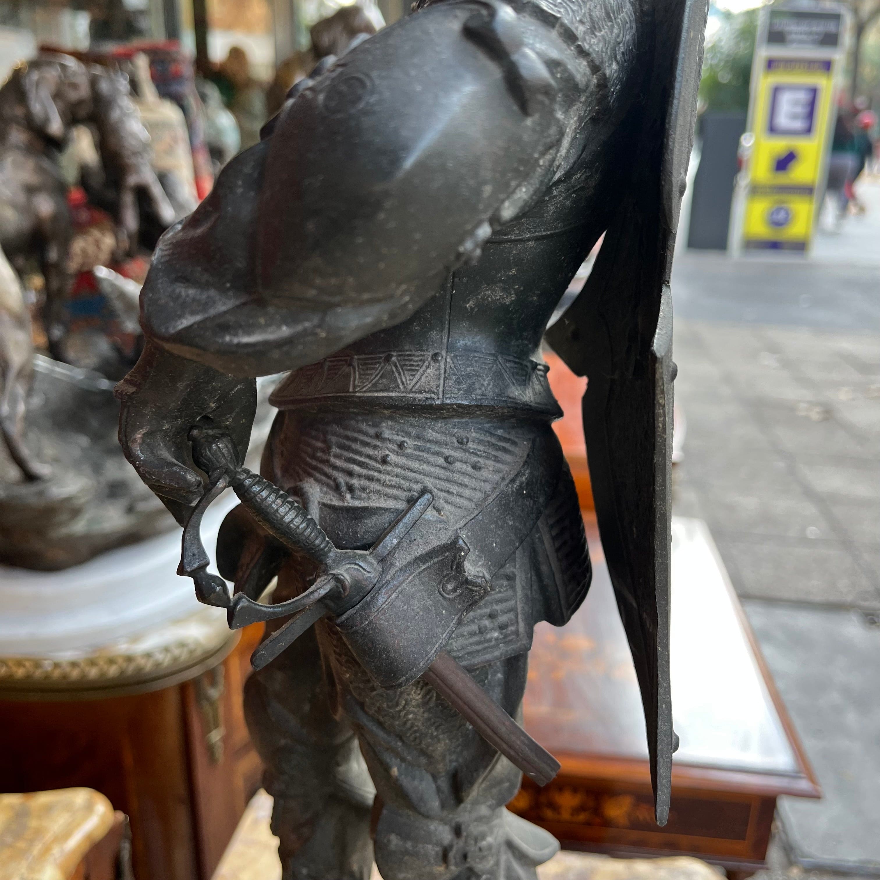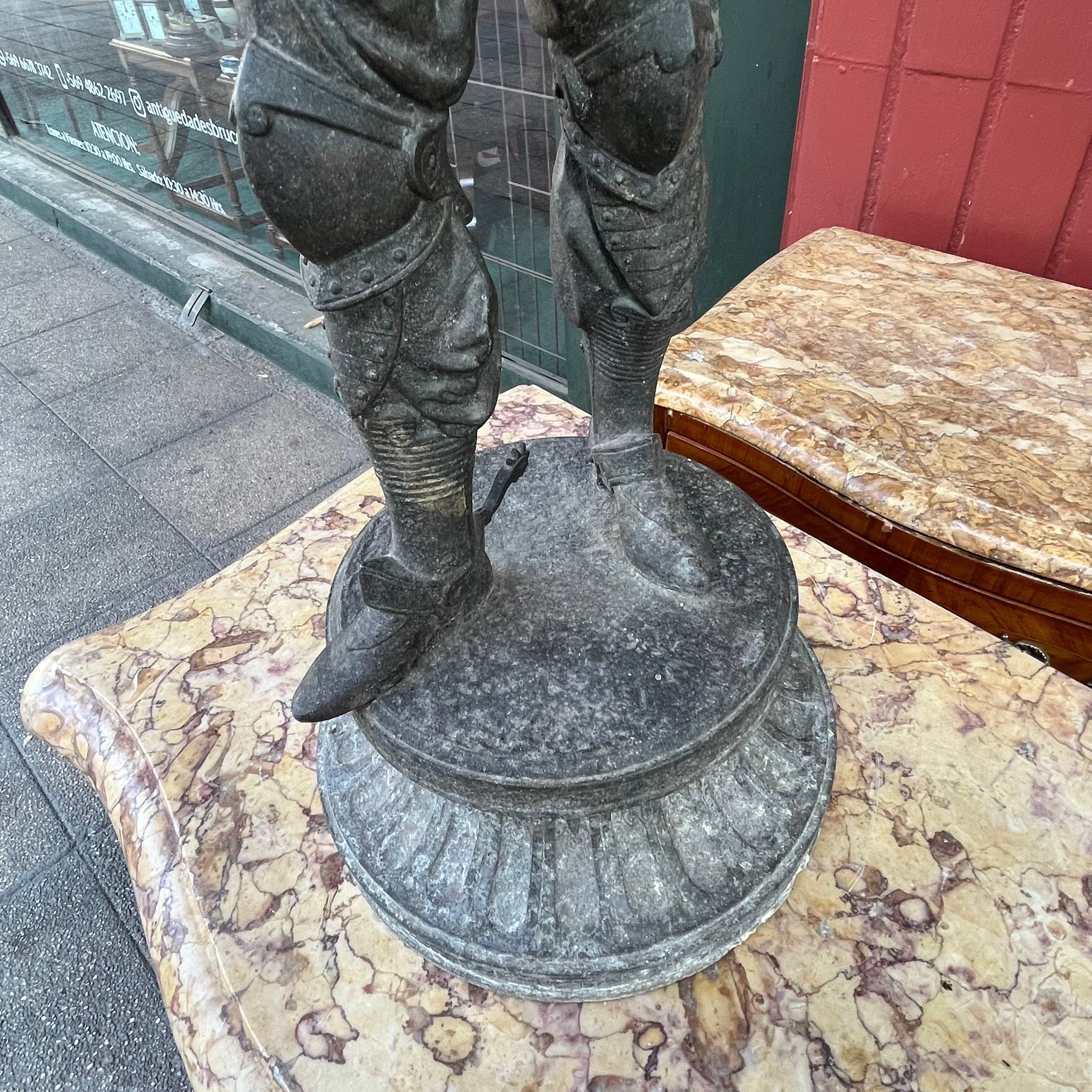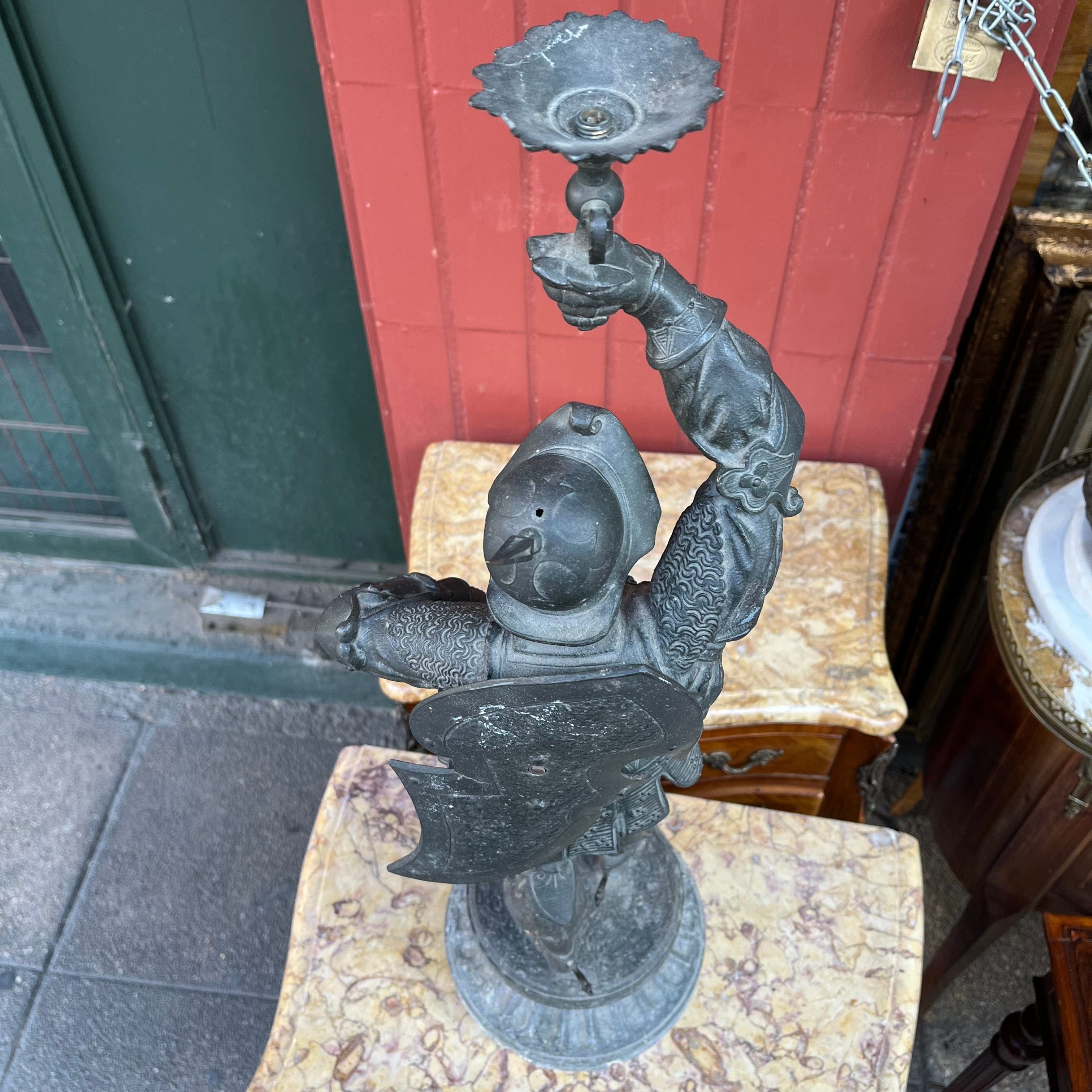 Impressive pewter figure of French origin, mounted on a base of the same material. The sculpture represents a soldier from the 17th-century Spanish Tercios, with his distinctive breastplate, shield, sword, and helmet. It is full of relief details that give the piece incredible texture. The sculpture was once a lamp, as the torch has a socket for a light bulb, and a piece of copper wire remains at its base.