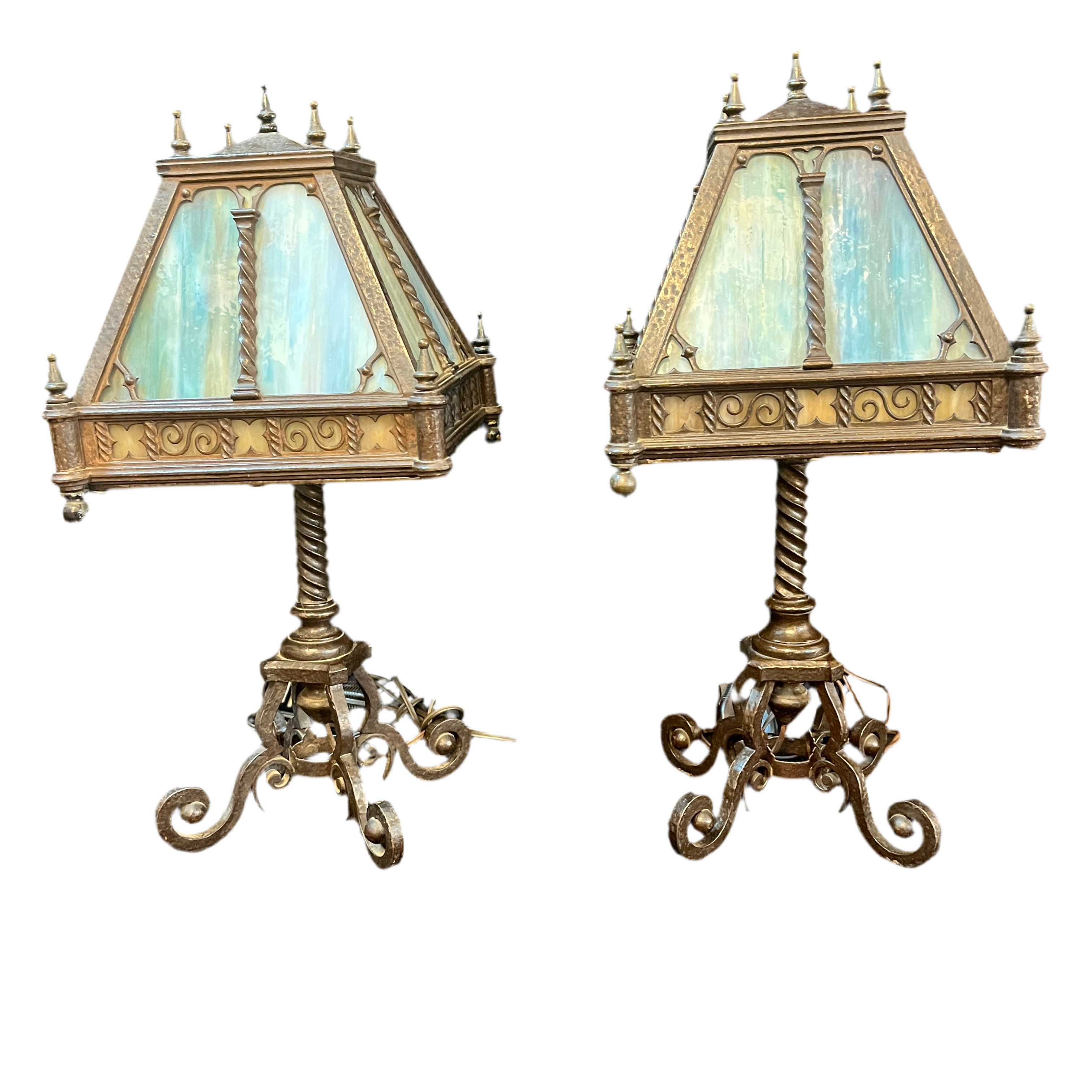 Elegante juego de dos lámparas de fierro forjado, de origen alemán, con pantalla en estilo de Ópalo, en tonos celestes, verdes y morados. Las piezas tienen bellos decorados en su pantalla y unas patas forjadas en curvas.