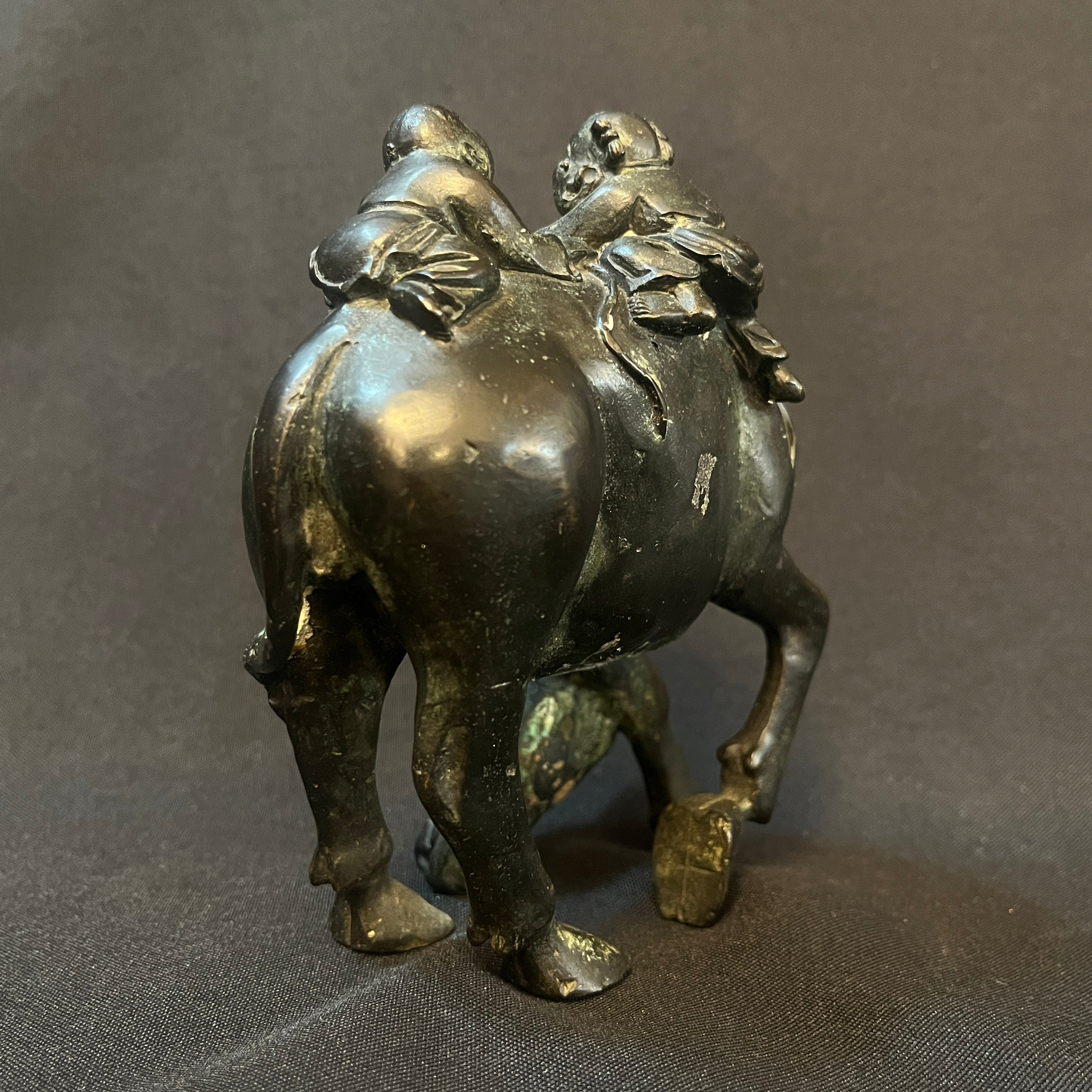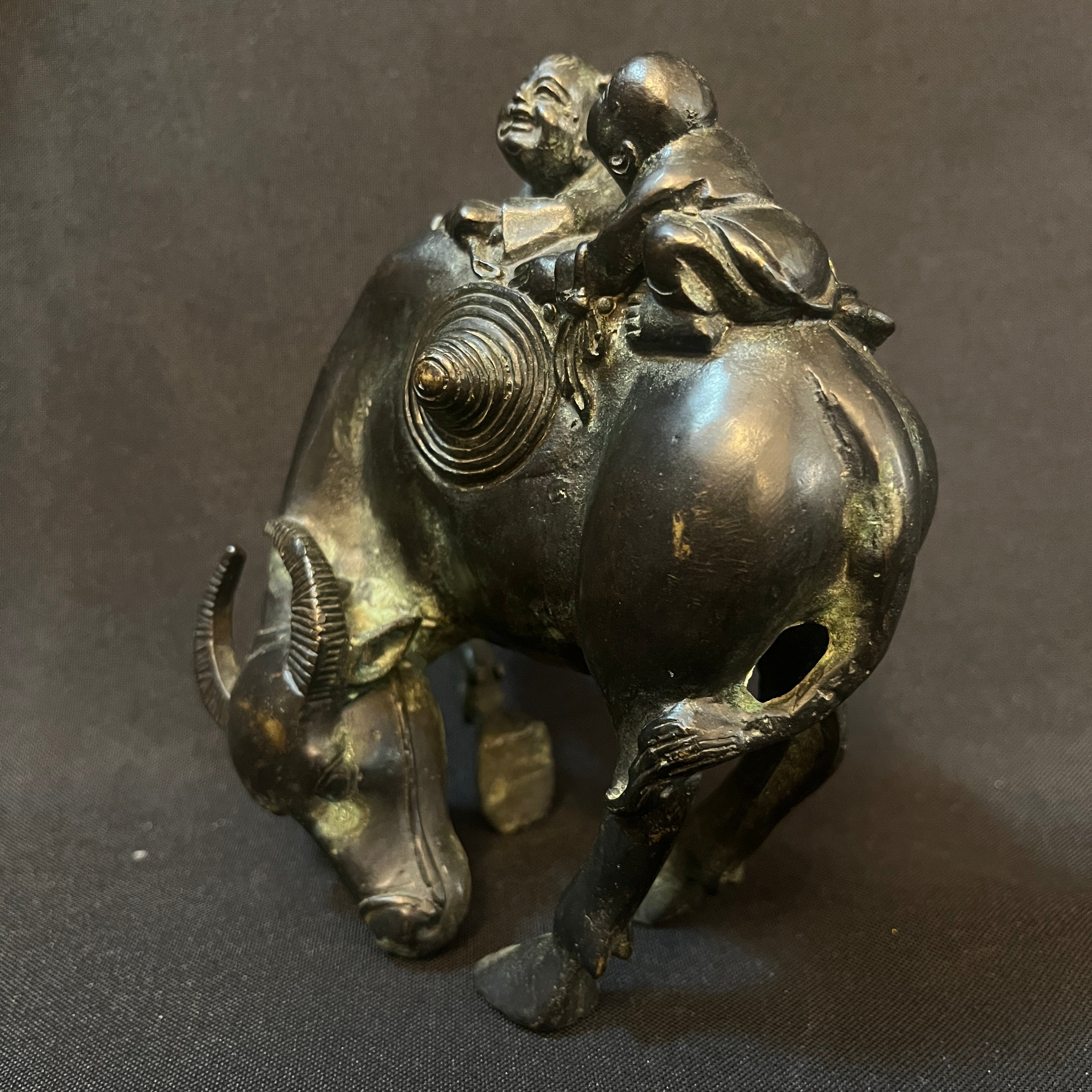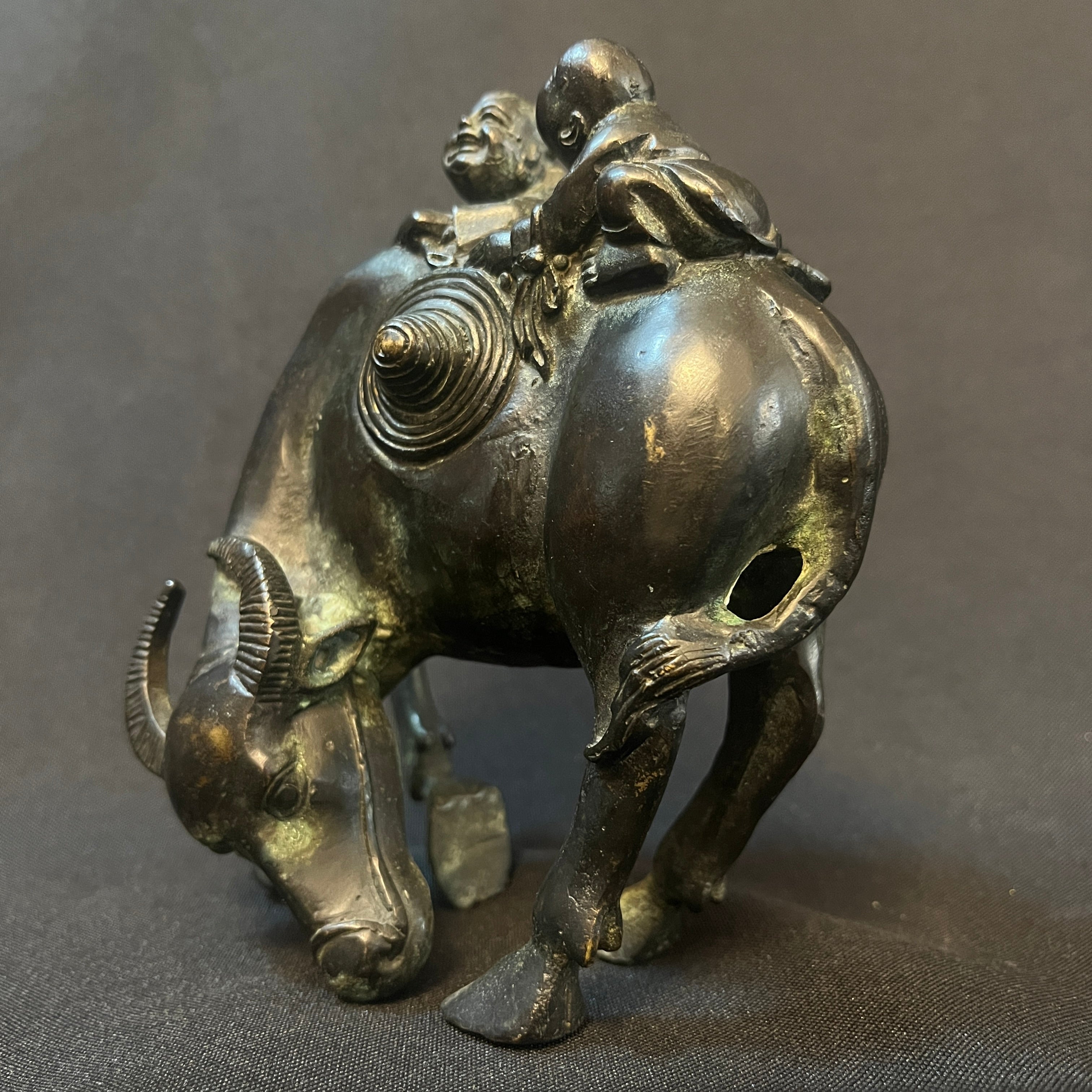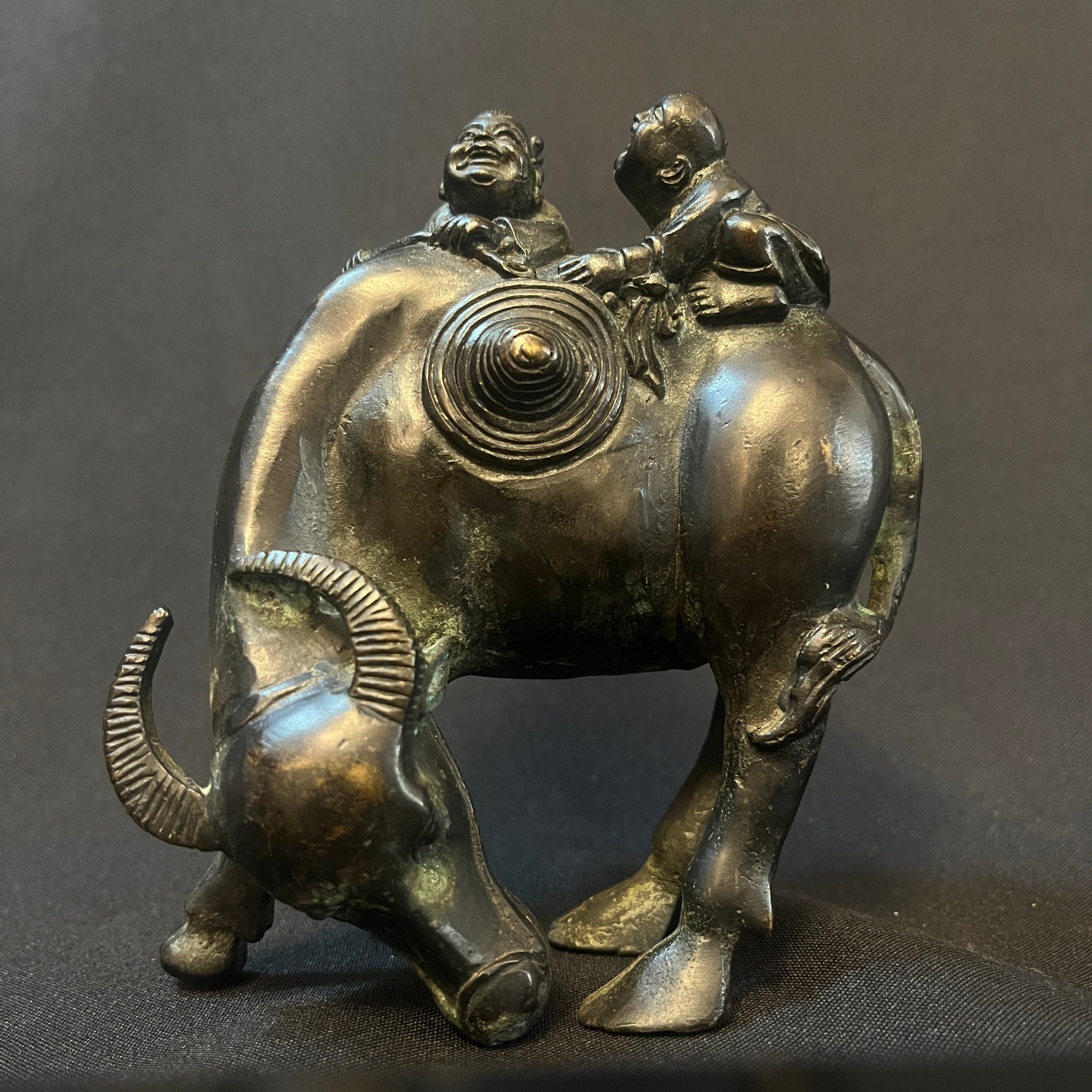 Bella escultura china de bronce tallado y patinado, representando a dos niños montados sobe un búfalo. Es una figura tradicional en la artesanía china, siendo esta temática representada en distintos materiales y estilos. La pieza se encuentra en buen estado con los signos propios de su uso y antigüedad.