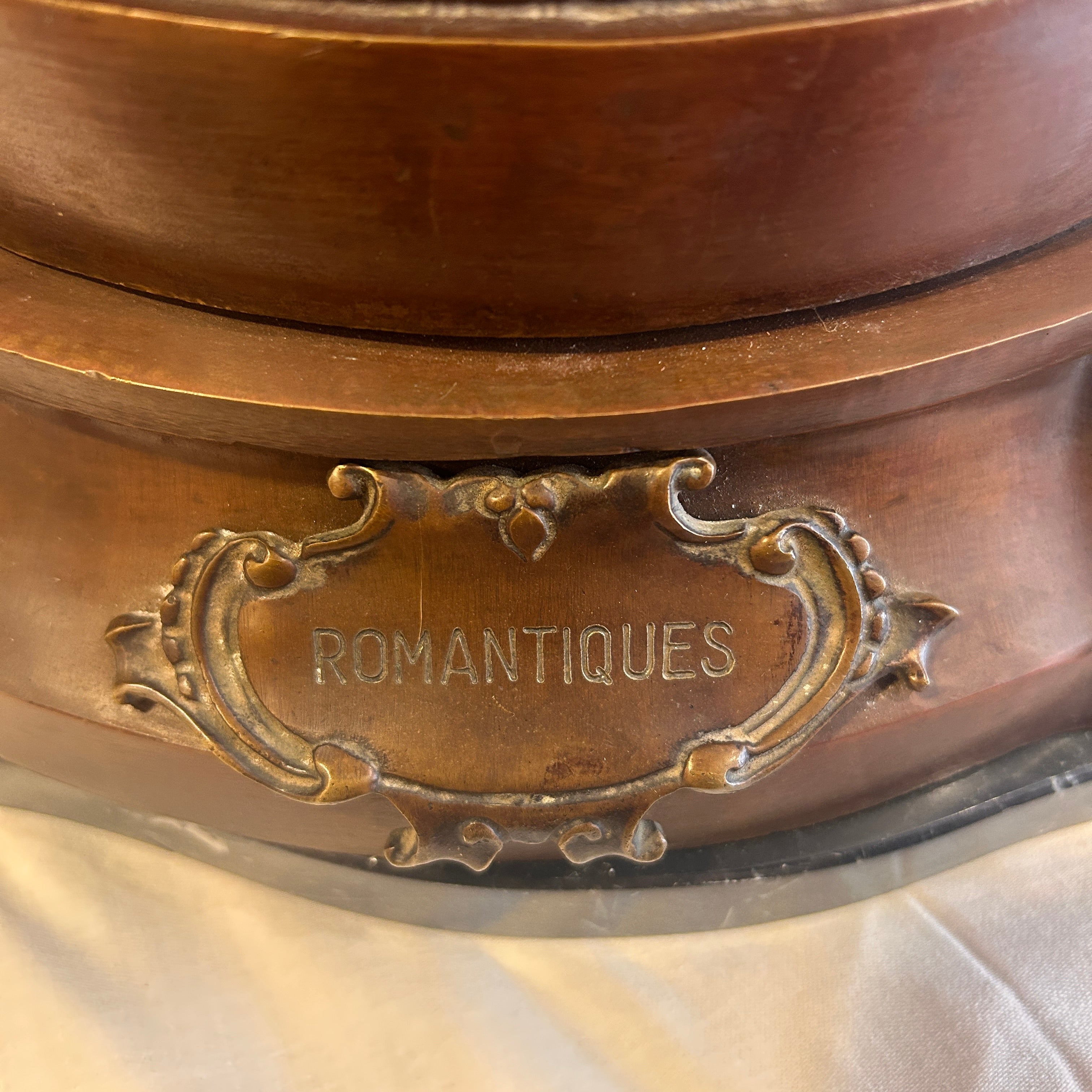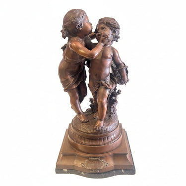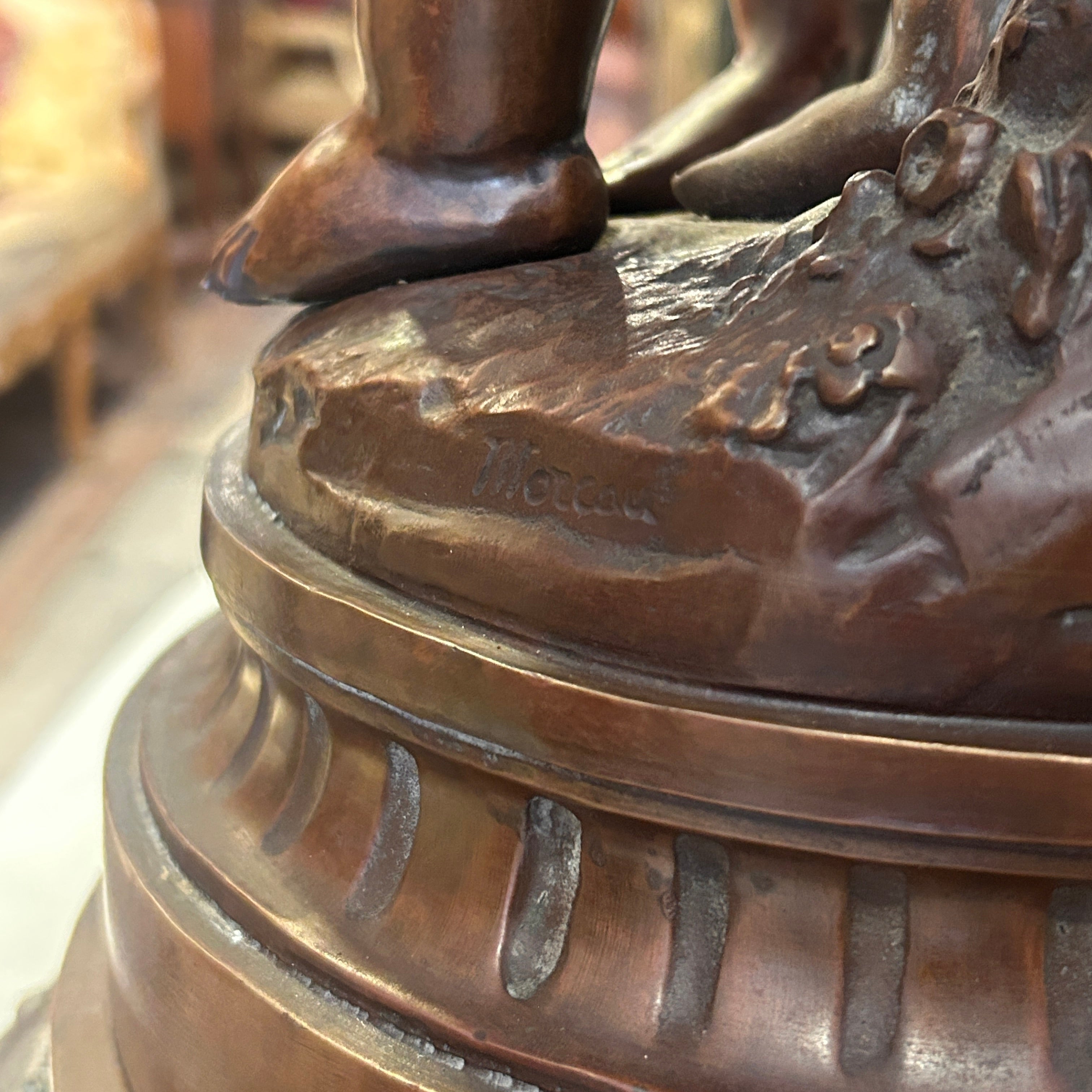 Auguste Moreau (1834–1917); bronze group with brown patina of children leaning against a tree trunk. Fluted circular base; cartouche “Romantiques”; counter-socle in veined black marble; signed.