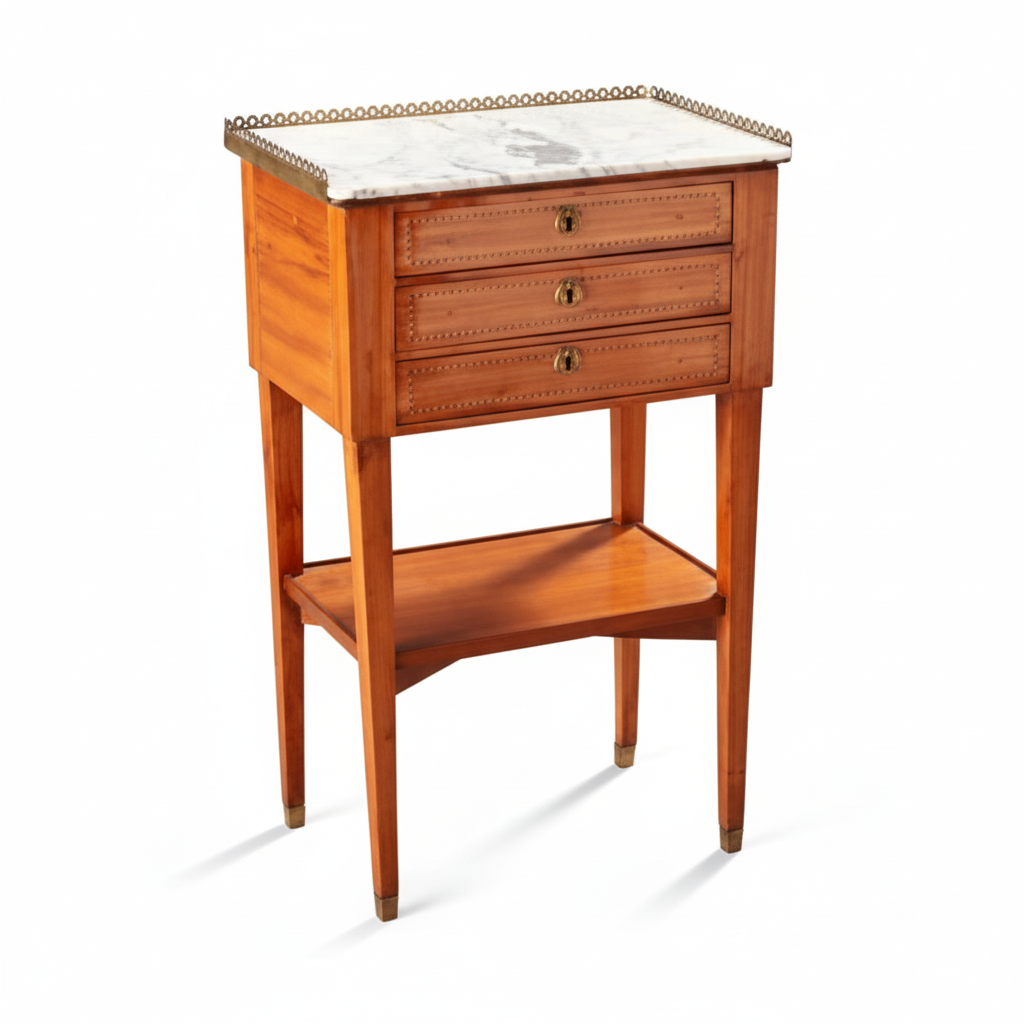 Cómoda chiffonnière chapada en palo de rosa, con tres cajones con filetes geométricos. Montantes rectos, pies torneados unidos por entrepano con tablero. Cubierta de mármol blanco encastrada con galería de latón calado. Trabajo antiguo de estilo Luis XVI.