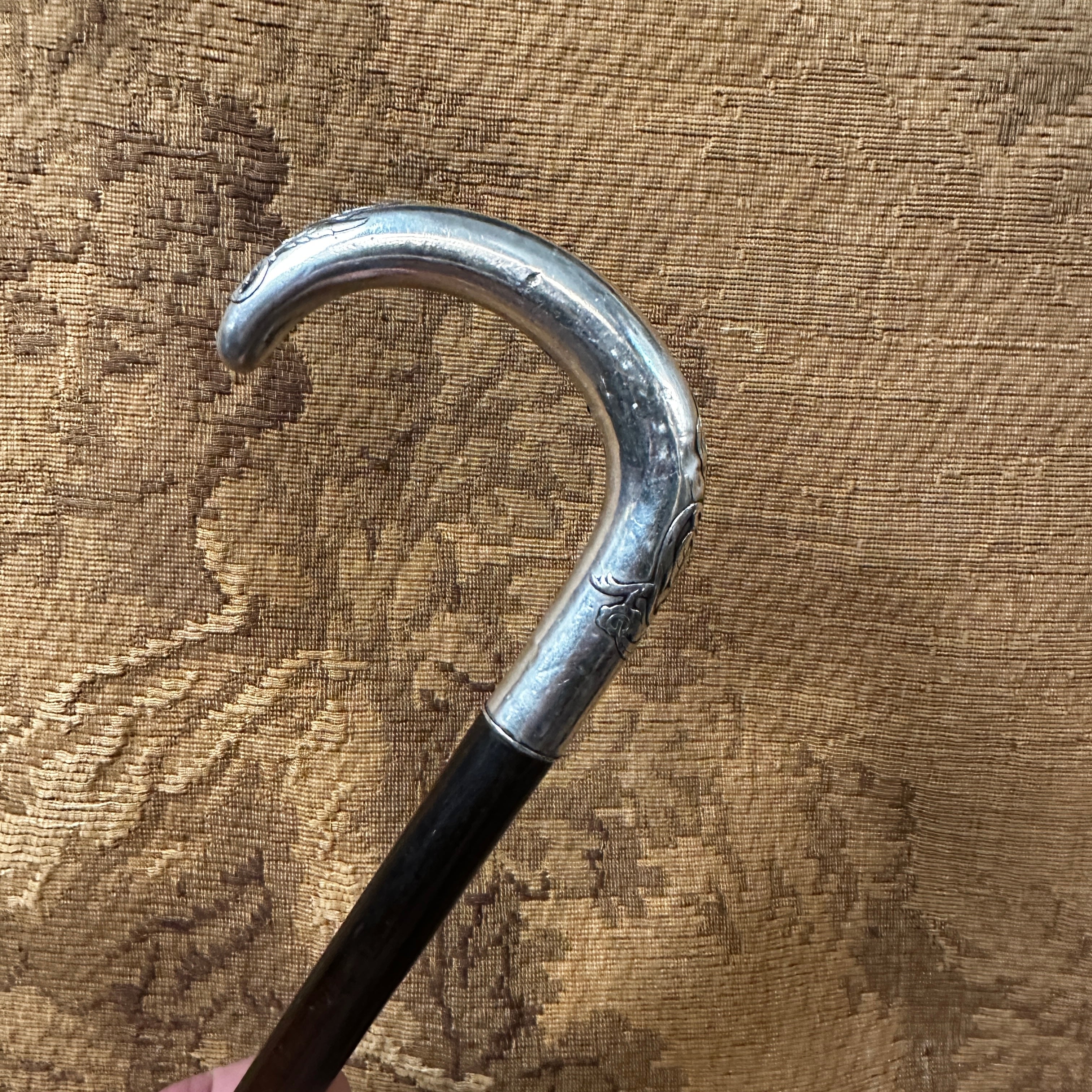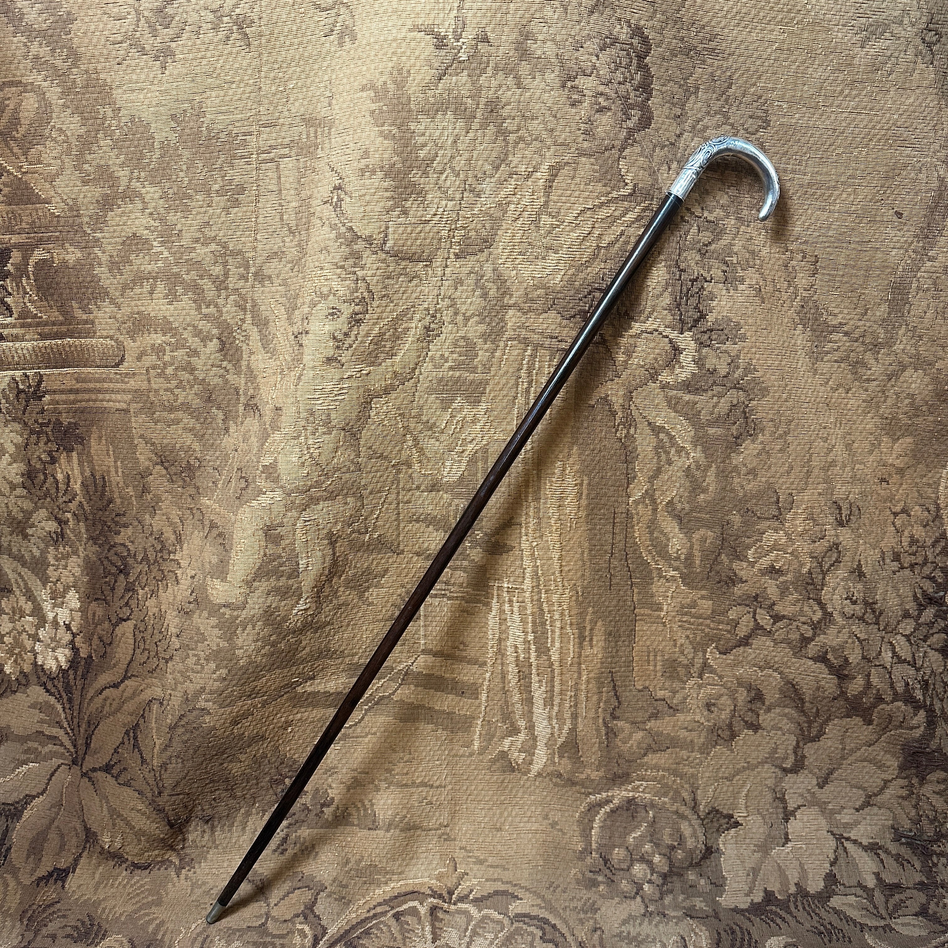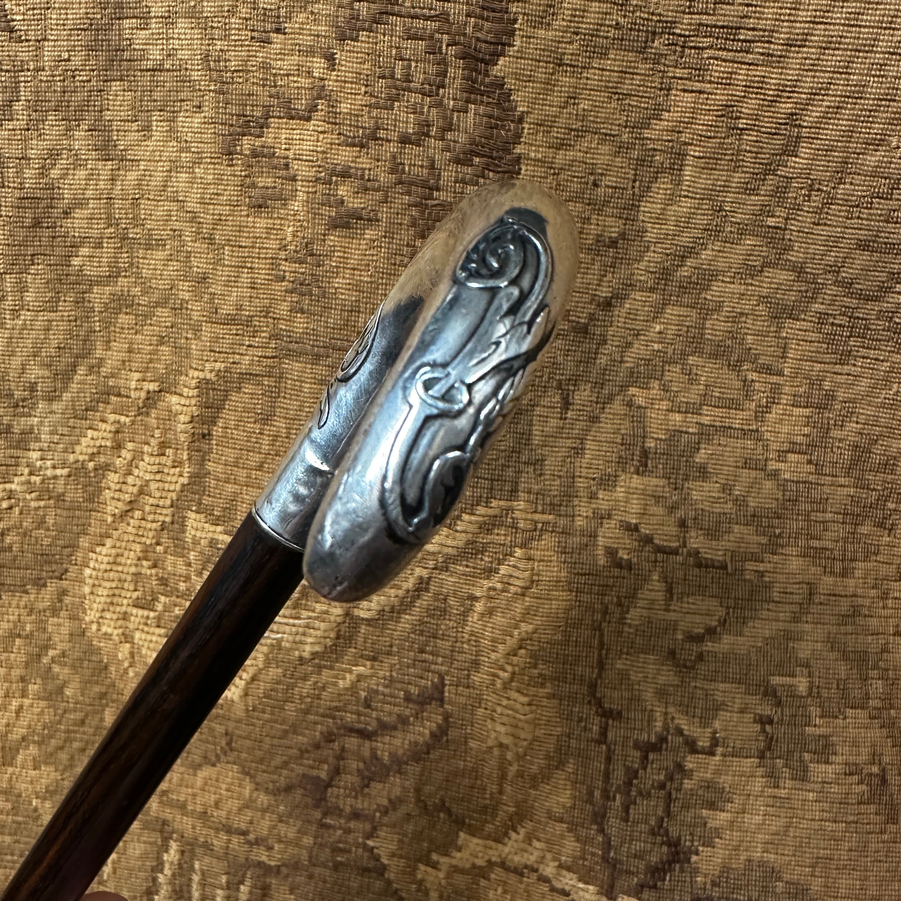 Elegant mahogany lady's walking stick with a silver handle and Art Nouveau design.