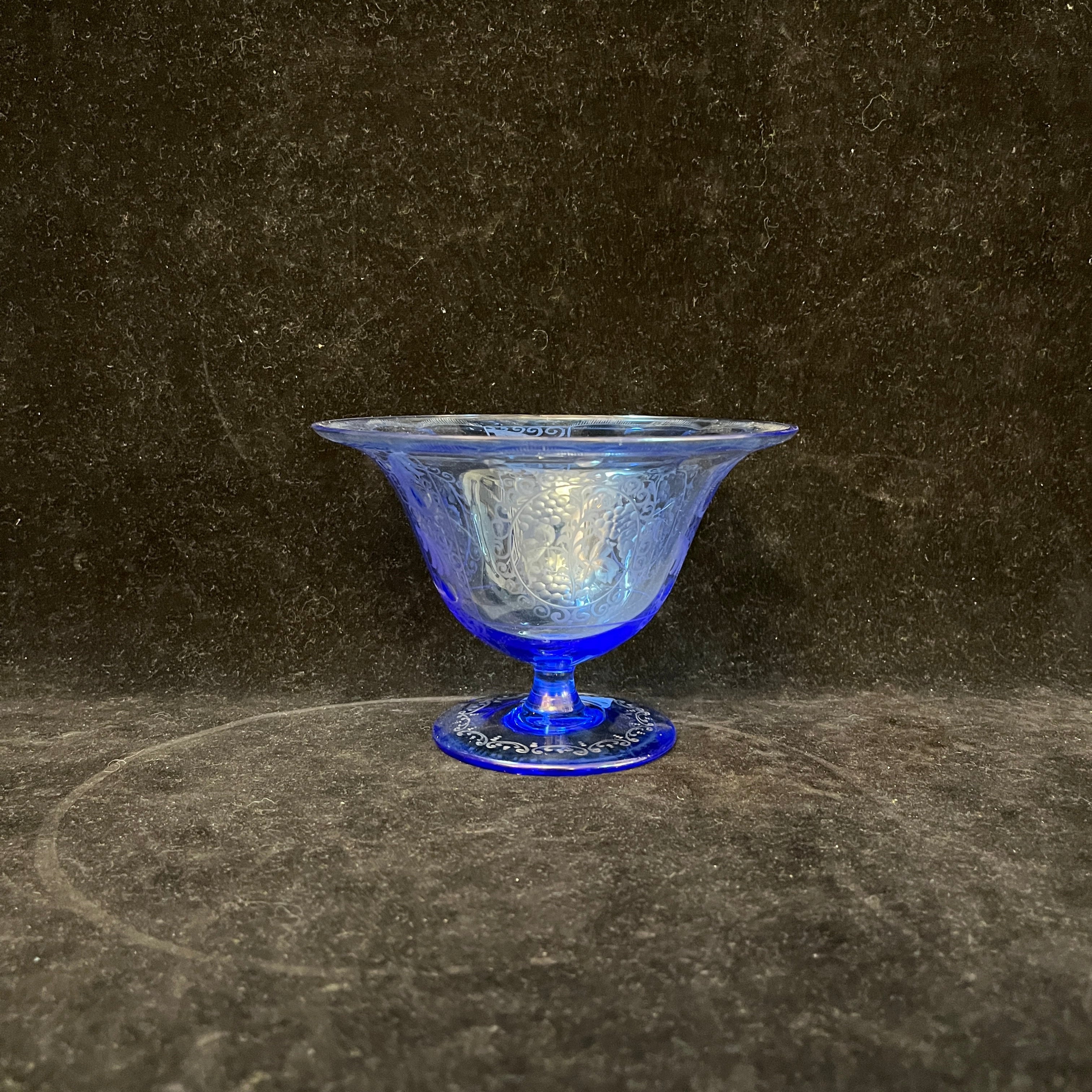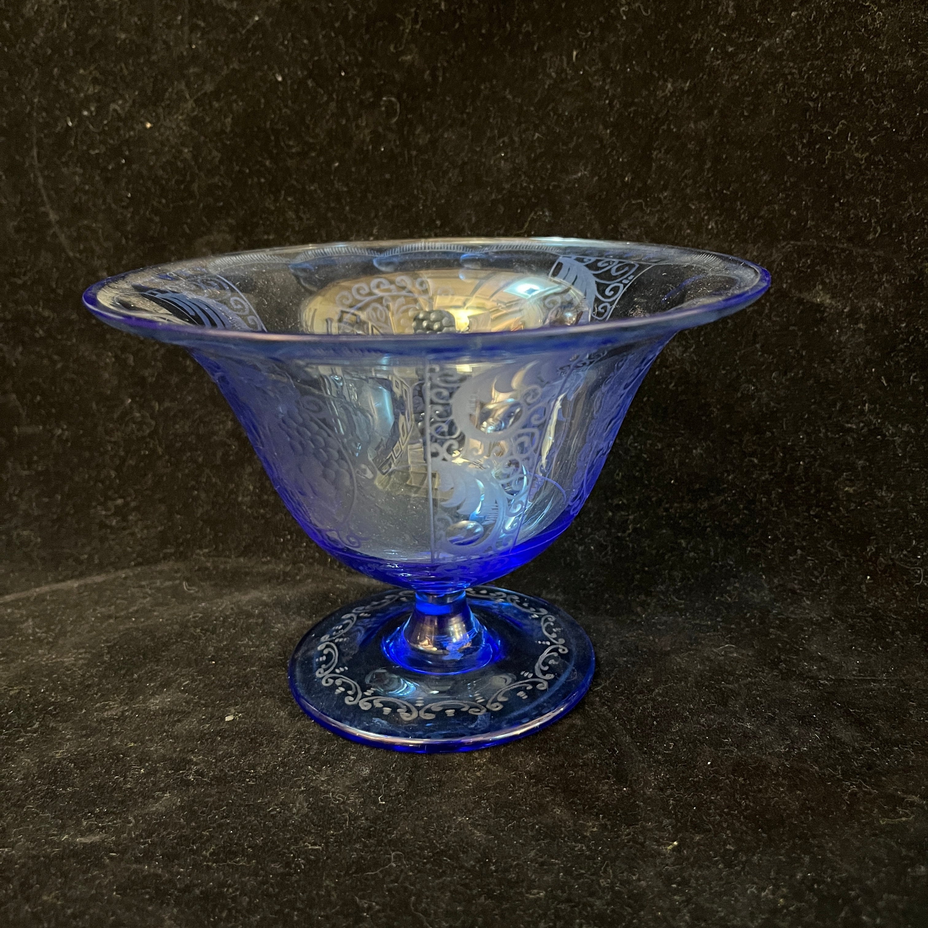 Beautiful blue Bohemian crystal centerpiece, shaped like a chalice, with gorgeous floral designs.