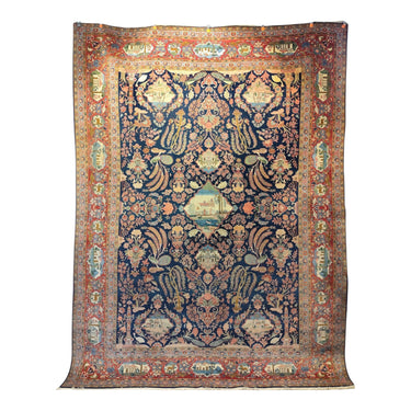 Extraordinaria alfombra Kashan, de origen Iraní, hecha de lana tejida a mano. Se trata de una alfombra persa clásica, muy valorada por su artesanía de alta calidad y sis intrincados diseños. Originaria de la ciudad de Kashan en Irán, se caracteriza por un medallón central, un campo florido y el uso de materiales de primera calidad. Esta pieza tiene un magnífico diseño, con finos dibujos en su zona central de color azul, retratan tanto paisajes como decoraciones orgánicas, y cintillos exteriores llenos de detalladas decoraciones y un predominante rojo.