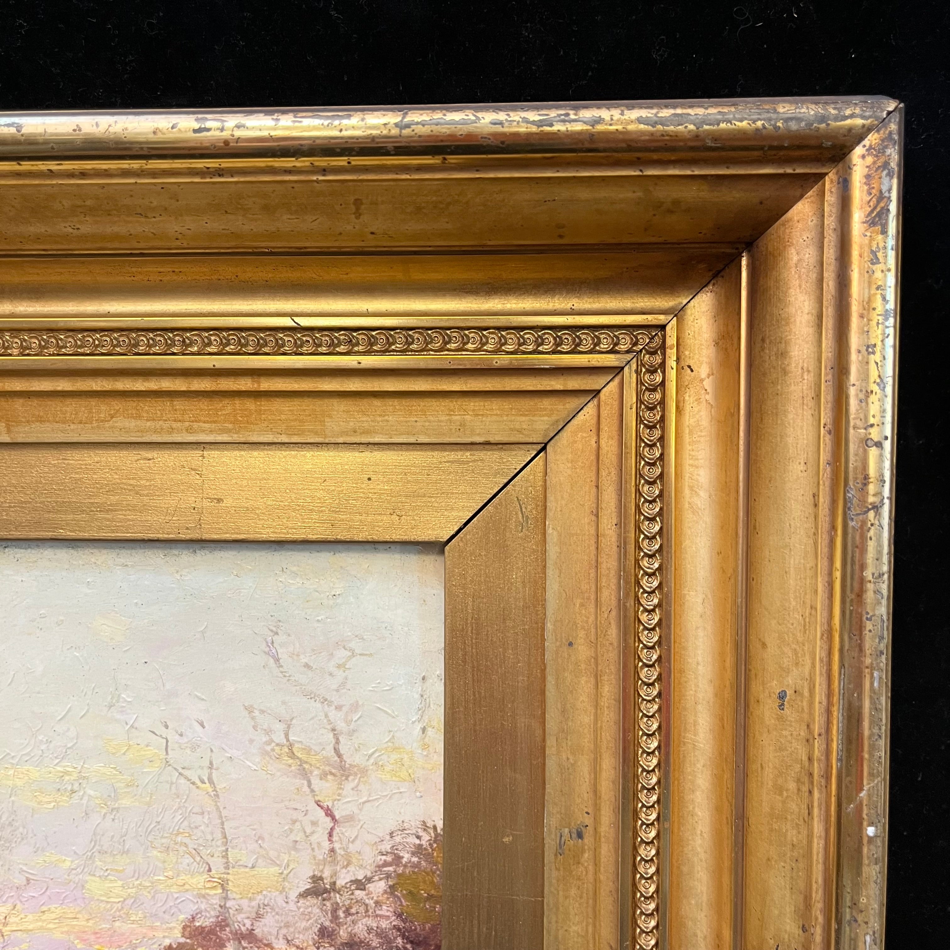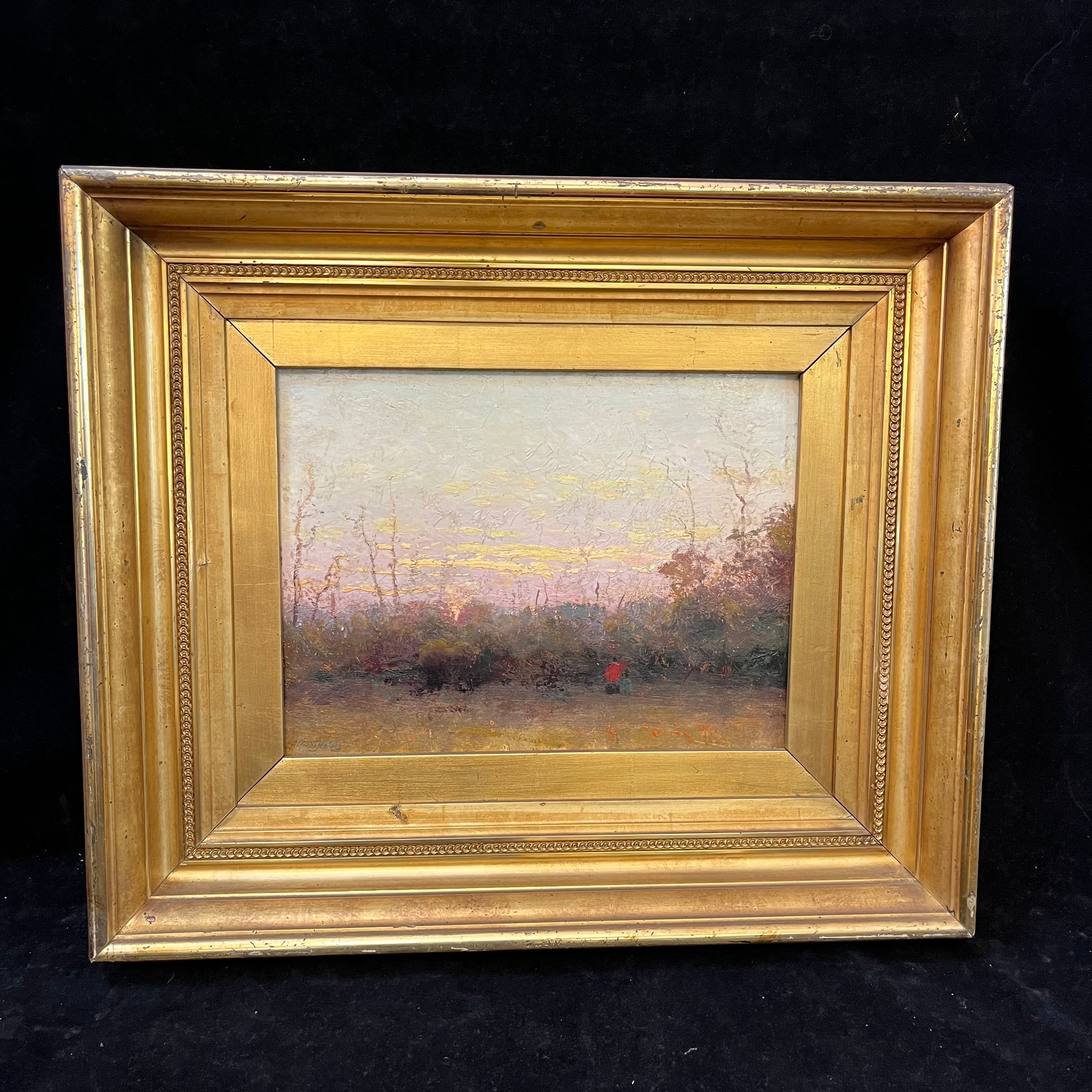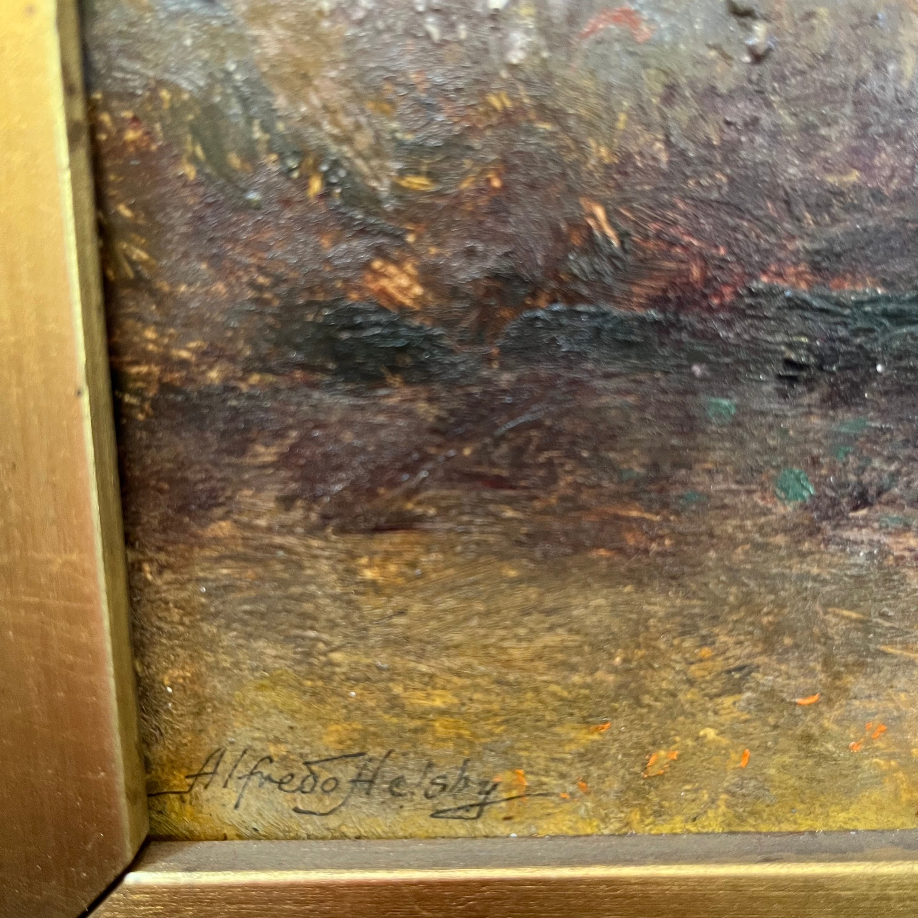 Óleo sobre tela del pintor chileno Alfredo Helsby (1862-1933), representando un paisaje de arbustos con el cielo de fondo. La obra tiene un impresionante y sutil trabajo de luz, muy propio del estilo del artista, que se nutre del impresionismo y se aleja de la representación rigurosa. La obra está enmarcada en madera, tallada en escalones y con un delgado cintillo decorado en relieves. El marco está terminado en dorado.