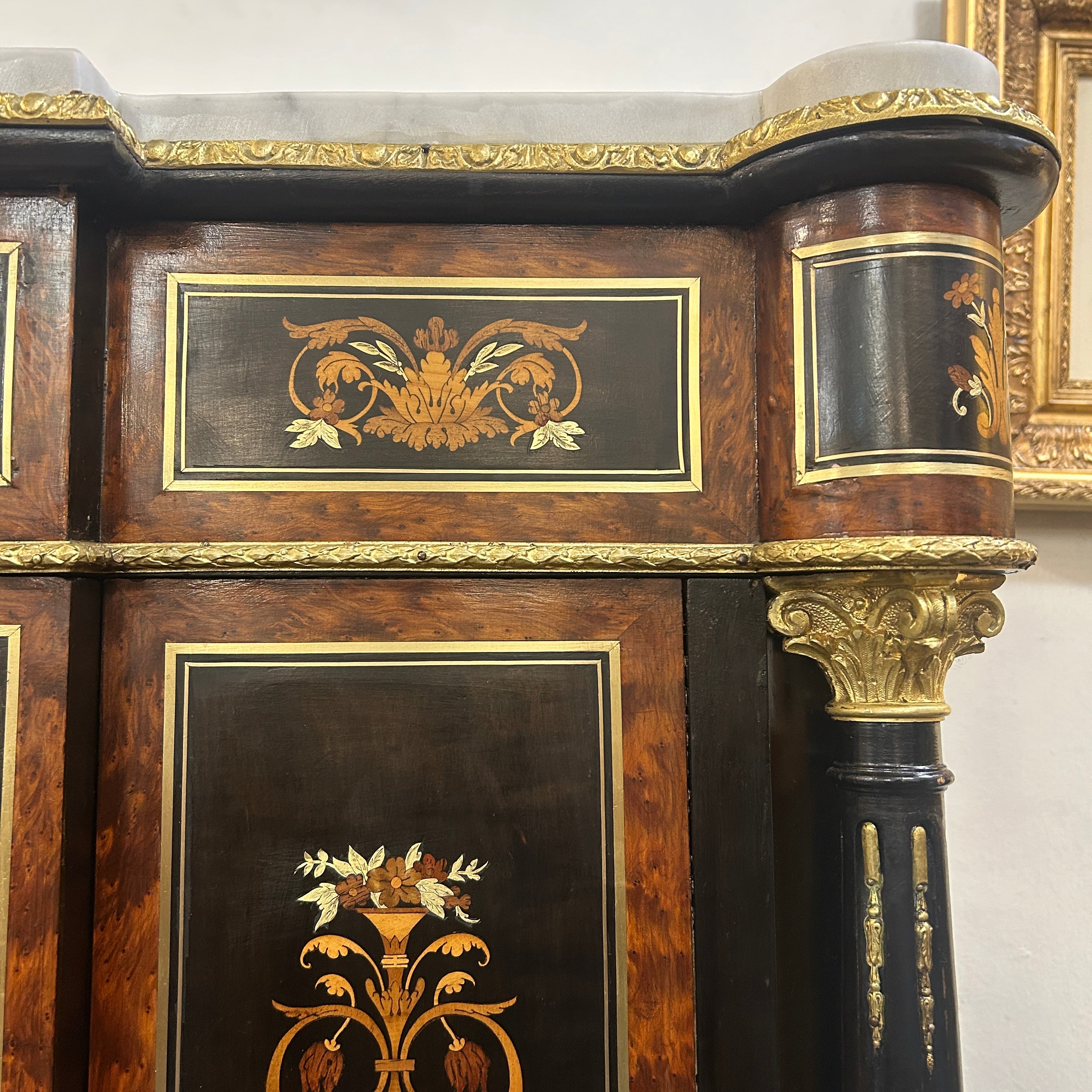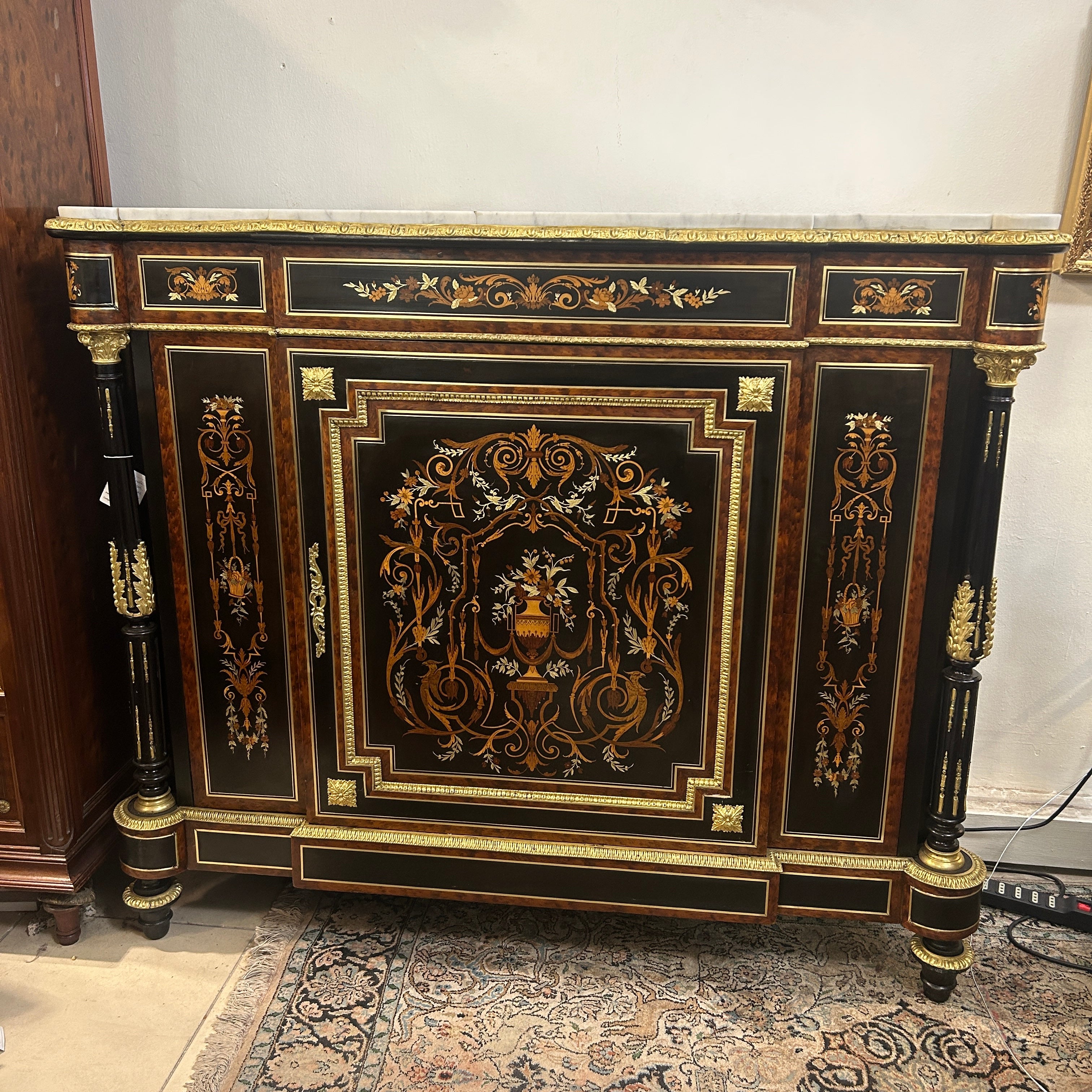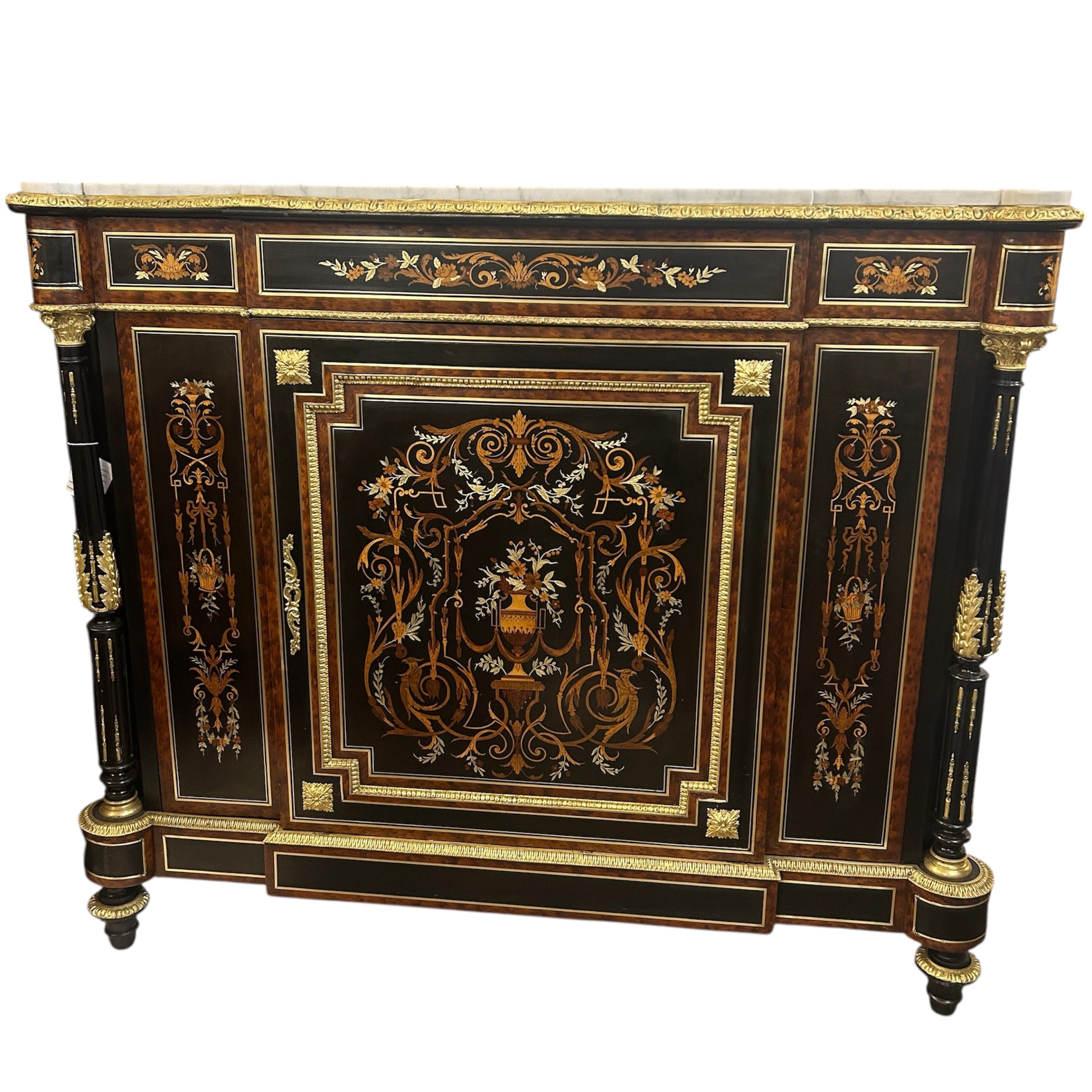 Gran boulle de origen francés estilo Napoleón III, hecho de madera ebonizada, con una increíble marquetería en nácar, maderas frutales y bronce, con motivos de decoración en guirnaldas y una gran vasija con flores en el centro. Esta llamativa pieza tiene aplicaciones de relieves y filetes en bronce ormolú, además de una espectacular cubierta de mármol blanco de Carrara. Un elemento distintivo de esta pieza es la mezcla del ebanizado con su enchapado en madera exótica. Su puerta de gran tamaño da acceso al espacio de almacenaje interior, compuesto de tres repisas.