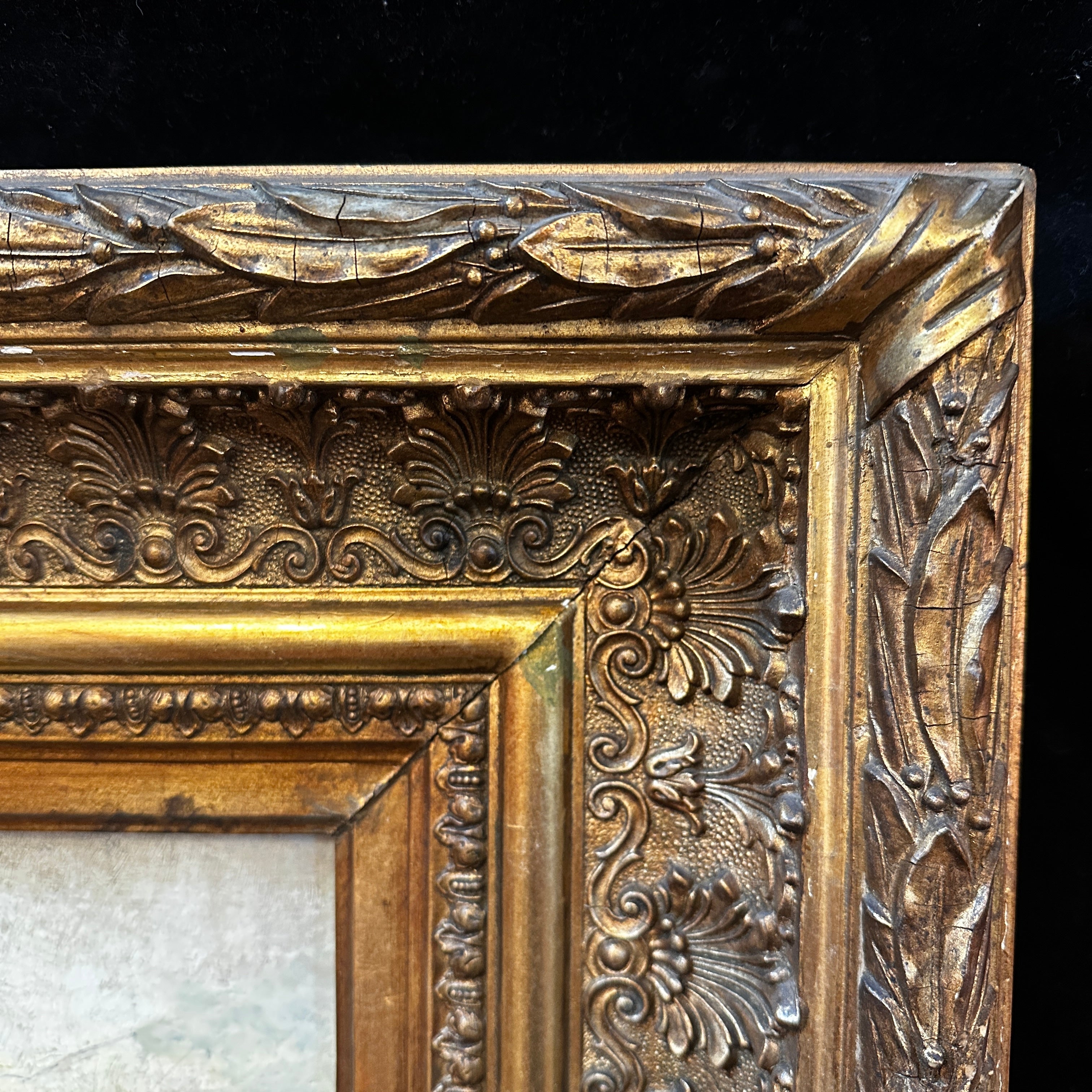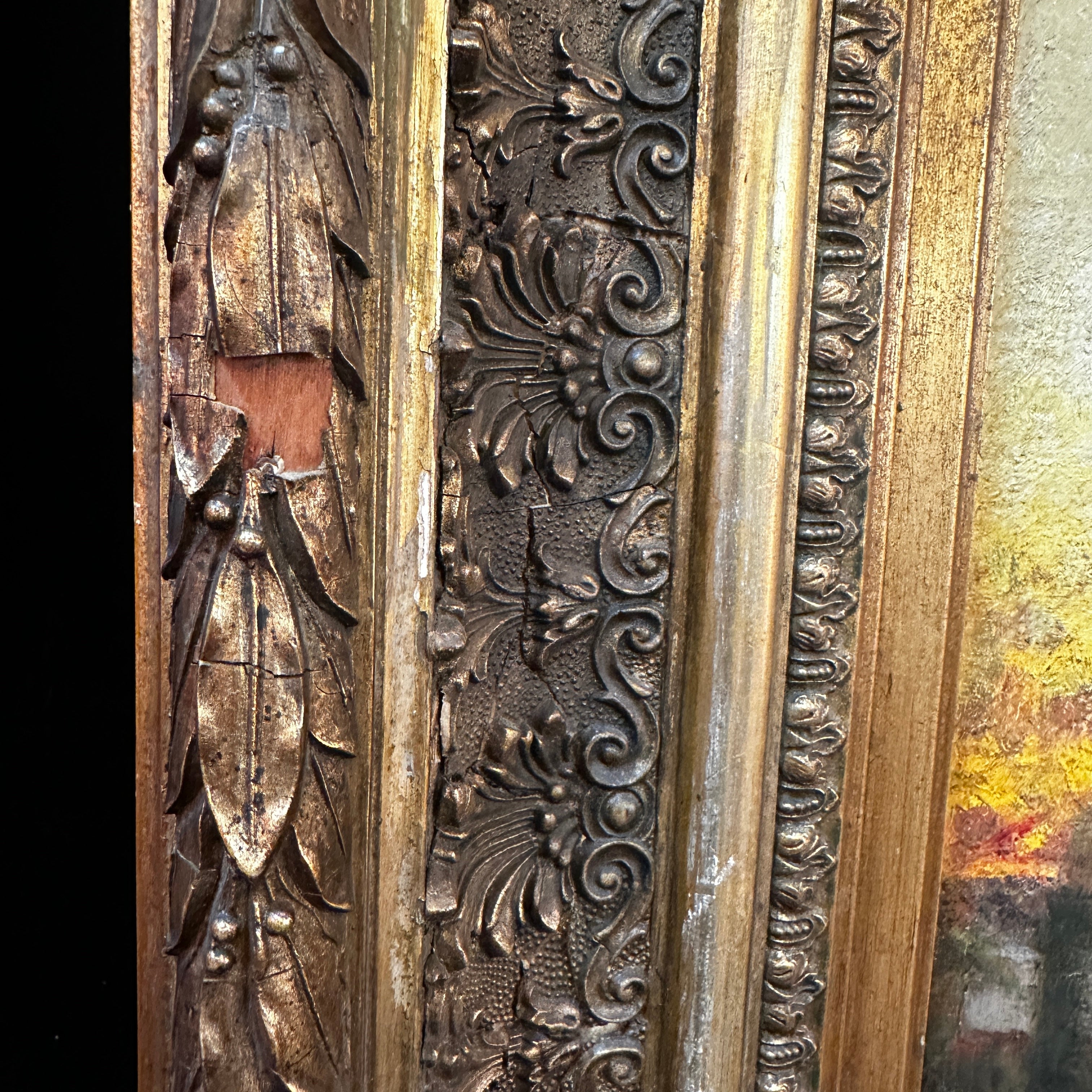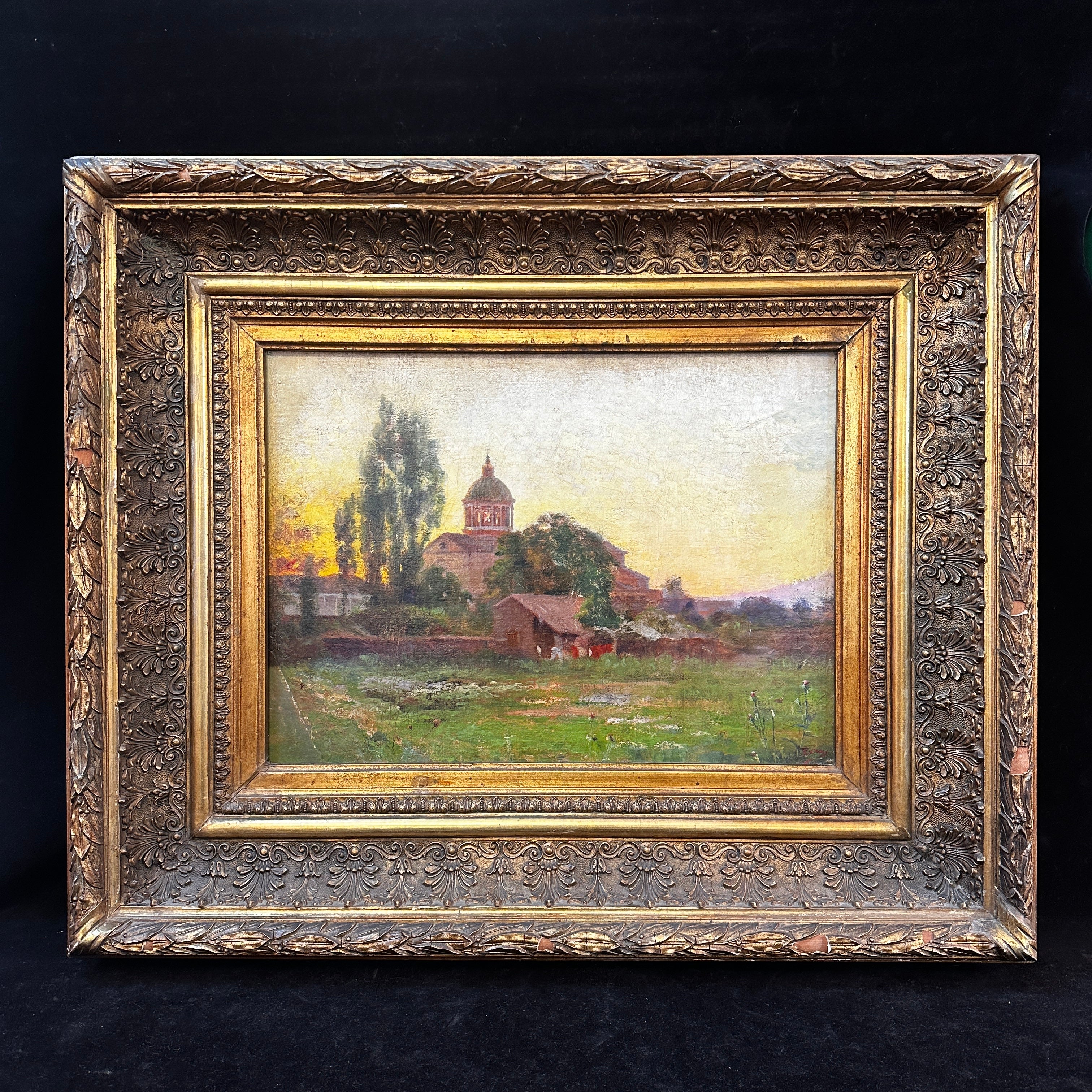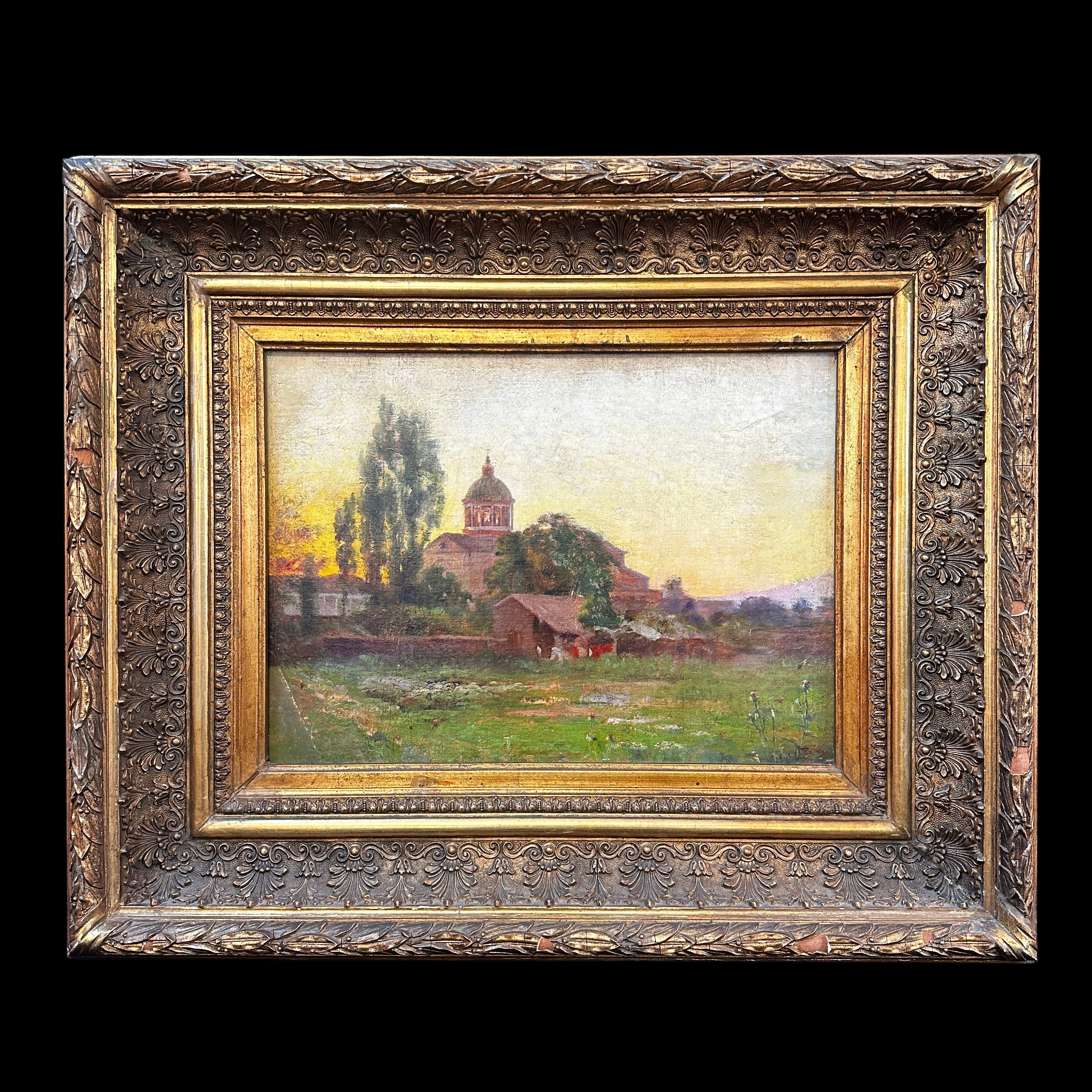 A beautiful oil on canvas painting by Chilean artist Pedro Lira, painted around 1920, depicts the Riesco Palace located north of Santiago (present-day Huechuraba). It features an elaborate carved wooden frame painted in gold.
