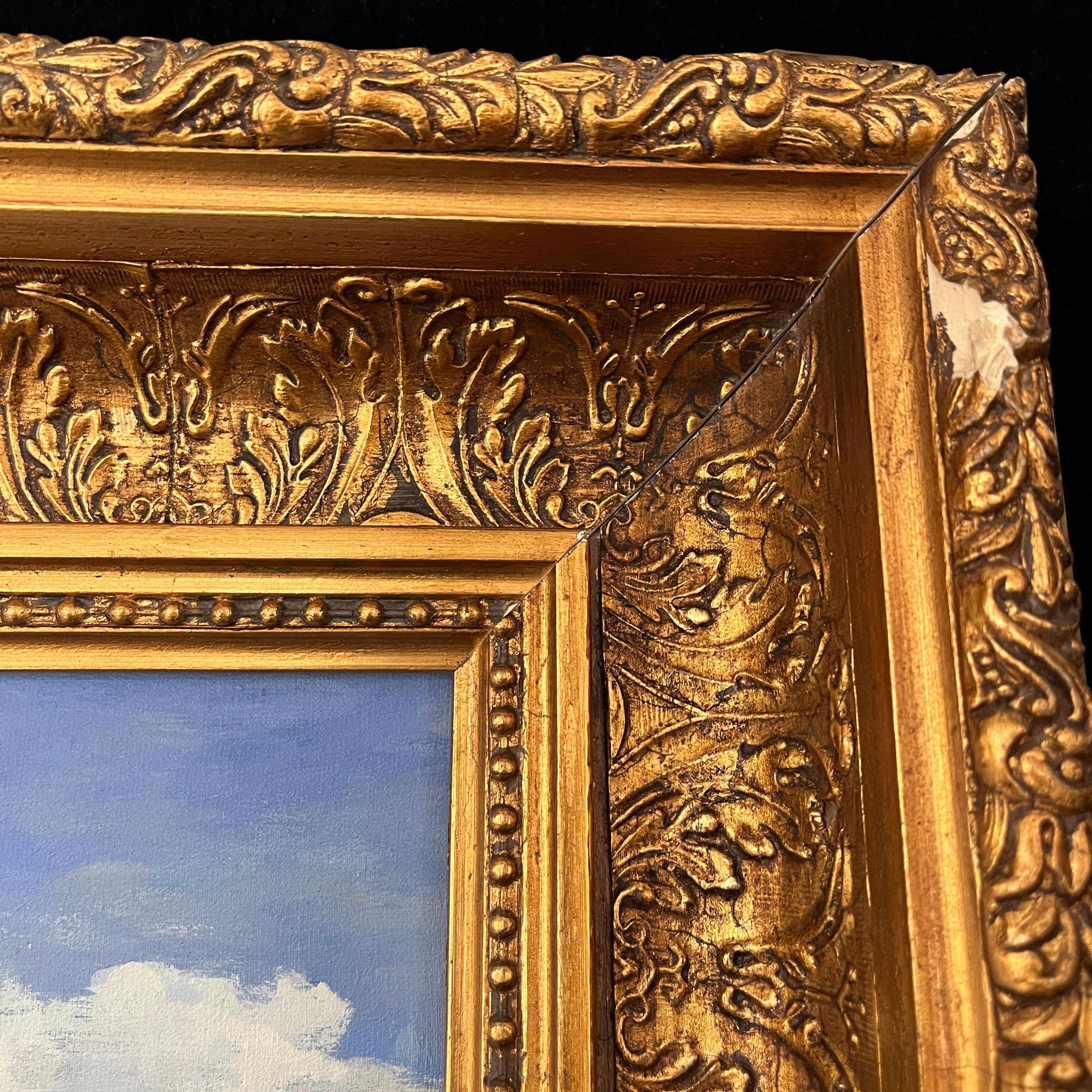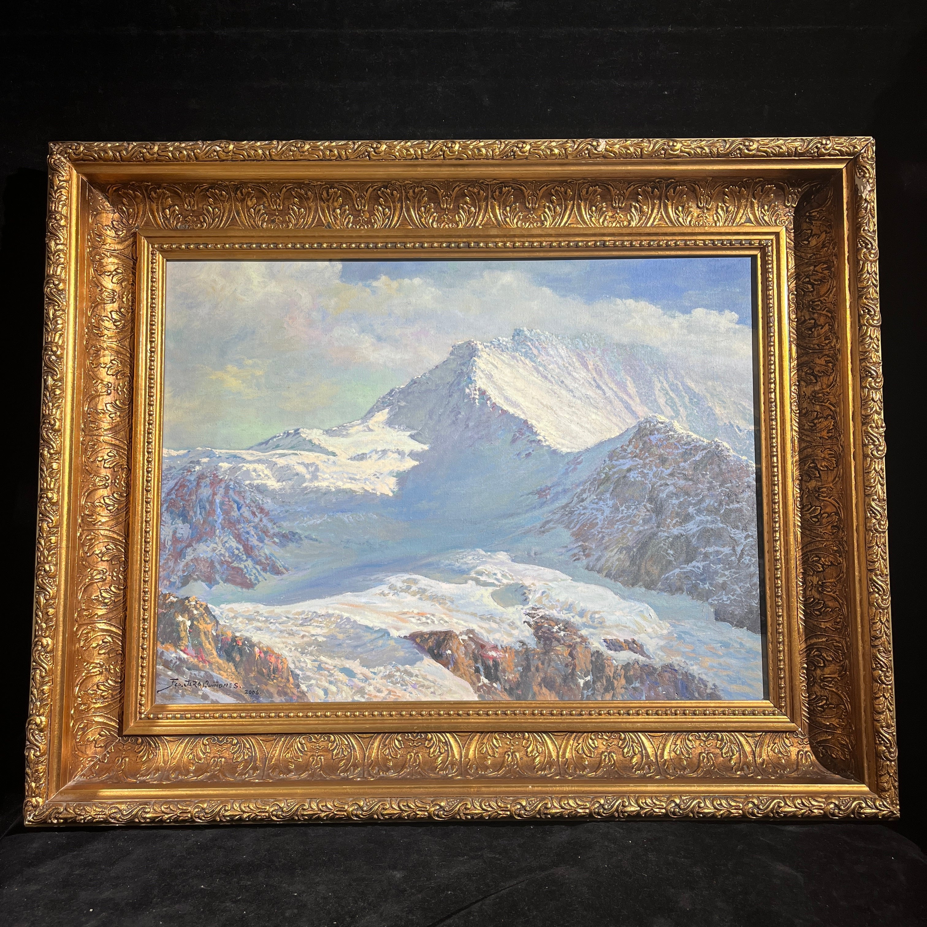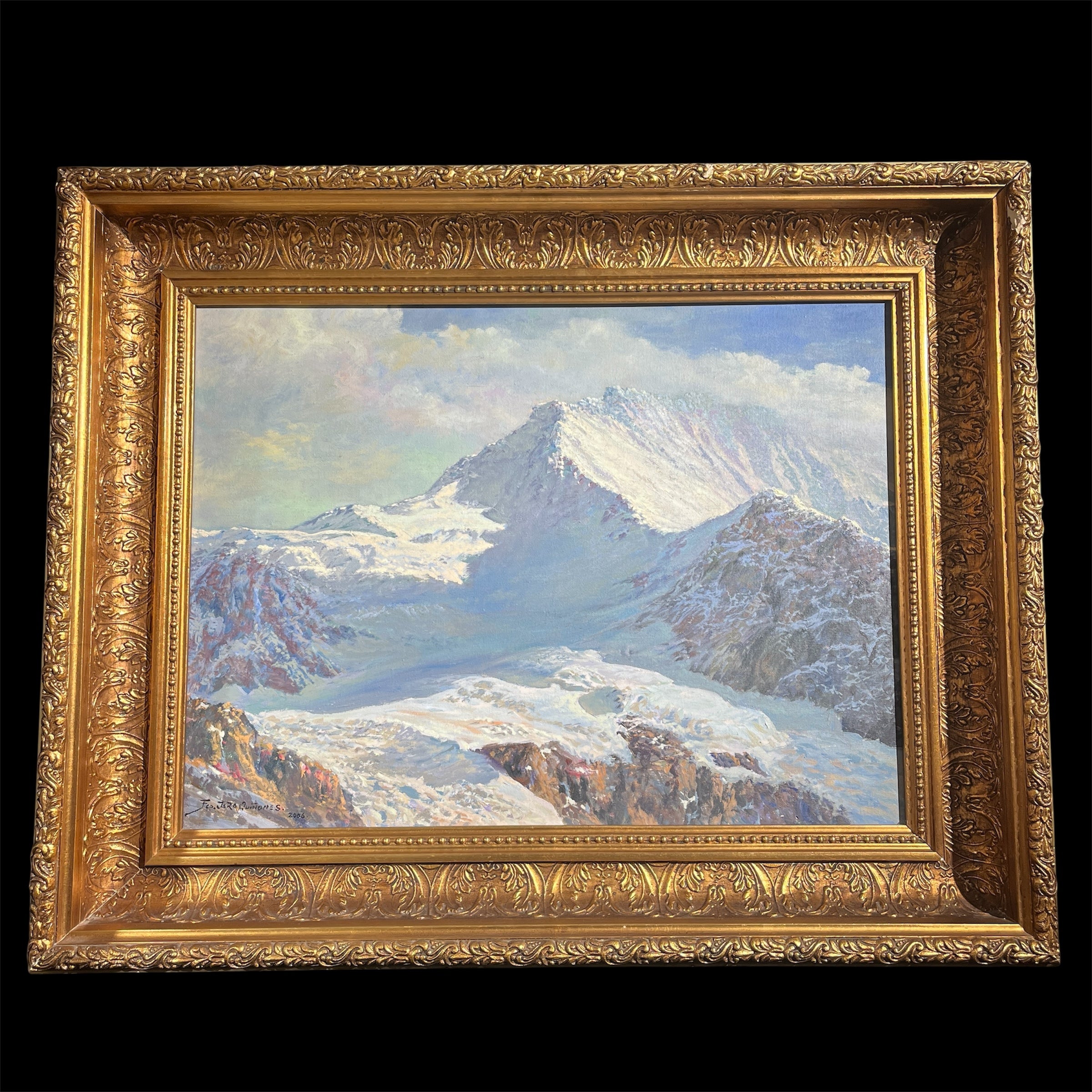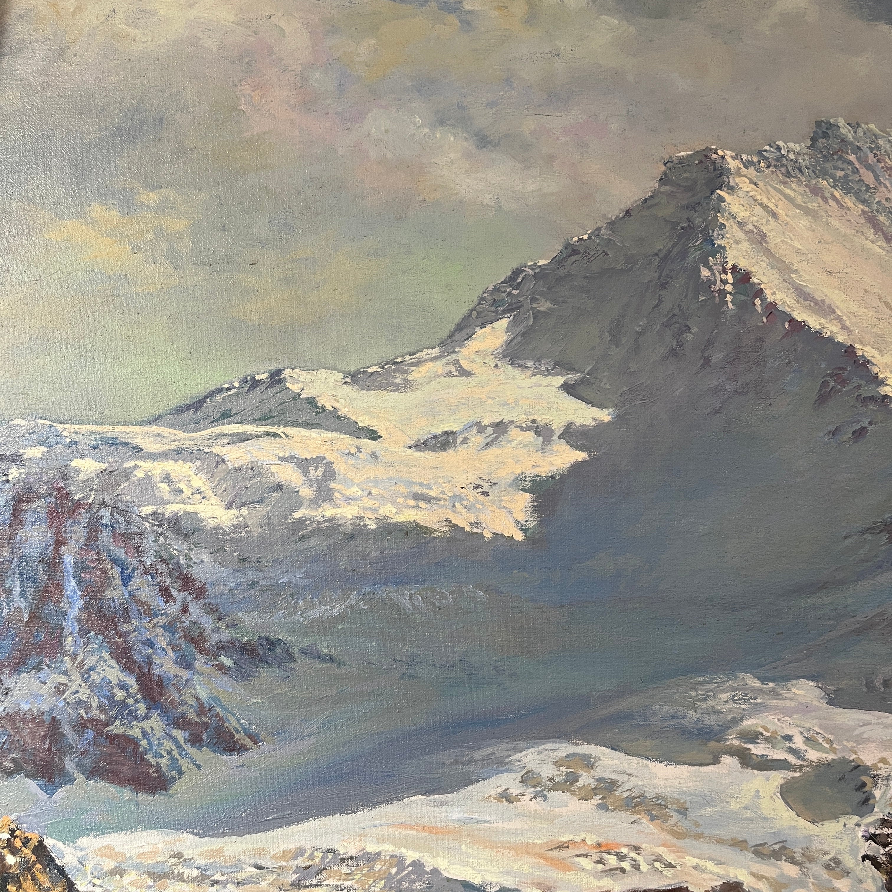 Especial óleo posiblemente de la Cordillera de los Andes. Lo especial de esta pintura radica en que lo que busca es prácticamente hacer un homenaje a la hermosa cordillera que nos acompaña. Podemos apreciar sus picos nevados y zonas rocosas y escarpadas. El paisaje es acompañado por un cielo azul cubierto de pomposas nubes. Si bien es un cuadro que en la firma data el año 2006, tiene las características pictóricas del estilo clásico de la pintura chilena