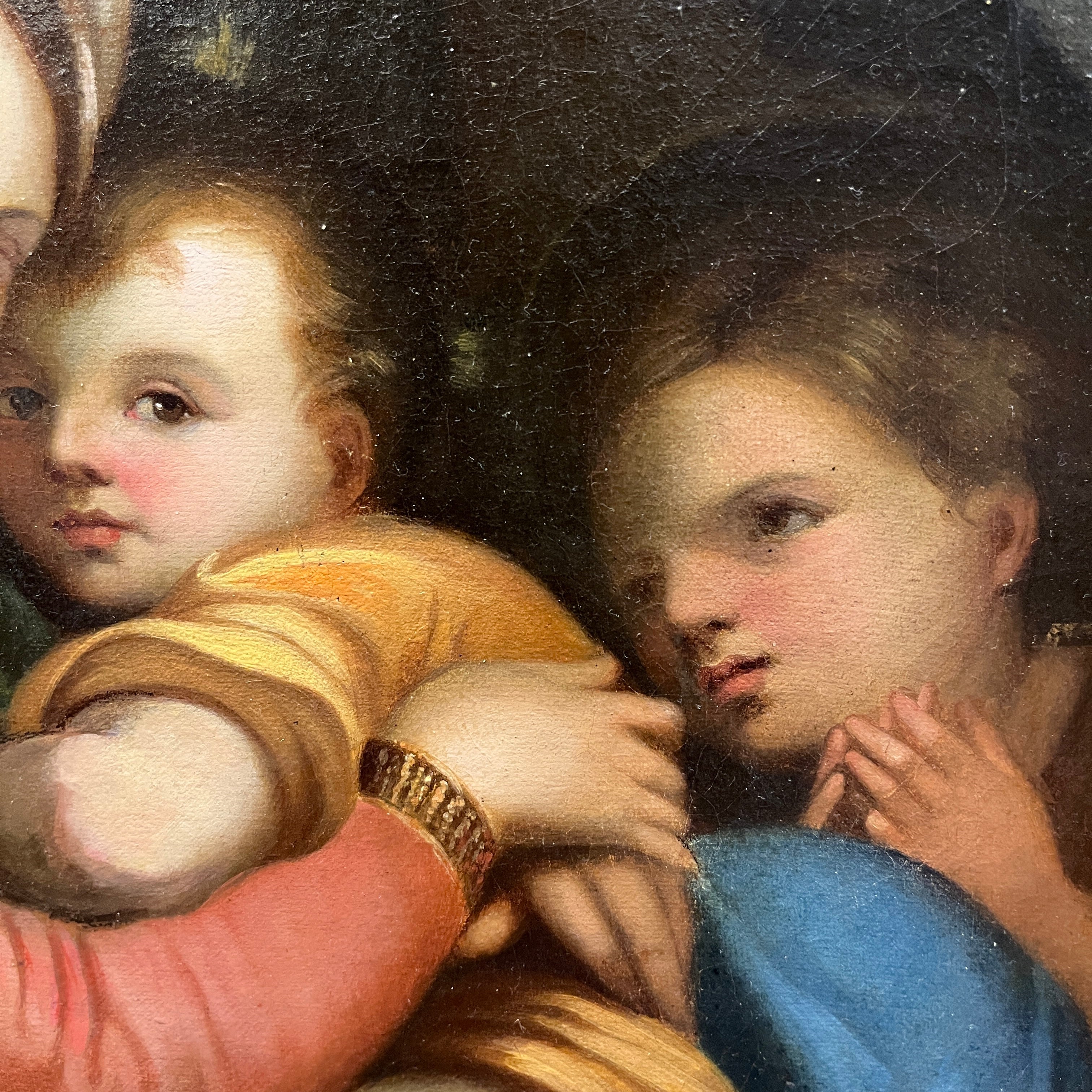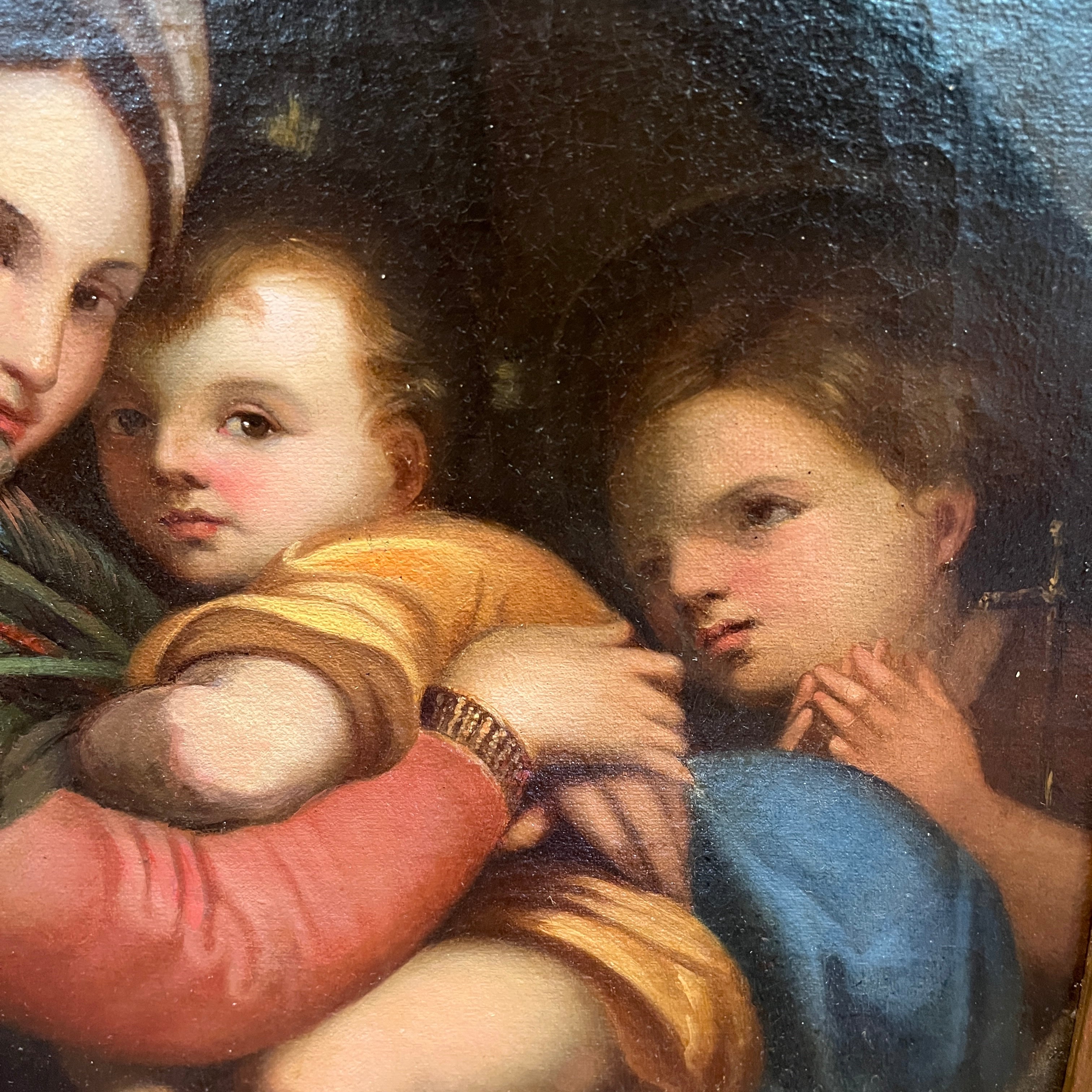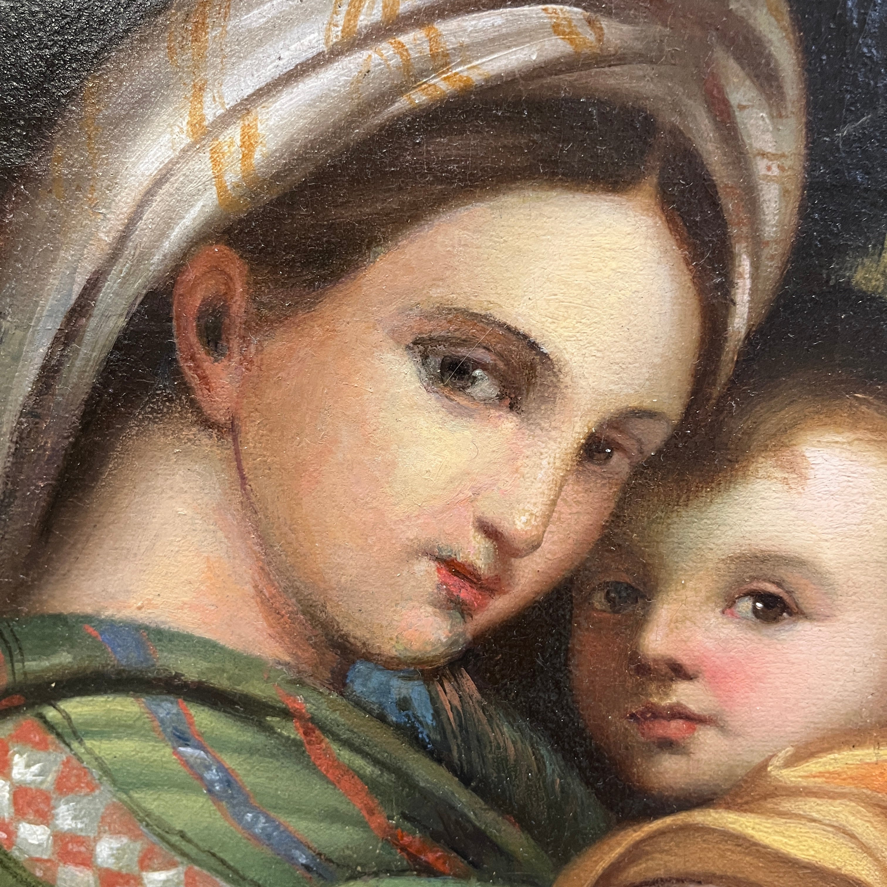 A beautiful replica of the Madonna della Sedia by the Italian Renaissance painter Raphael (1483-1520). The painting depicts the Virgin Mary with Jesus in her arms, accompanied by the infant Saint John the Baptist, who gazes with devotion. The original is housed in the Pitti Palace in Florence, Italy. The original is a circular painting, 71 cm in diameter. This replica comes framed in carved wood with floral details.