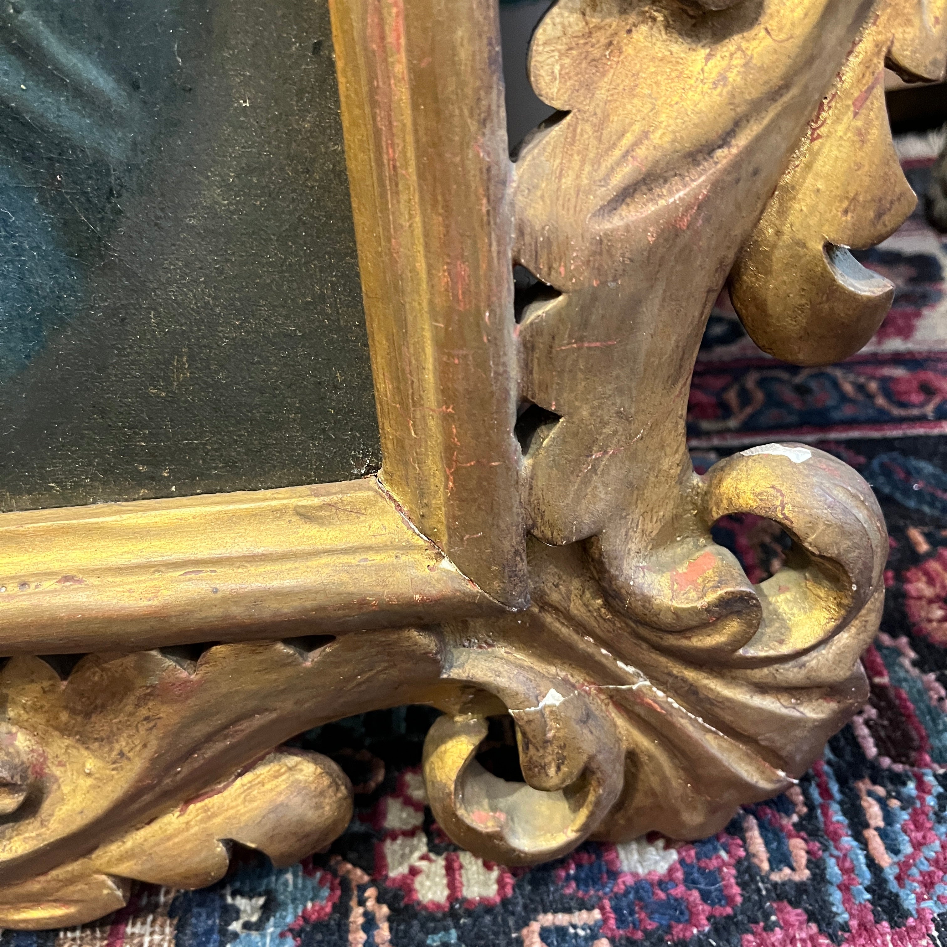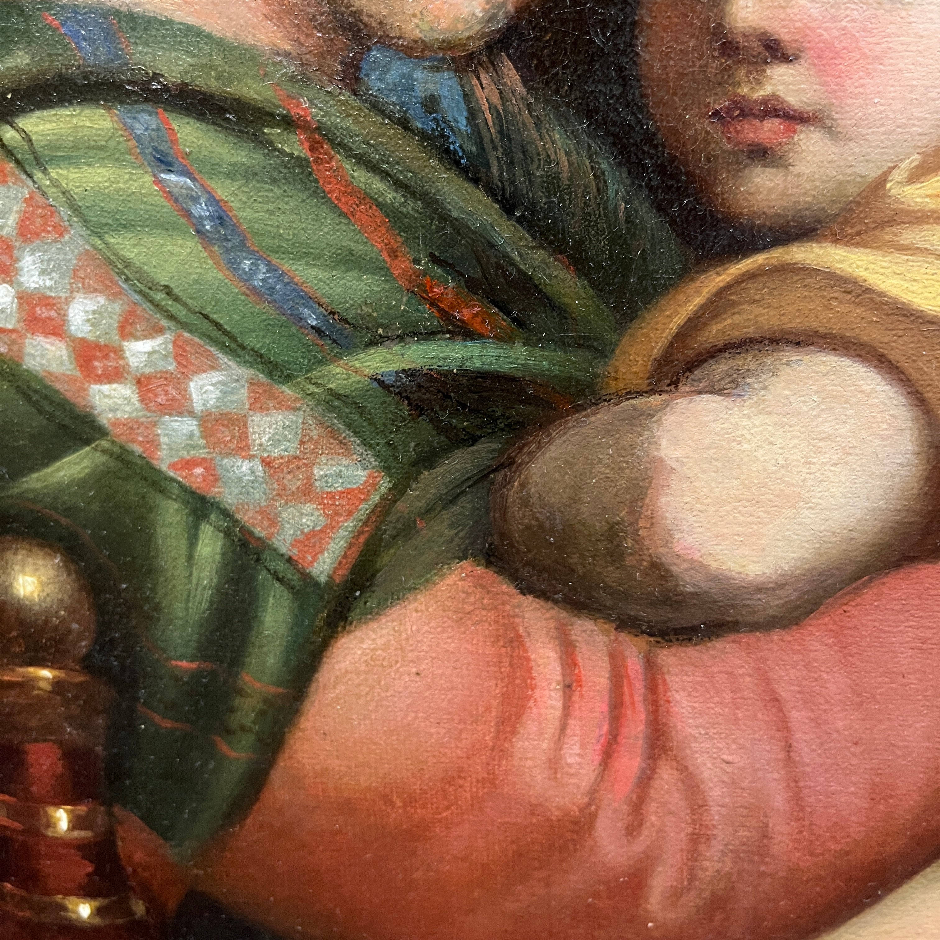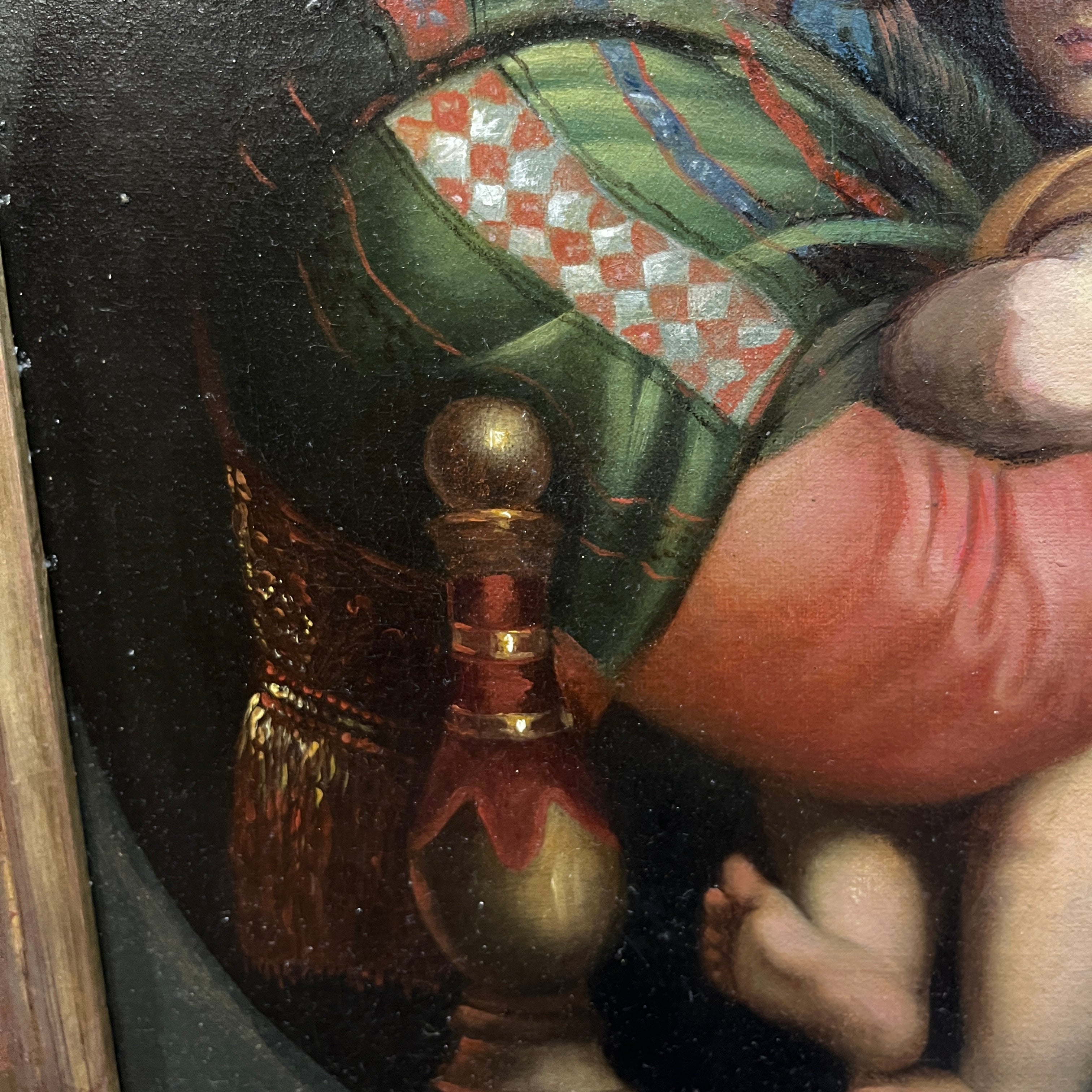 A beautiful replica of the Madonna della Sedia by the Italian Renaissance painter Raphael (1483-1520). The painting depicts the Virgin Mary with Jesus in her arms, accompanied by the infant Saint John the Baptist, who gazes with devotion. The original is housed in the Pitti Palace in Florence, Italy. The original is a circular painting, 71 cm in diameter. This replica comes framed in carved wood with floral details.