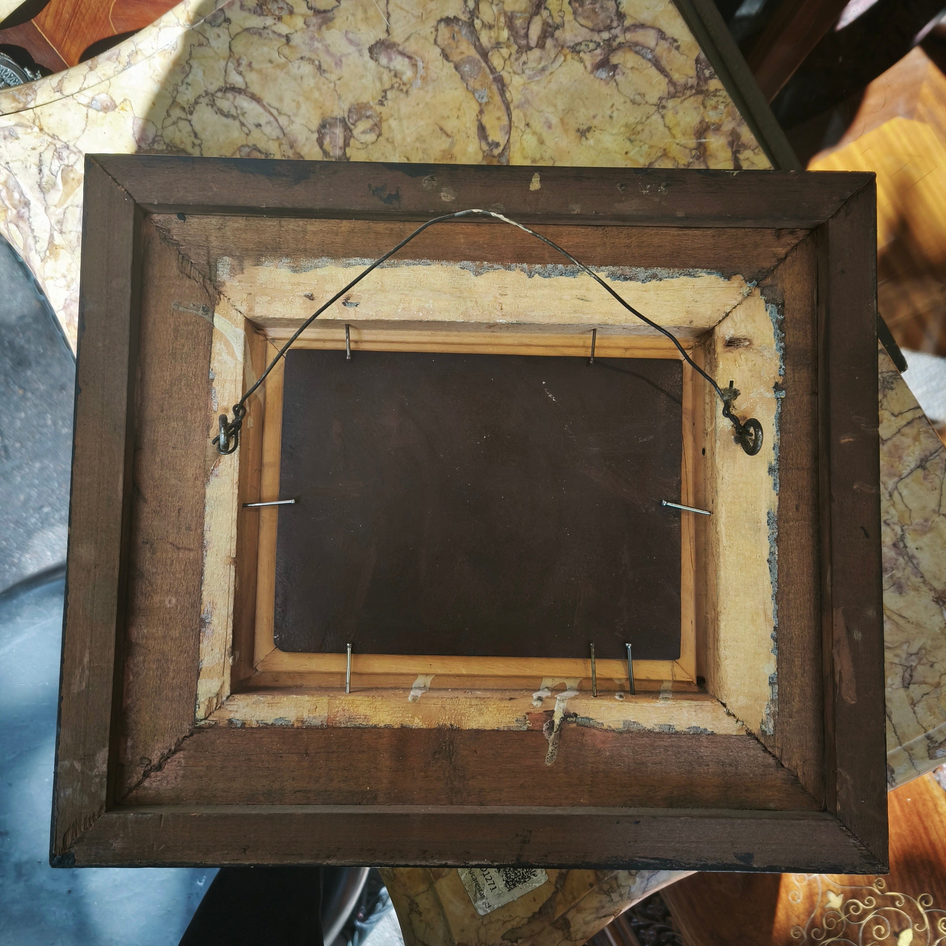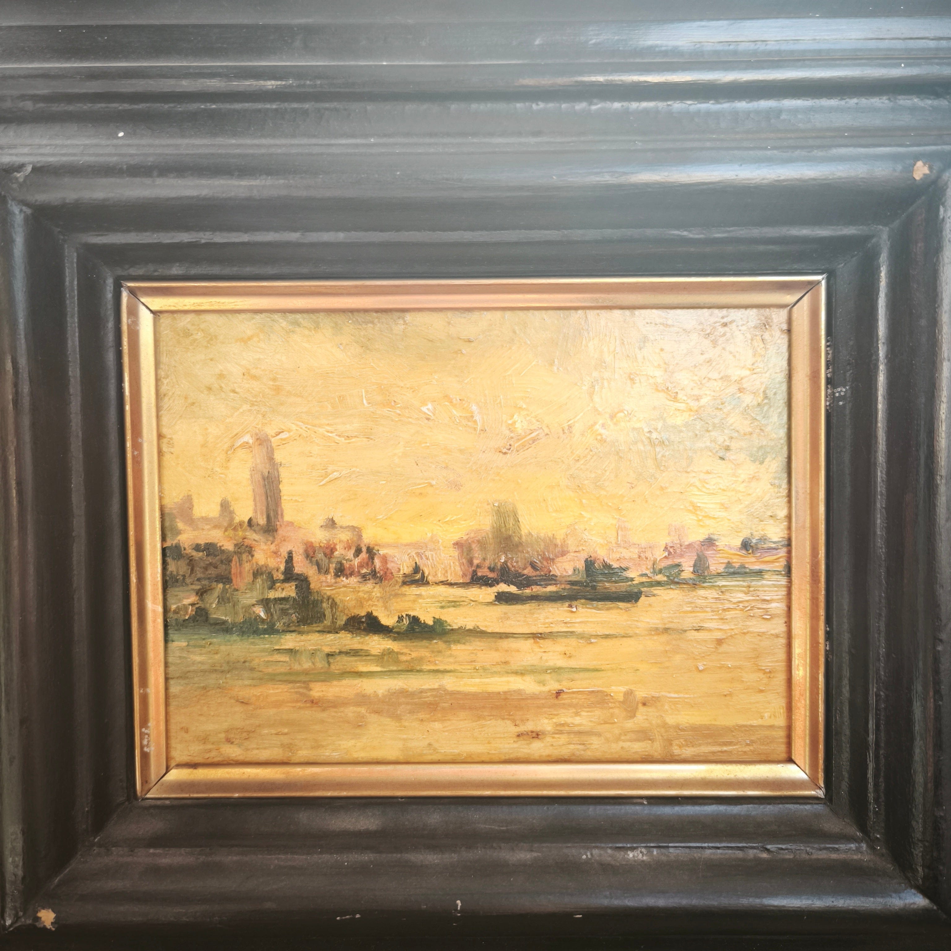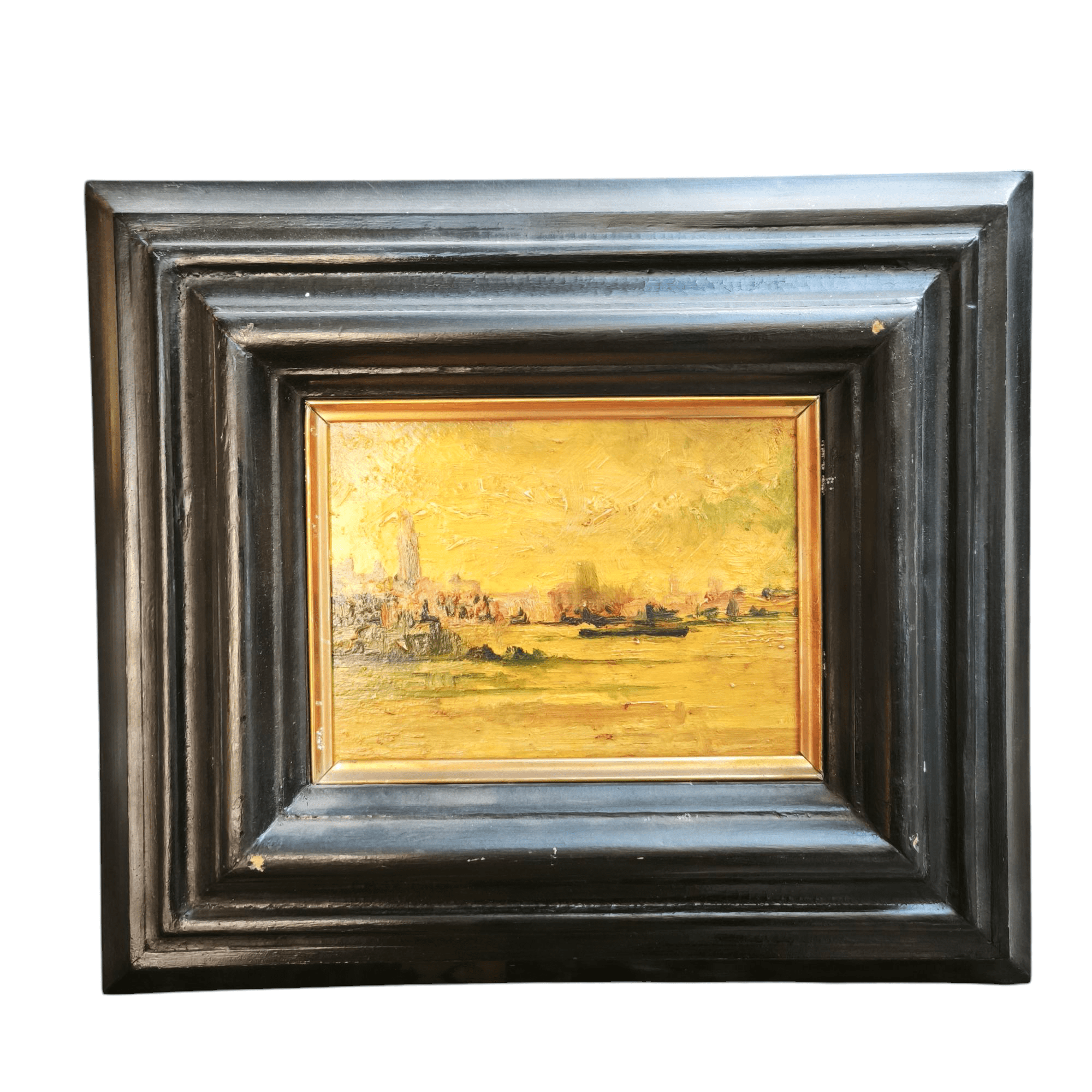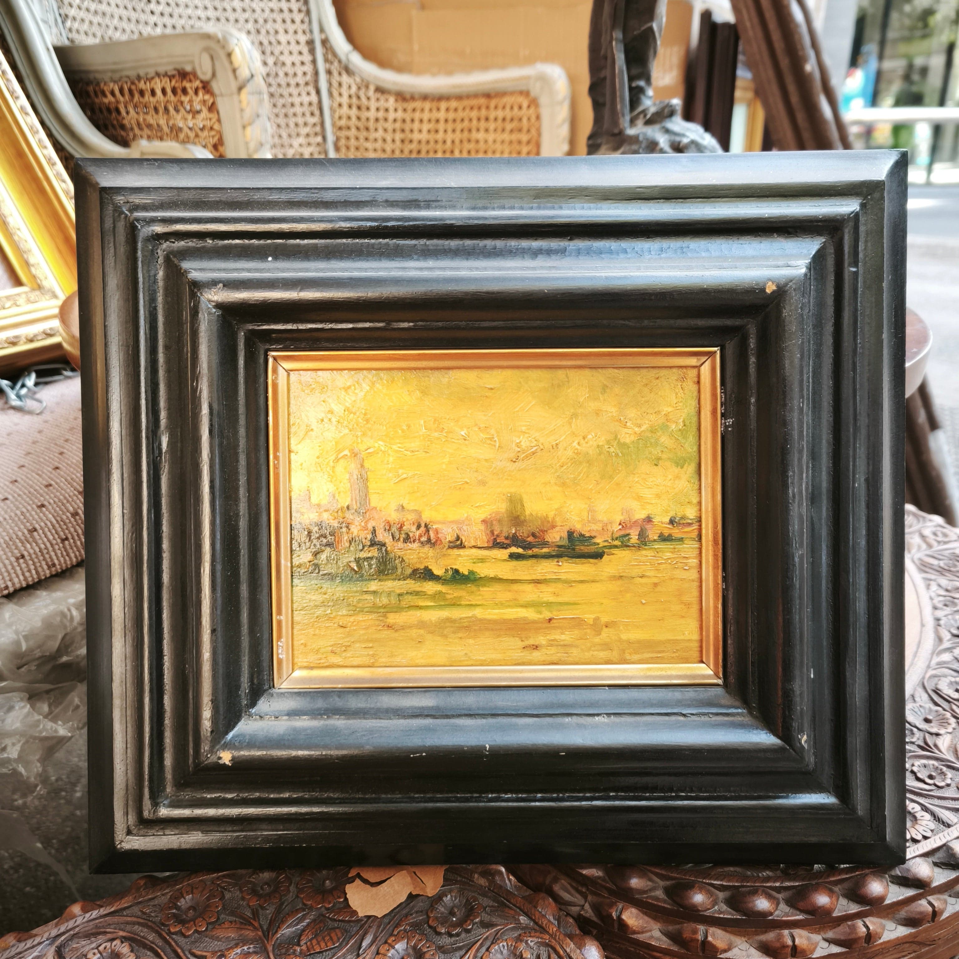 Oil on wood, expressively representing a landscape in various shades of yellow. The work is framed in sober carved wood painted black, with a gold interior border.
