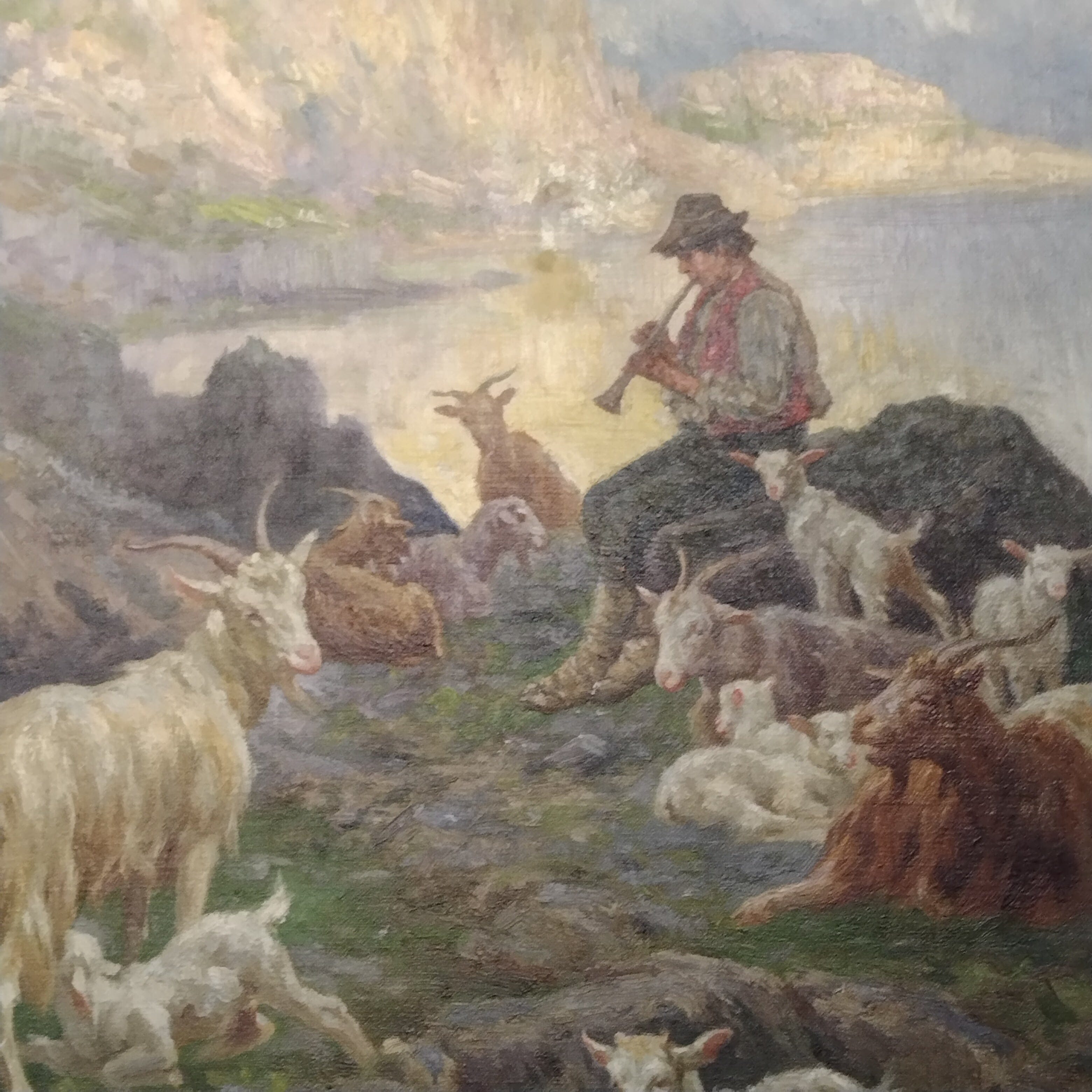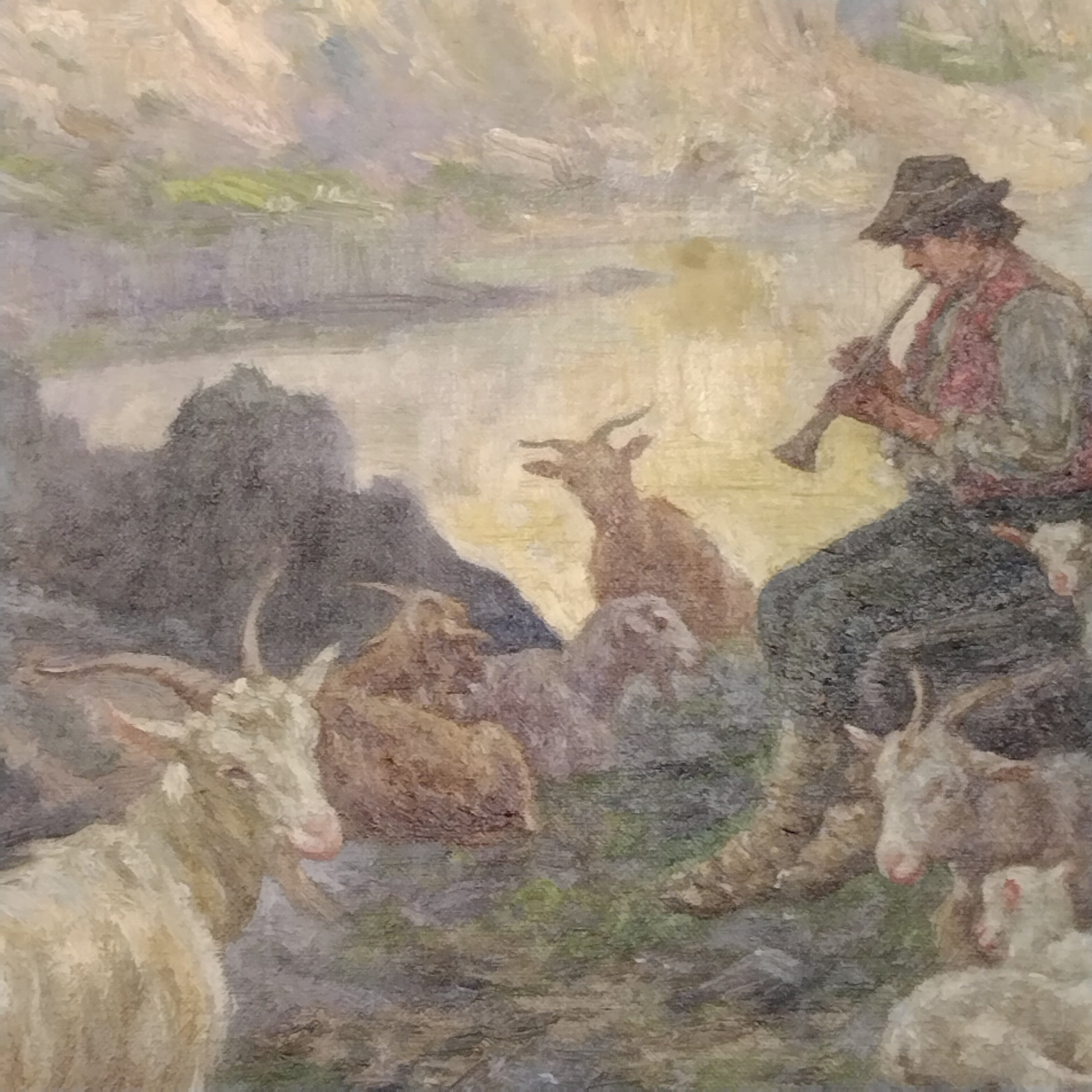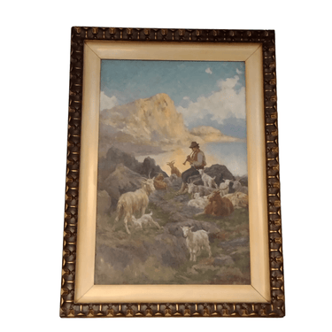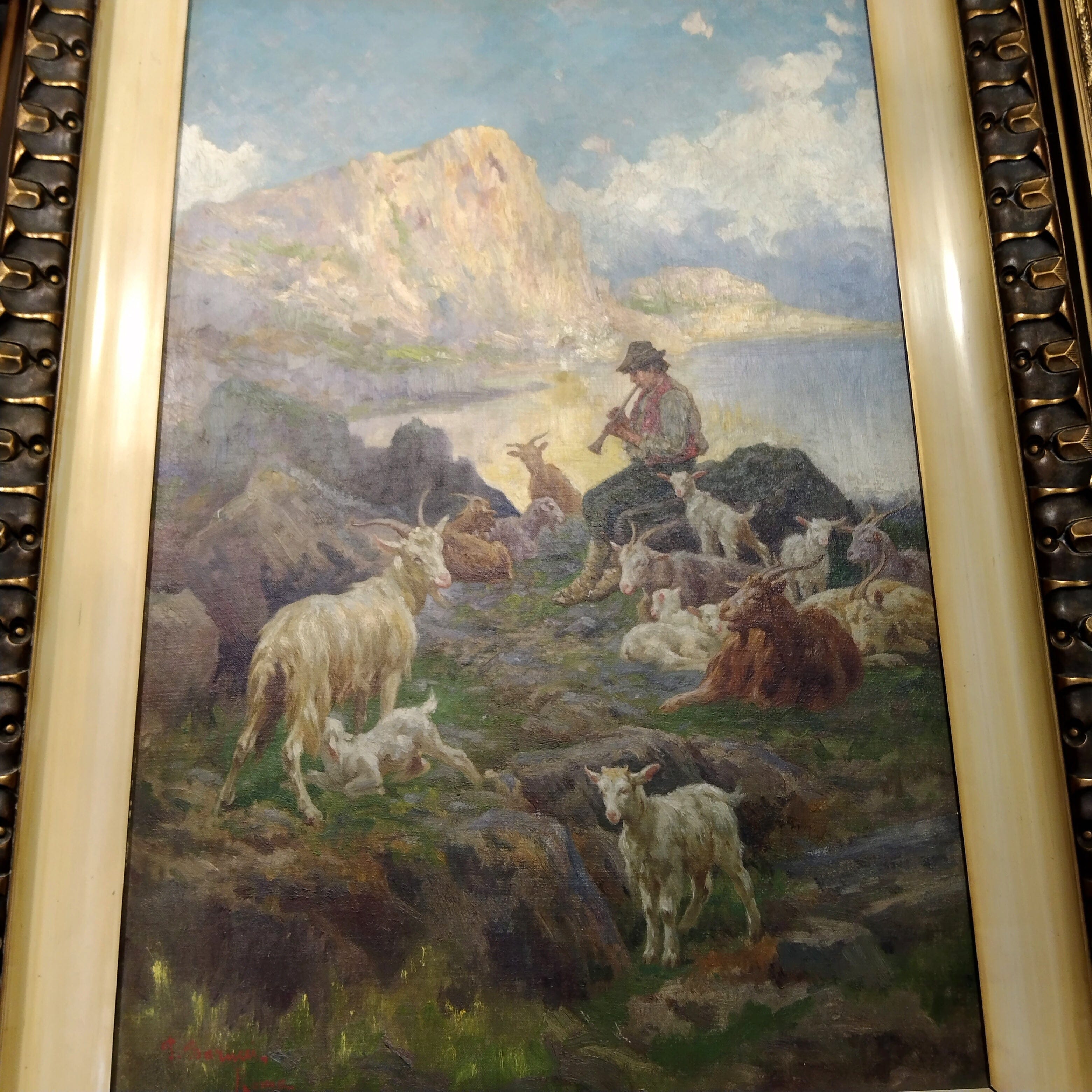 Oil on canvas by the Italian artist Pietro Barucci, depicting a rural landscape typical of the artist's style, with a shepherd playing the flute while his goats graze.